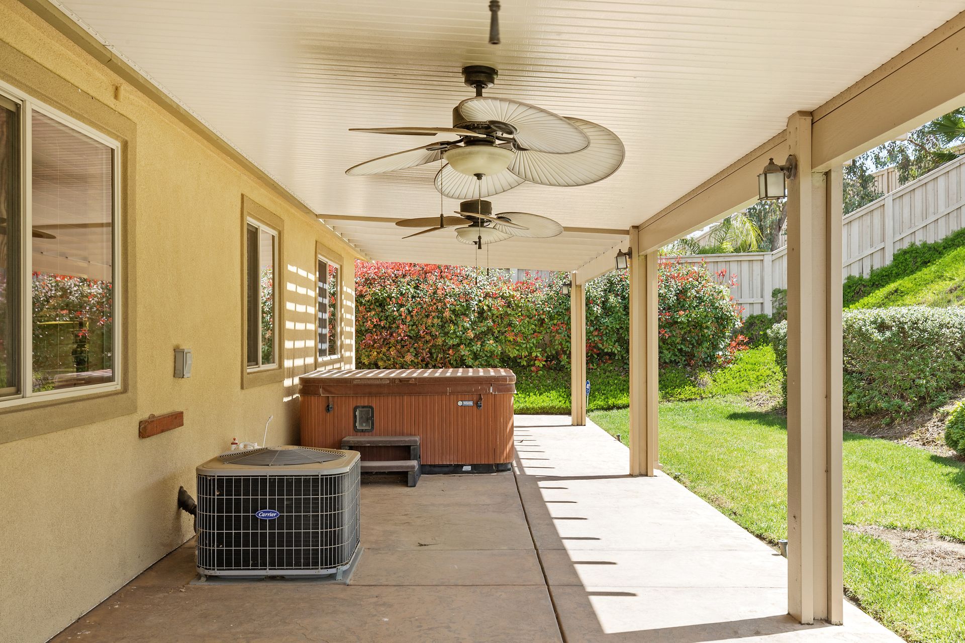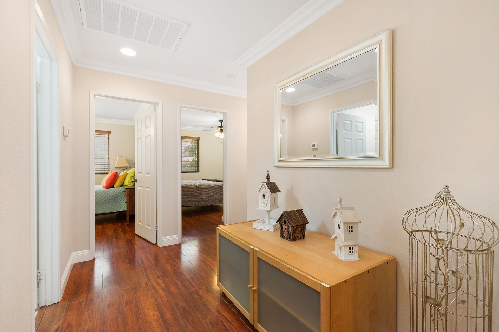 The covered patio, serving as an extension of the livable area, provides a private outdoor retreat for relaxation or hosting outdoor gatherings. The bedroom near the front of the house, ideal for an office, adds flexibility to the floor plan. Additionally, there are two generously sized bedrooms down the hall with ample space.