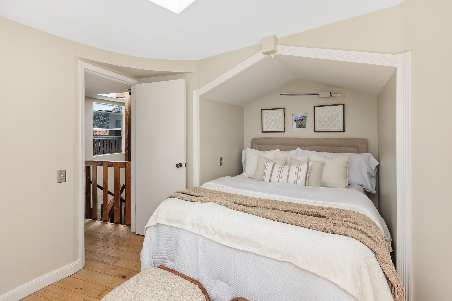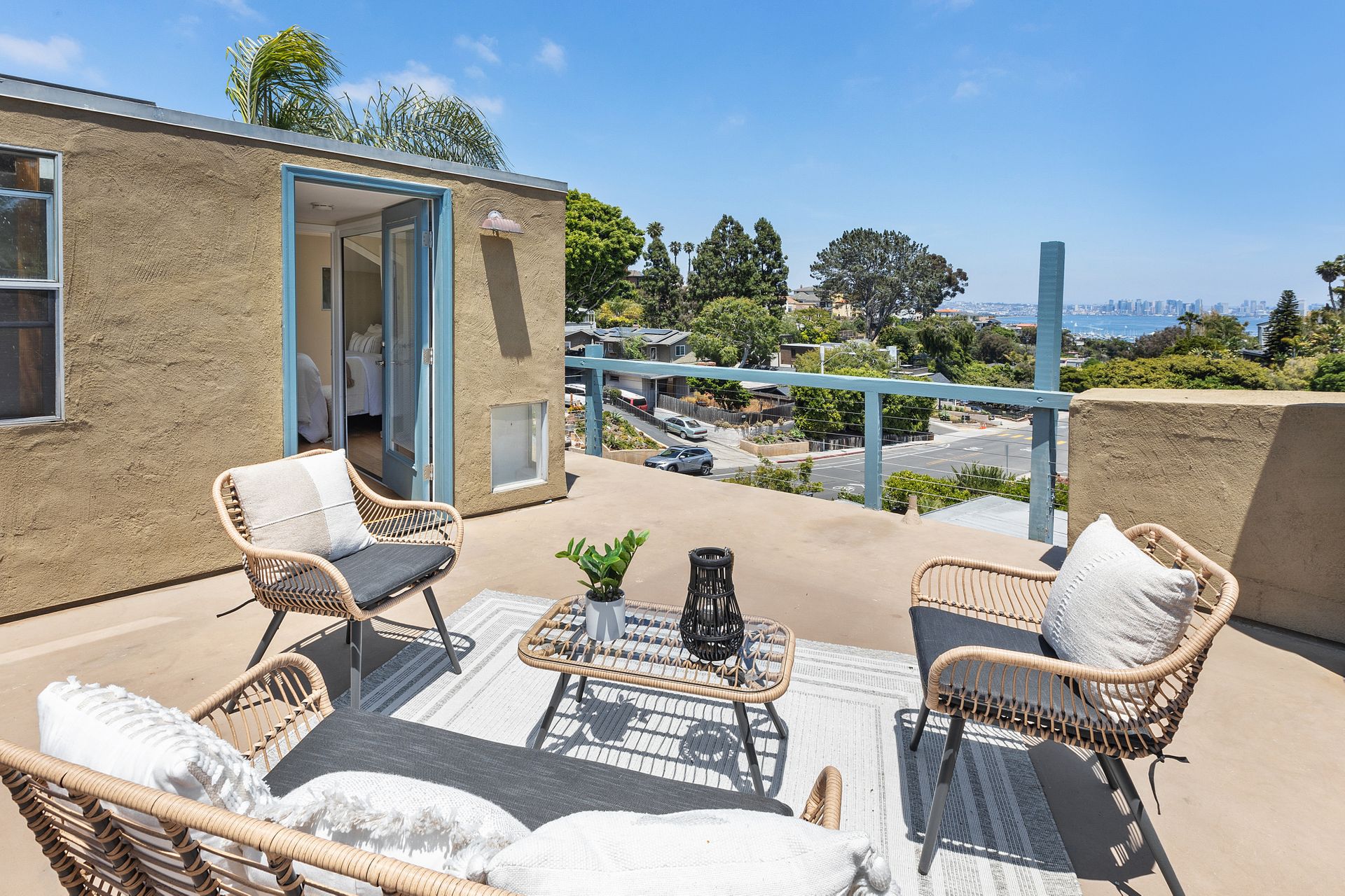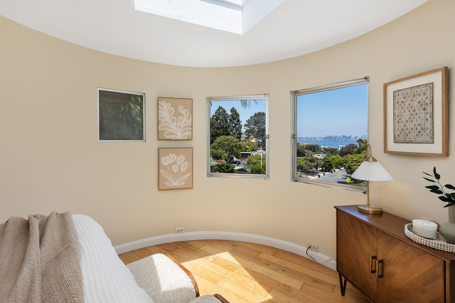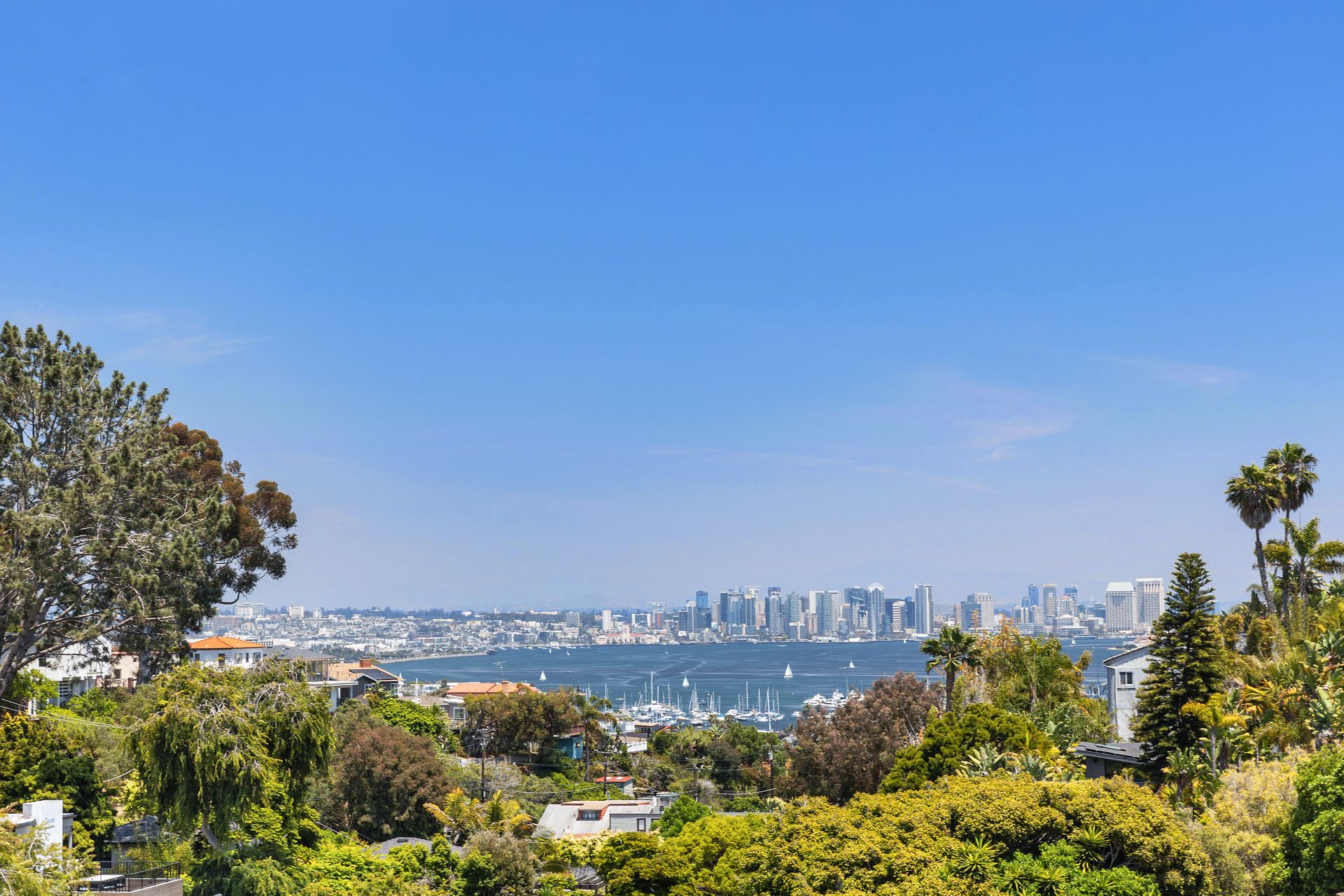 A dreamy retreat, with its captivating views of San Diego Bay, downtown and sailing regattas. A unique design by award winning architect Tom Grandona, the attention to detail in this three-level, two bedroom, two bath custom home is evident, from the spacious 11-foot high kitchen and living room ceilings with its breathtaking views, to the cozy rotunda primary bedroom suite with its own party deck. The hickory flooring and slate tile add a touch of warmth and elegance throughout the home, complementing the updated kitchen and appliances. This residence seamlessly blends indoor and outdoor living with three skylights and sliding glass doors leading to a rear yard sanctuary and deck atop the one-car carport. Being just minutes from yacht clubs, La Playa Trails and the vibrant Point Loma Village, adds to the allure of this Point Loma gem. It truly is a place where one can relax, entertain and enjoy the beauty of San Diego Bay.