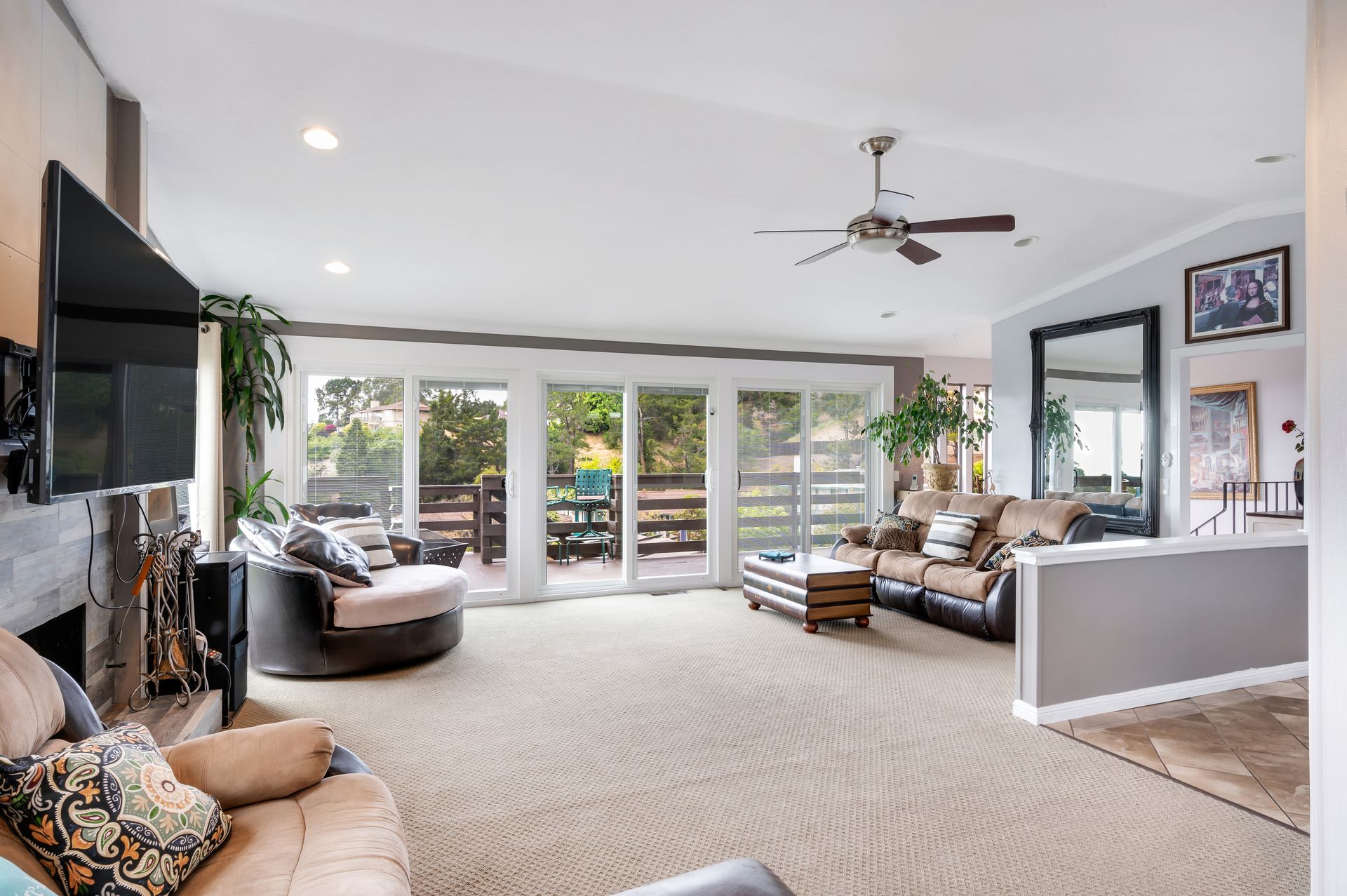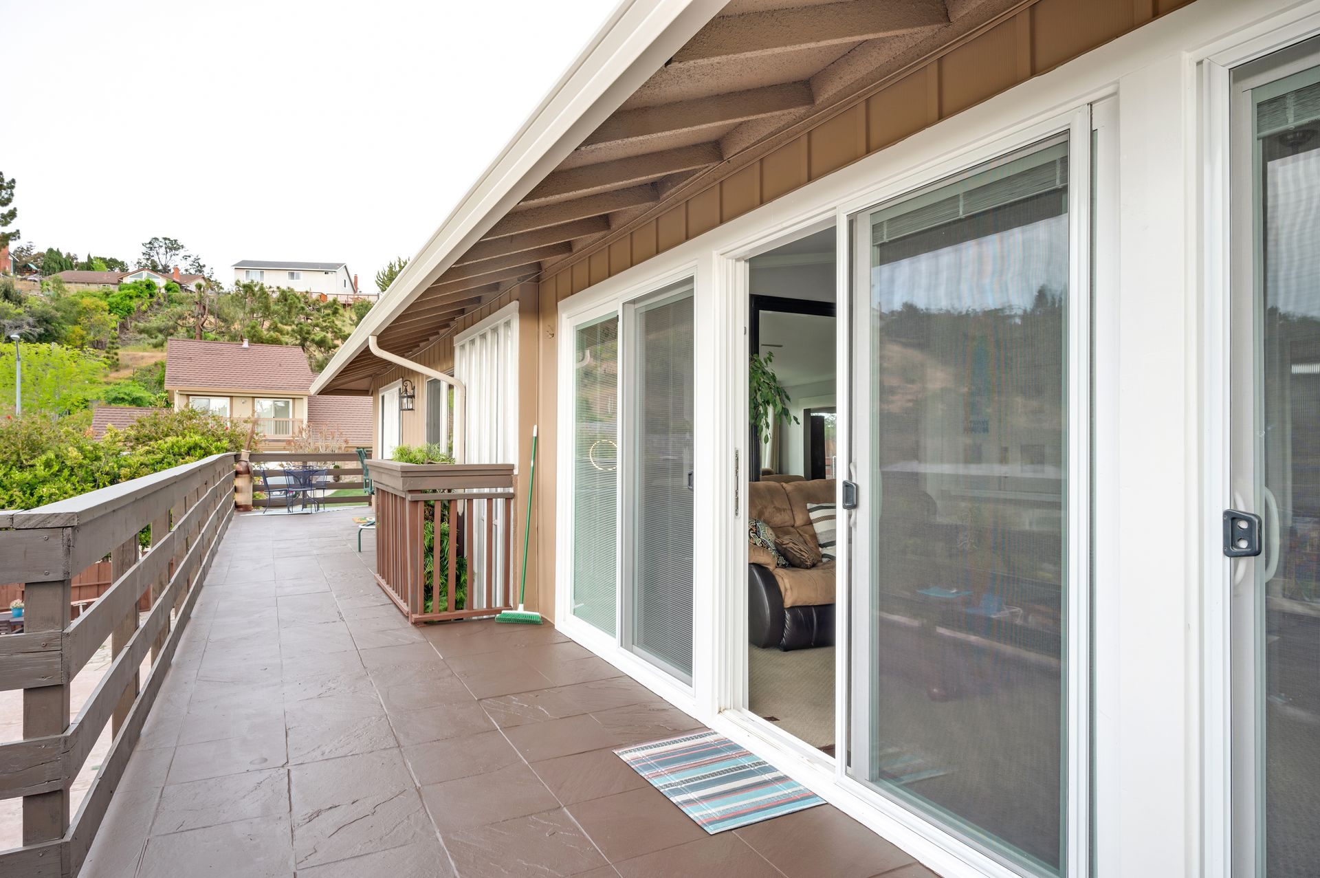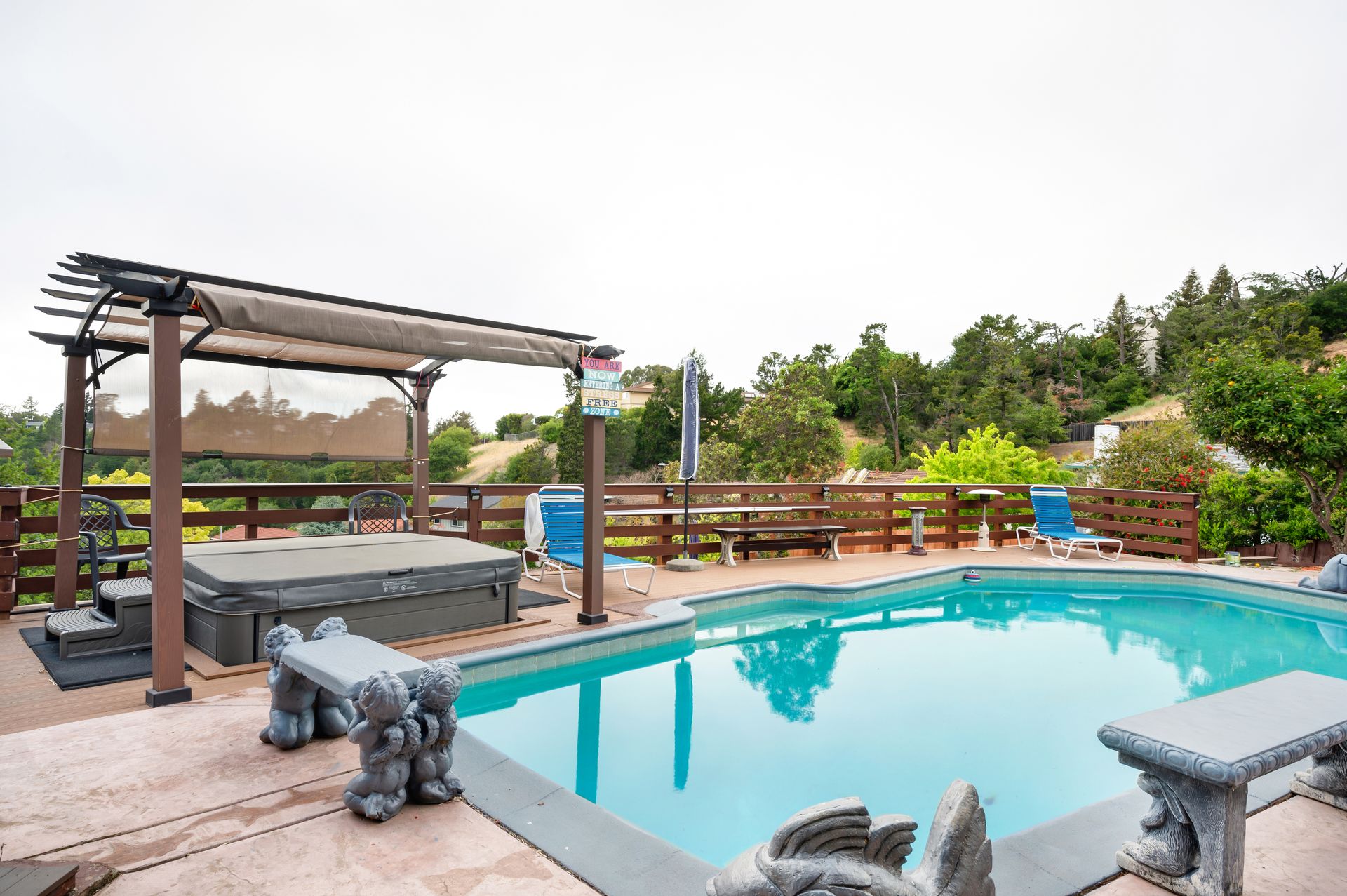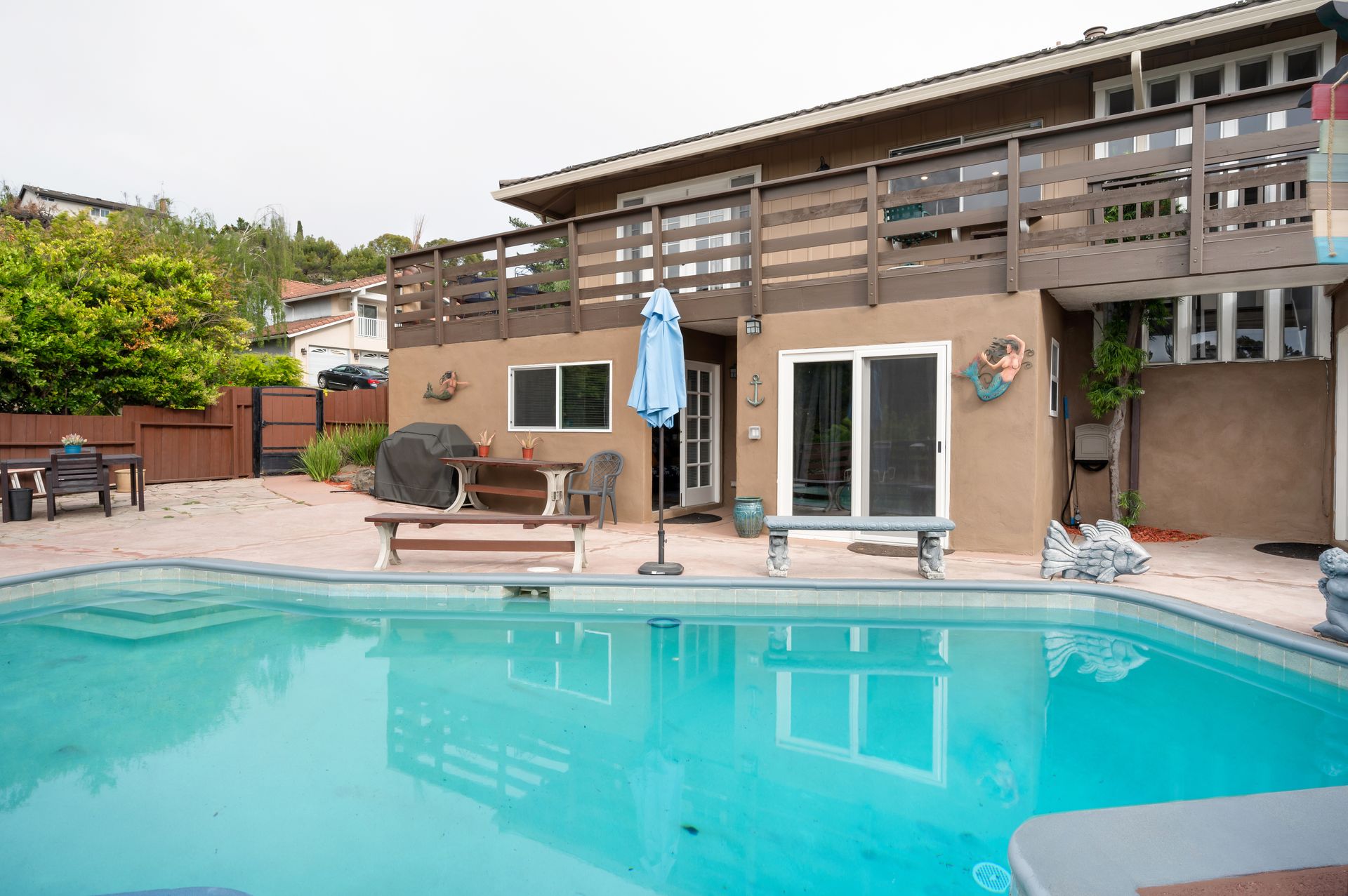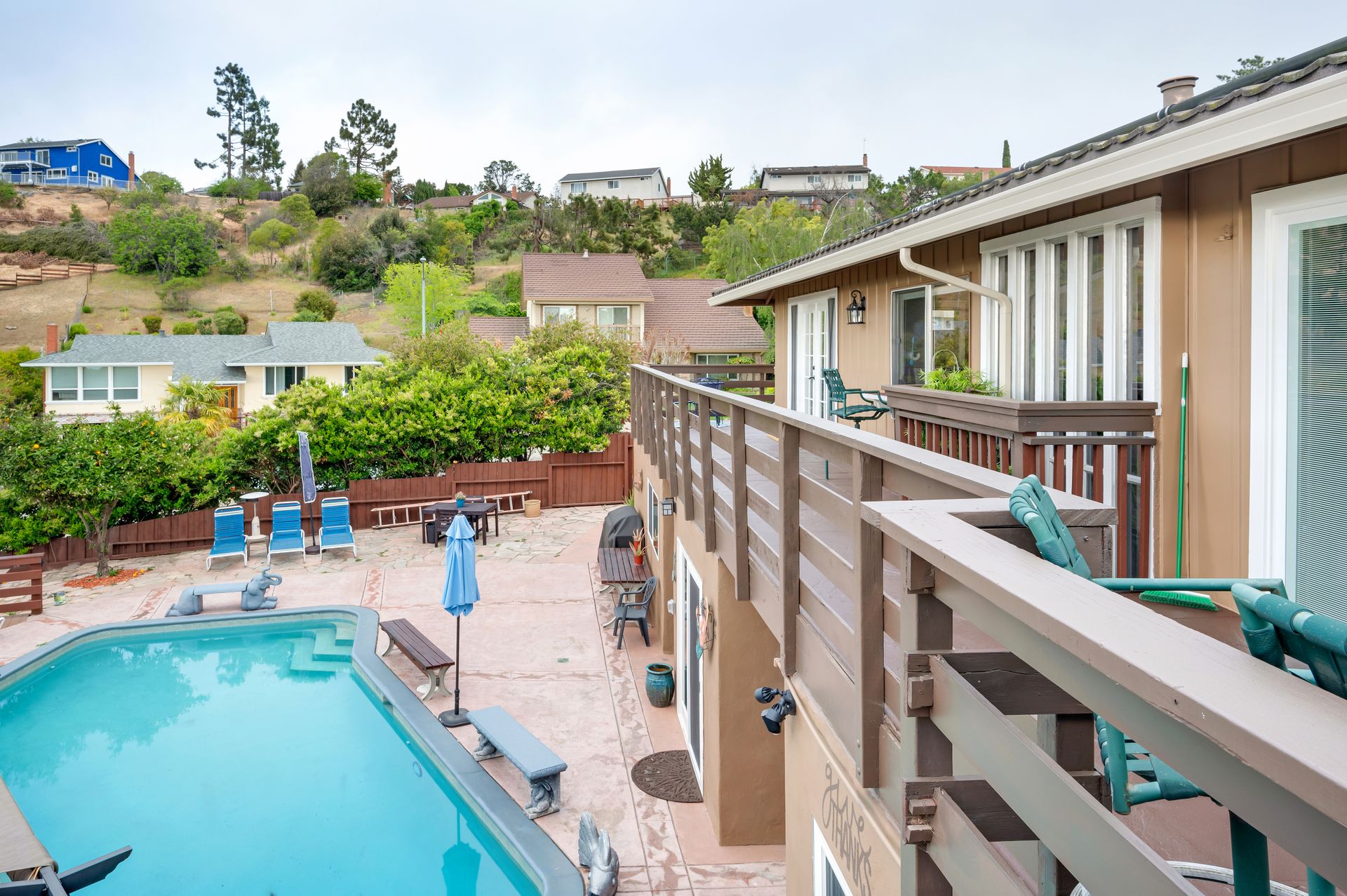 This easy indoor-outdoor living and a prime location make this the home you’ll never want to leave. Oversized windows in every room ensure full enjoyment of the outstanding views. On the main level, a spacious living room opens to a deck that runs the entire length of the home overlooking the backyard. A bonus room or home office adjoins the living room and features an additional deck, ideal for relaxing in the sun on weekend afternoons. The updated kitchen includes stainless steel appliances, an island with seating, plenty of counter space and a second slider leading out to the deck. An impressive staircase with stacked feature windows leads to the lower-level bedrooms, including a primary suite with a walk-in closet, double sinks and a glass-enclosed shower. At the opposite end of the hall, a spacious guest unit is completed with a full kitchen. Each of the two secondary bedrooms has a separate full bath. The outdoor livable space with its inviting pool and pergola-shaded spa will quickly become the primary gathering place for your everyone. Hayward Highland is a sought-after neighborhood with expansive views, close proximity to CSUEB and a variety of shopping and commute options.