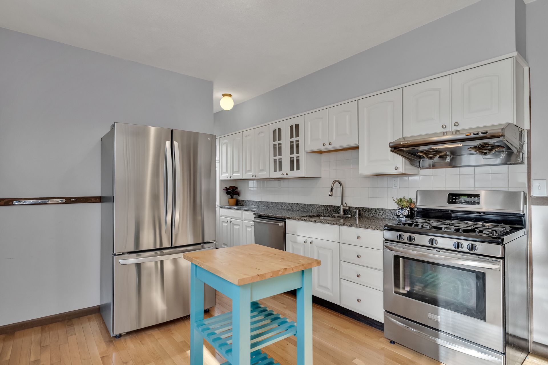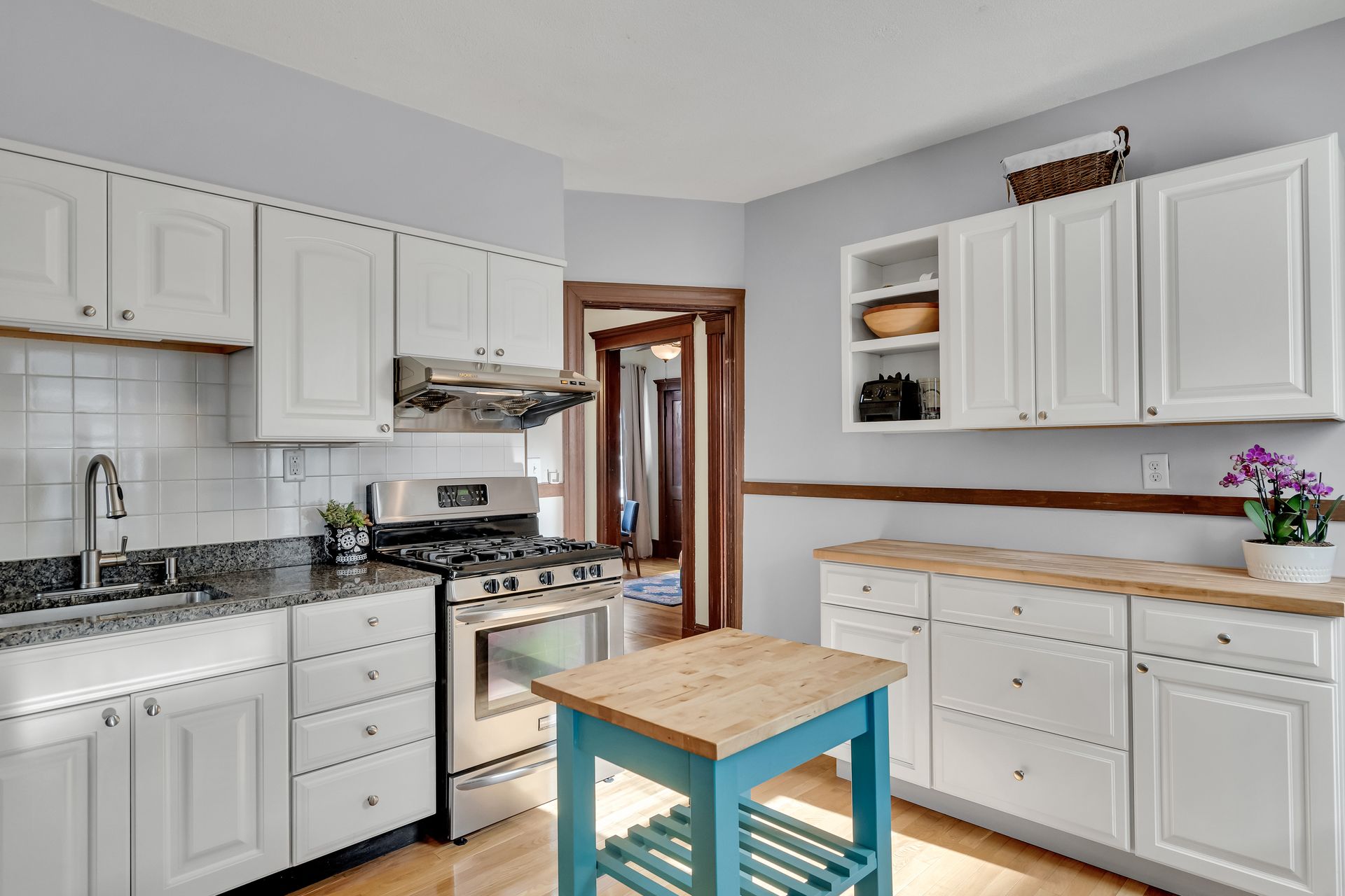 - The many updates blend with the charming details include dazzling white eat-in kitchen, plenty of cabinet and counter space, and newer stainless-steel appliances.