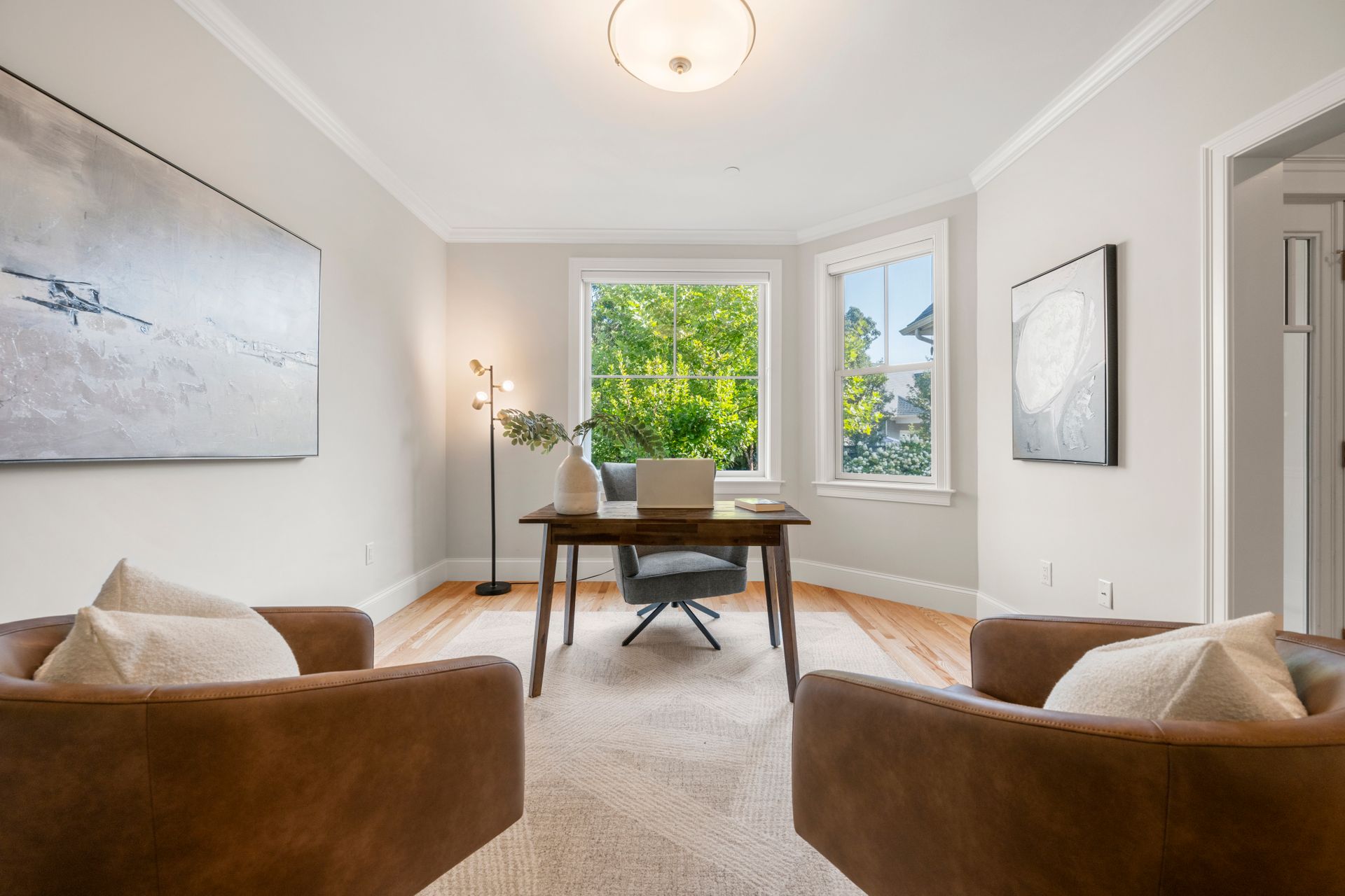 This two-bedroom, two-and-a-half-bathroom luxurious townhome offers approximately 2,400 square feet of living space. The primary bedroom ensuite and laundry are on the first floor, providing easy living. The open floor-plan design makes for a seamless flow between the living areas.