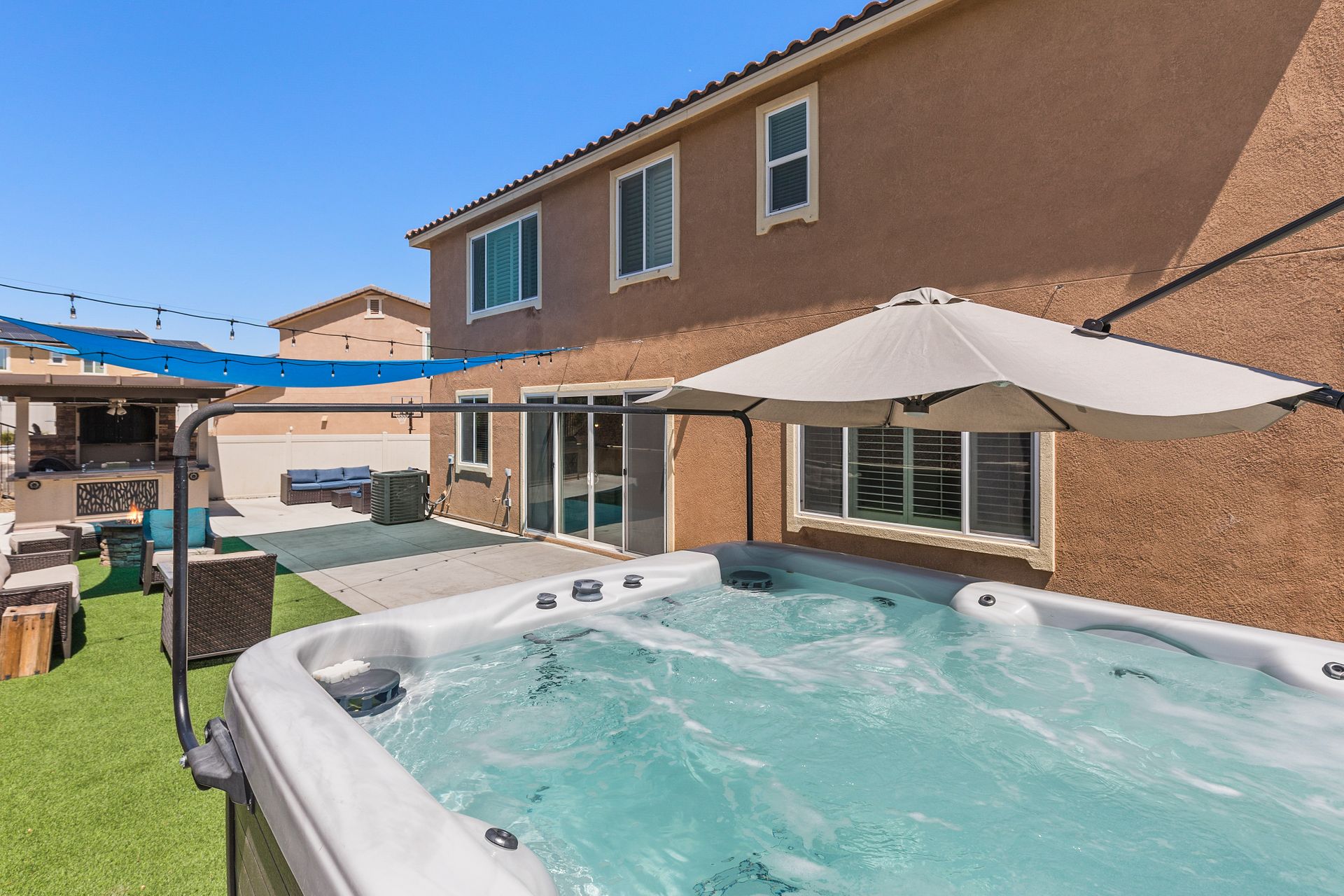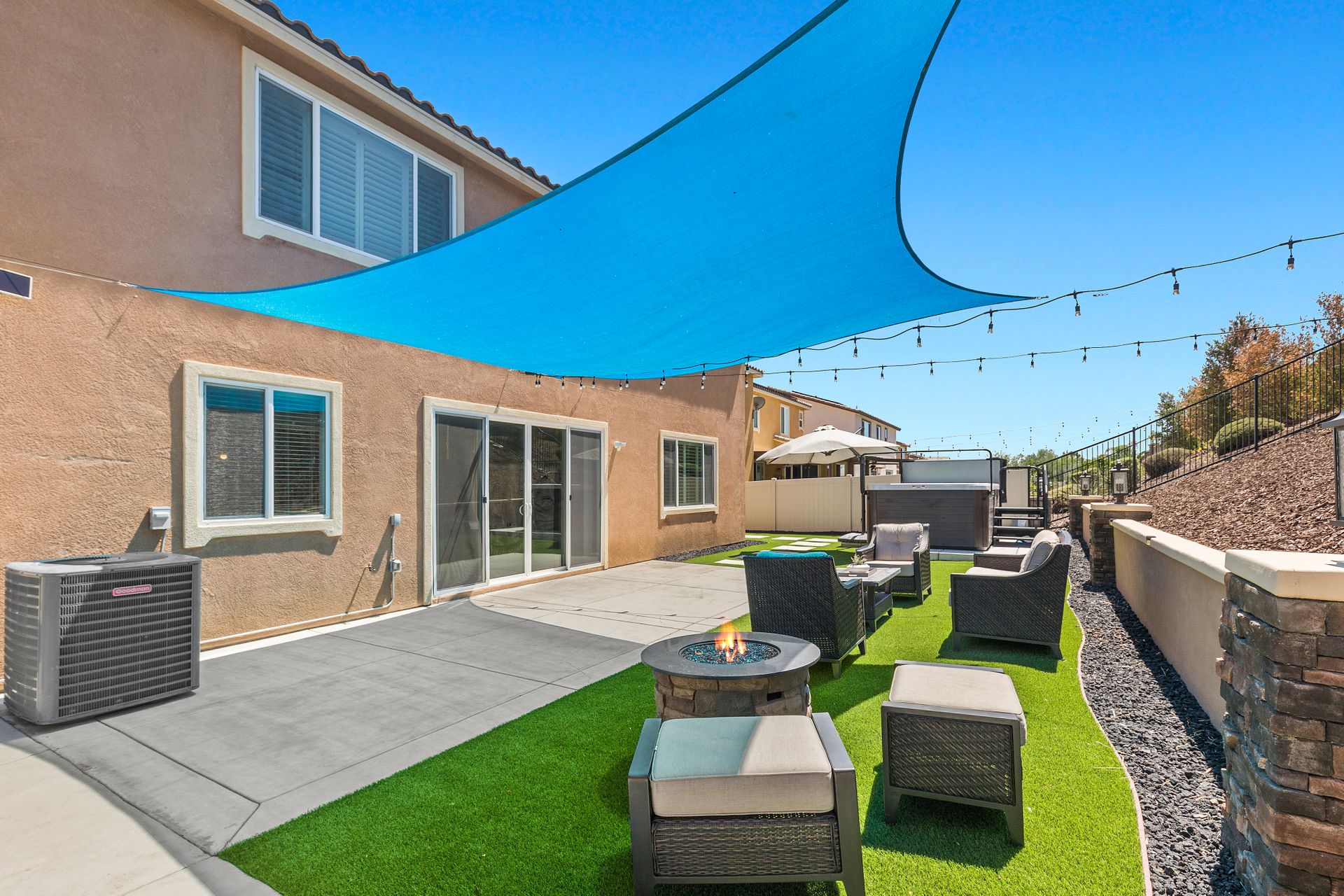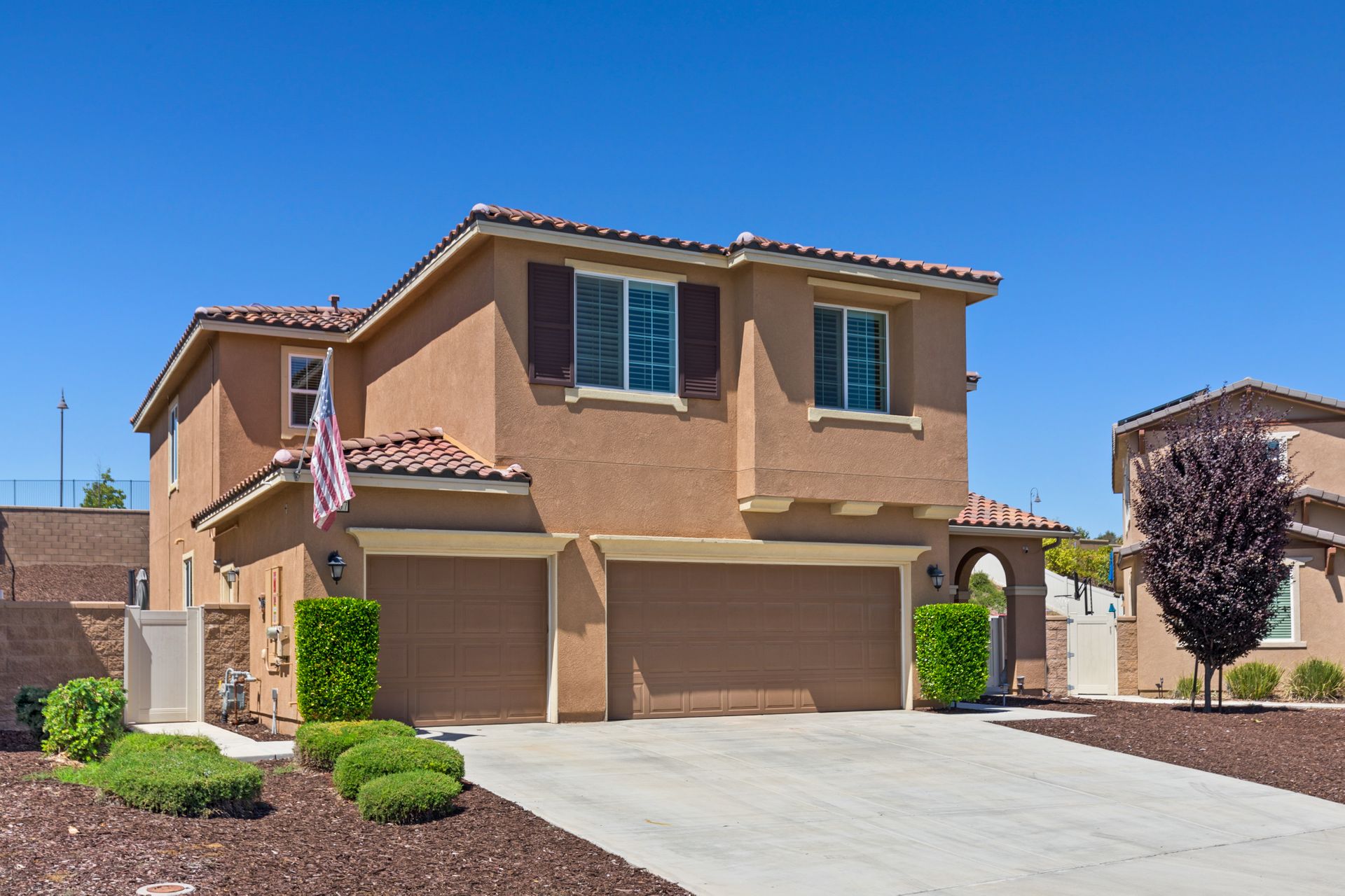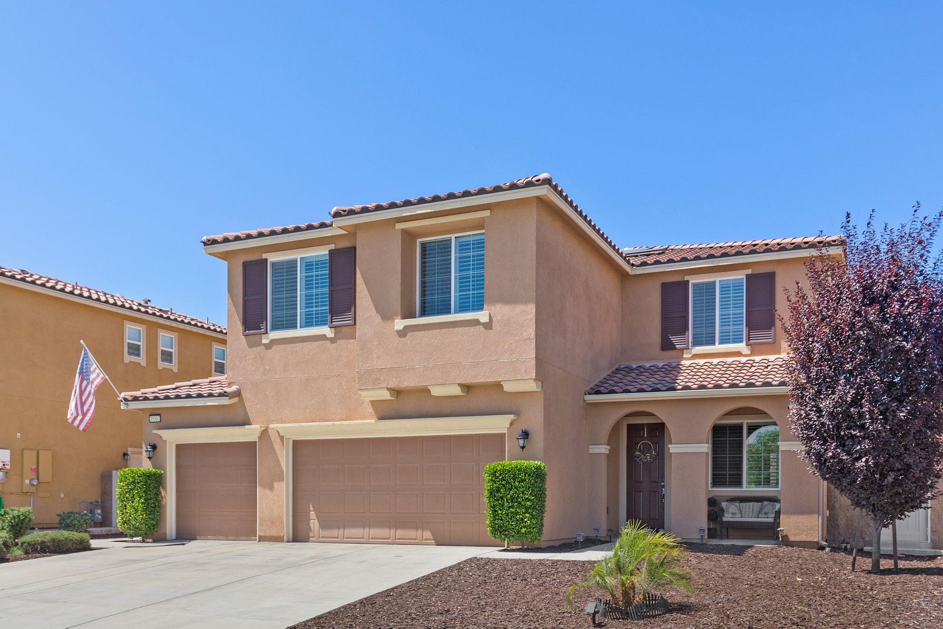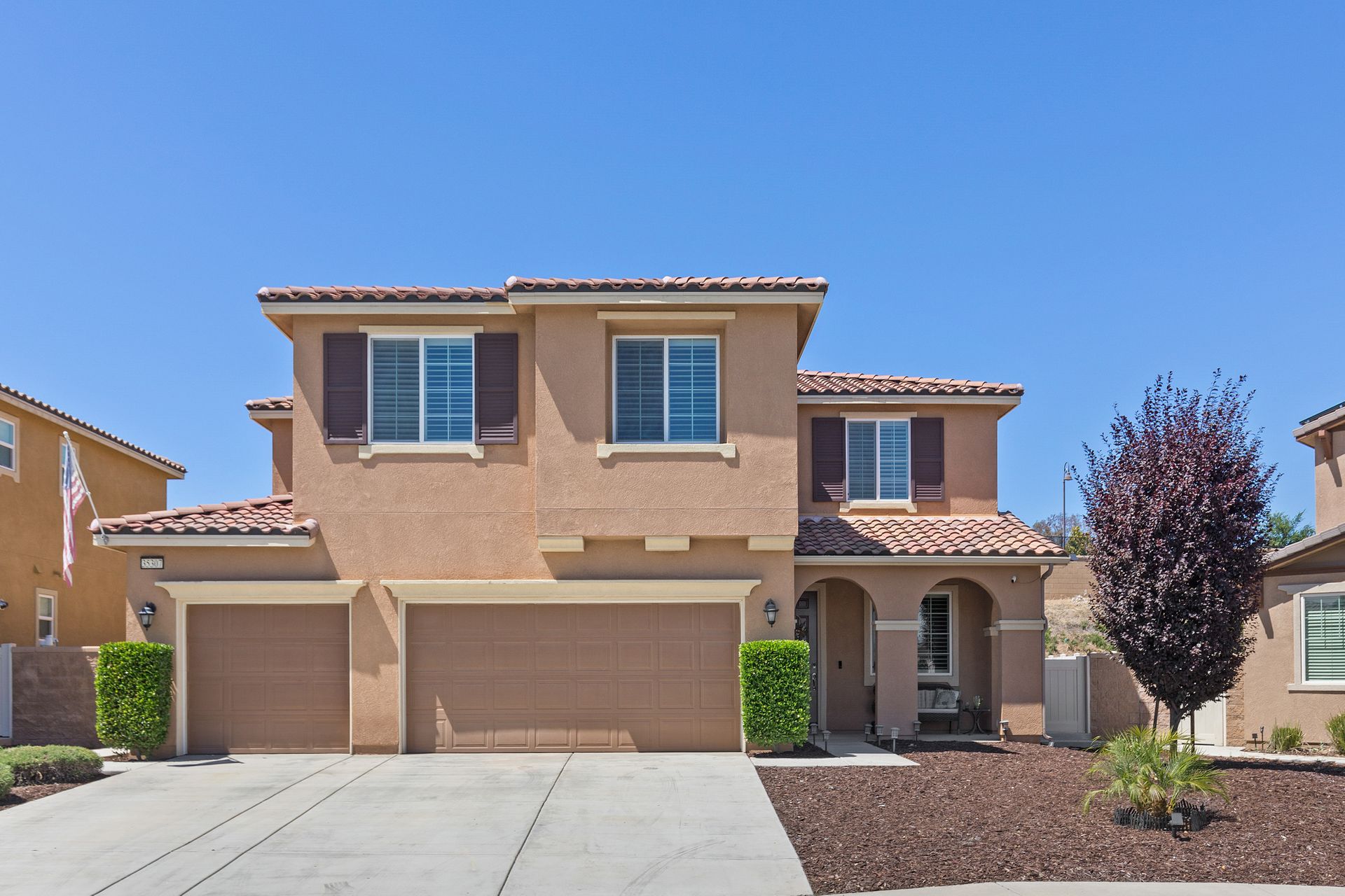 This modern, sophisticated, and move-in-ready property is perfect for those in search of a home within the designated boundaries of Vista Murrieta High School. The property provides exceptional versatility, boasting five bedrooms, three bathrooms including a first-floor bedroom with a full bath, a spacious loft, and a three-car garage. Upon entering, you will be greeted by a formal dining area and a butler's pantry complete with a wet bar. Just beyond the butler's pantry, you will discover the gourmet kitchen which seamlessly connects to the dining area and great room. With ample counter space, stainless-steel appliances, double ovens, a center island, and a walk-in pantry, the kitchen is a culinary enthusiast's dream. Not only is the kitchen functional, but beautiful with its dark cabinets, cream and grey granite countertops, and modern brick backsplash. The entire living area exudes an open and airy ambiance with its freshly painted neutral gray walls, and expansive picture windows adorned with beautiful plantation shutters. Upstairs, the primary suite is spacious, accommodating king-size furniture with extra room for a sitting area or office space. The primary ensuite includes a walk-in closet, a dual sink vanity, a soaking tub, and a separate shower. Additionally, there are three generously sized secondary bedrooms, a full bathroom with a dual sink vanity, and a walk-in laundry room with ample storage. Leading out to the backyard are oversized sliding glass doors that effortlessly blend indoor and outdoor living, making it perfect for entertaining. The professionally landscaped backyard has been thoughtfully designed incorporating drought-resistant elements such as artificial turf, pavers, mulch, and hardscape. This space truly caters to the entertainer's dream, boasting a large swim-spa, a custom kitchen and bar, a concrete patio, and a spacious side yard suitable for basketball or other games. And it all of this wasn't enough, the home offers energy features including a tankless water heater, PAID solar panels and a Tesla Powerwall. A small solar purchase plan will remain with the home for the buyer to assume. Residents of this neighborhood enjoy the convenience of being within walking distance to the elementary and middle school, as well as Spencer's Crossing Clubhouse and Sports Park. Spencer's Crossing amenities promote an active lifestyle with community pools, a spa, playgrounds, basketball courts, and baseball and soccer fields.