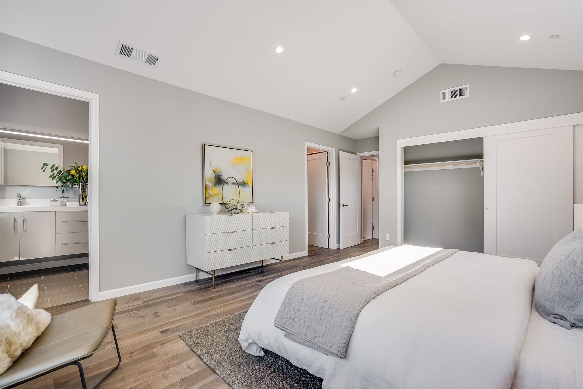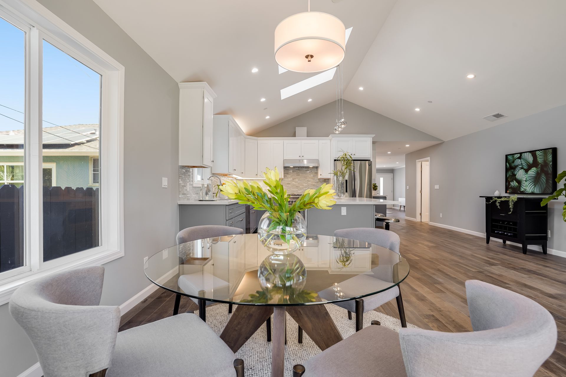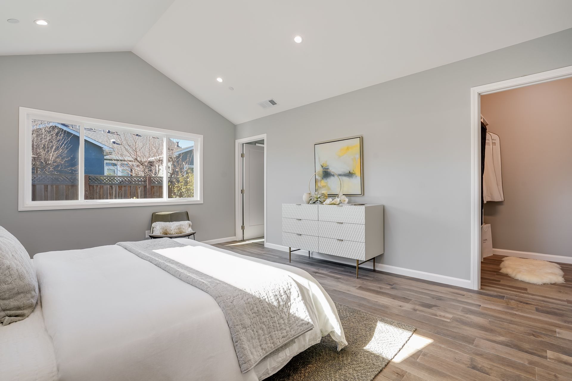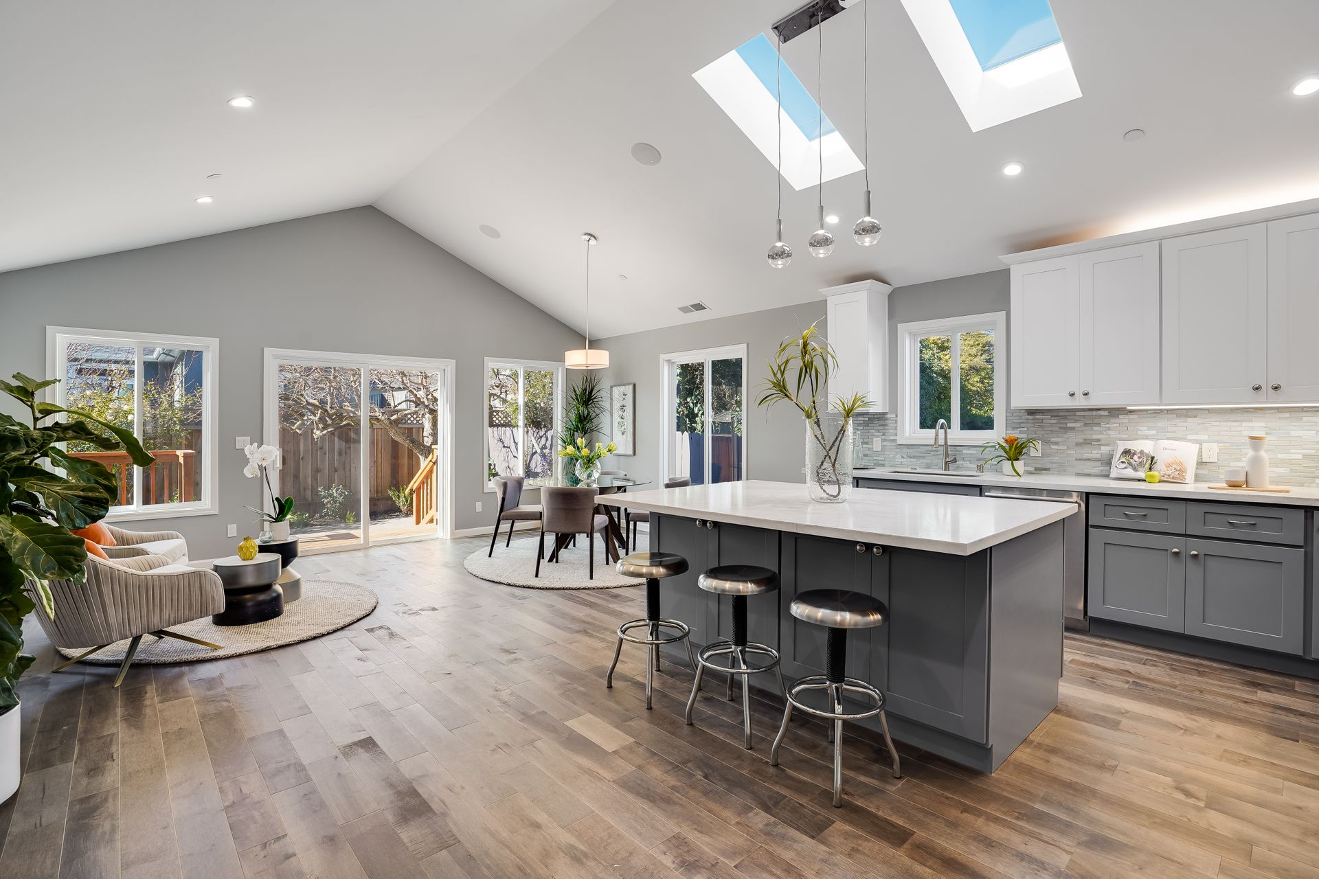 STUNNING San Mateo Village modern masterpiece on one of the most desirable streets in the neighborhood. Expanded and completely renovated 4BD, 3BA house with a fabulous floor plan maximizing comfort with an open concept flow. Fantastic large chef's kitchen w/Thermador 36" range & dishwasher, Zephyr vent hood, ample cabinetry, and an island ready to entertain your family and friends. You'll love the high vaulted ceilings illuminating natural light into the kitchen/family/dining great room. Beautiful maple hardwood floors, LED recessed lighting, and energy efficient features throughout. Your spacious master BD sanctuary has 2 closets, an incredible BA ensuite w/double sink vanities, LED mirror, and luxurious tiled shower. All 3 full bathrooms have gorgeous glass, subway, ceramic, limestone tile work furnished with Hansgrohe fixtures.
