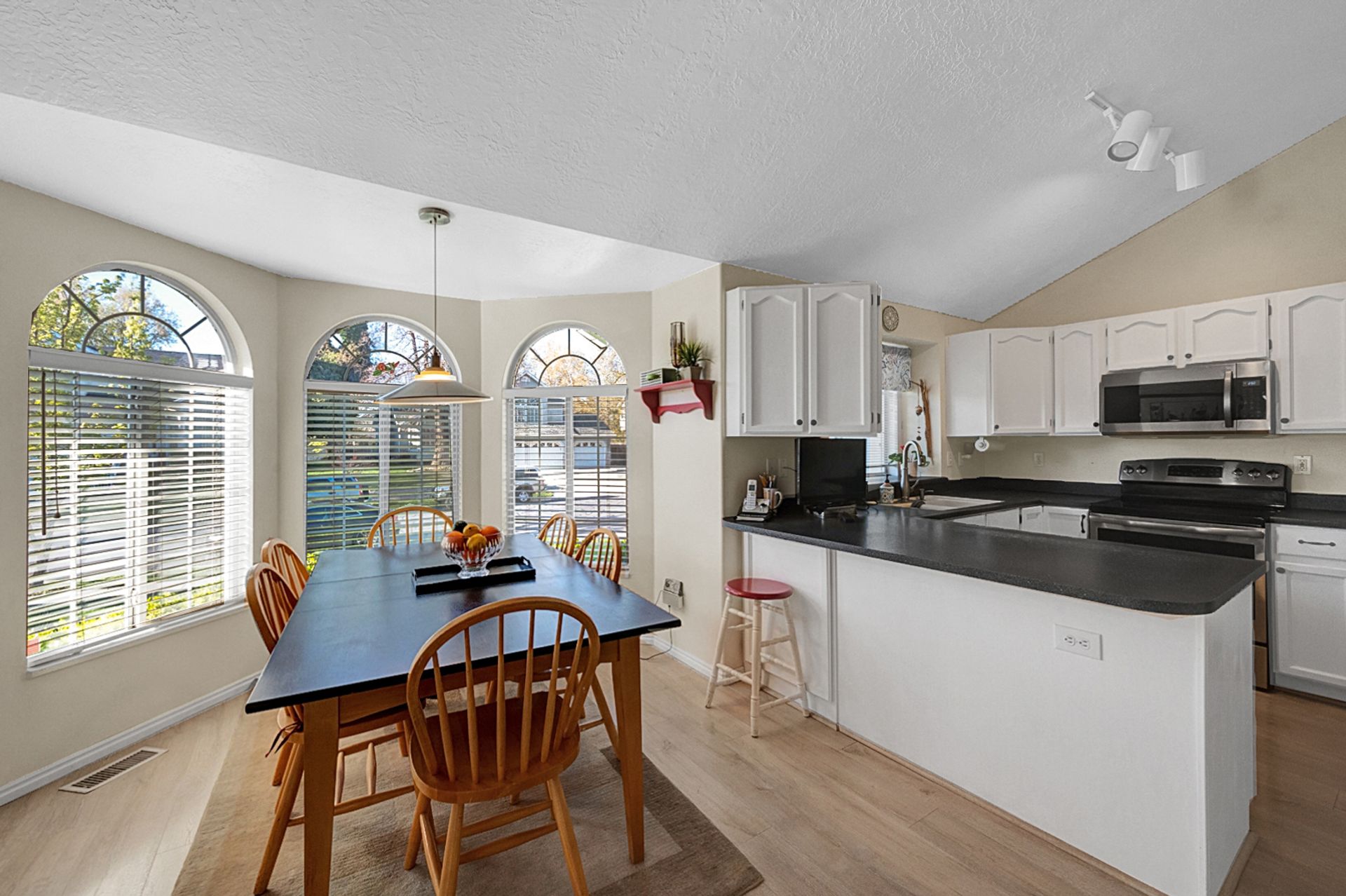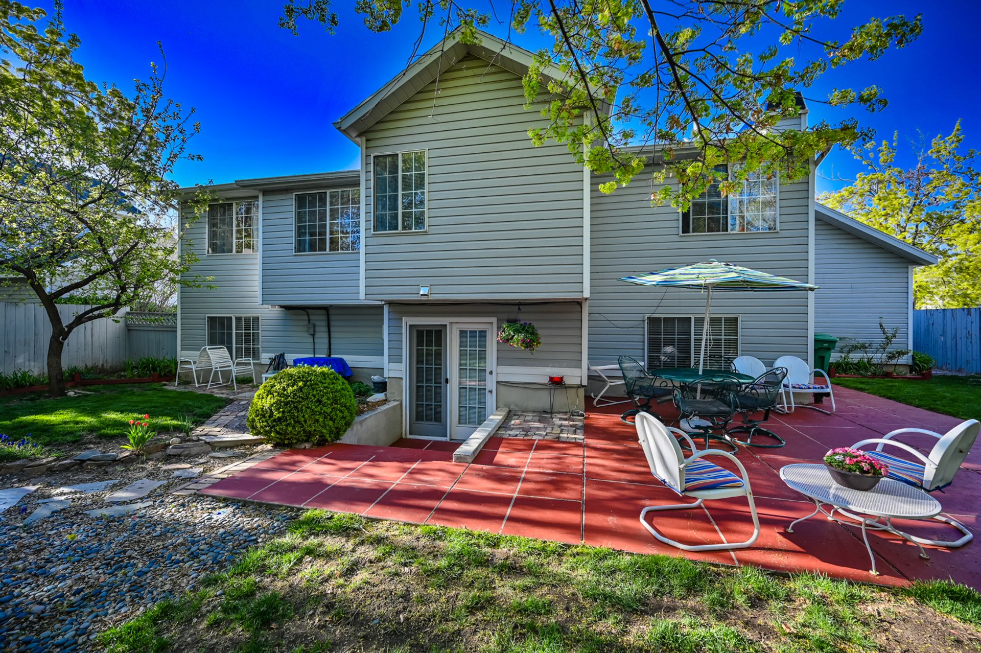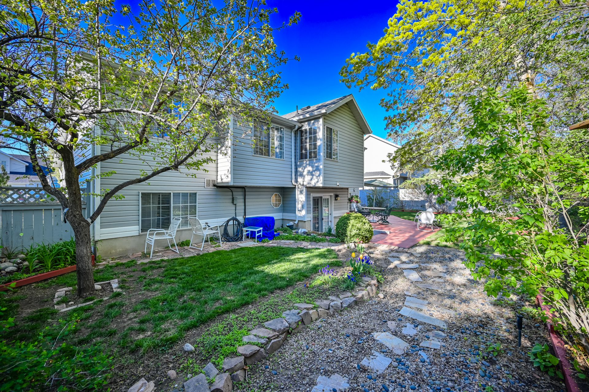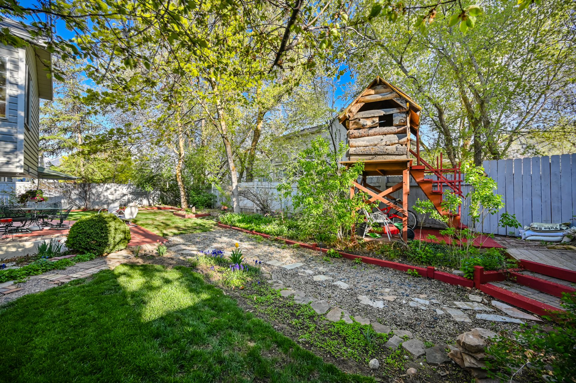 Light and bright. Bay windows light up beautiful vaulted ceilings! Modern white kitchen with stainless steel appliances. New wood laminate flooring. Master bath with garden tub. You'll find a piece of heaven in the backyard. Perfect for entertaining on the beautiful patio. Everyone will love the log-sided treehouse.