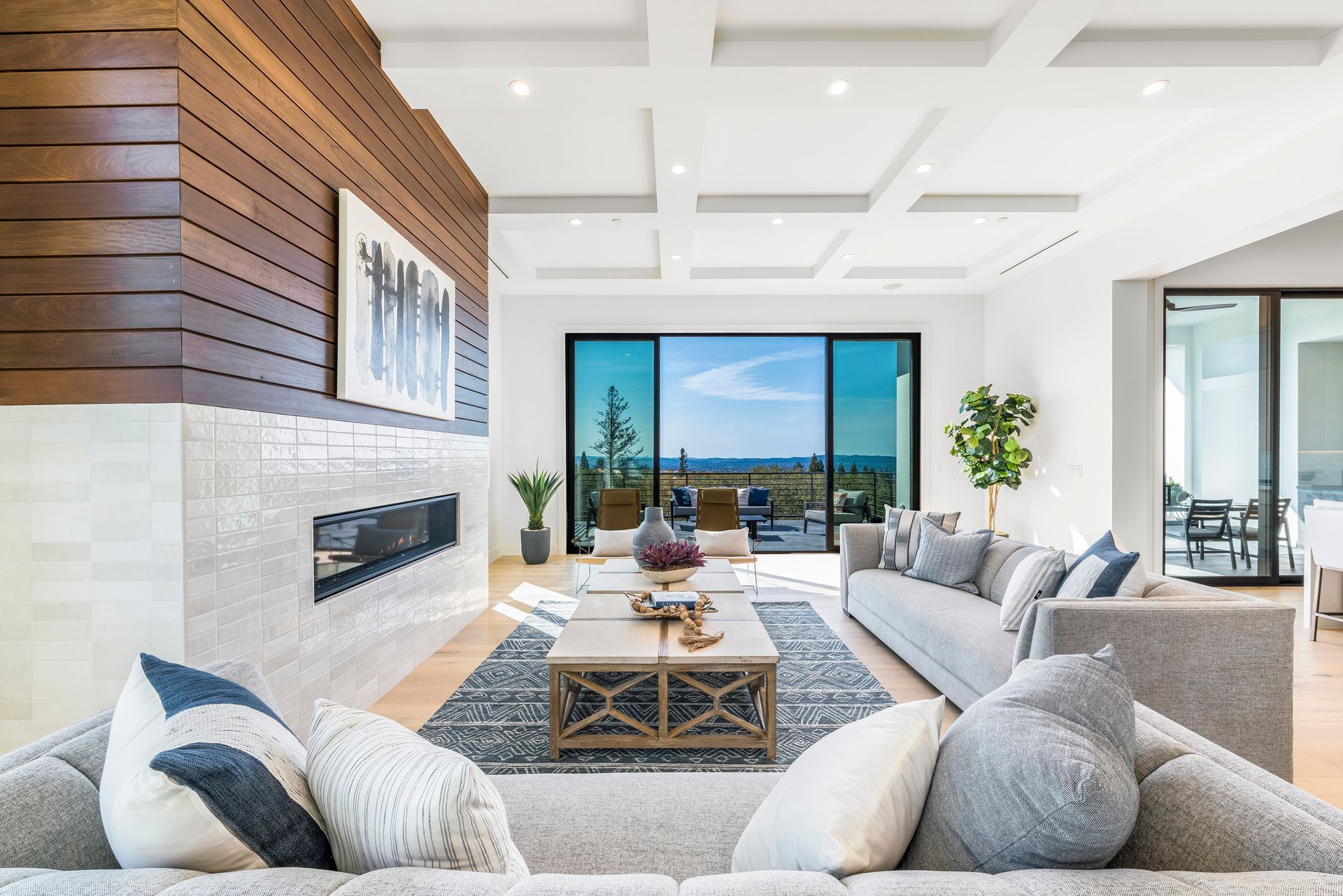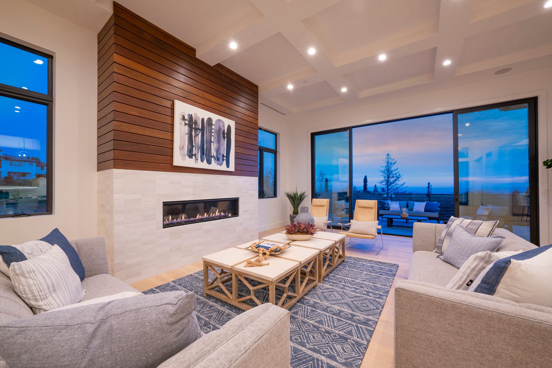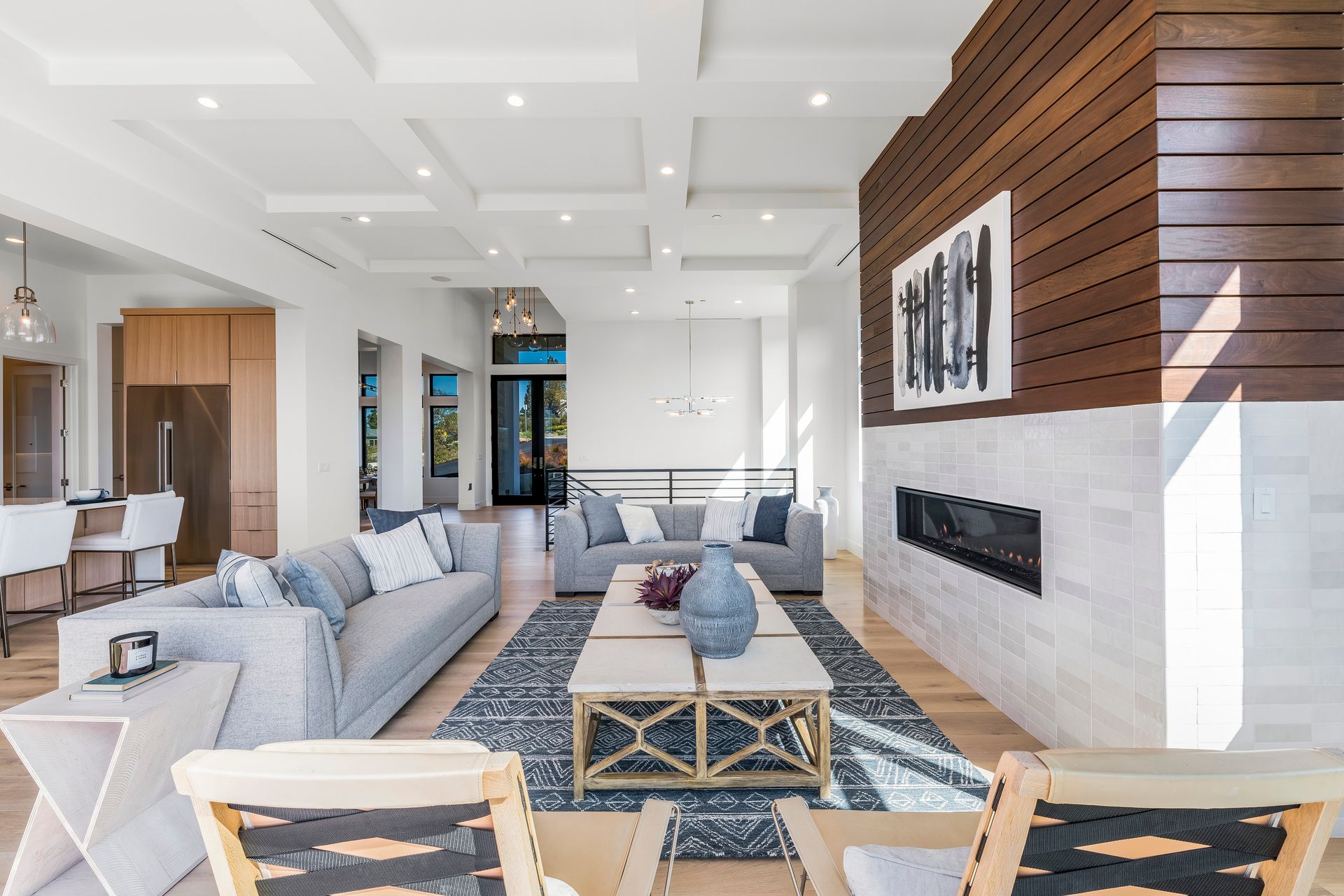 Great room living with architecturally appealing coffered ceiling, linear fireplace set in an accent wall highlighted by Ipe wood, hardwood flooring and 16 x 10 foot high glass doors to the view terrace