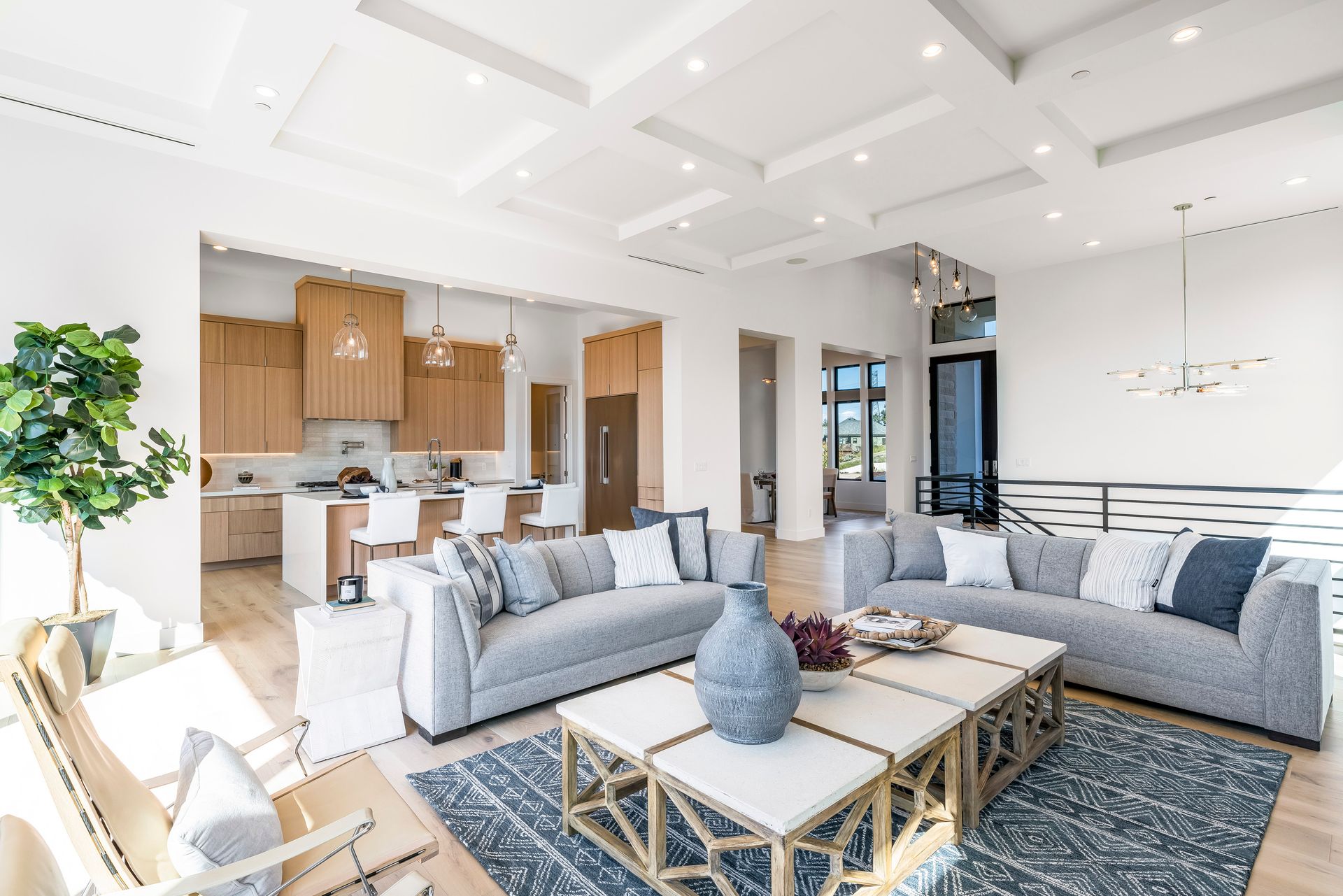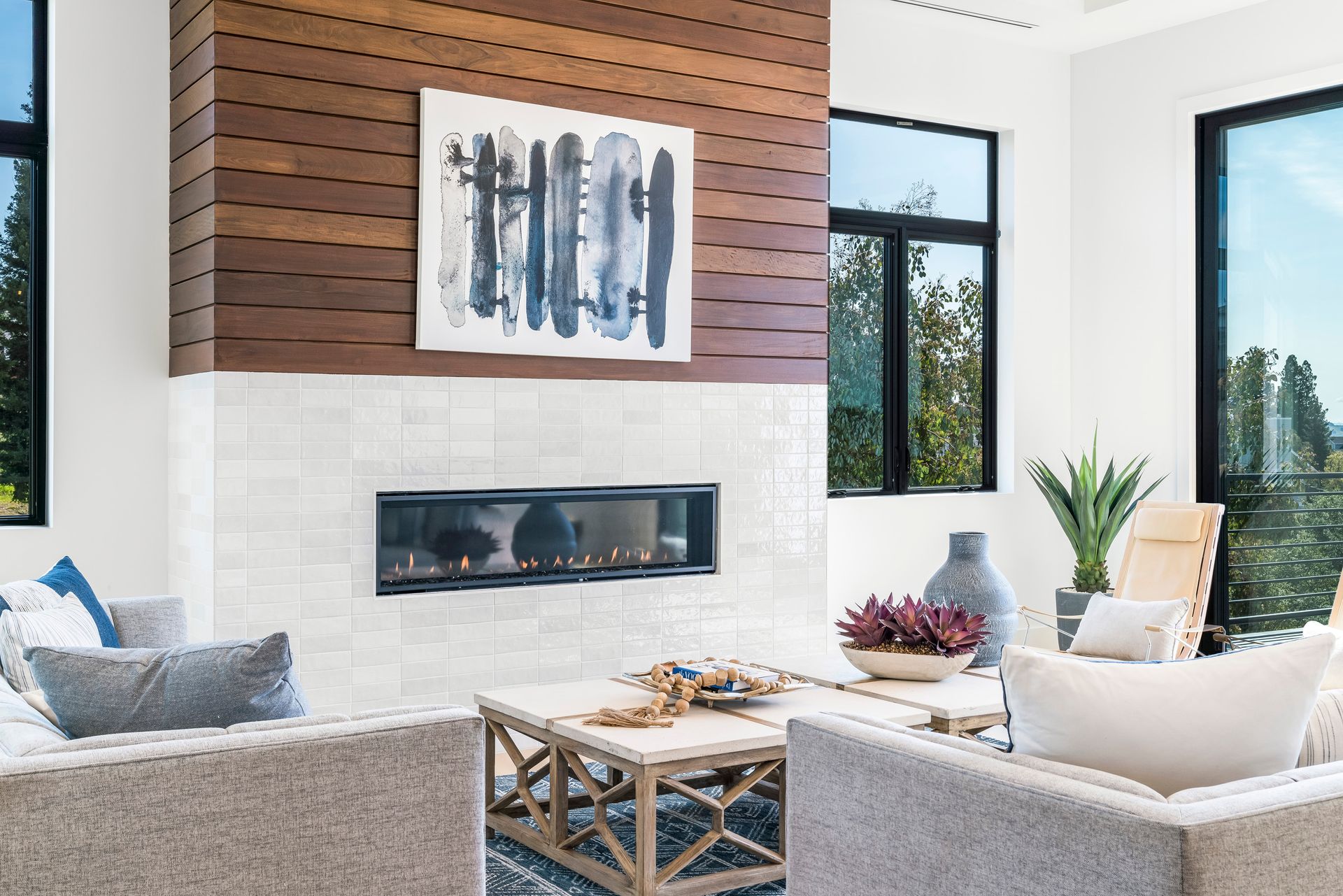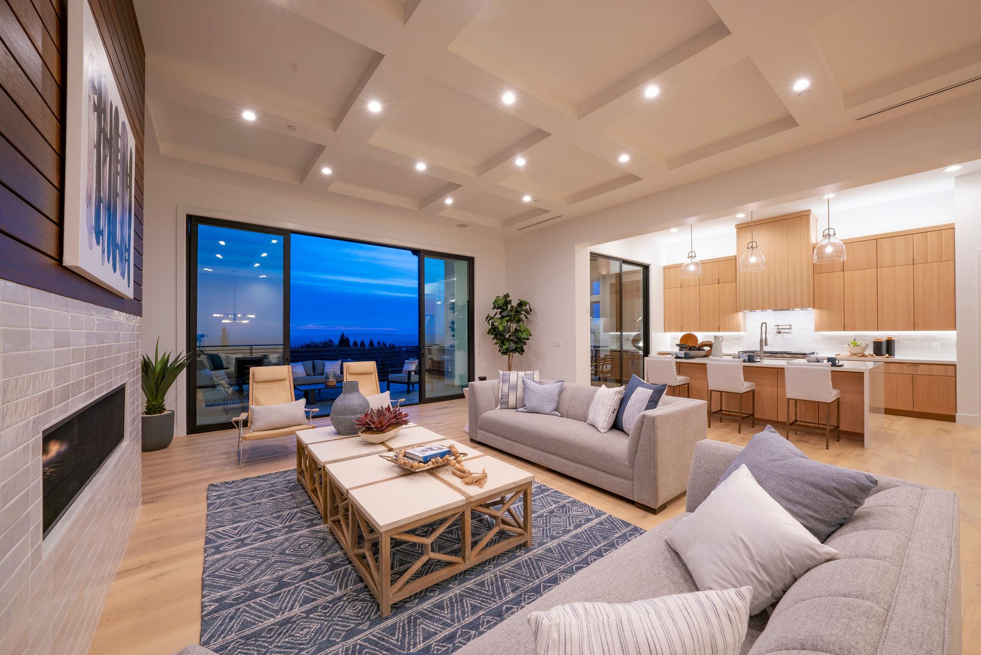Great room living with architecturally appealing coffered ceiling, linear fireplace set in an accent wall highlighted by Ipe wood, hardwood flooring and 16 x 10 foot high glass doors to the view terrace
