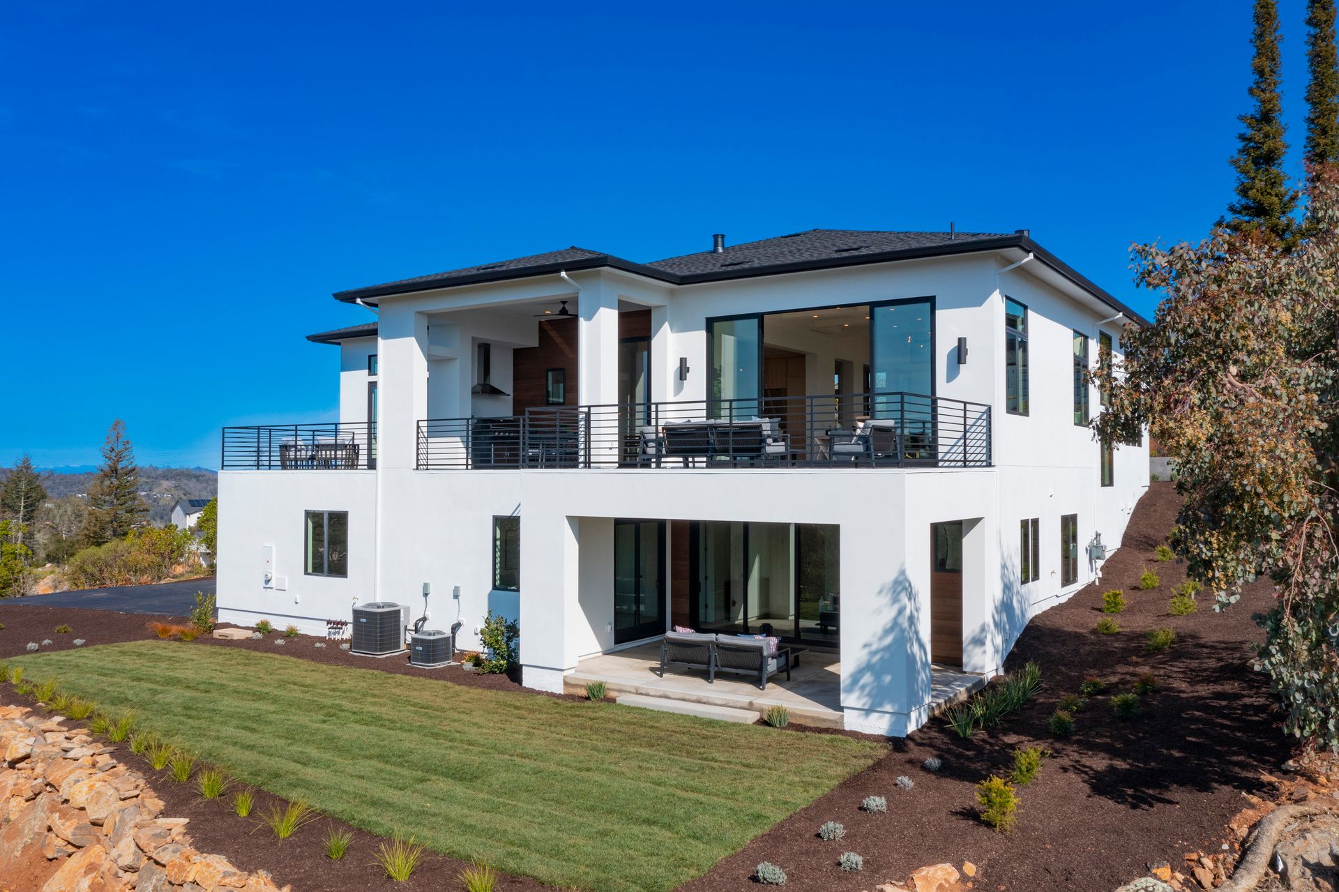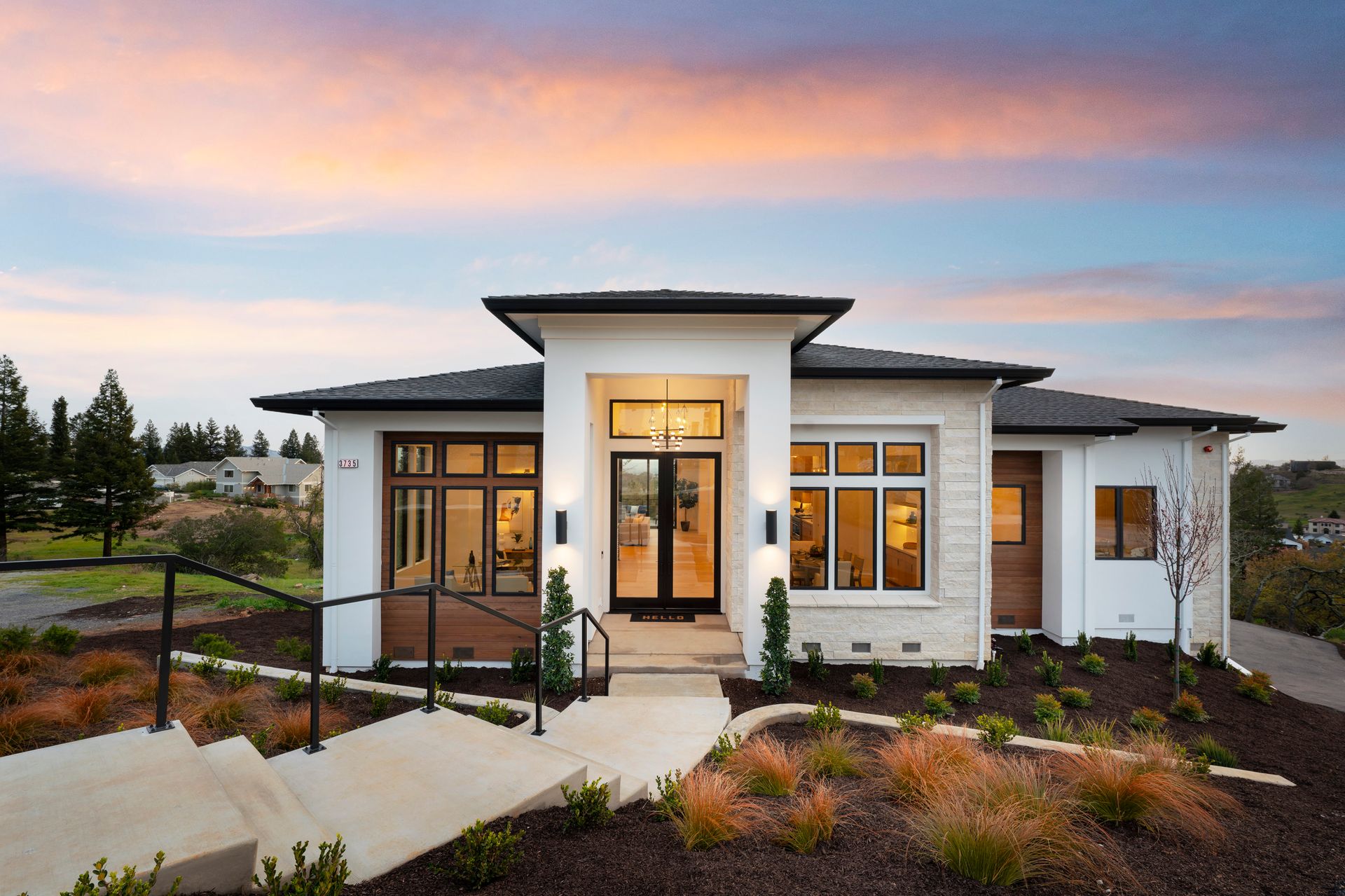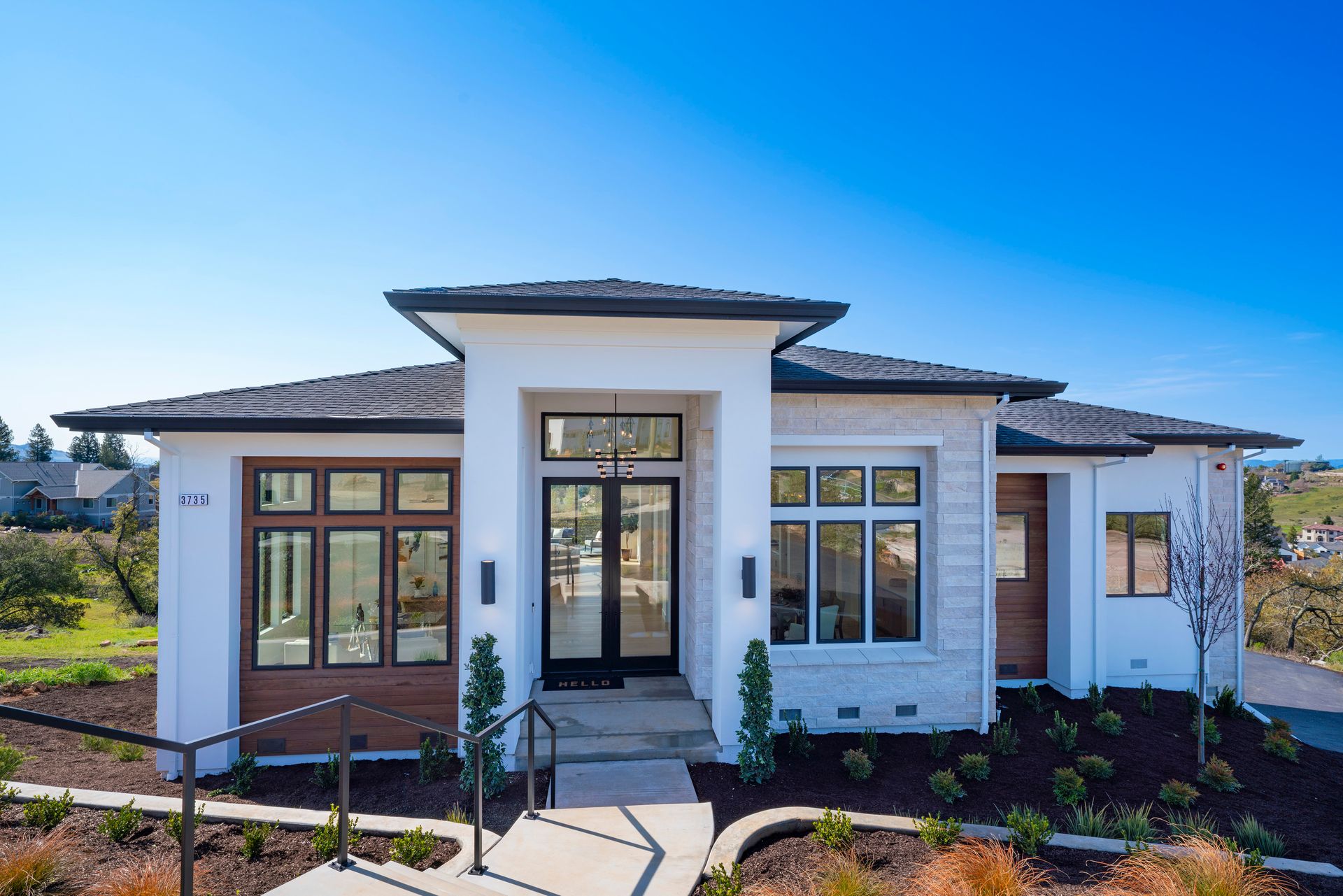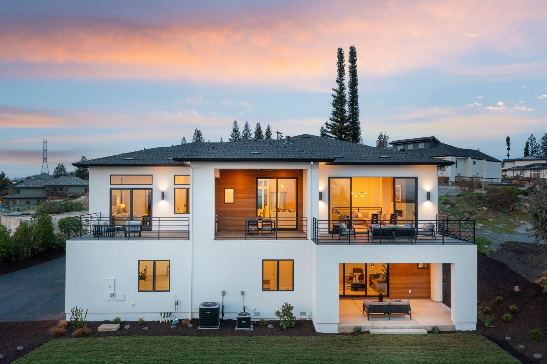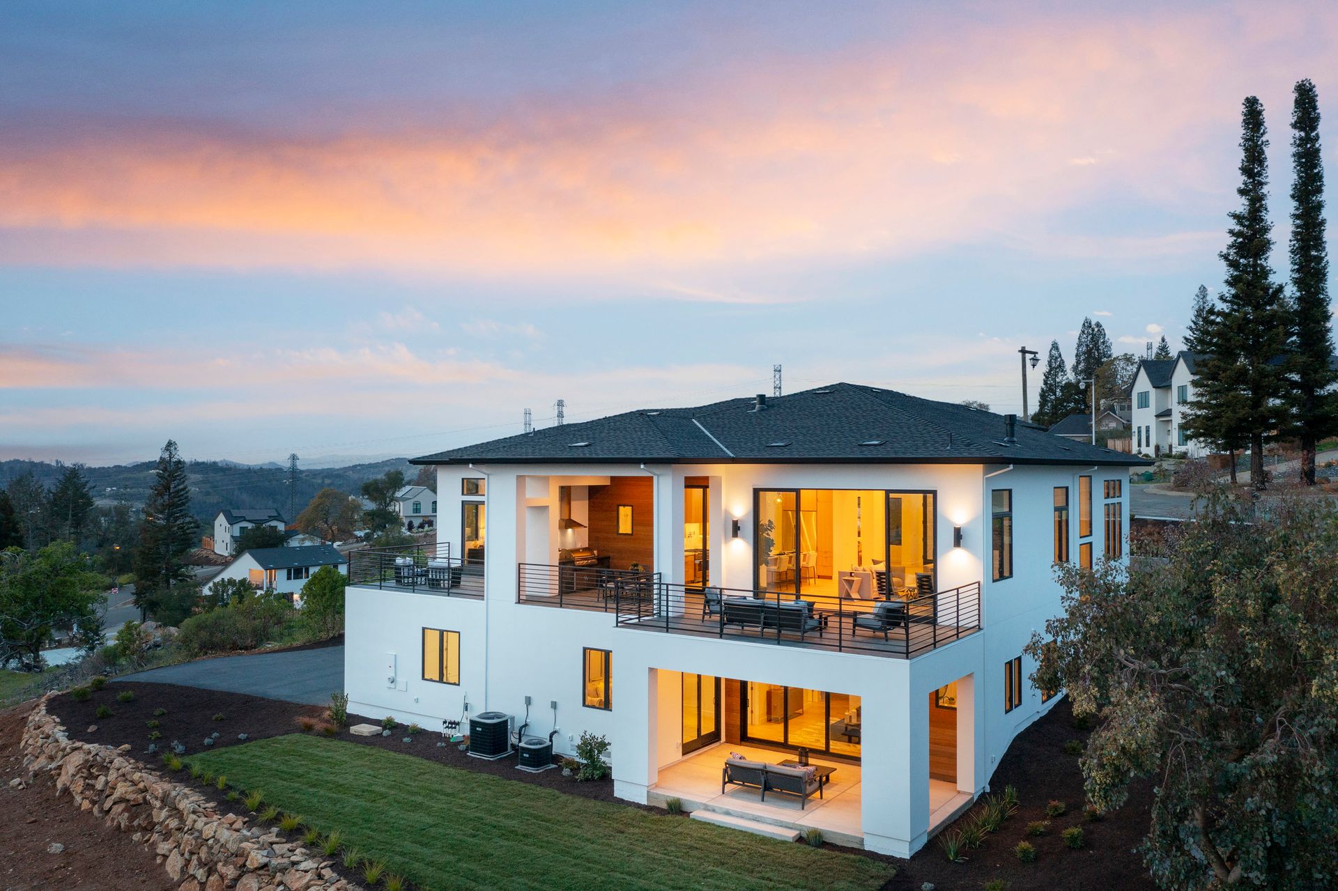 This newly constructed home on nearly 1/3 acre offers sweeping city light views. Located on a quiet cul-de-sac, the exceptional designer appeal showcases double glass entry doors, extensive use of wide plank hardwood flooring and an accent wall of Brazilian Ipe wood. The design style is contemporary with an open concept floor plan. The great room with architecturally appealing coffered ceiling features a linear fireplace and 16 x 10 foot high sliders to the view terrace. The kitchen, open to the great room, has a large island with quartz counter and slider to the built-in Summerset outdoor grill on the terrace. Additionally, there is a formal dining room, a home office, and the primary suite on the main level. The lower level includes 2 bedrooms (one en-ensuite) and a bonus/game room with stacking sliders to the covered patio and lawn area. This distinctive custom home is walking distance to Fir Ridge Park and set in the heart of wine country with close proximity to wineries, shopping & fine dining.