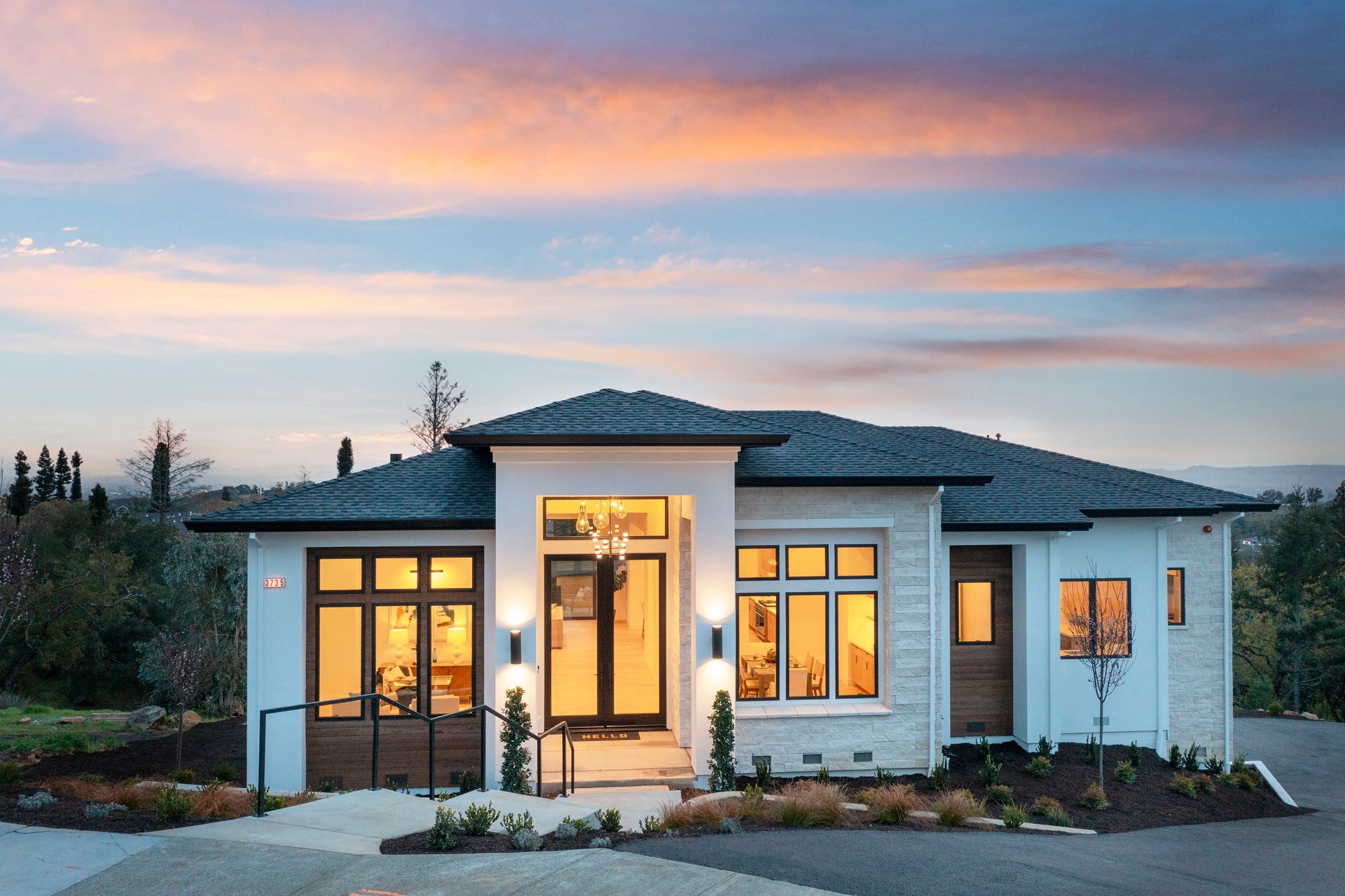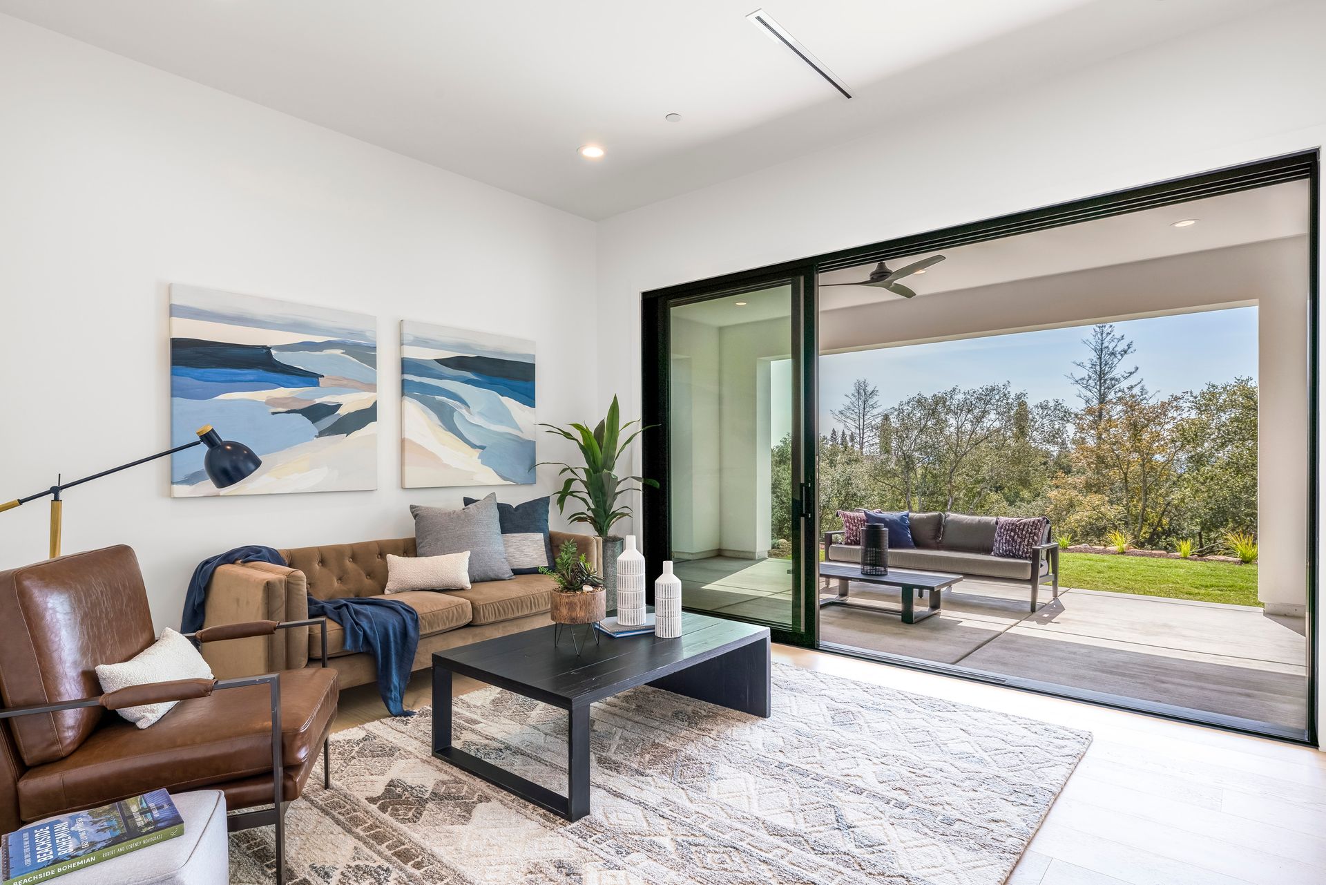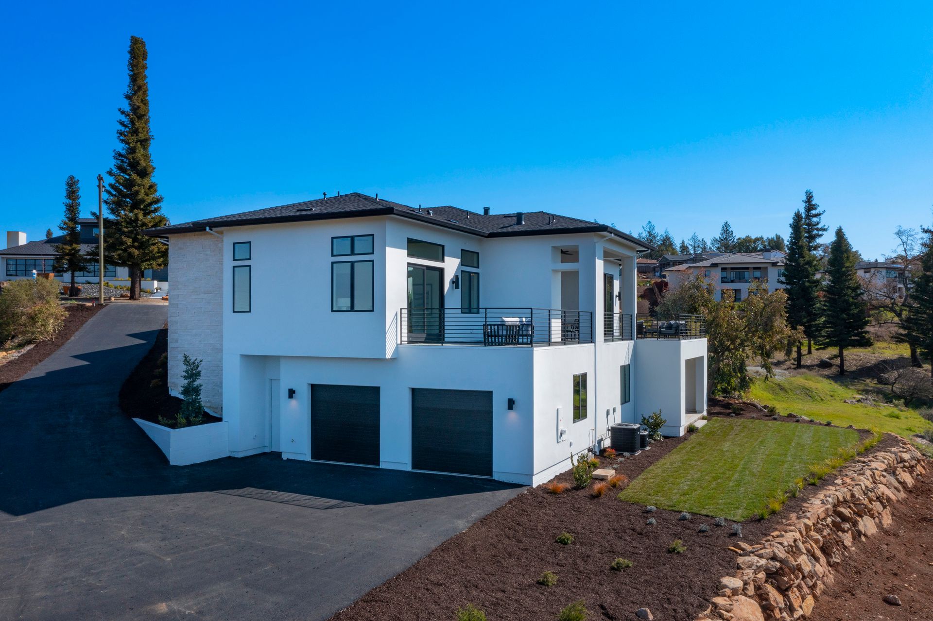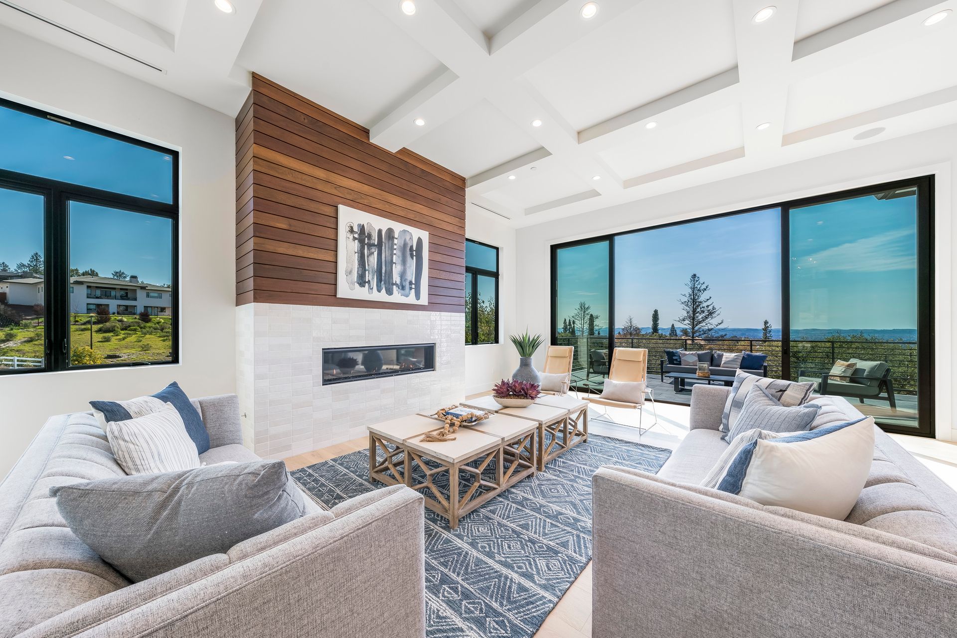 This newly constructed home on nearly 1/3 acre offers sweeping city light views. Located on a quiet cul-de-sac, the exceptional designer appeal showcases double glass entry doors, extensive use of wide plank hardwood flooring and an accent wall of Brazilian Ipe wood. The design style is contemporary with an open concept floor plan. The great room with architecturally appealing coffered ceiling features a linear fireplace and 16 x 10 foot high sliders to the view terrace. The kitchen, open to the great room, has a large island with quartz counter and slider to the built-in Summerset outdoor grill on the terrace. Additionally, there is a formal dining room, a home office, and the primary suite on the main level. The lower level includes 2 bedrooms (one en-ensuite) and a bonus/game room with stacking sliders to the covered patio and lawn area. This distinctive custom home is walking distance to Fir Ridge Park and set in the heart of wine country with close proximity to wineries, shopping & fine dining.