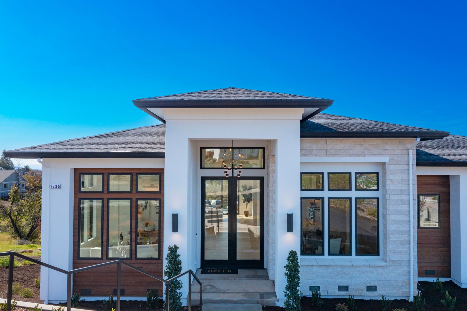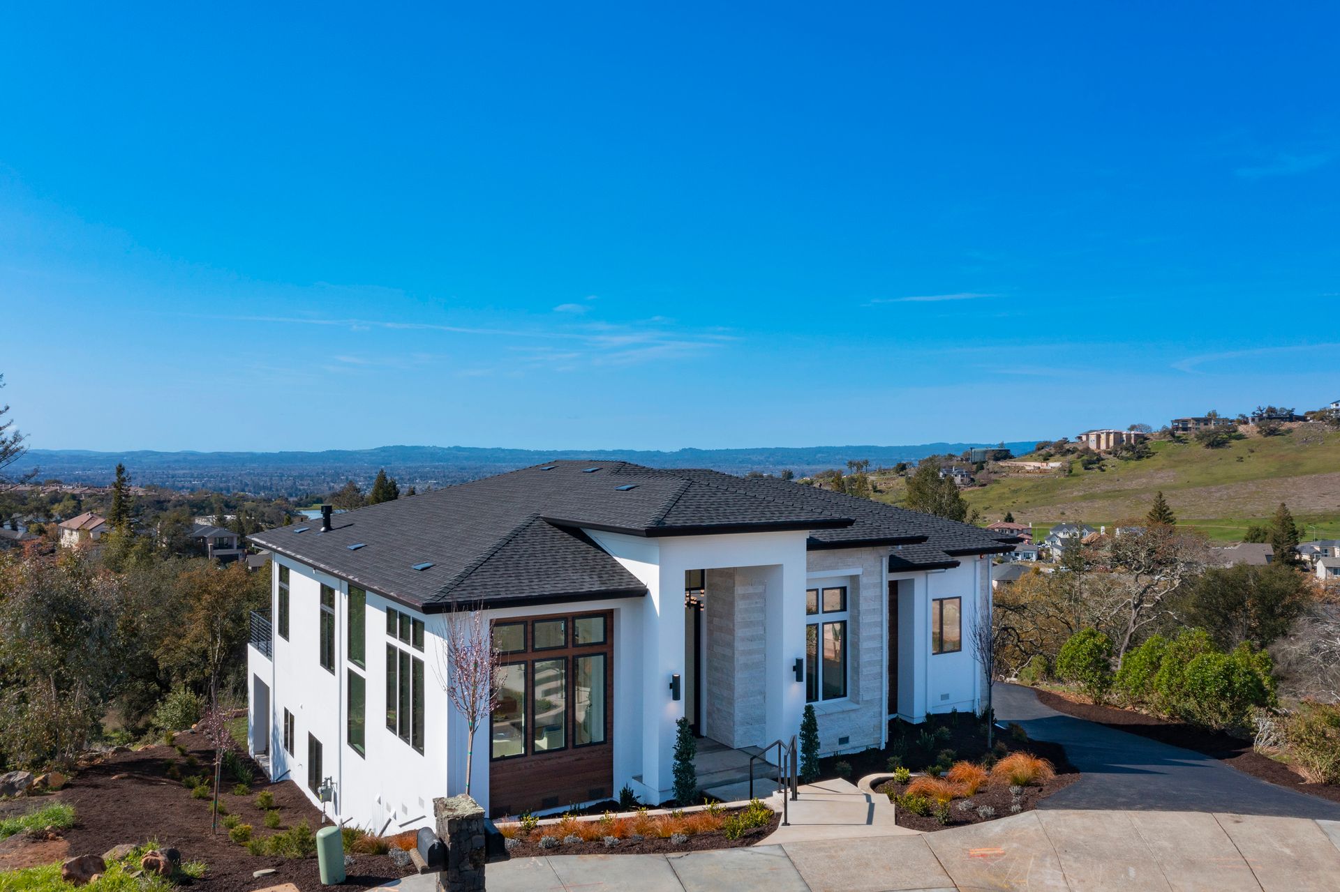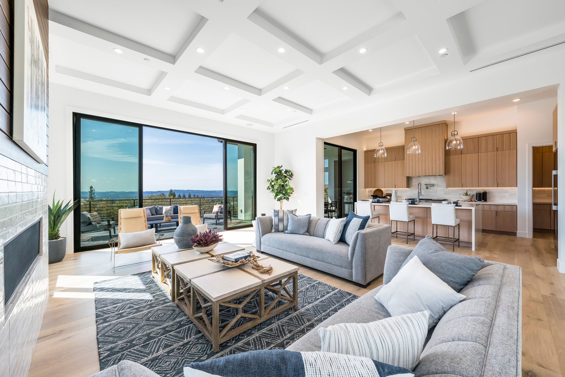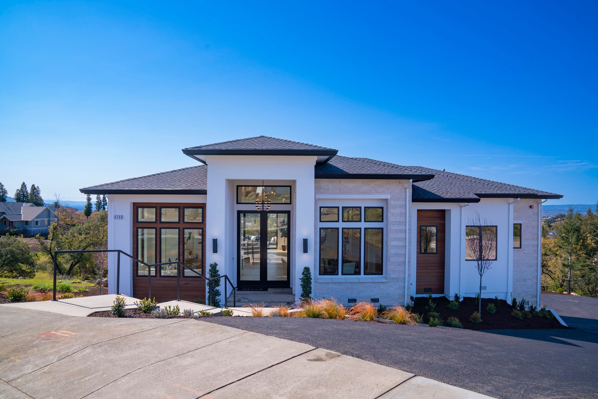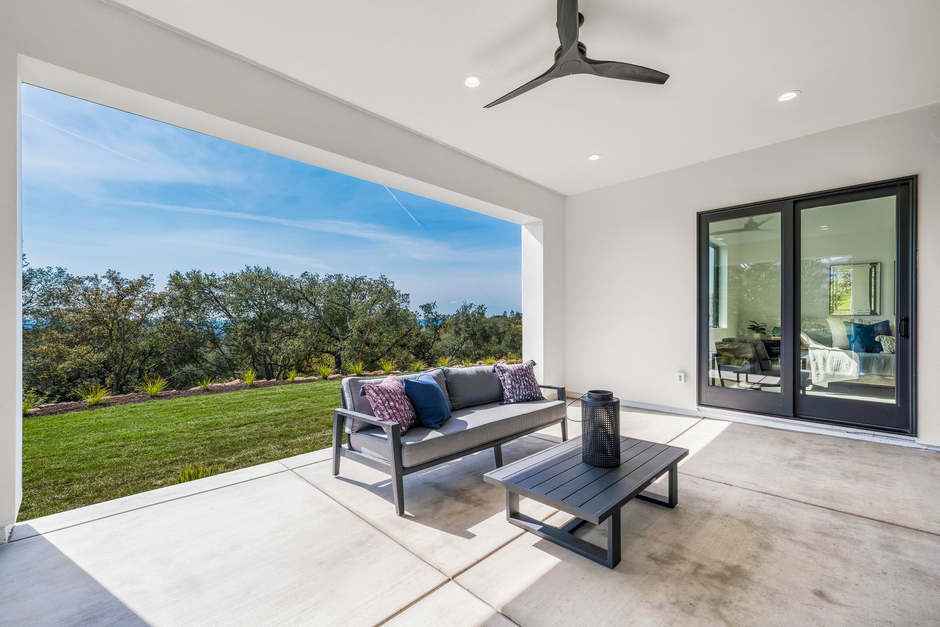 This newly constructed home on nearly 1/3 acre offers sweeping city light views. Located on a quiet cul-de-sac, the exceptional designer appeal showcases double glass entry doors, extensive use of wide plank hardwood flooring and an accent wall of Brazilian Ipe wood. The design style is contemporary with an open concept floor plan. The great room with architecturally appealing coffered ceiling features a linear fireplace and 16 x 10 foot high sliders to the view terrace. The kitchen, open to the great room, has a large island with quartz counter and slider to the built-in Summerset outdoor grill on the terrace. Additionally, there is a formal dining room, a home office, and the primary suite on the main level. The lower level includes 2 bedrooms (one en-ensuite) and a bonus/game room with stacking sliders to the covered patio and lawn area. This distinctive custom home is walking distance to Fir Ridge Park and set in the heart of wine country with close proximity to wineries, shopping & fine dining.