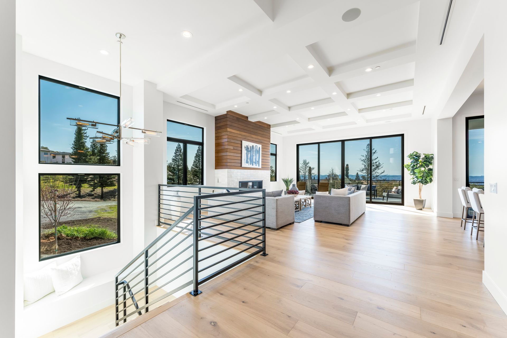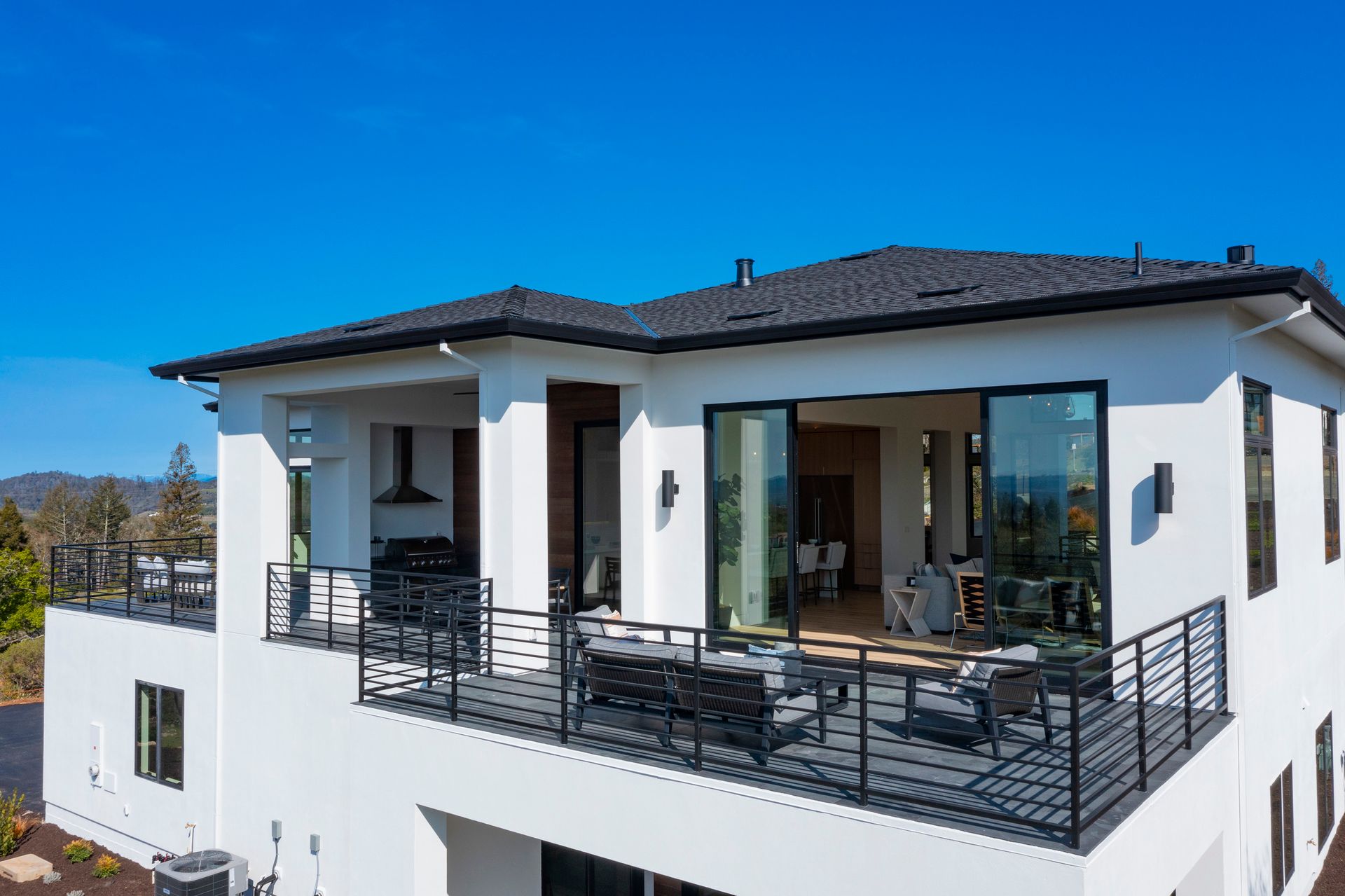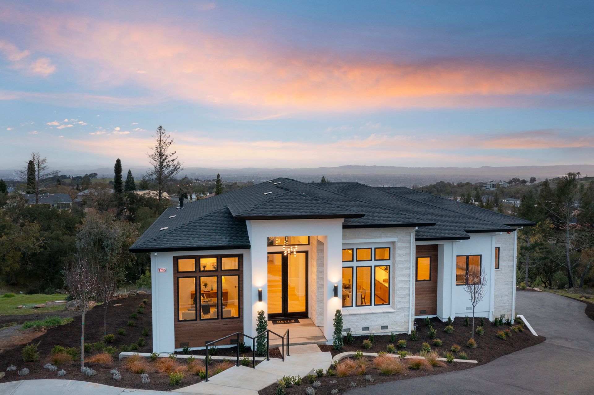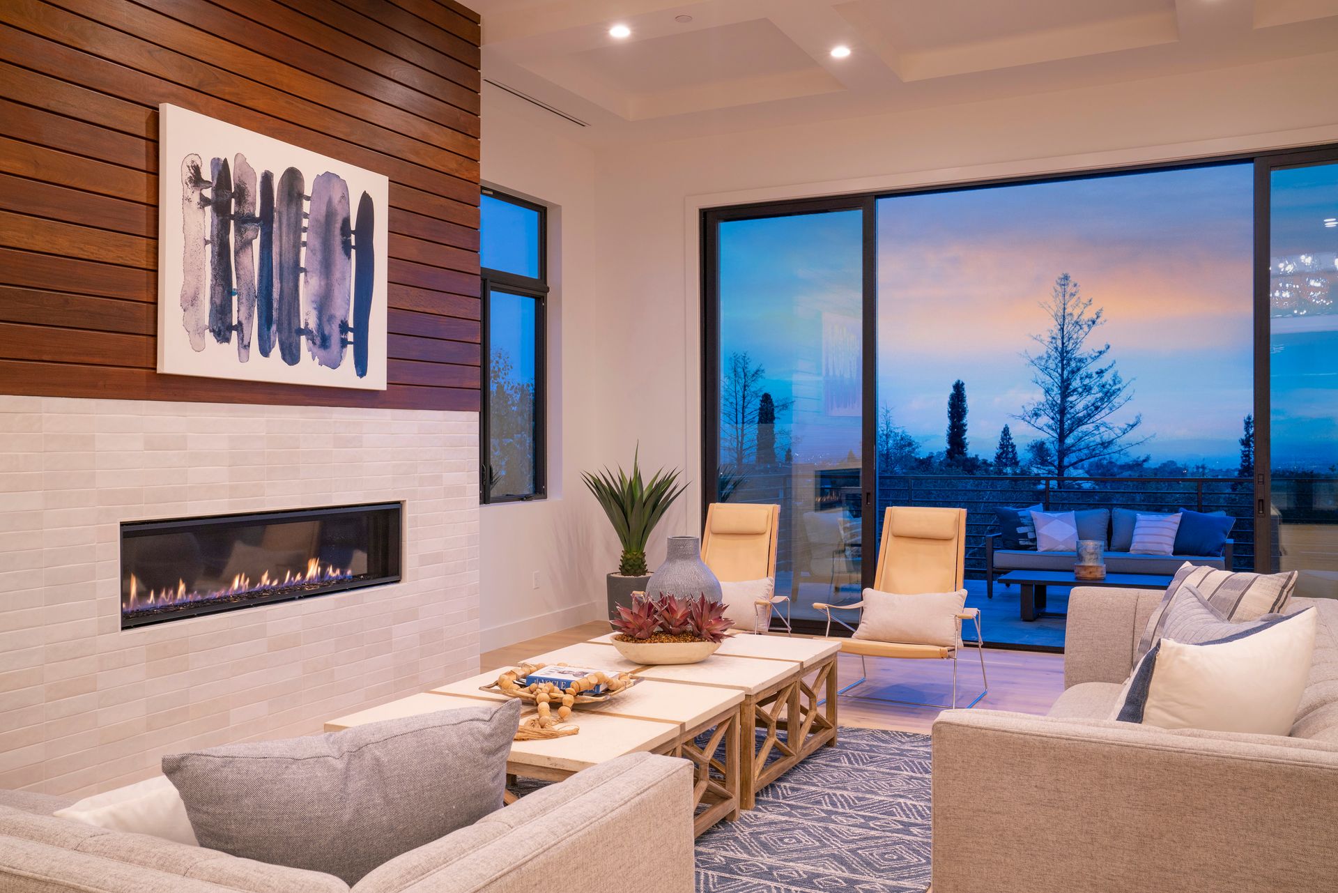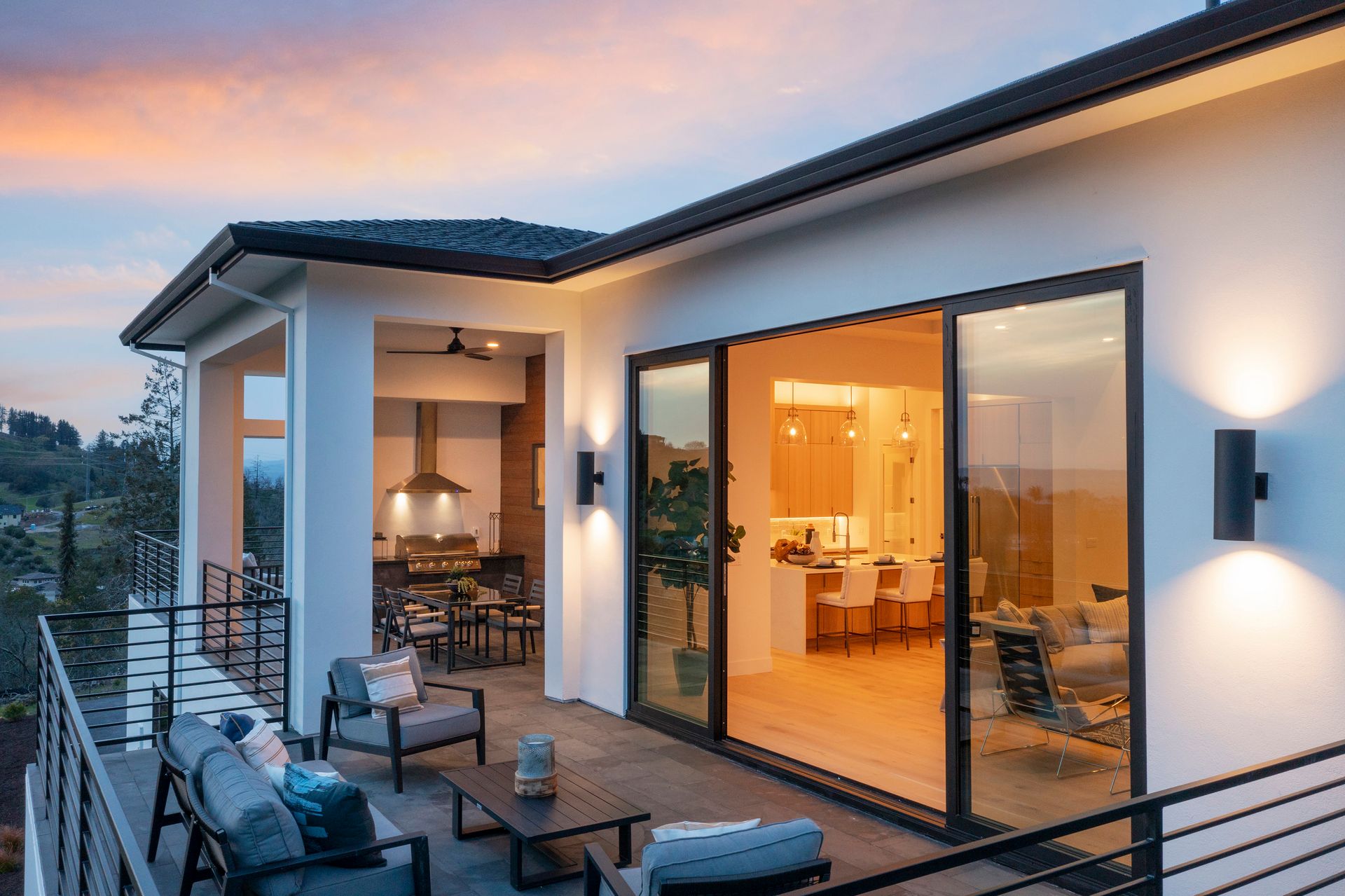 This newly constructed home on nearly 1/3 acre offers sweeping city light views. Located on a quiet cul-de-sac, the exceptional designer appeal showcases double glass entry doors, extensive use of wide plank hardwood flooring and an accent wall of Brazilian Ipe wood. The design style is contemporary with an open concept floor plan. The great room with architecturally appealing coffered ceiling features a linear fireplace and 16 x 10 foot high sliders to the view terrace. The kitchen, open to the great room, has a large island with quartz counter and slider to the built-in Summerset outdoor grill on the terrace. Additionally, there is a formal dining room, a home office, and the primary suite on the main level. The lower level includes 2 bedrooms (one en-ensuite) and a bonus/game room with stacking sliders to the covered patio and lawn area. This distinctive custom home is walking distance to Fir Ridge Park and set in the heart of wine country with close proximity to wineries, shopping & fine dining.