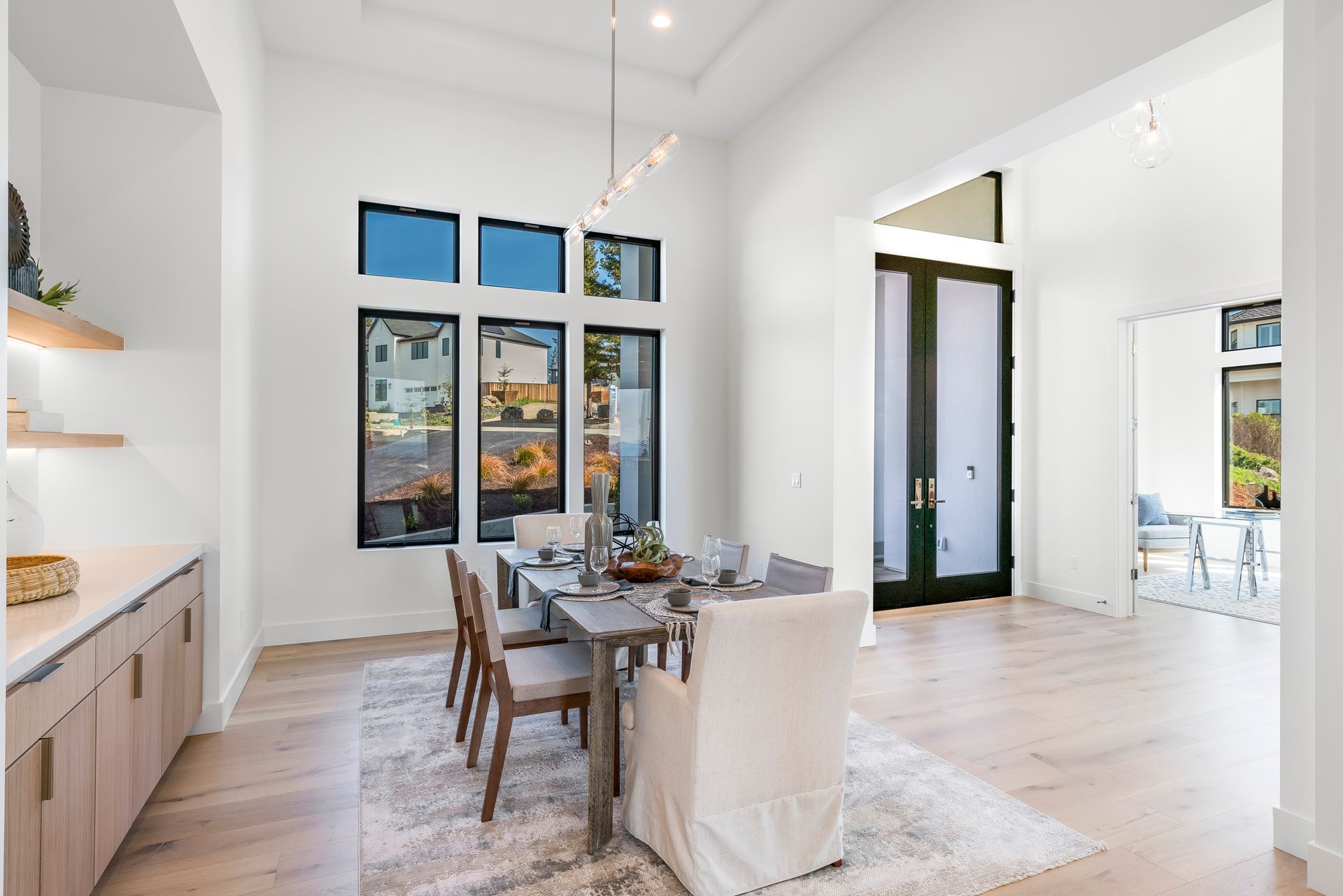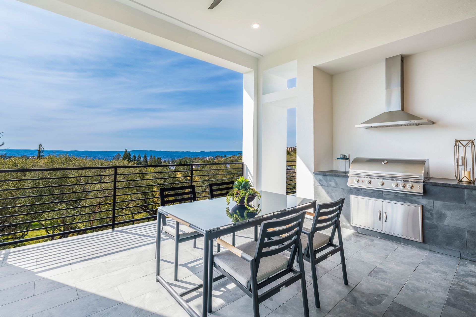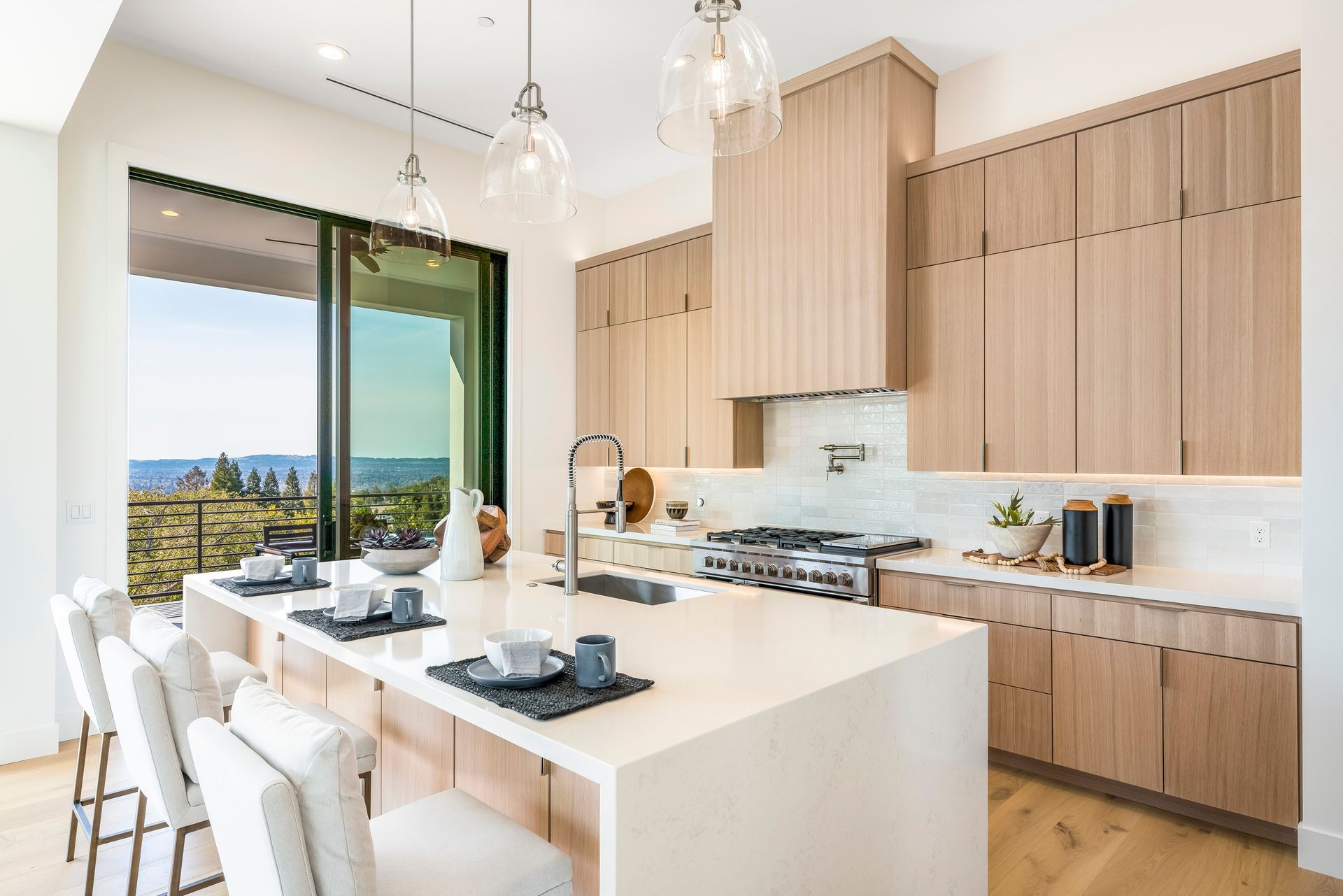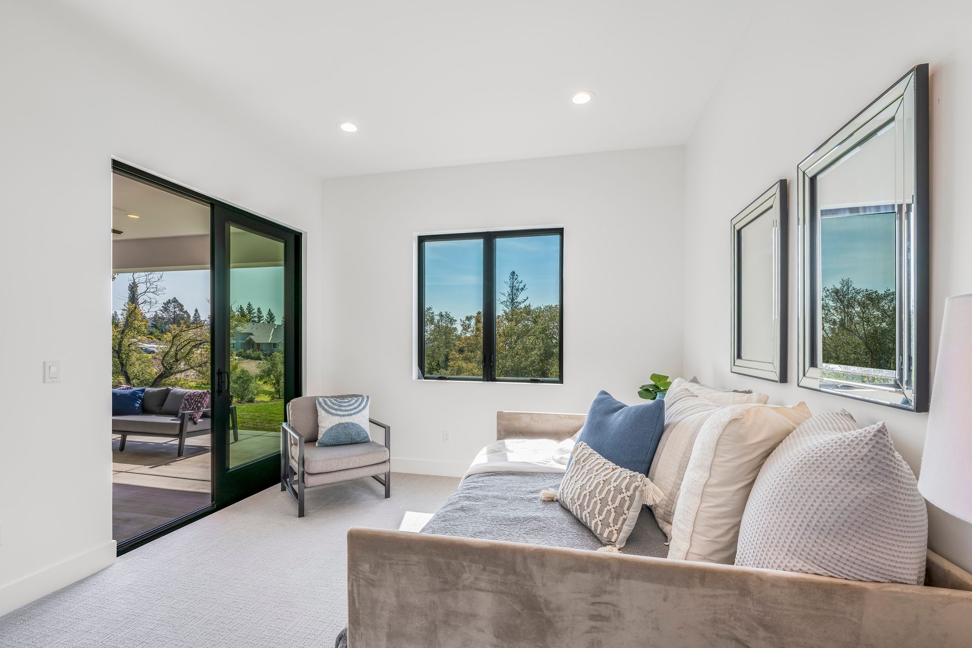 This newly constructed home on nearly 1/3 acre offers sweeping city light views. Located on a quiet cul-de-sac, the exceptional designer appeal showcases double glass entry doors, extensive use of wide plank hardwood flooring and an accent wall of Brazilian Ipe wood. The design style is contemporary with an open concept floor plan. The great room with architecturally appealing coffered ceiling features a linear fireplace and 16 x 10 foot high sliders to the view terrace. The kitchen, open to the great room, has a large island with quartz counter and slider to the built-in Summerset outdoor grill on the terrace. Additionally, there is a formal dining room, a home office, and the primary suite on the main level. The lower level includes 2 bedrooms (one en-ensuite) and a bonus/game room with stacking sliders to the covered patio and lawn area. This distinctive custom home is walking distance to Fir Ridge Park and set in the heart of wine country with close proximity to wineries, shopping & fine dining.