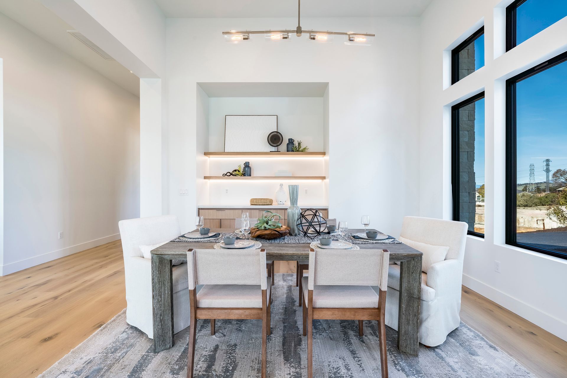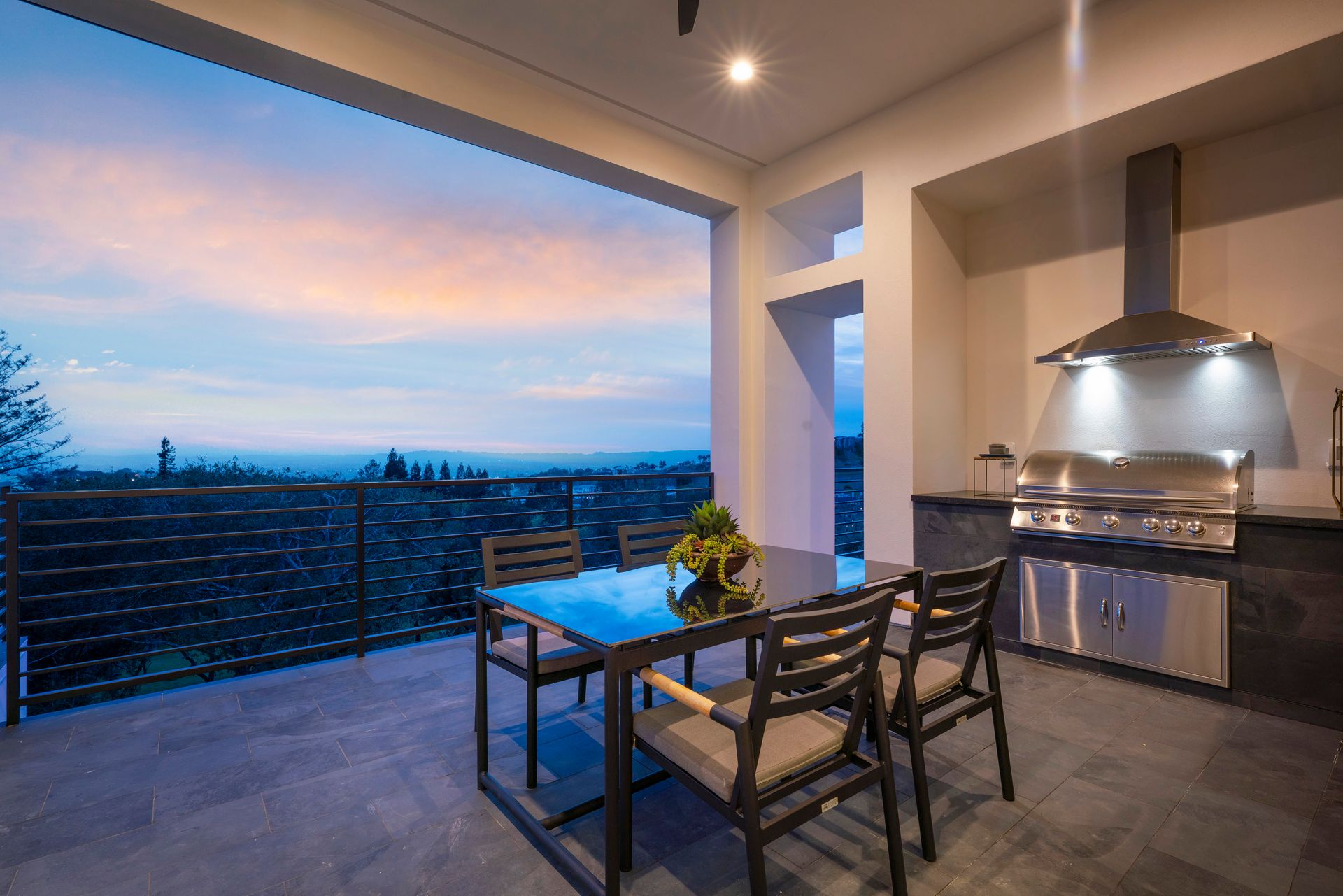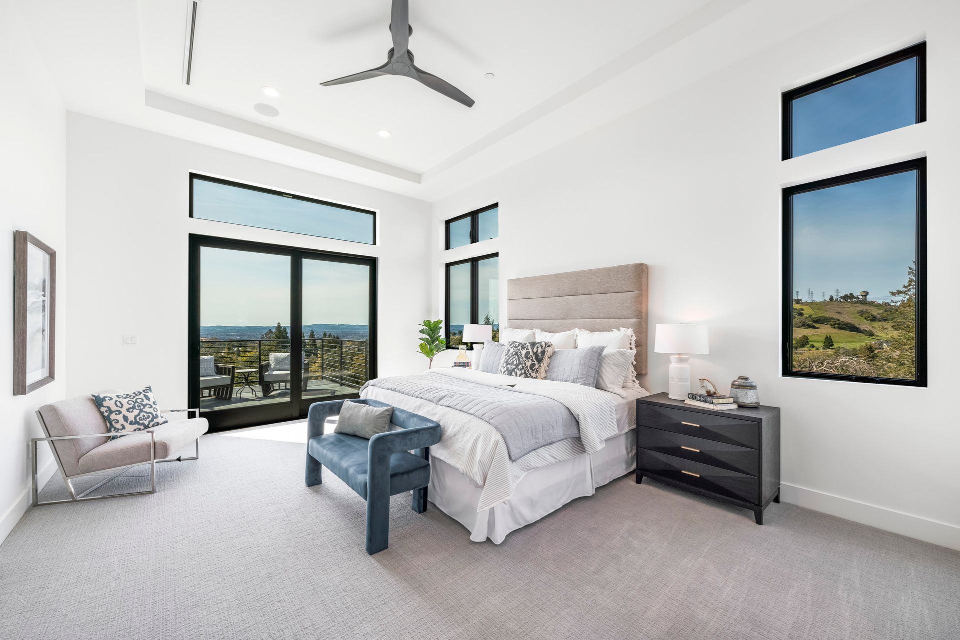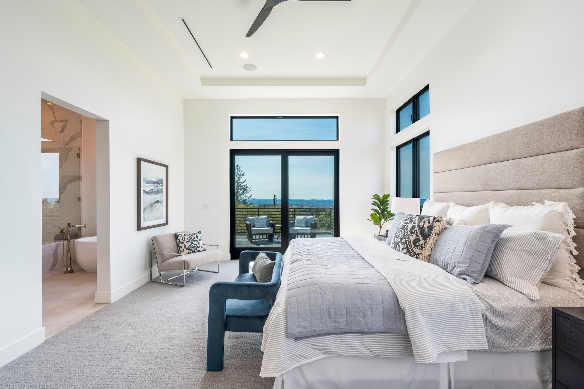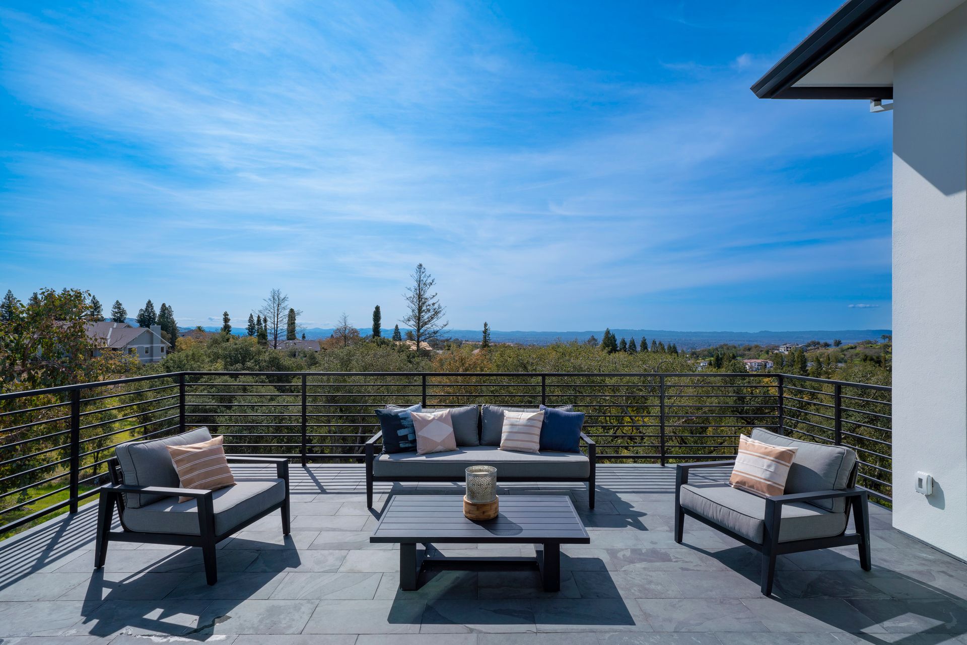This newly constructed home on nearly 1/3 acre offers sweeping city light views. Located on a quiet cul-de-sac, the exceptional designer appeal showcases double glass entry doors, extensive use of wide plank hardwood flooring and an accent wall of Brazilian Ipe wood. The design style is contemporary with an open concept floor plan. The great room with architecturally appealing coffered ceiling features a linear fireplace and 16 x 10 foot high sliders to the view terrace. The kitchen, open to the great room, has a large island with quartz counter and slider to the built-in Summerset outdoor grill on the terrace. Additionally, there is a formal dining room, a home office, and the primary suite on the main level. The lower level includes 2 bedrooms (one en-ensuite) and a bonus/game room with stacking sliders to the covered patio and lawn area. This distinctive custom home is walking distance to Fir Ridge Park and set in the heart of wine country with close proximity to wineries, shopping & fine dining.