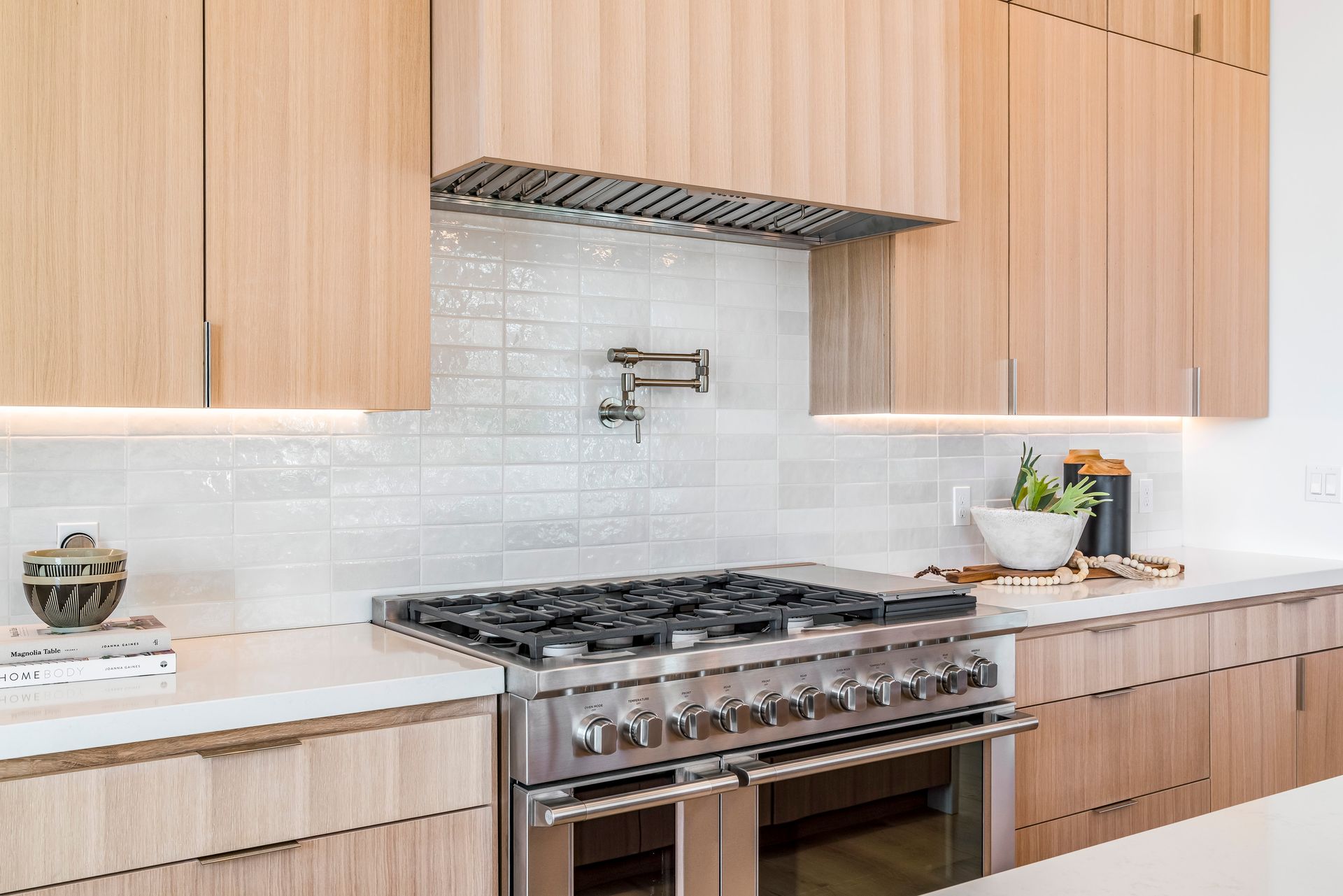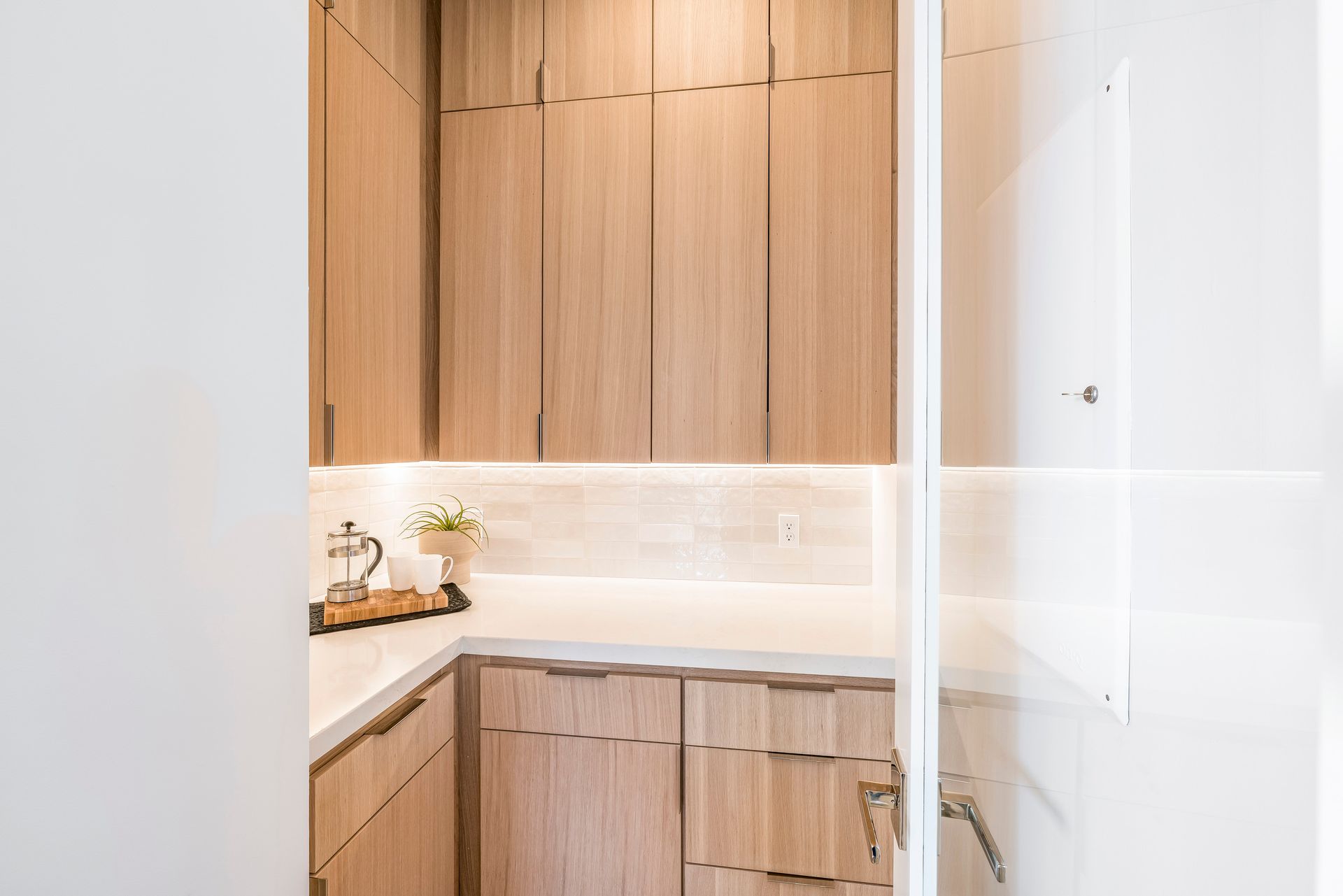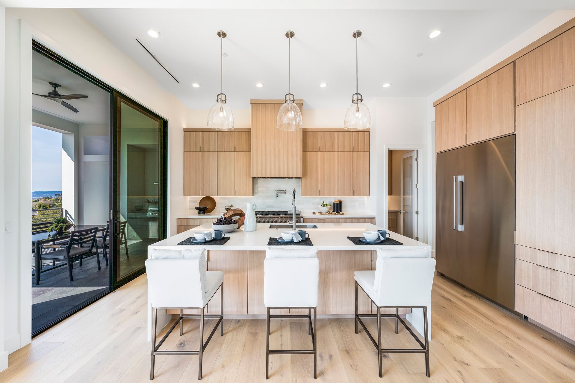 Kitchen boasts a large center island with quartz counter, recessed lighting, built-in Dacor column refrigerator/freezer, Fisher-Paykel 6 burner gas range with griddle and double ovens, wall mounted pot filler, Fisher-Paykel dishwasher, microwave drawer, hood over range, soft close cabinets and drawers, walk-in pantry, slider to the view terrace with built-in Summerset grill