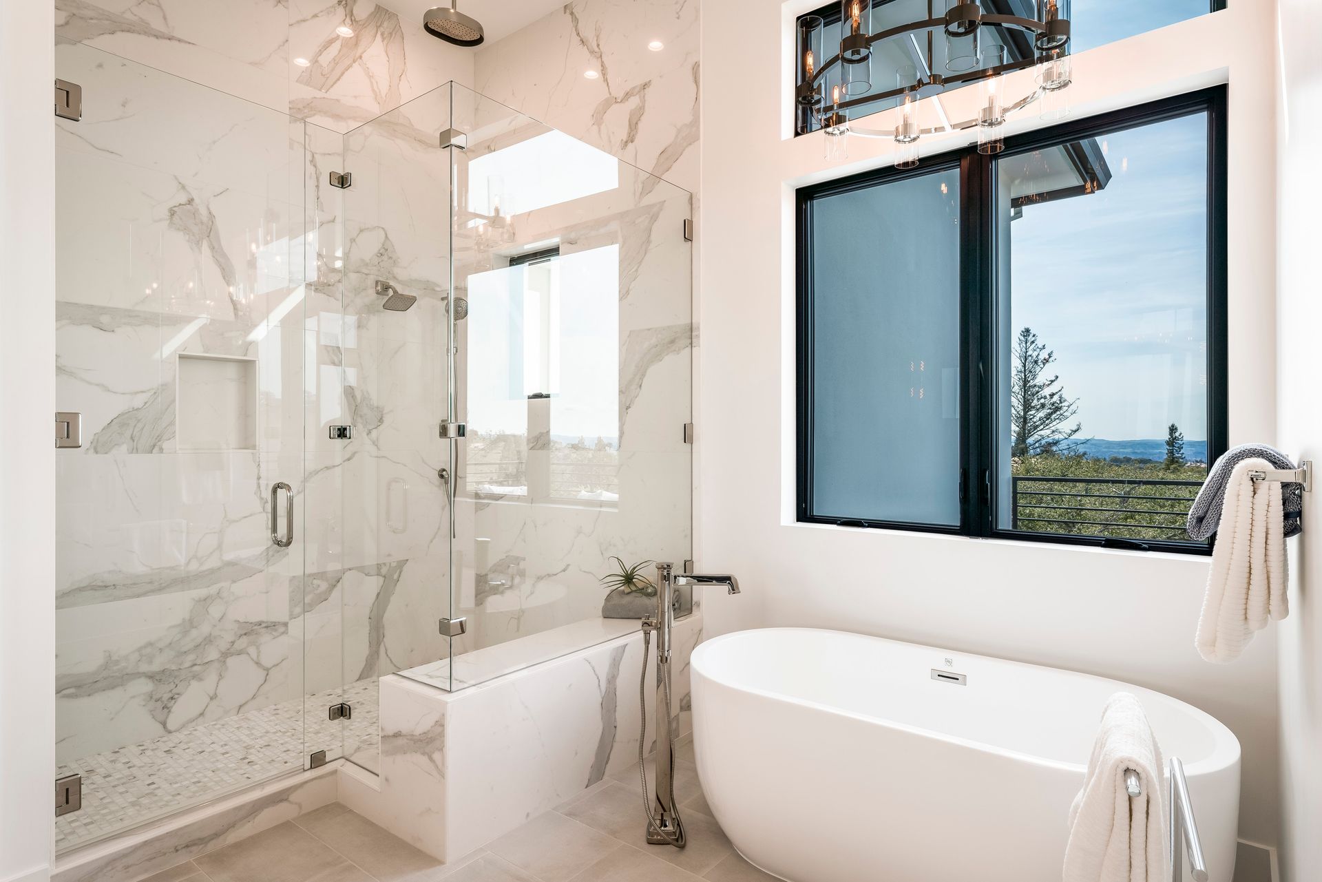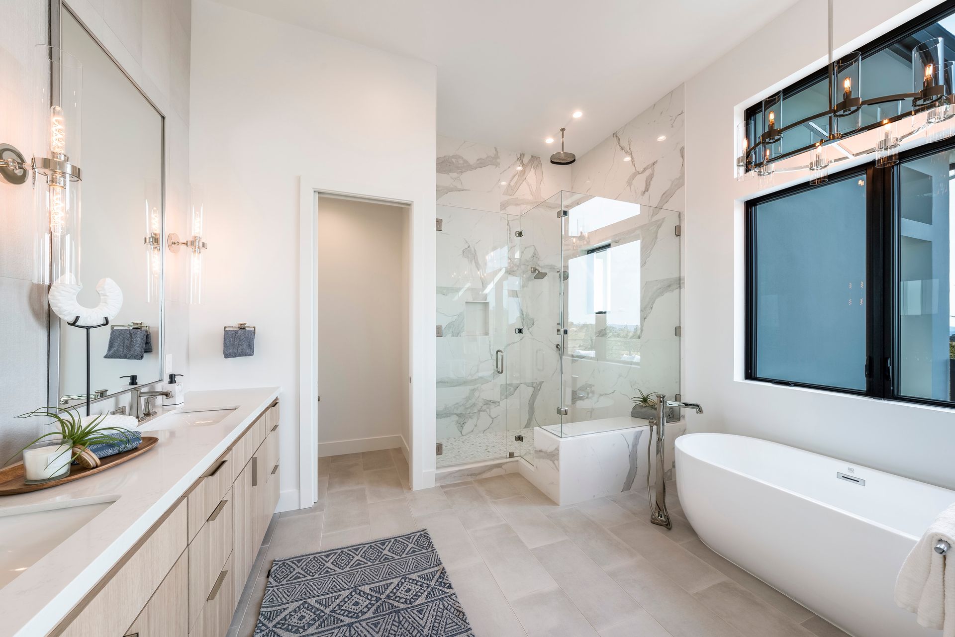 Primary bathroom with dual sinks, soaking tub and shower stall with rain shower head, handheld wand, and bench seat