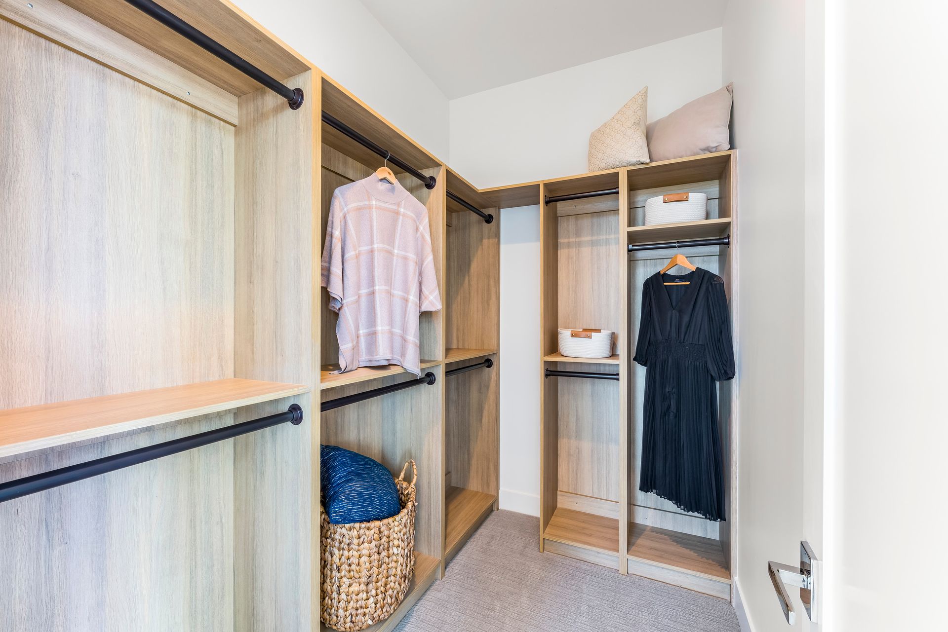 Primary bedroom on main level features ceiling fan, 2 walk-in closets with organizers, and direct access to
