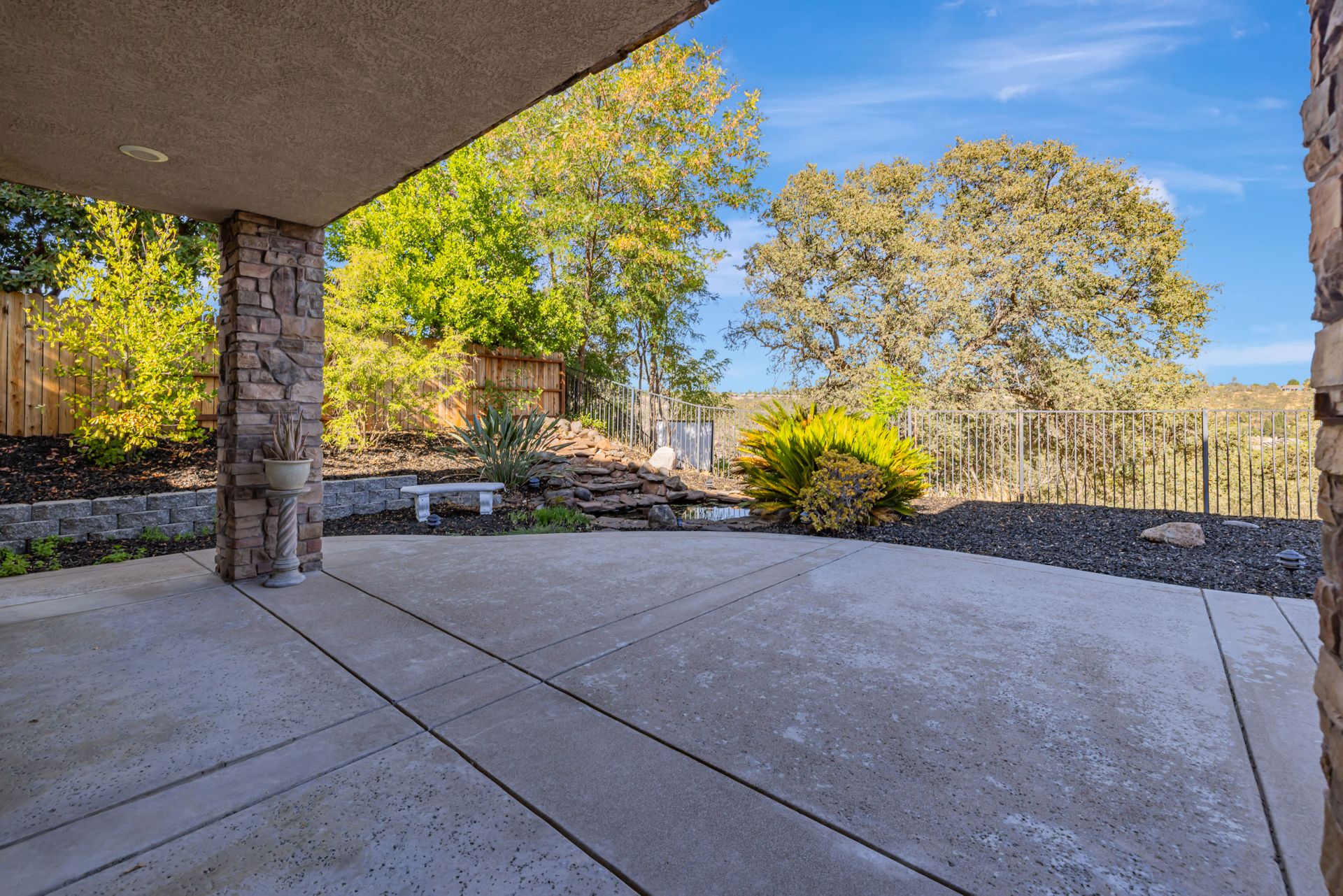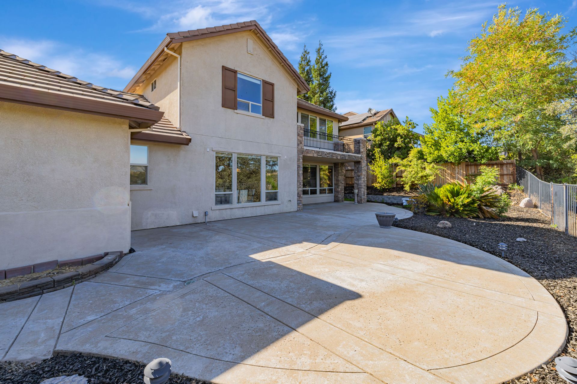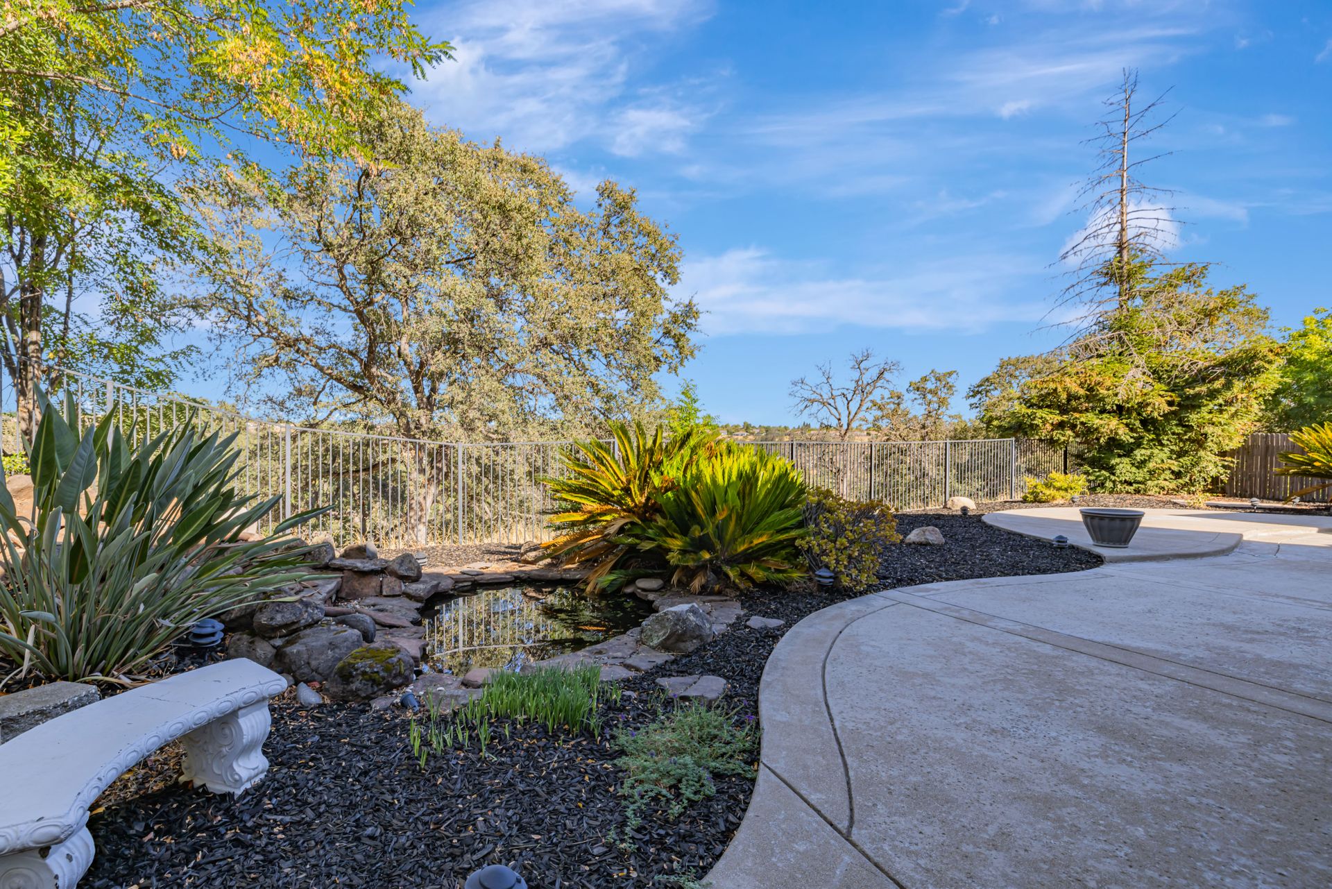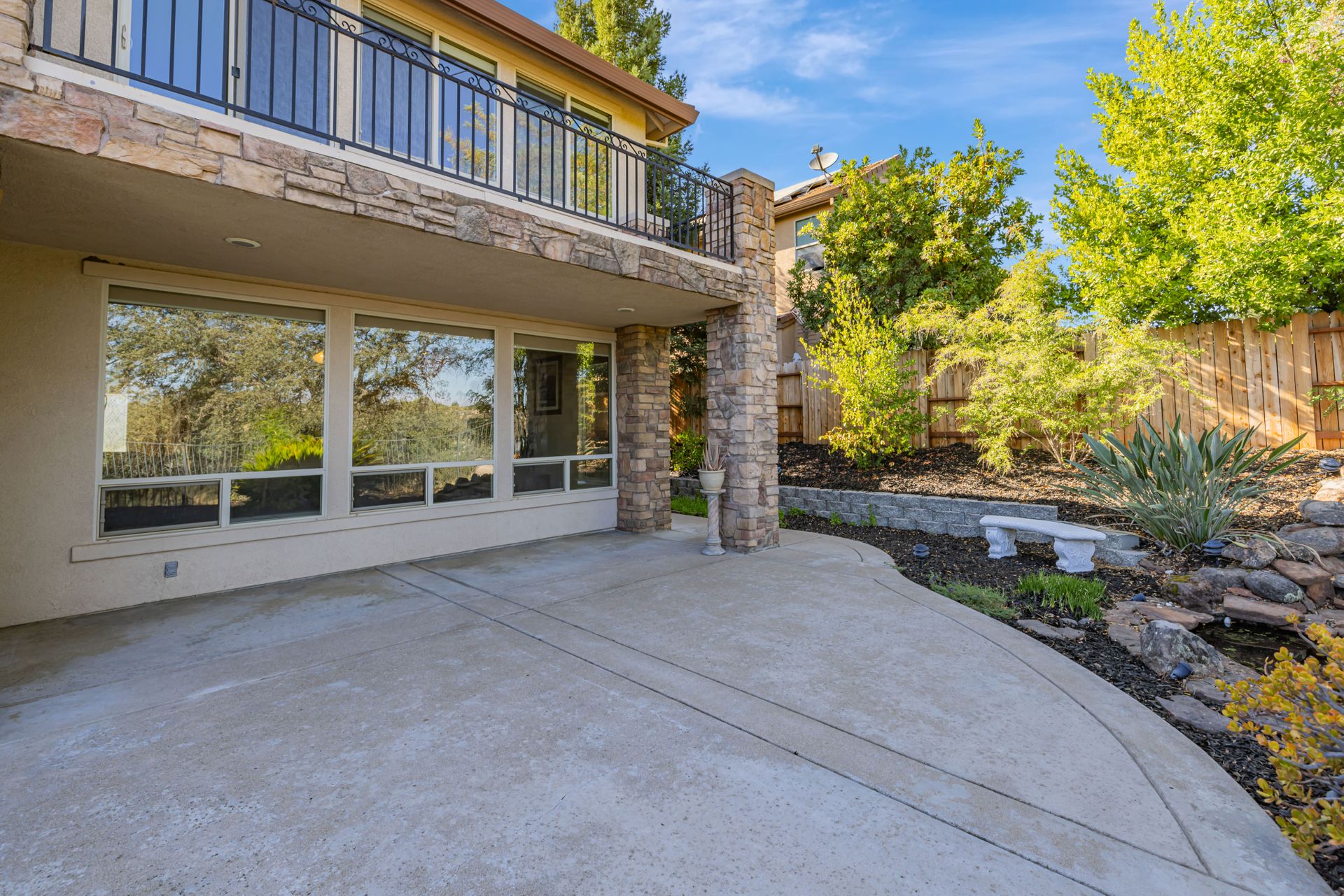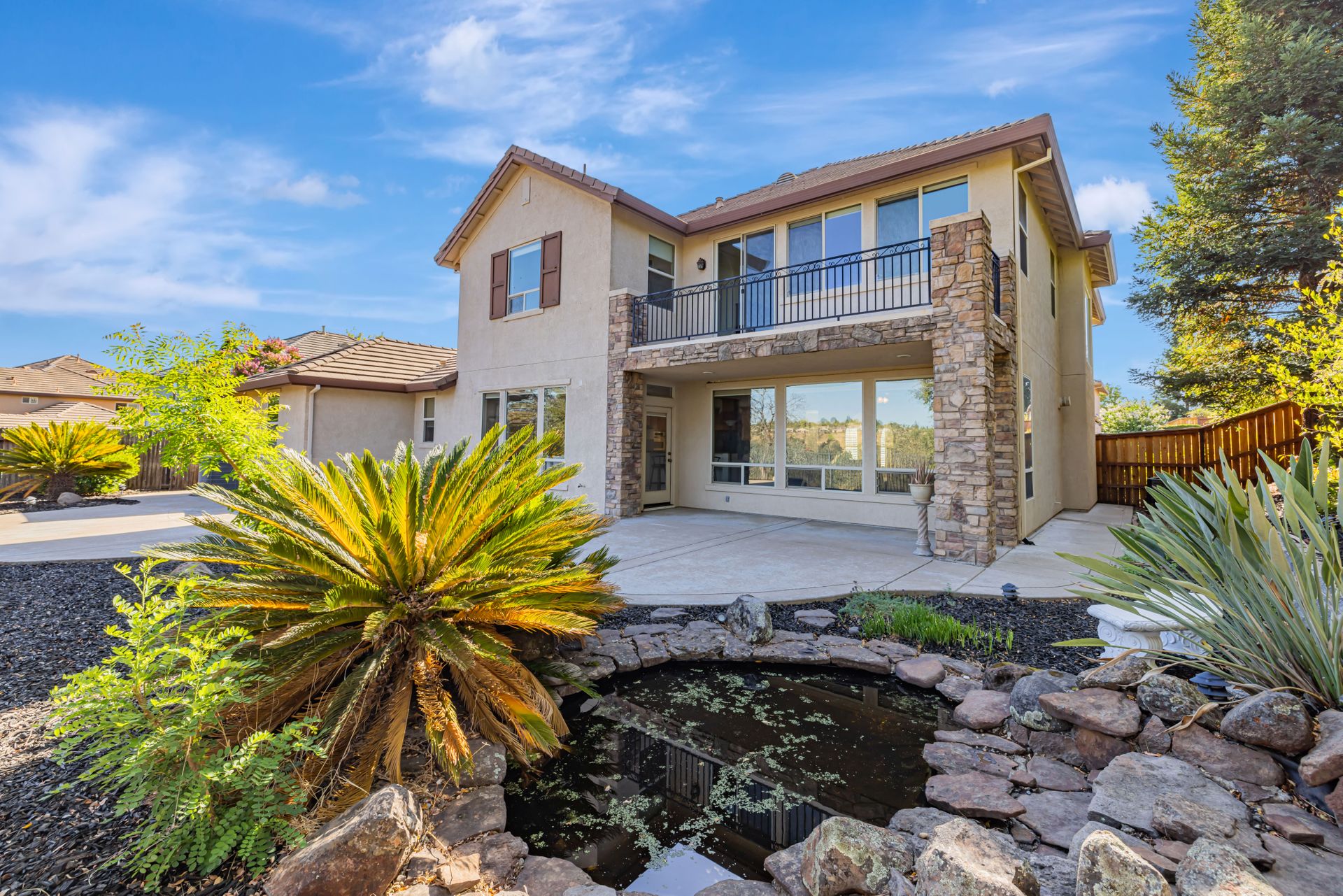 Upstairs, the master suite offers a soaking tub, separate shower, dual sinks, a massive walk-in closet, and a private balcony. The landscaped backyard, backing up to a greenbelt, features a 3-tiered waterfall pond and a covered seating area.