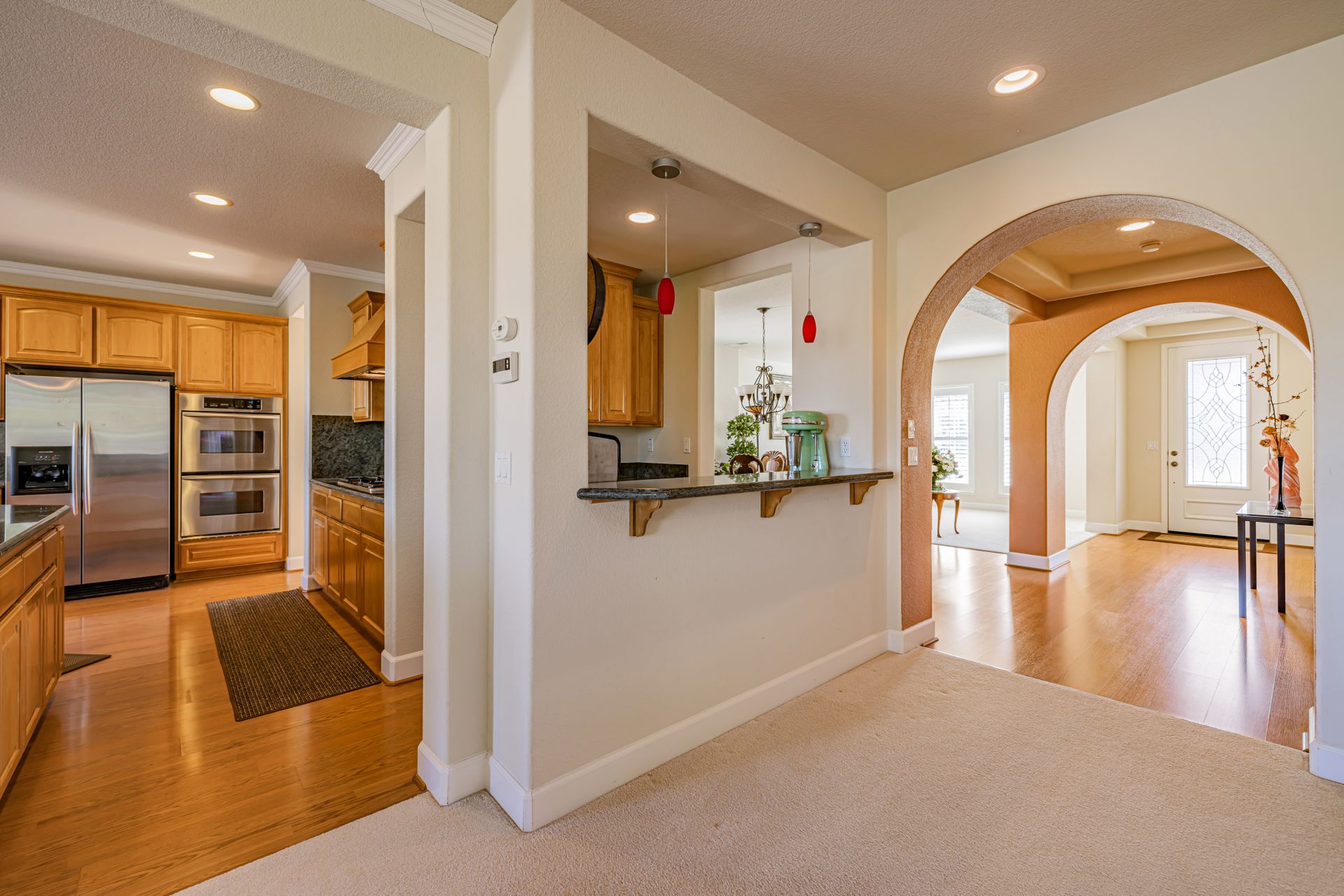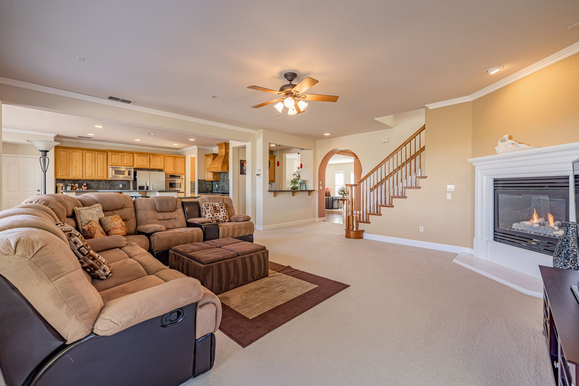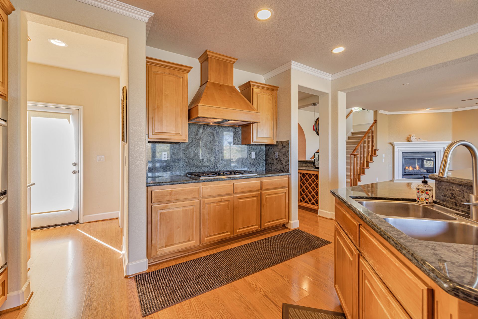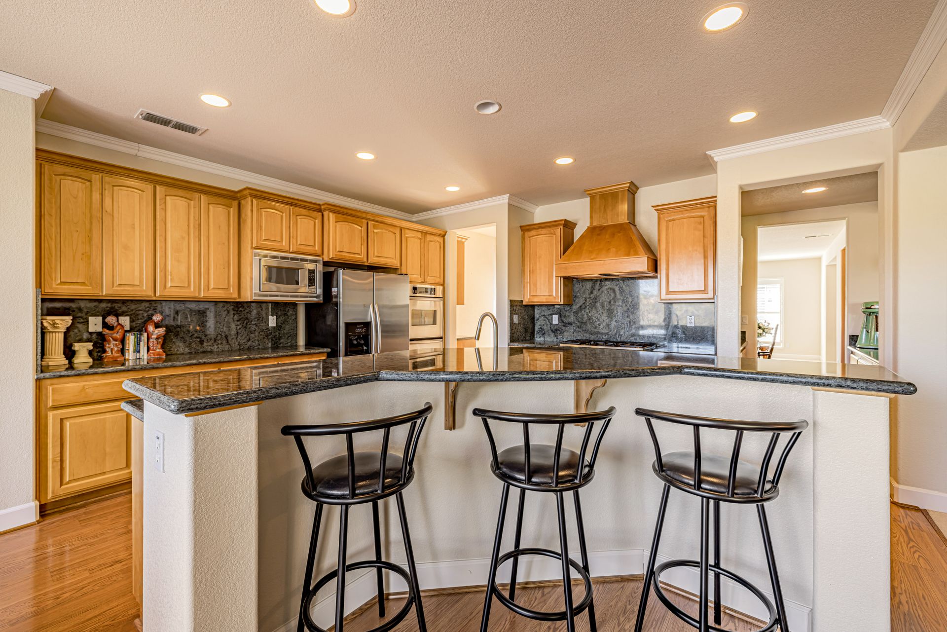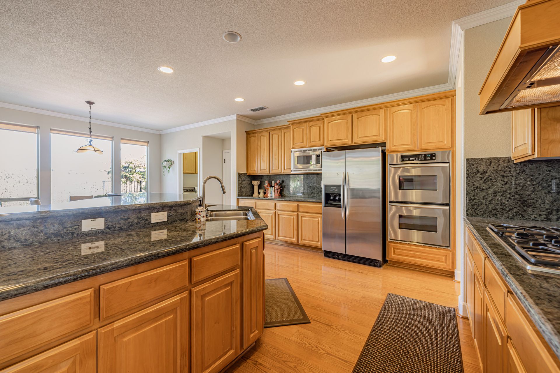 The gourmet kitchen boasts custom granite countertops with full granite backsplash, stainless steel appliances, double ovens, and a large walk-in pantry. Enjoy the spacious family room with pre-wired surround sound. Pre-wired speakers for the backyard and built in JBL speakers on both floors make this home perfect for entertaining. The main floor also includes formal living and dining rooms, a bonus den, and a laundry room.
