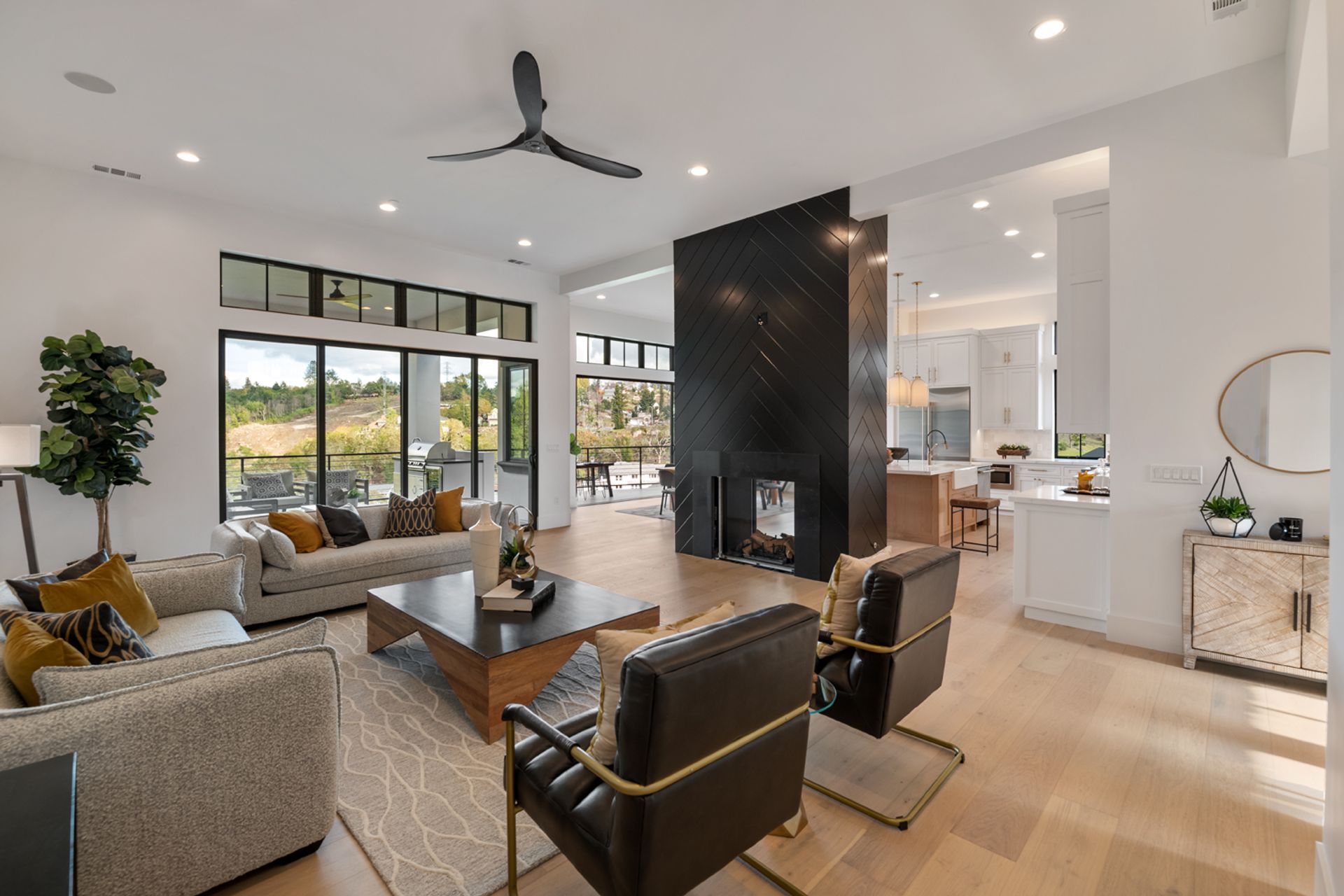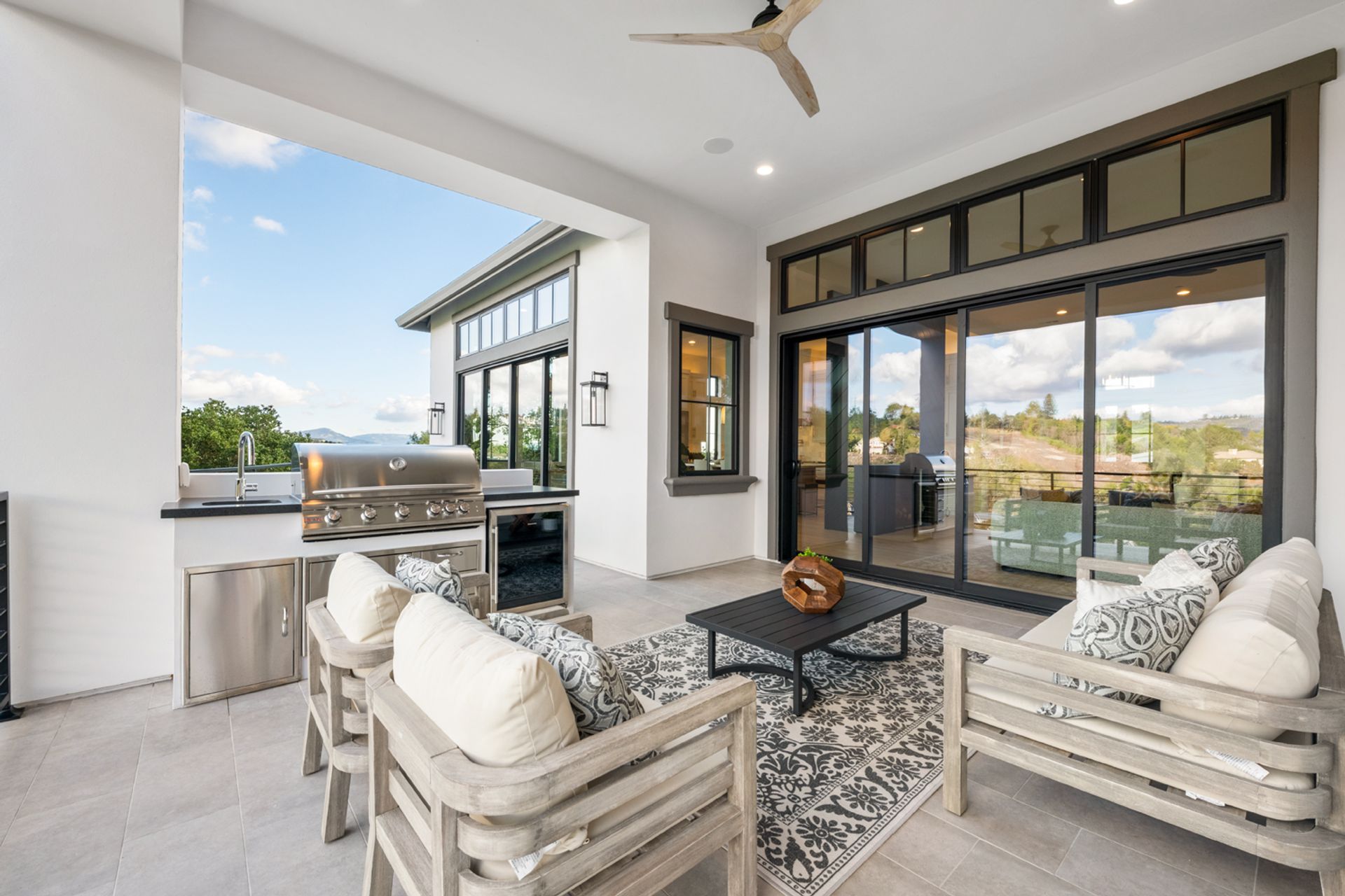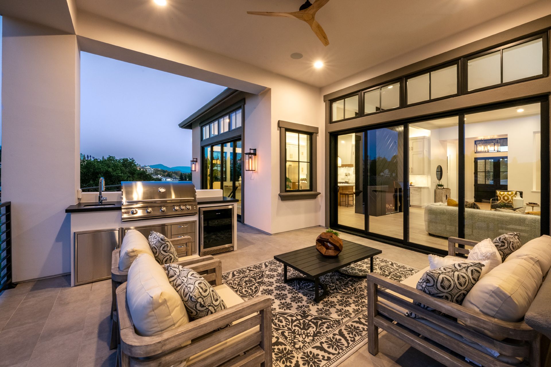 - Great room living with vaulted ceiling, dual sided gas fireplace, hardwood flooring and stacking glass doors to the view terrace with outdoor kitchen