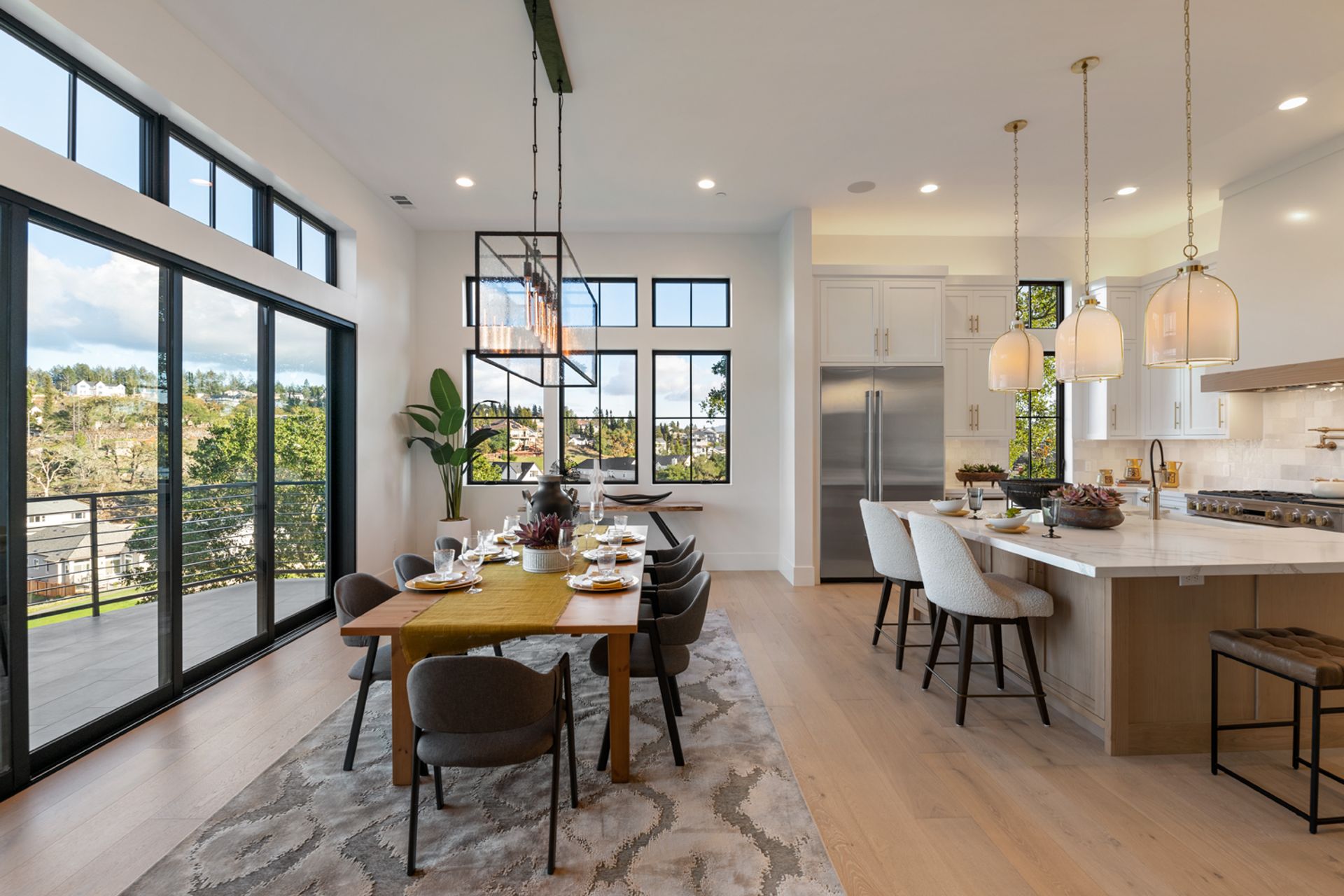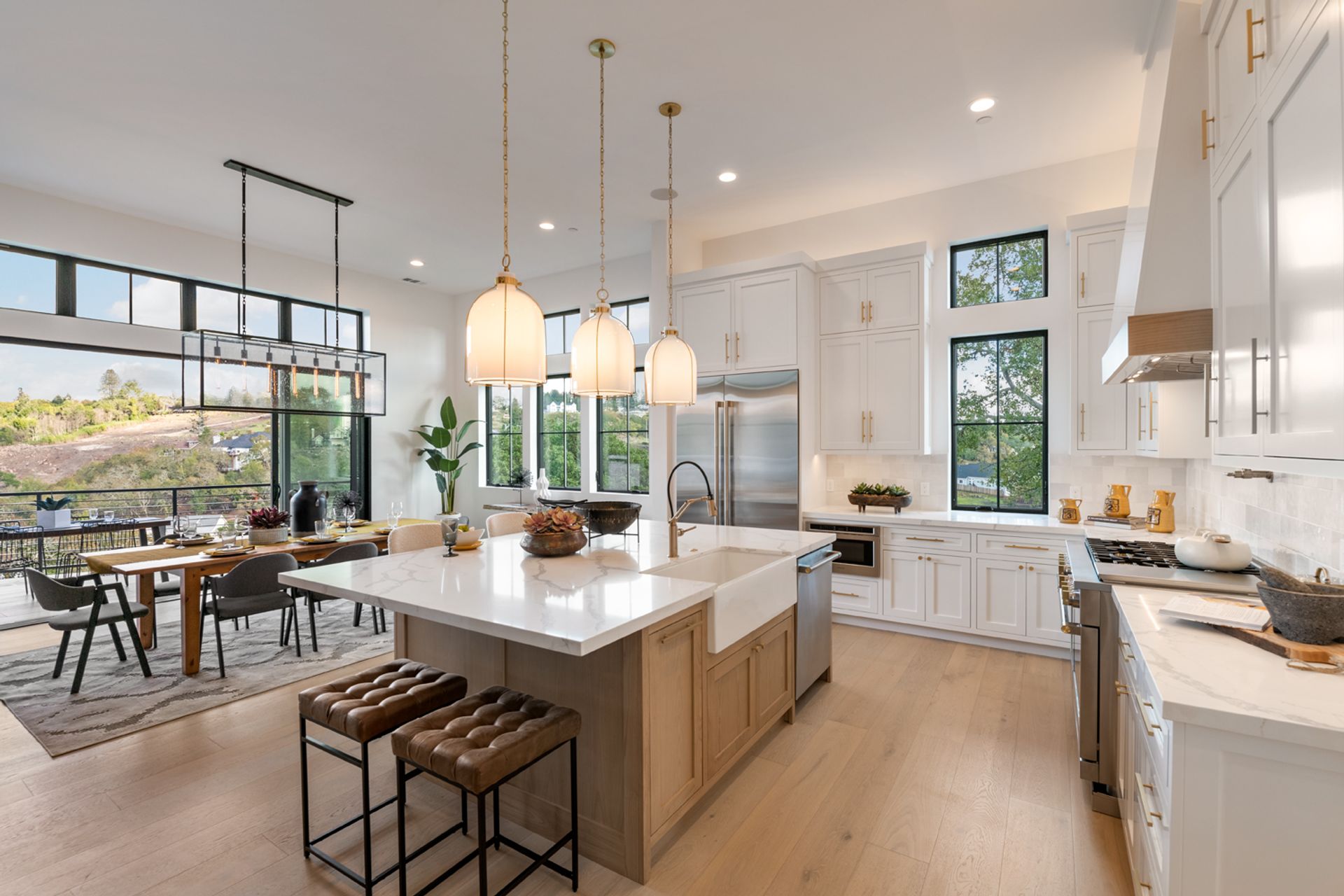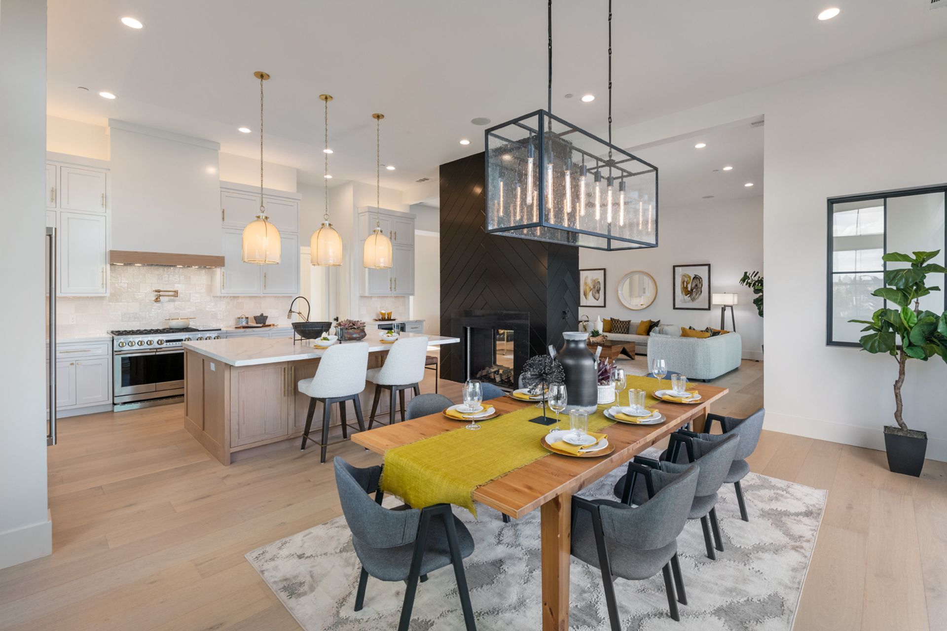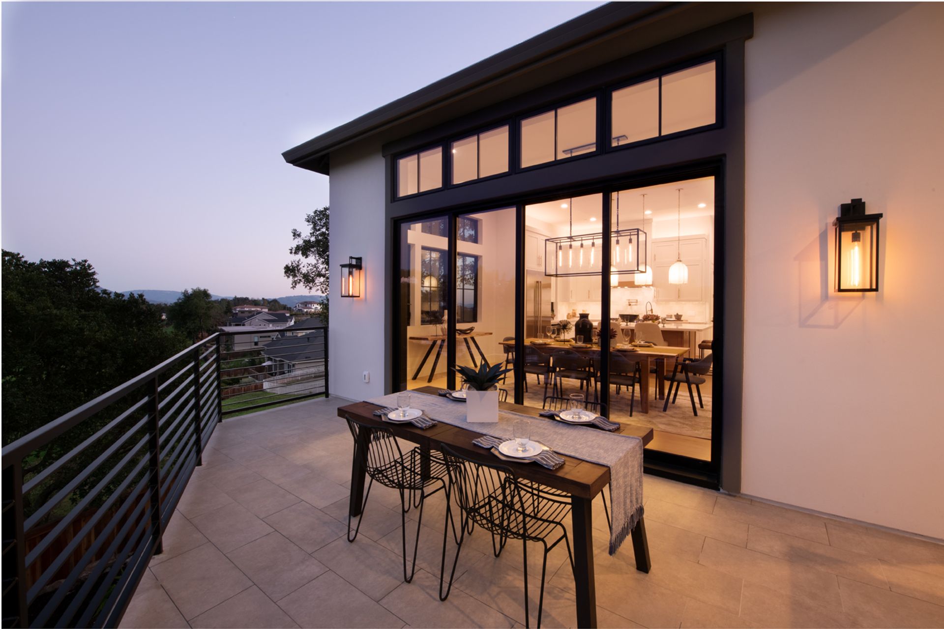 - Great room living with vaulted ceiling, dual sided gas fireplace, hardwood flooring and stacking glass doors to the view terrace with outdoor kitchen