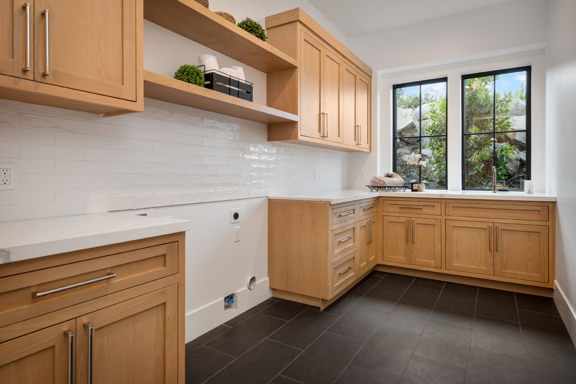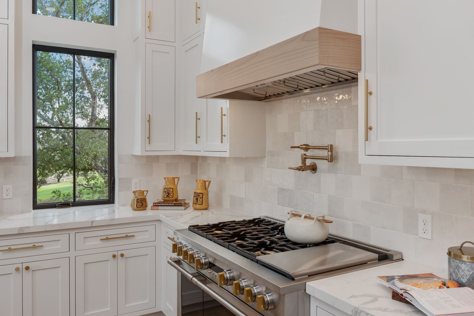 - Kitchen boasts a large center island with quartz counter, dual sided fireplace, built-in refrigerator/freezer, Monogram 6 burner gas range with double ovens and griddle, pot filler faucet, hood over range, Monogram dishwasher, Monogram microwave drawer, farm style sink, soft close drawers and cabinets, 2 pantries, wine refrigerator