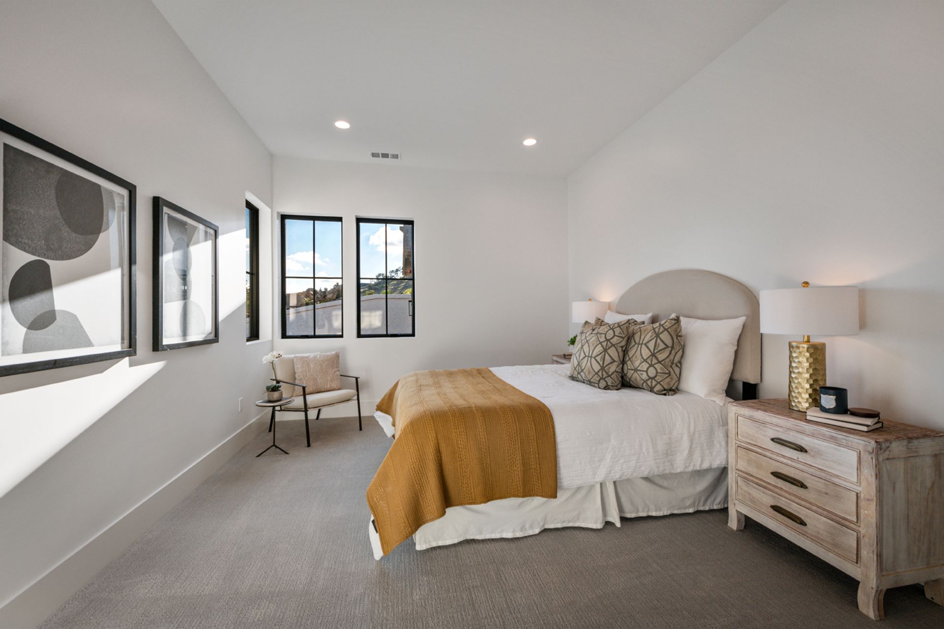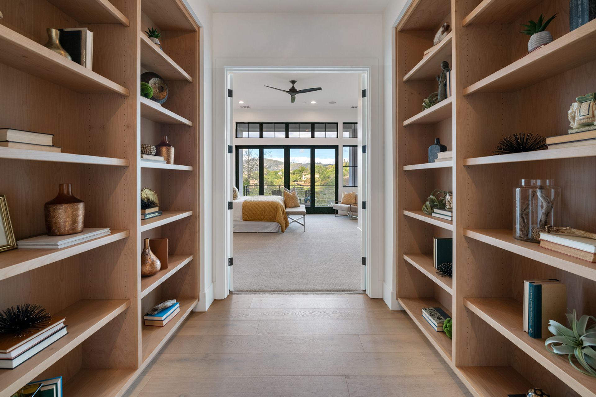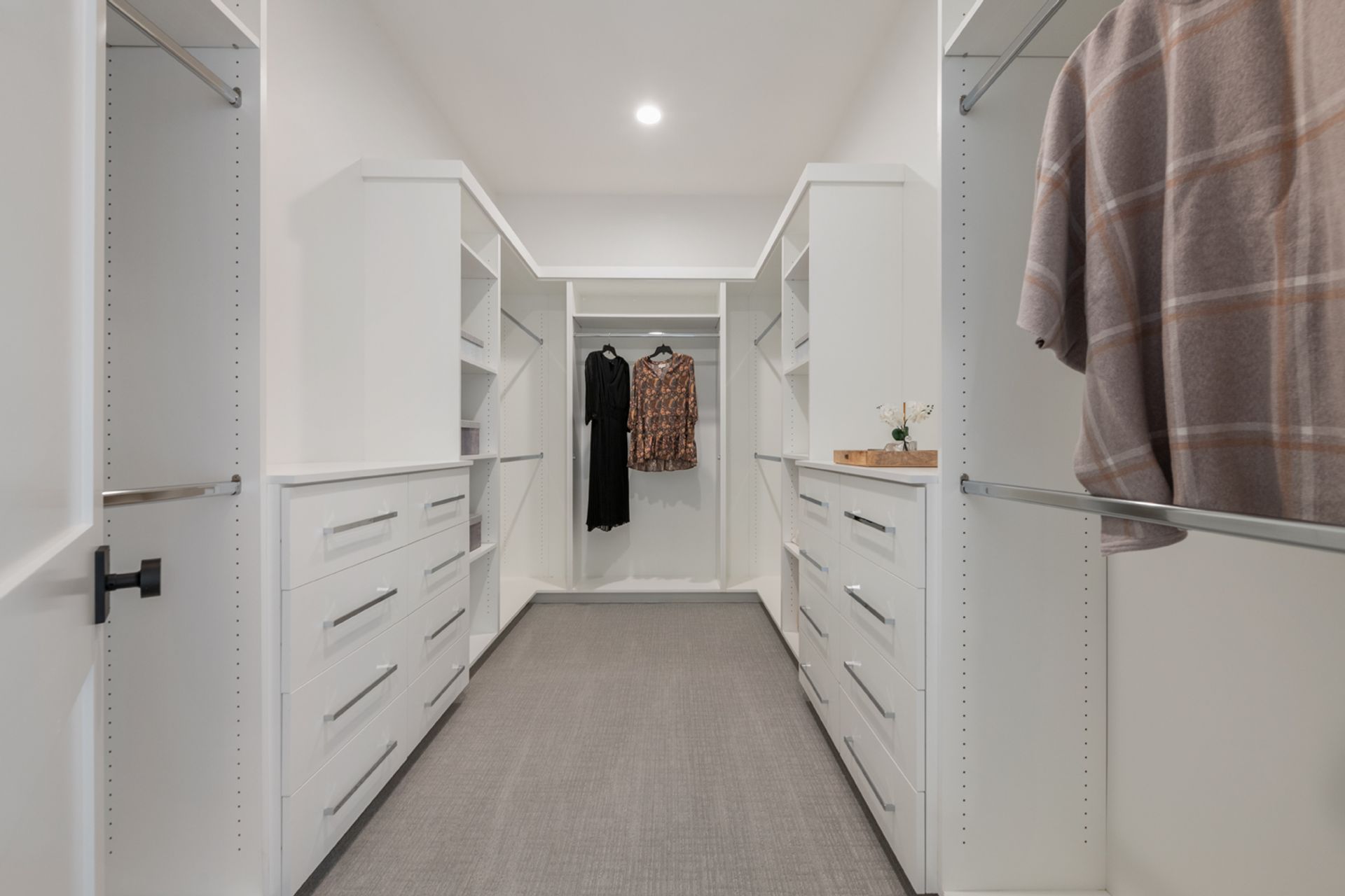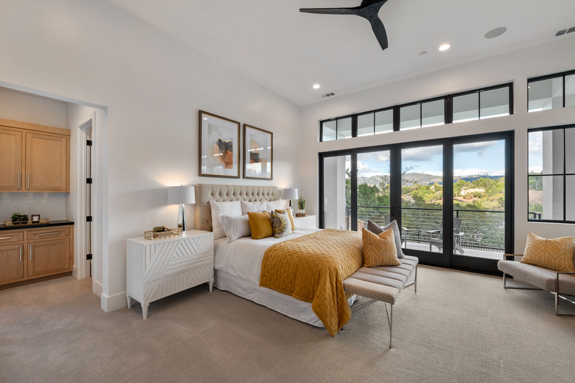 - Primary bedroom features carpet, ceiling fan, sliding glass doors to view terrace, walk-in closet with built-in organizers and dressers