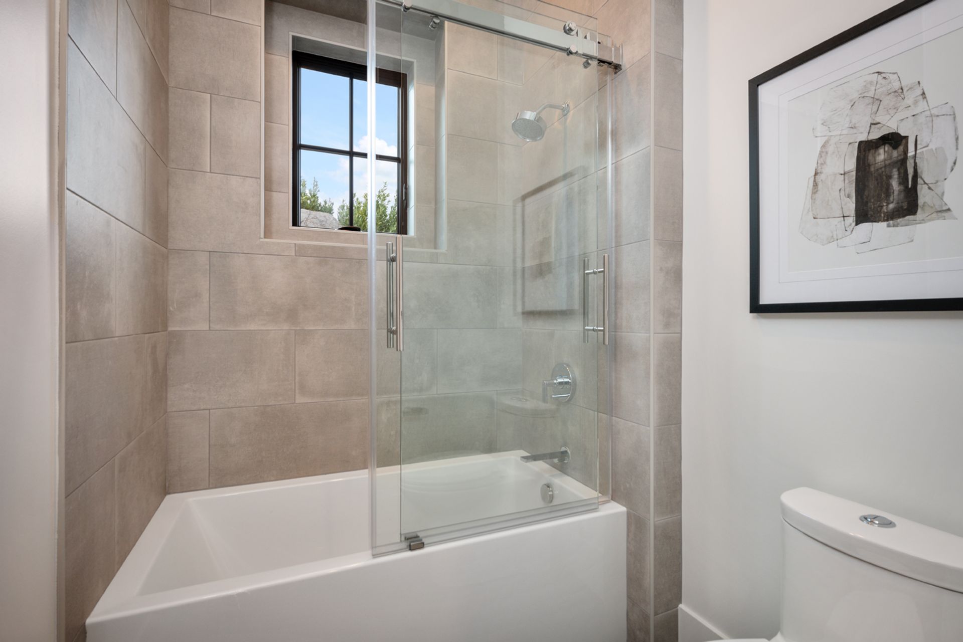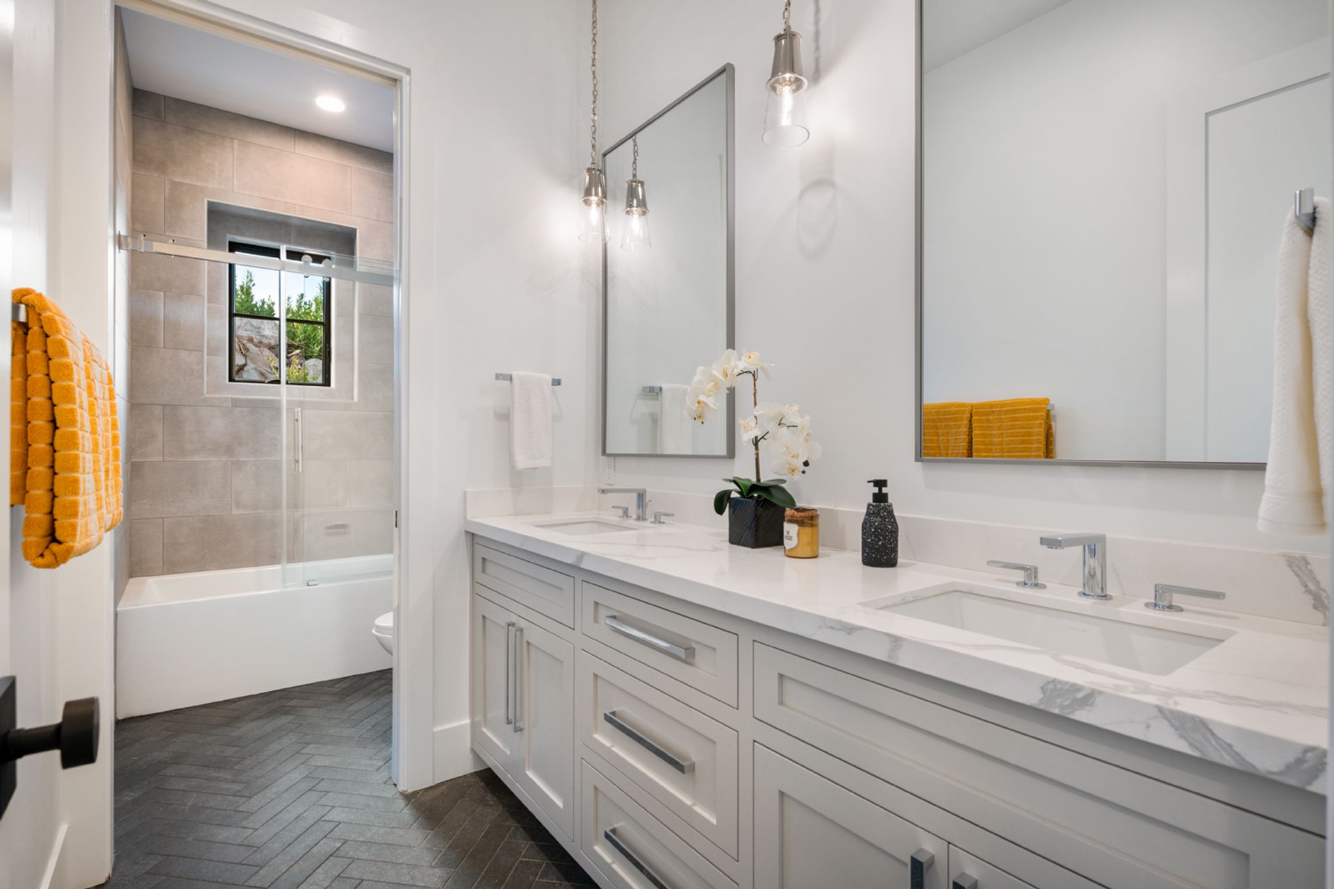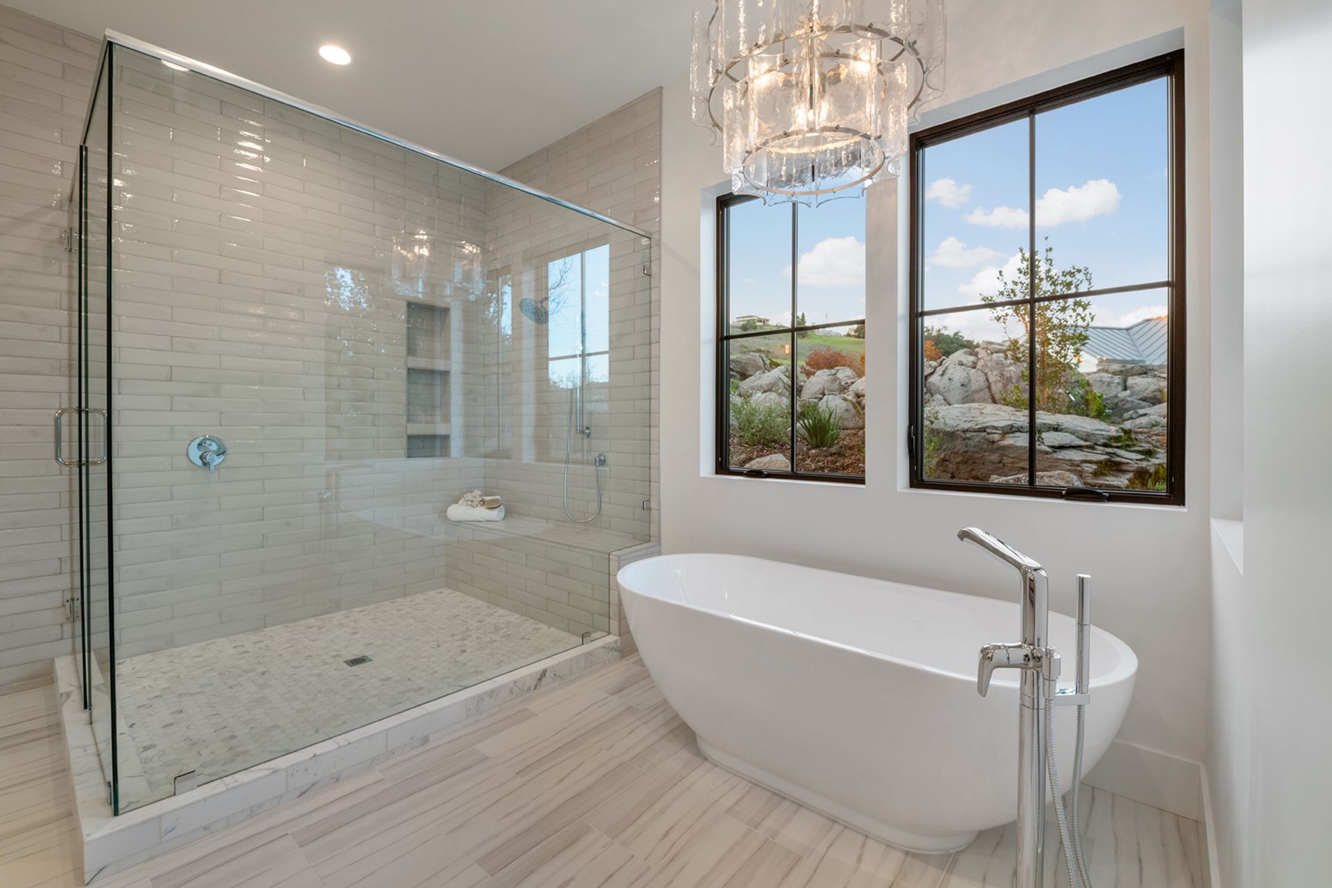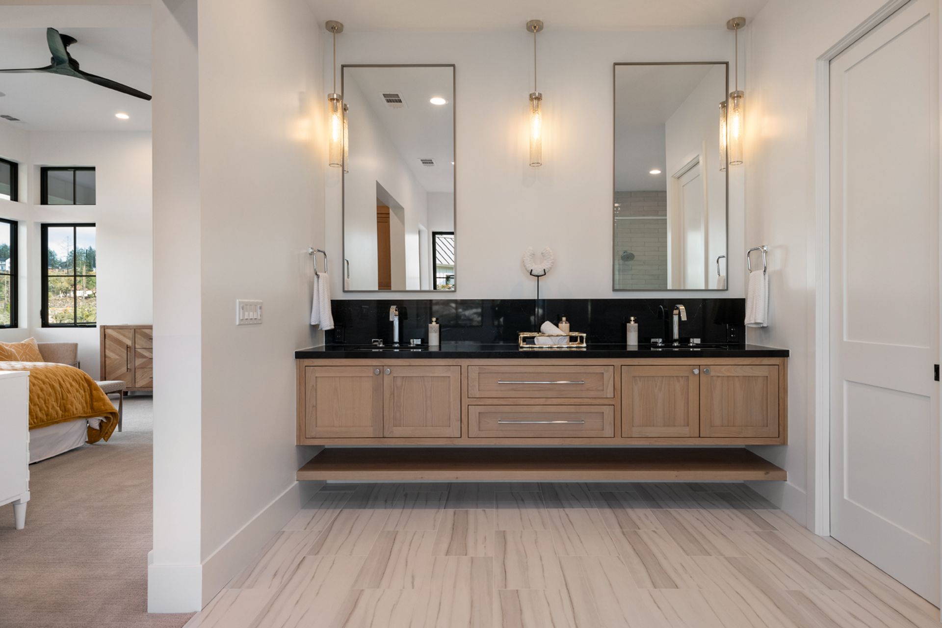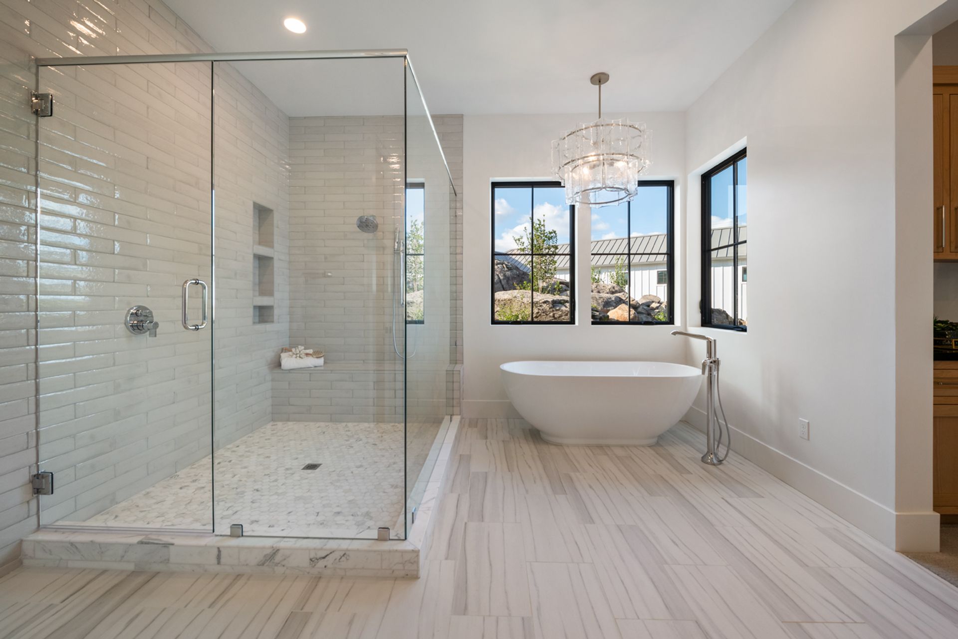 - Primary bathroom with floating vanity, dual sinks, soaking tub and oversized shower stall with shower head and handheld wand