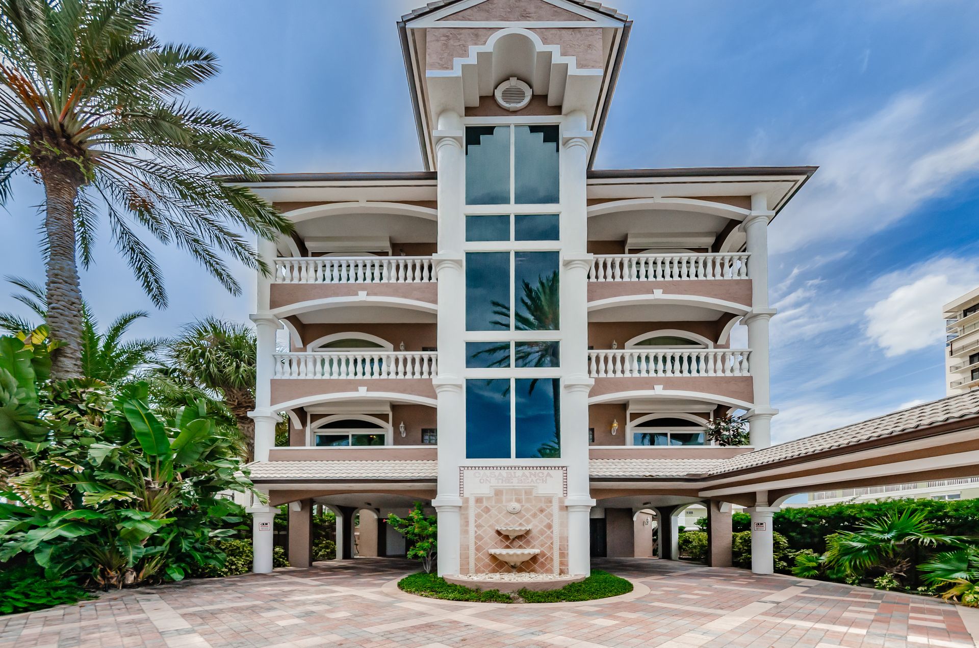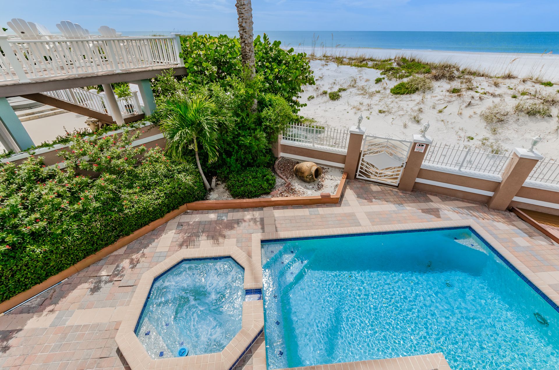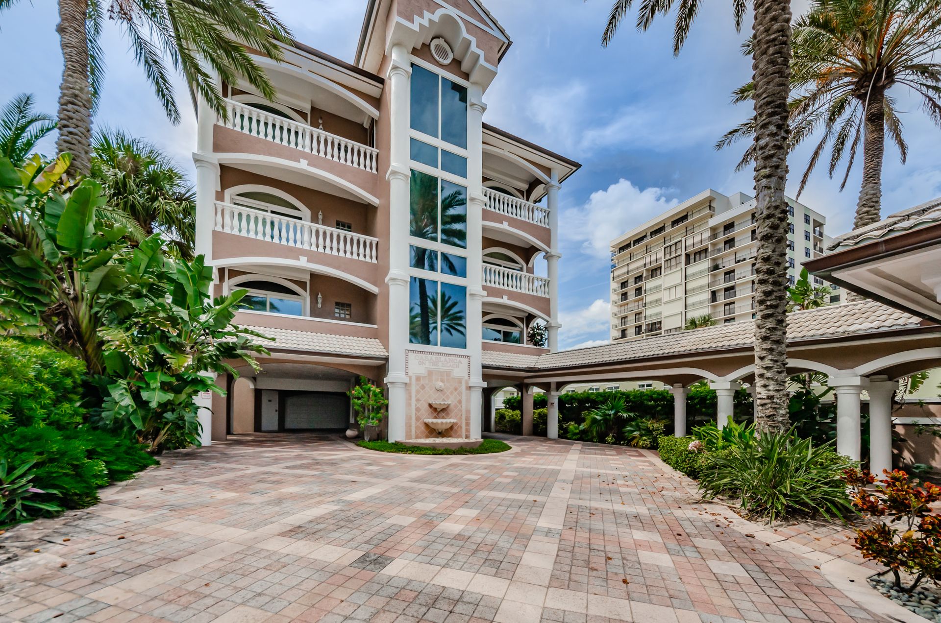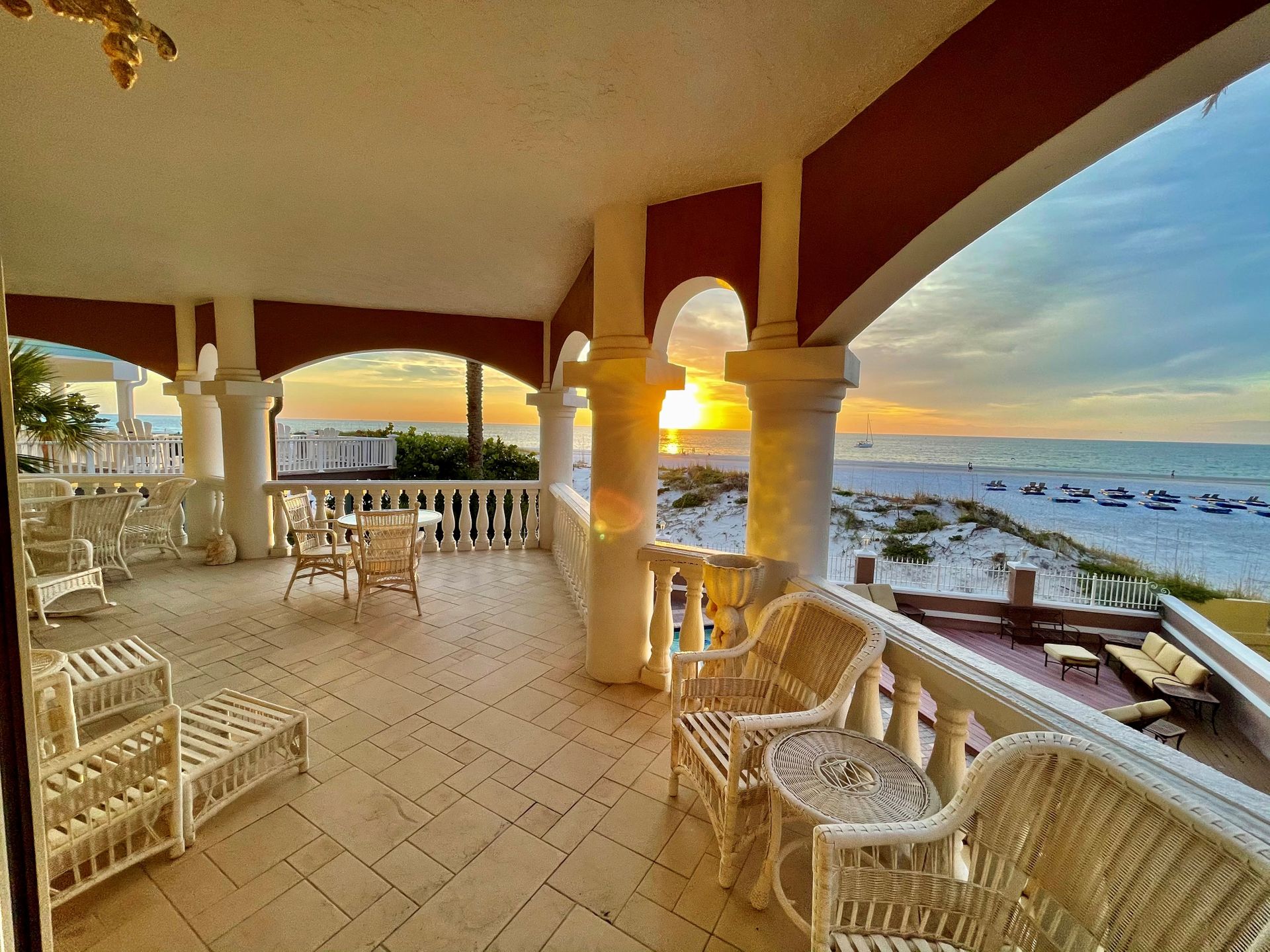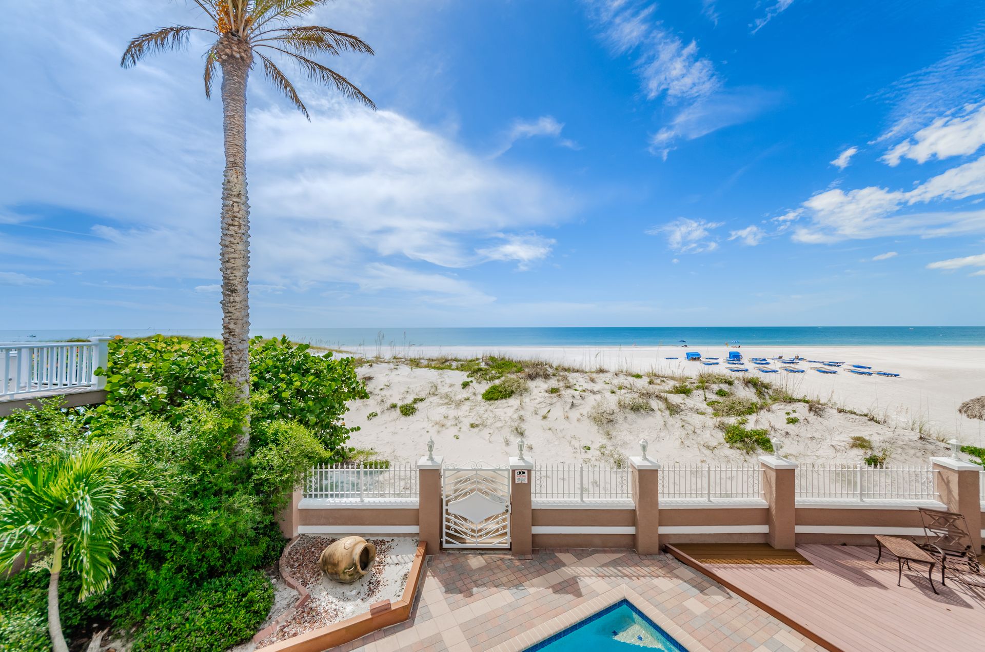 Welcome home to an exclusive waterfront condo which maintains the appearance of a mansion featuring one of the largest prime Gulf of Mexico lots, with endless water views that St Pete Beach has to offer. A home like no other! The exclusive condo is located directly on the sandy white beaches with spectacular views of the azure water. Where luxury meets privacy & serenity. Custom details throughout this one-level beauty will impress even the most elusive buyer from double paned windows & doors, granite counter tops in all bathrooms, kitchen and wet bar, imported Italian tile flooring, custom handcrafted crown molding and cabinets, chef’s kitchen and plenty of storage in this beach gem. Two Master suites with unspoiled water views split with ensuite bathrooms, large walk-in closets and balcony for spectacular sunsets over the Gulf of Mexico add to the luxury of this unit. Two additional guest bedrooms split from the masters at the front of the home. Enter through ornate iron electronic gates to this compound with a surveillance system & elevator for your privacy & security. The grounds offer imported palms and tropical landscaping and custom paver driveway & walkways. This luxurious home provides large living areas with amenities not found in most condos on the beach; private beach access, private Gulf pool, spa, double garages and plenty of outdoor patios for entertaining. Built next to other single-family homes this luxury home has stunning views of the Gulf from a generous balcony and most rooms. There’s a private elevator foyer for each of the 3 residences. Casablanca on the Beach lifts you to the pinnacle of living. Be prepared to check everything off your dream home wish-list.