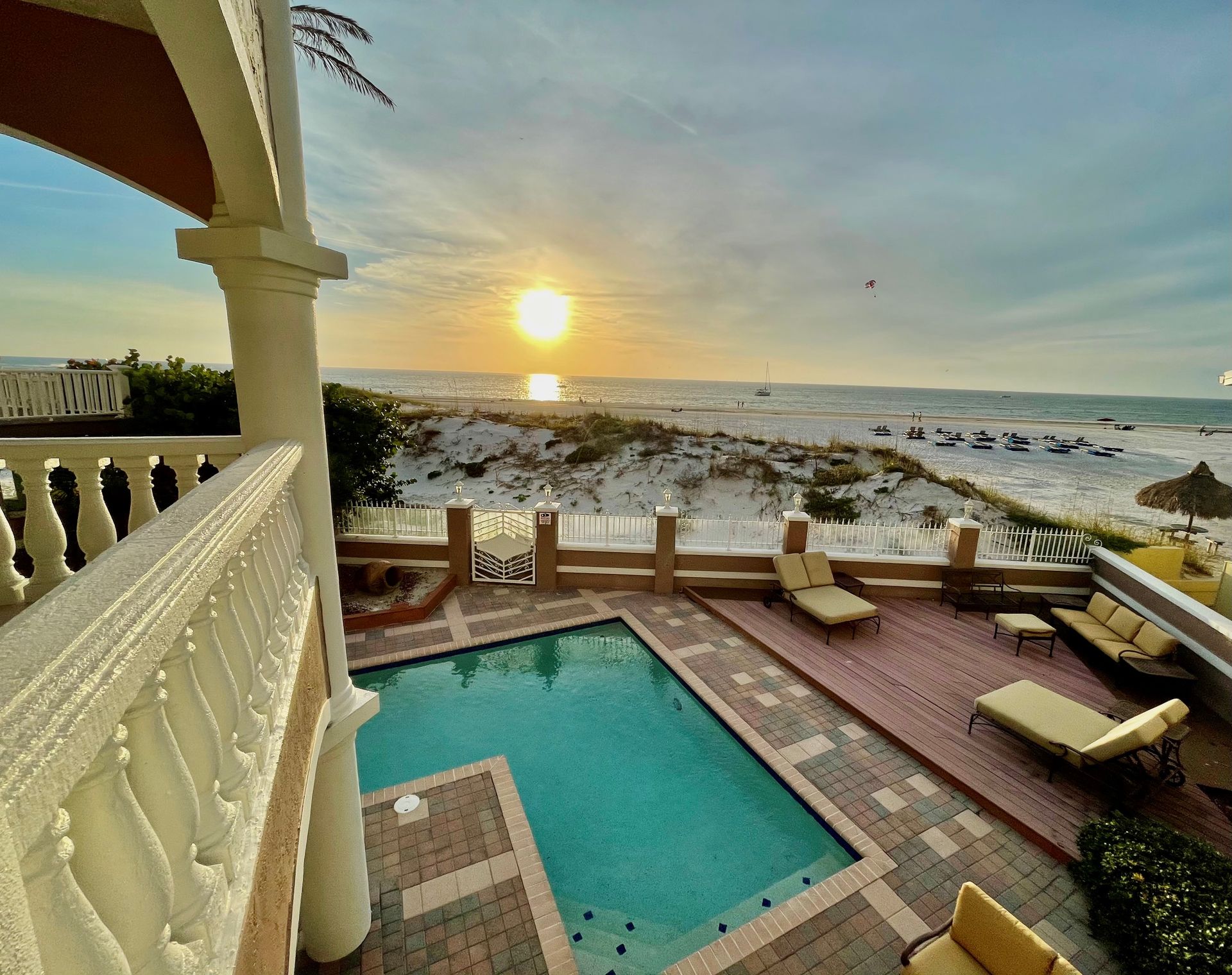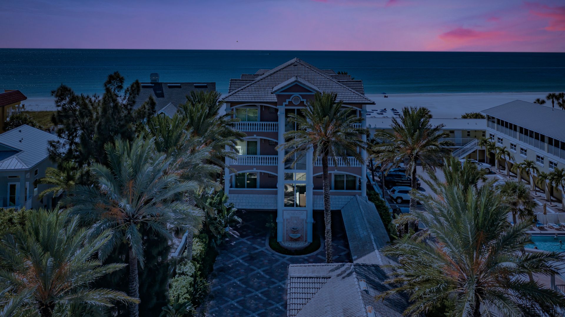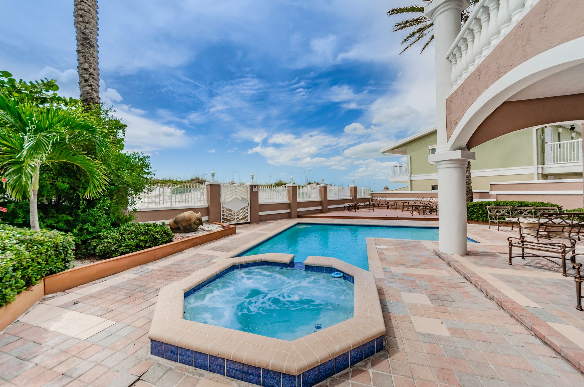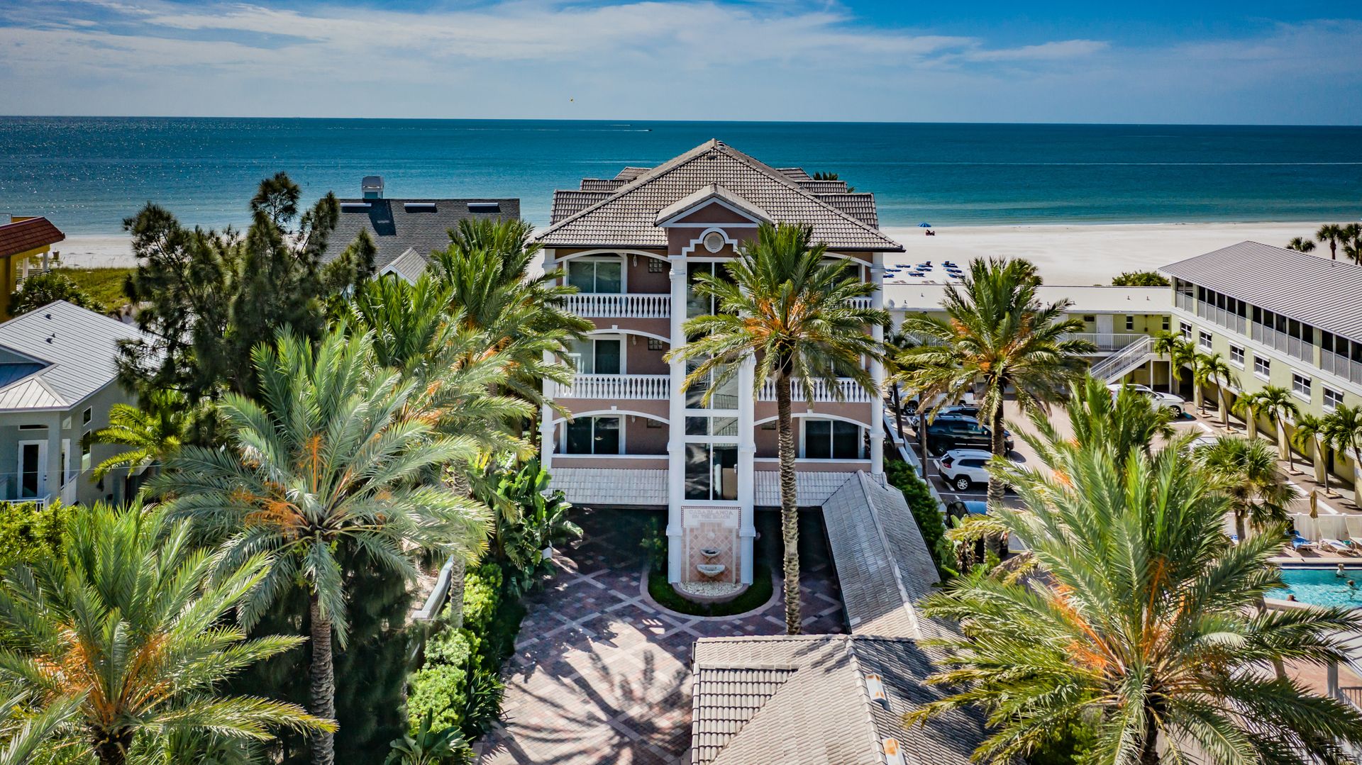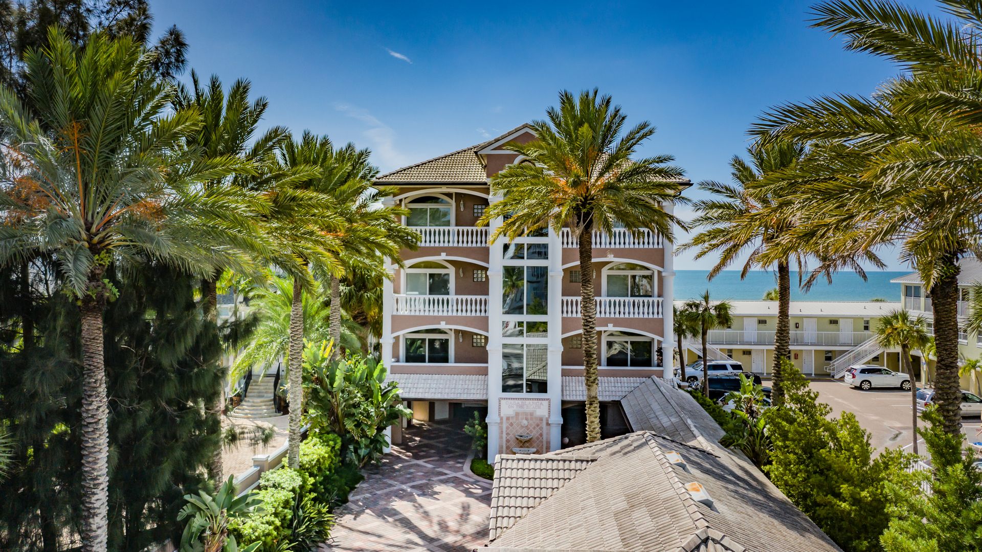 Welcome home to an exclusive waterfront condo which maintains the appearance of a mansion featuring one of the largest prime Gulf of Mexico lots, with endless water views that St Pete Beach has to offer. A home like no other! The exclusive condo is located directly on the sandy white beaches with spectacular views of the azure water. Where luxury meets privacy & serenity. Custom details throughout this one-level beauty will impress even the most elusive buyer from double paned windows & doors, granite counter tops in all bathrooms, kitchen and wet bar, imported Italian tile flooring, custom handcrafted crown molding and cabinets, chef’s kitchen and plenty of storage in this beach gem. Two Master suites with unspoiled water views split with ensuite bathrooms, large walk-in closets and balcony for spectacular sunsets over the Gulf of Mexico add to the luxury of this unit. Two additional guest bedrooms split from the masters at the front of the home. Enter through ornate iron electronic gates to this compound with a surveillance system & elevator for your privacy & security. The grounds offer imported palms and tropical landscaping and custom paver driveway & walkways. This luxurious home provides large living areas with amenities not found in most condos on the beach; private beach access, private Gulf pool, spa, double garages and plenty of outdoor patios for entertaining. Built next to other single-family homes this luxury home has stunning views of the Gulf from a generous balcony and most rooms. There’s a private elevator foyer for each of the 3 residences. Casablanca on the Beach lifts you to the pinnacle of living. Be prepared to check everything off your dream home wish-list.