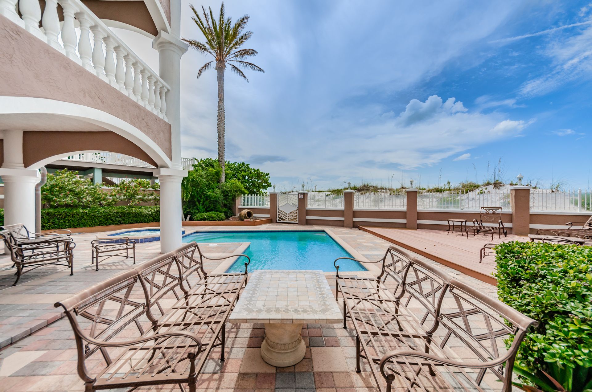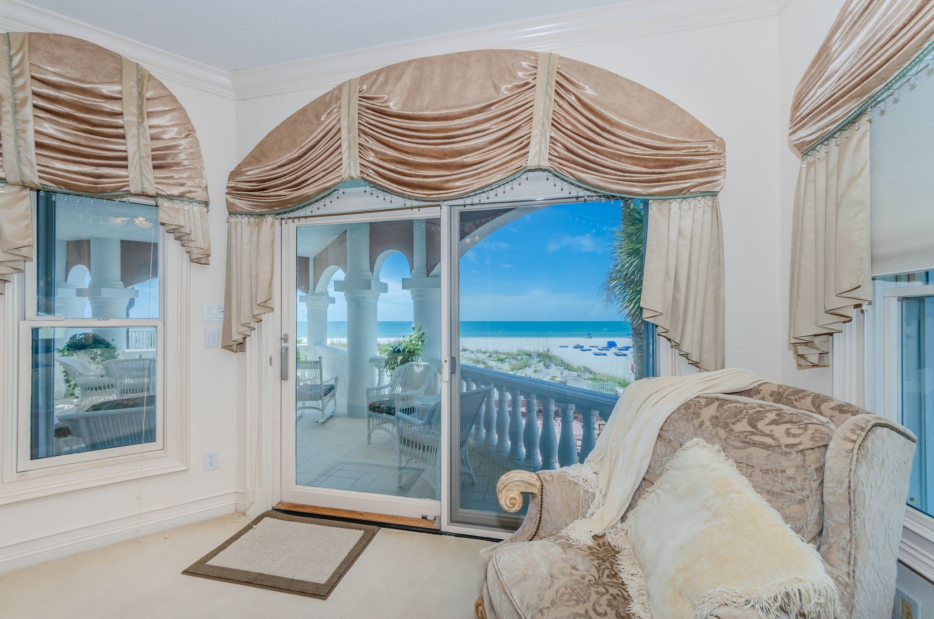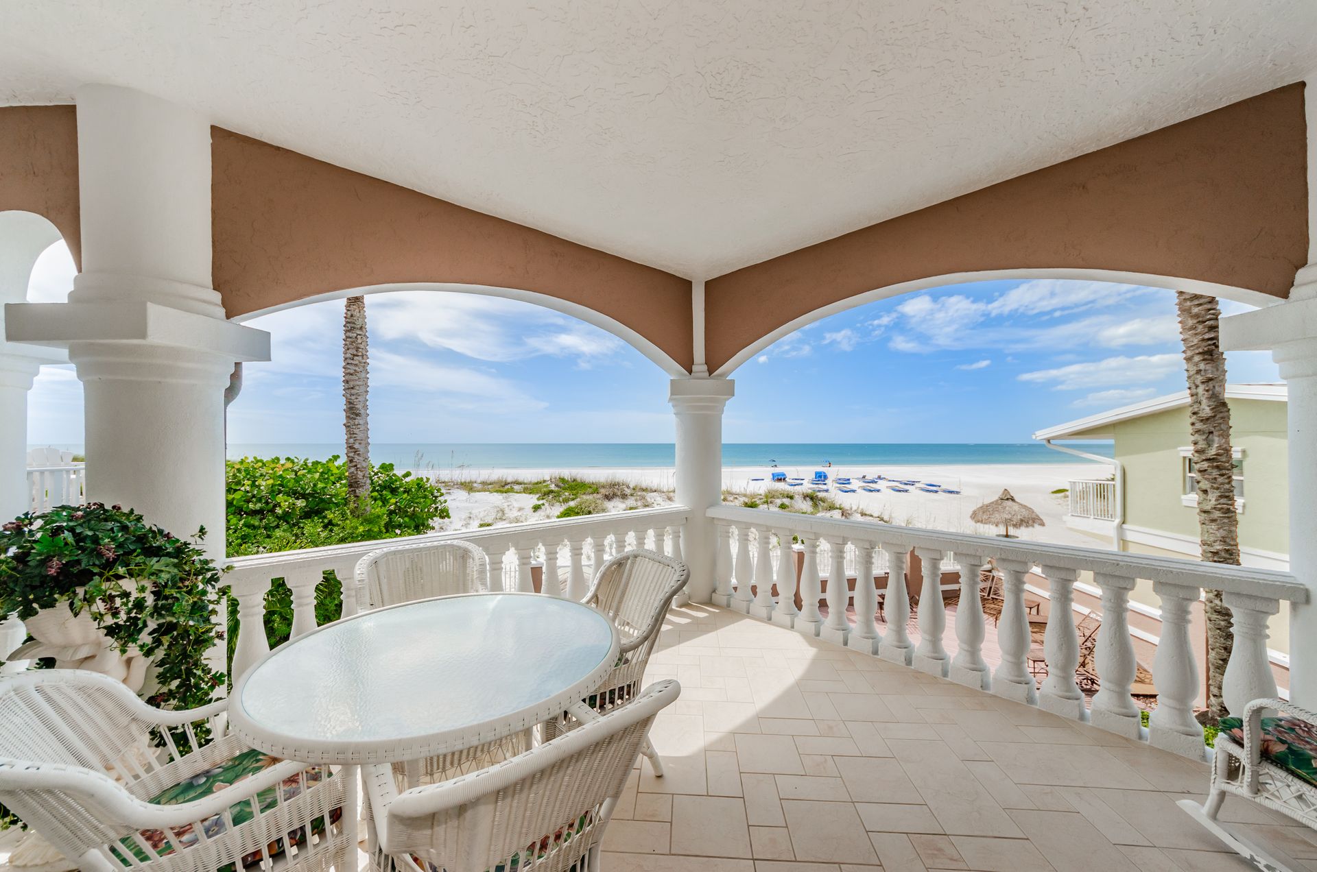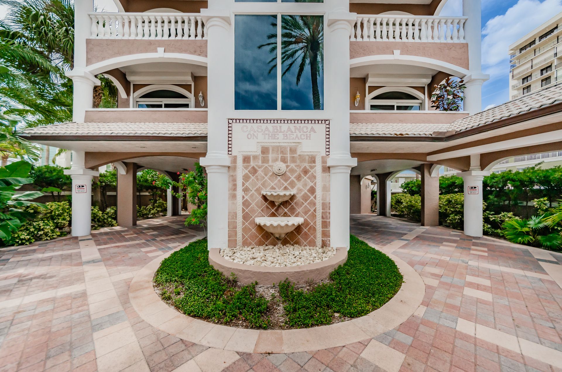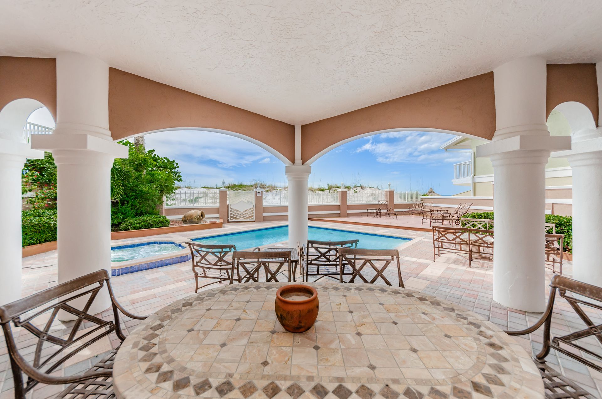 Welcome home to an exclusive waterfront condo which maintains the appearance of a mansion featuring one of the largest prime Gulf of Mexico lots, with endless water views that St Pete Beach has to offer. A home like no other! The exclusive condo is located directly on the sandy white beaches with spectacular views of the azure water. Where luxury meets privacy & serenity. Custom details throughout this one-level beauty will impress even the most elusive buyer from double paned windows & doors, granite counter tops in all bathrooms, kitchen and wet bar, imported Italian tile flooring, custom handcrafted crown molding and cabinets, chef’s kitchen and plenty of storage in this beach gem. Two Master suites with unspoiled water views split with ensuite bathrooms, large walk-in closets and balcony for spectacular sunsets over the Gulf of Mexico add to the luxury of this unit. Two additional guest bedrooms split from the masters at the front of the home. Enter through ornate iron electronic gates to this compound with a surveillance system & elevator for your privacy & security. The grounds offer imported palms and tropical landscaping and custom paver driveway & walkways. This luxurious home provides large living areas with amenities not found in most condos on the beach; private beach access, private Gulf pool, spa, double garages and plenty of outdoor patios for entertaining. Built next to other single-family homes this luxury home has stunning views of the Gulf from a generous balcony and most rooms. There’s a private elevator foyer for each of the 3 residences. Casablanca on the Beach lifts you to the pinnacle of living. Be prepared to check everything off your dream home wish-list.
