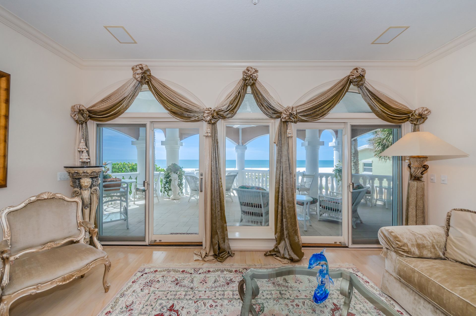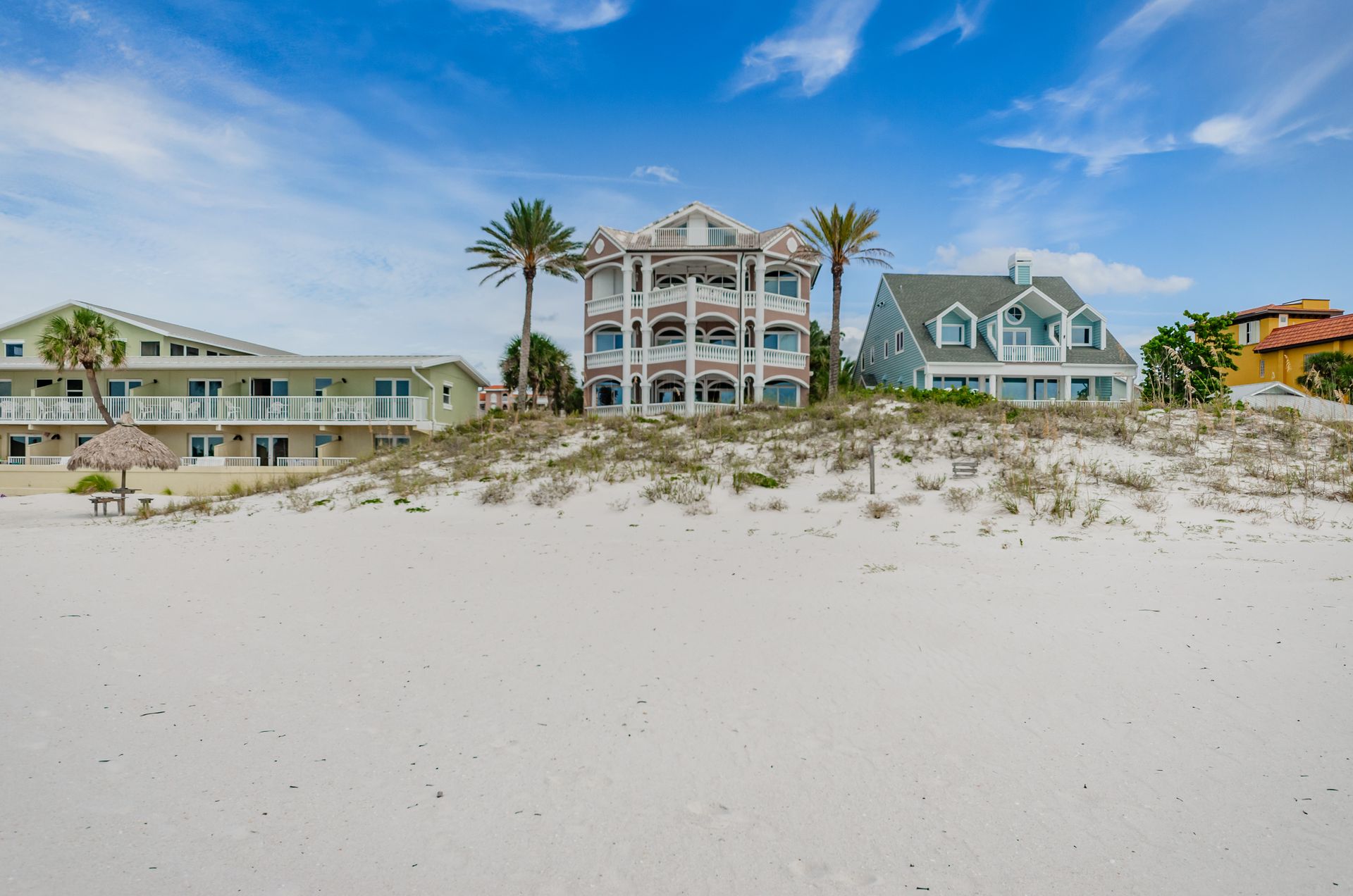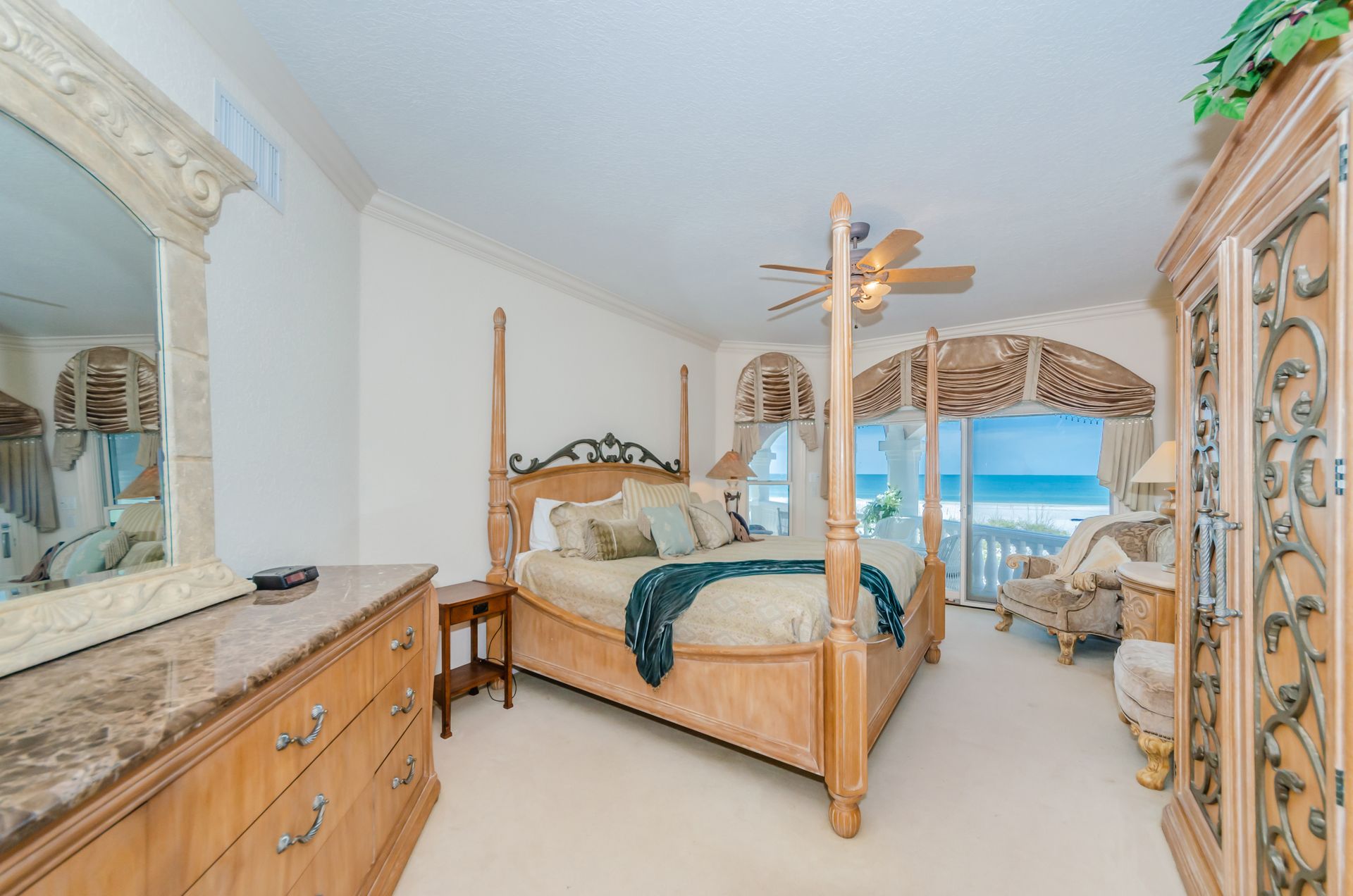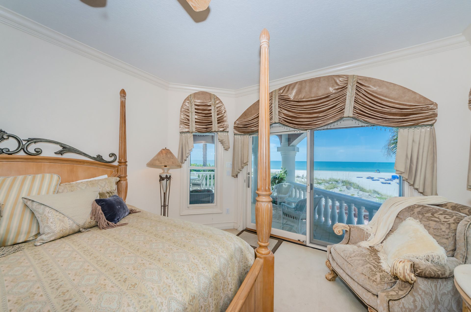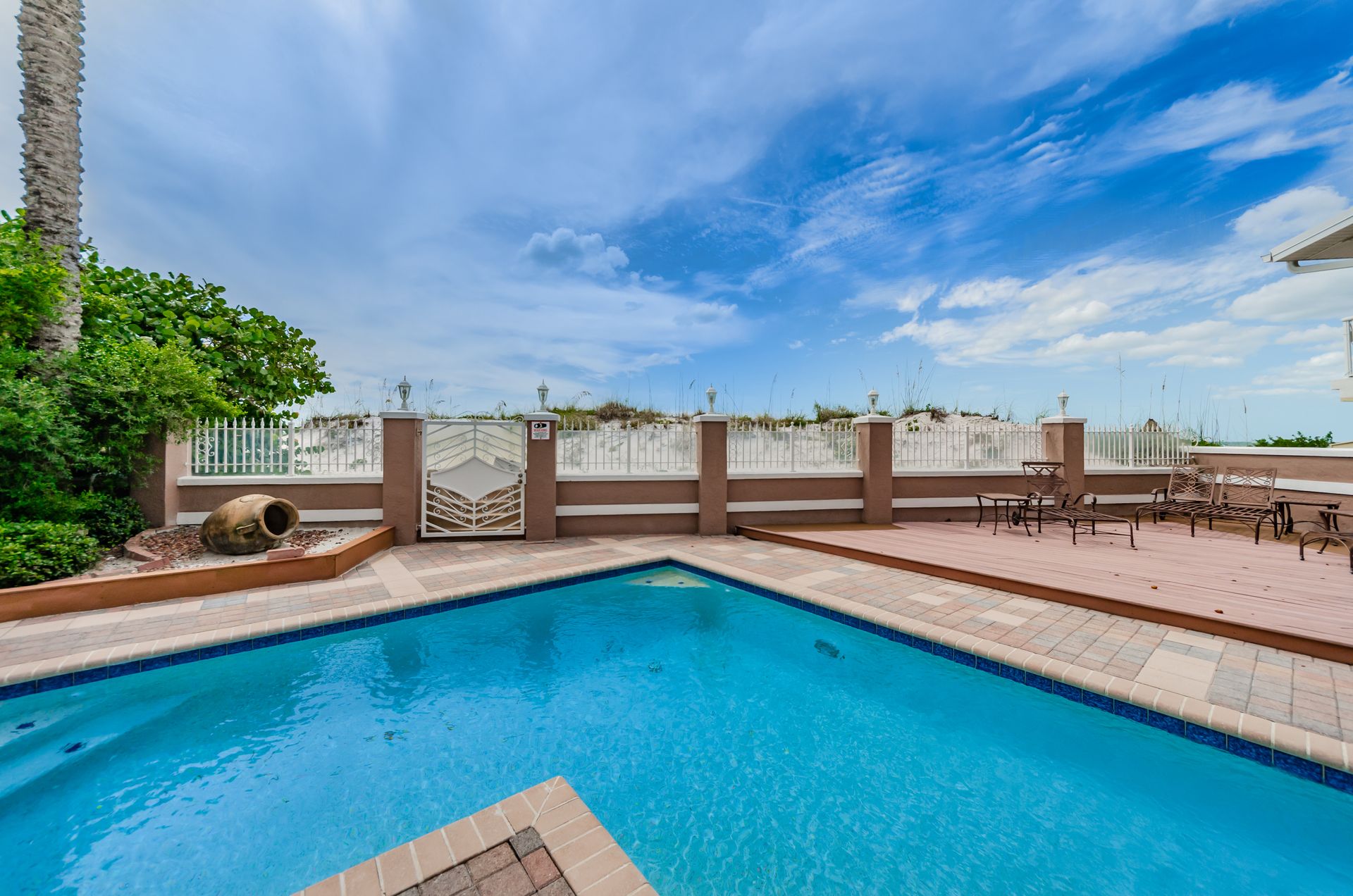 Welcome home to an exclusive waterfront condo which maintains the appearance of a mansion featuring one of the largest prime Gulf of Mexico lots, with endless water views that St Pete Beach has to offer. A home like no other! The exclusive condo is located directly on the sandy white beaches with spectacular views of the azure water. Where luxury meets privacy & serenity. Custom details throughout this one-level beauty will impress even the most elusive buyer from double paned windows & doors, granite counter tops in all bathrooms, kitchen and wet bar, imported Italian tile flooring, custom handcrafted crown molding and cabinets, chef’s kitchen and plenty of storage in this beach gem. Two Master suites with unspoiled water views split with ensuite bathrooms, large walk-in closets and balcony for spectacular sunsets over the Gulf of Mexico add to the luxury of this unit. Two additional guest bedrooms split from the masters at the front of the home. Enter through ornate iron electronic gates to this compound with a surveillance system & elevator for your privacy & security. The grounds offer imported palms and tropical landscaping and custom paver driveway & walkways. This luxurious home provides large living areas with amenities not found in most condos on the beach; private beach access, private Gulf pool, spa, double garages and plenty of outdoor patios for entertaining. Built next to other single-family homes this luxury home has stunning views of the Gulf from a generous balcony and most rooms. There’s a private elevator foyer for each of the 3 residences. Casablanca on the Beach lifts you to the pinnacle of living. Be prepared to check everything off your dream home wish-list.