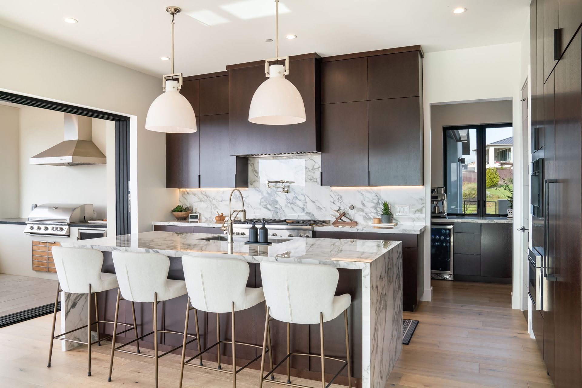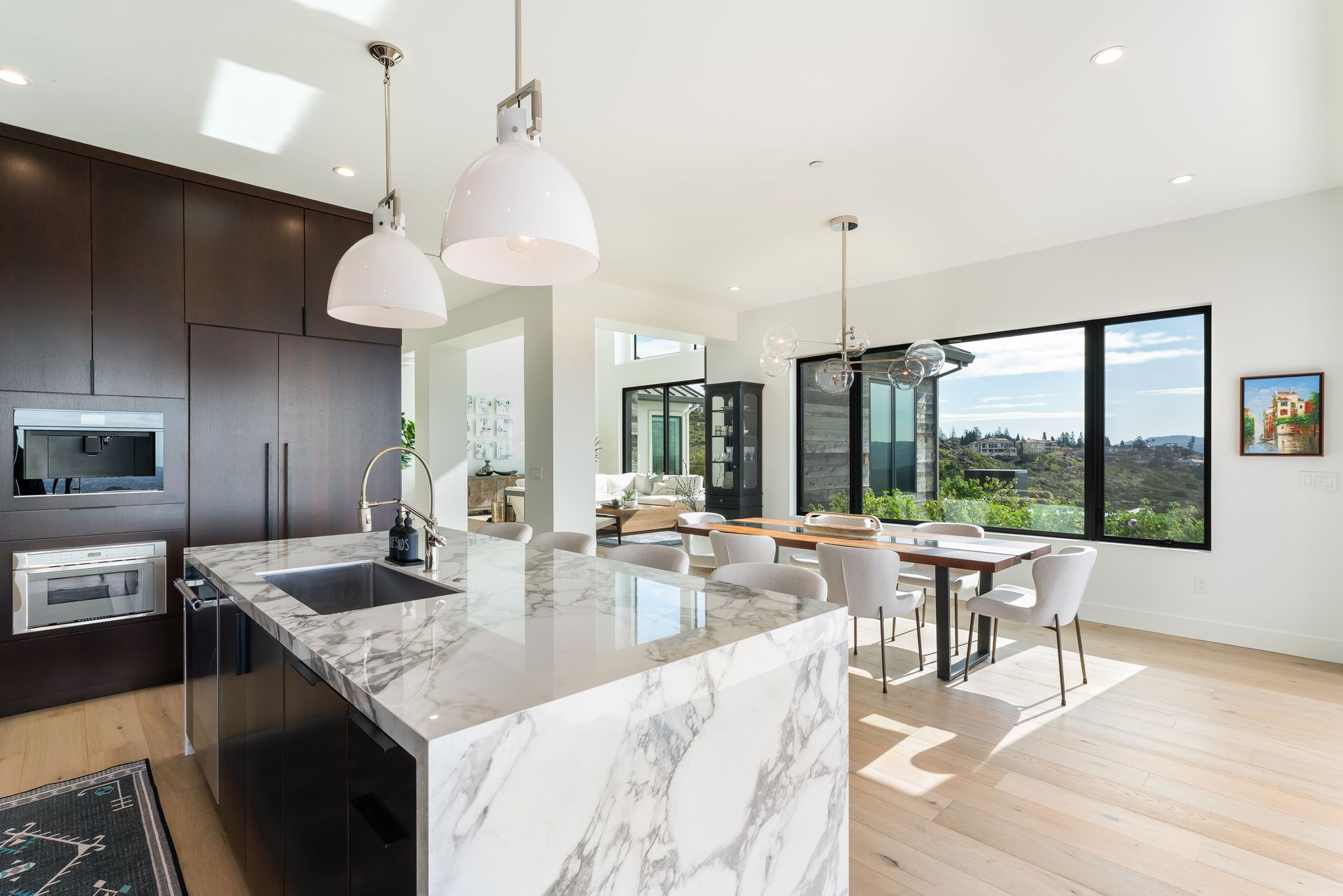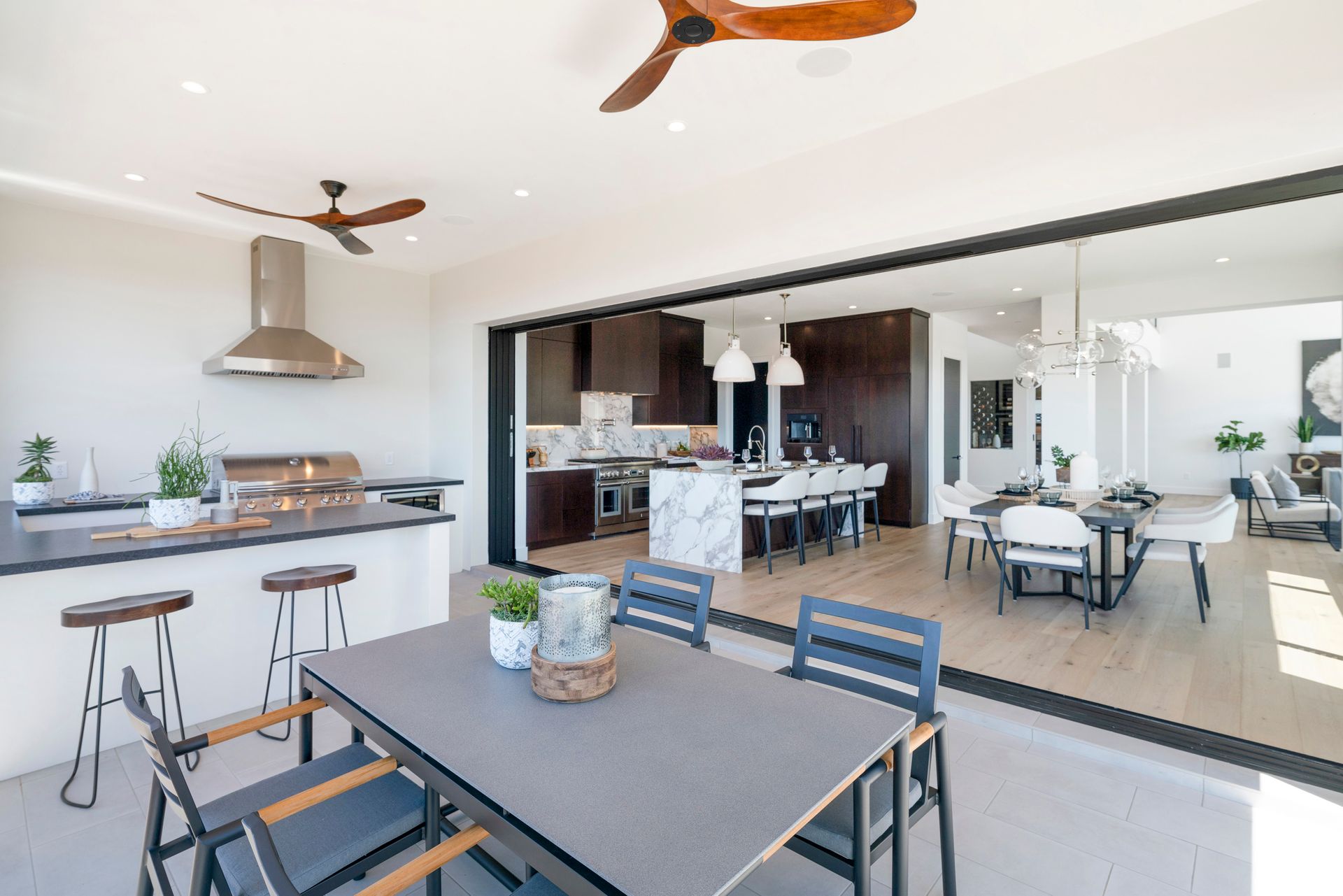 Dining area with disappearing moving glass doors to the terrace and outdoor kitchen, expansive views