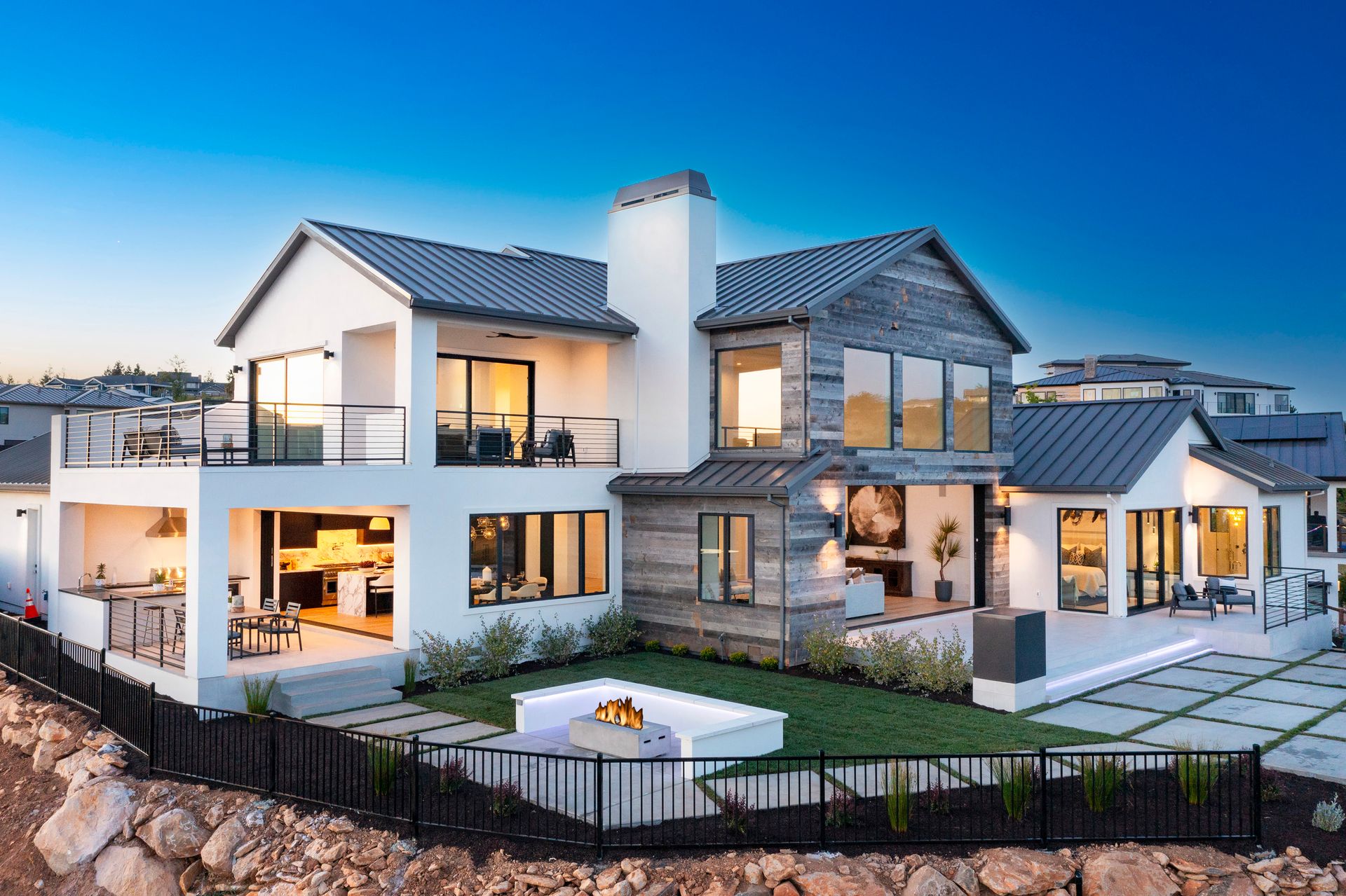 Landscaped front and rear yards with multiple entertaining areas, lawn area, raised planting bed, infinity edge heated pool and spa with retractable cover, firepit with seat wall
