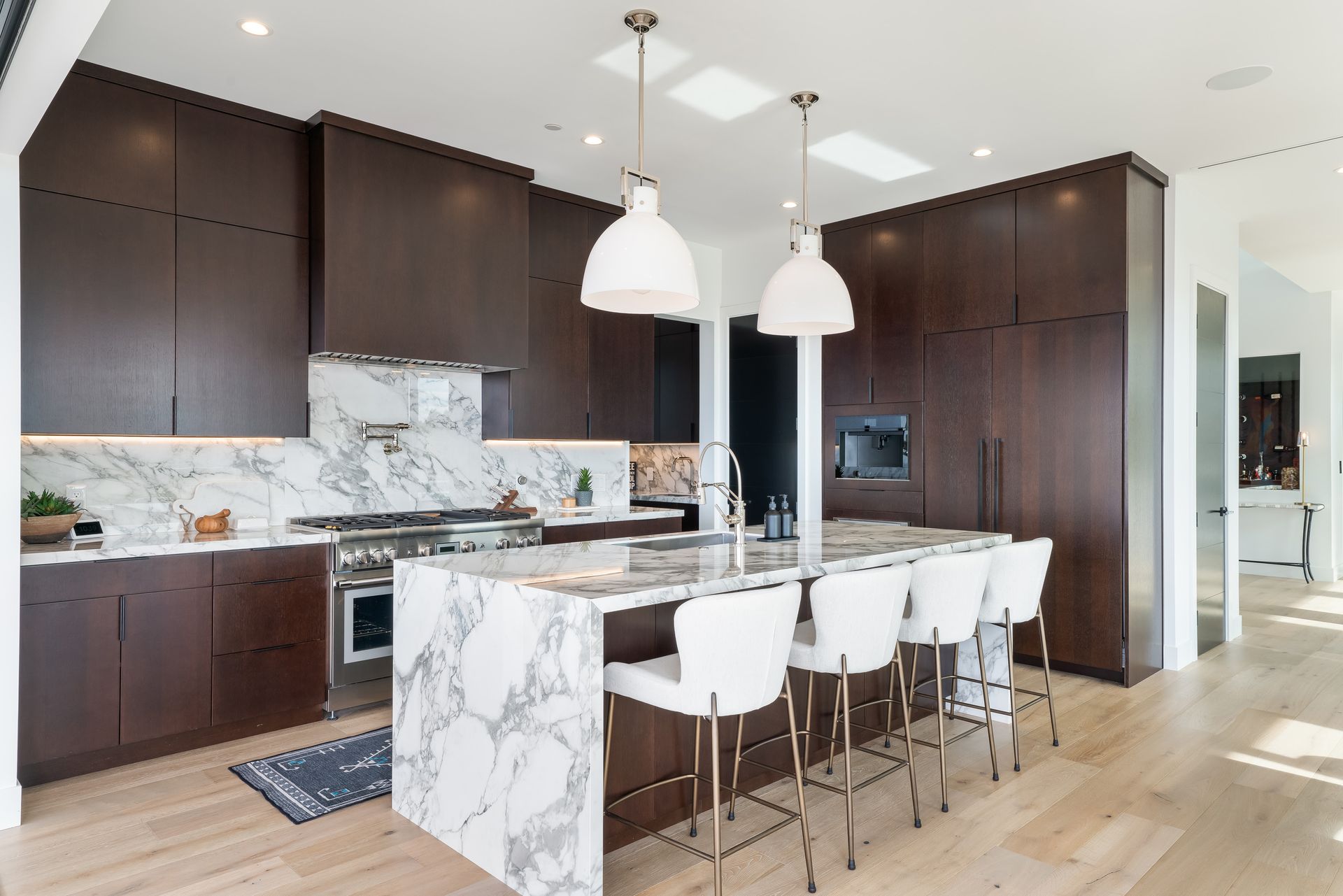 Kitchen boasts a large center island with porcelain counter, Jenn-Air built-in coffee maker, Thermador built-in refrigerator/freezer, microwave, 6 burner gas range with griddle and double ovens, pot filler faucet, hood over range, large stainless sink, soft close drawers and cabinets