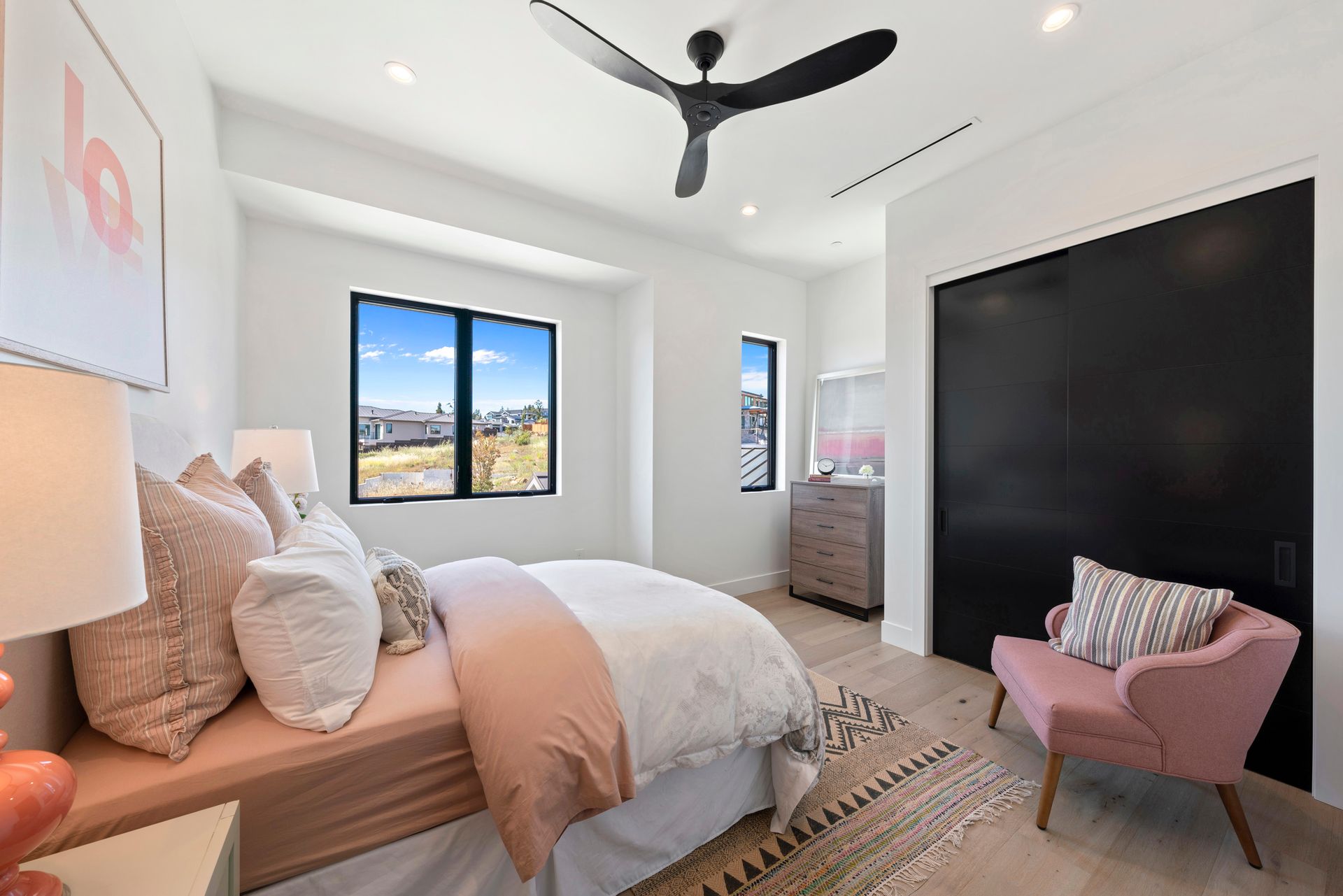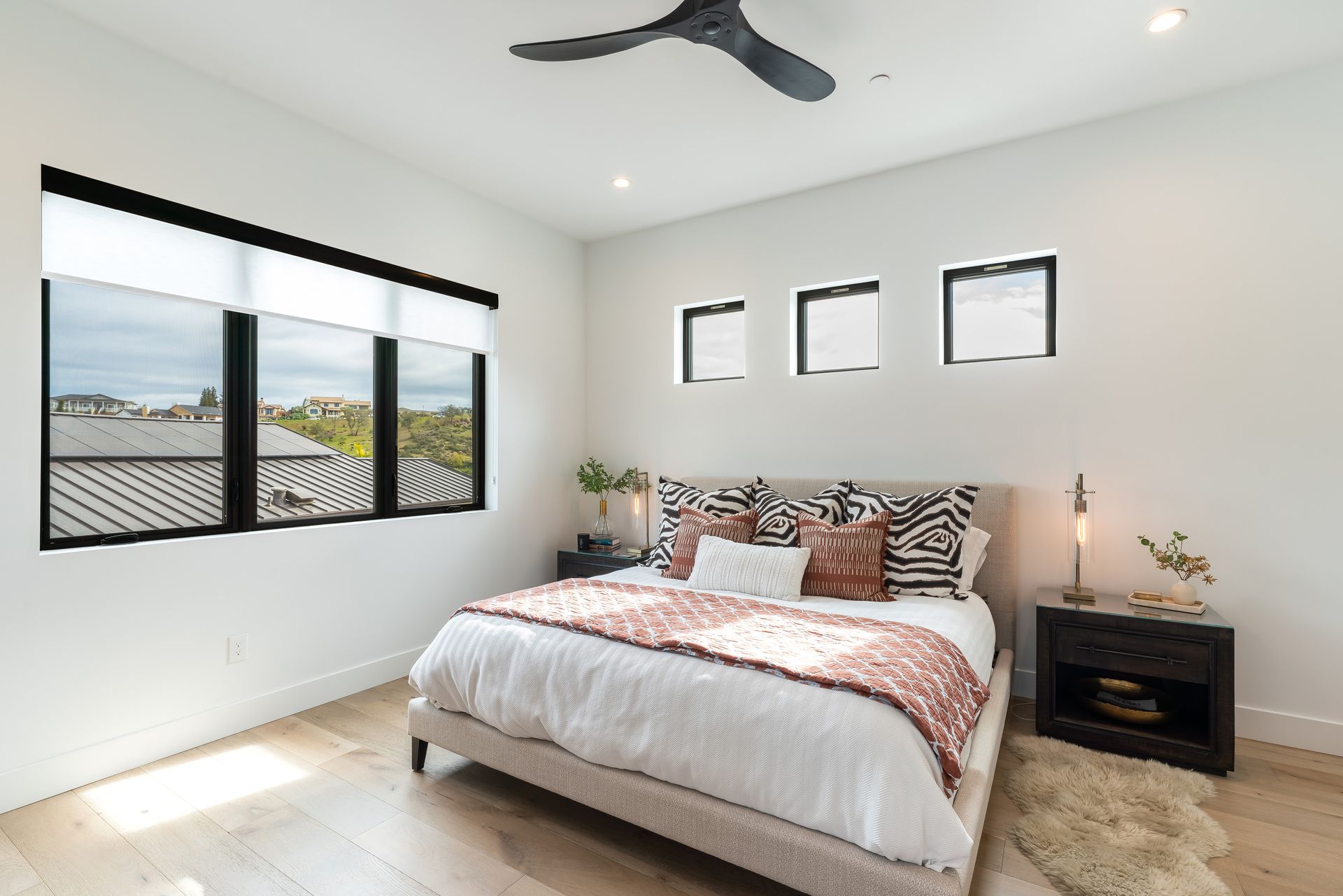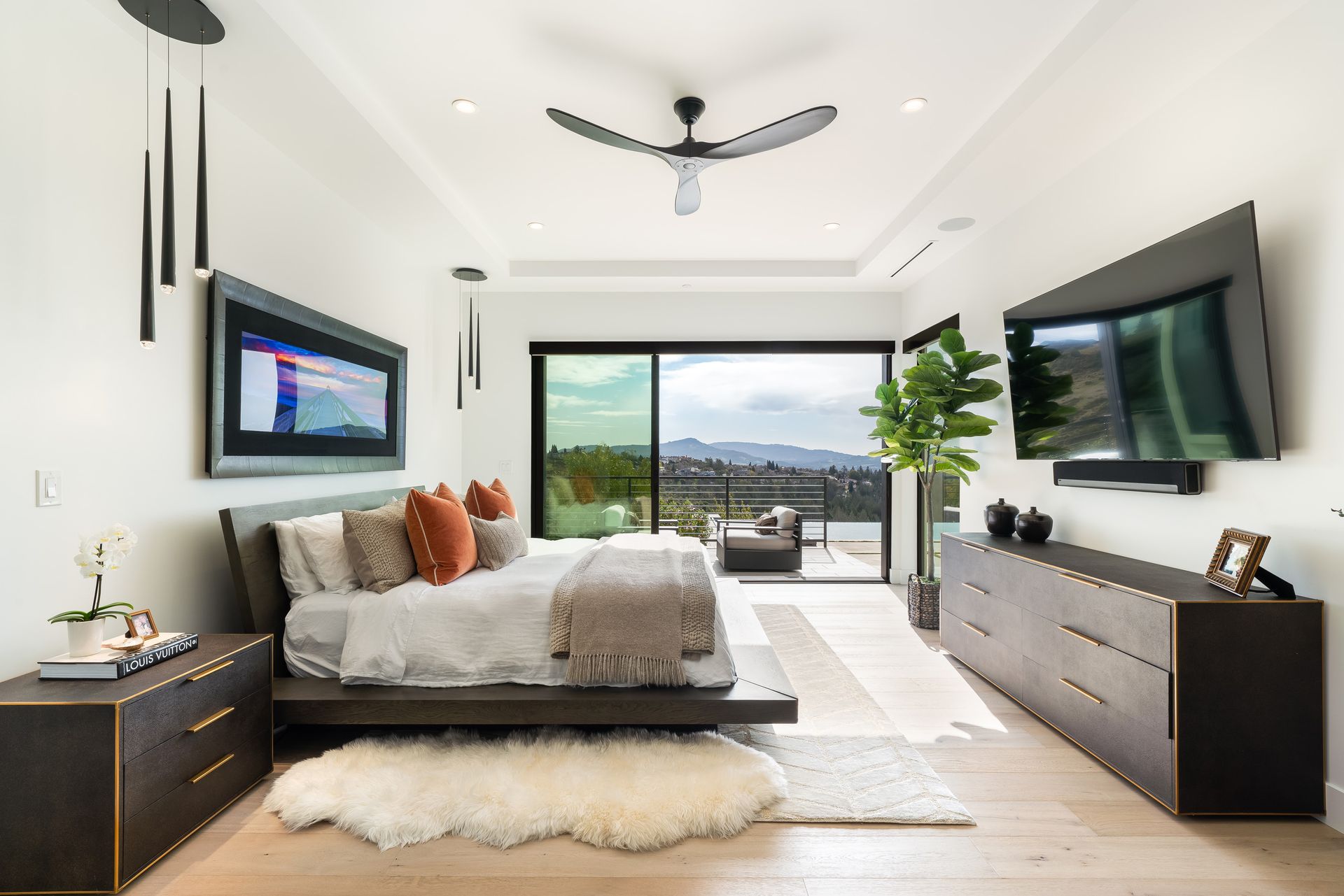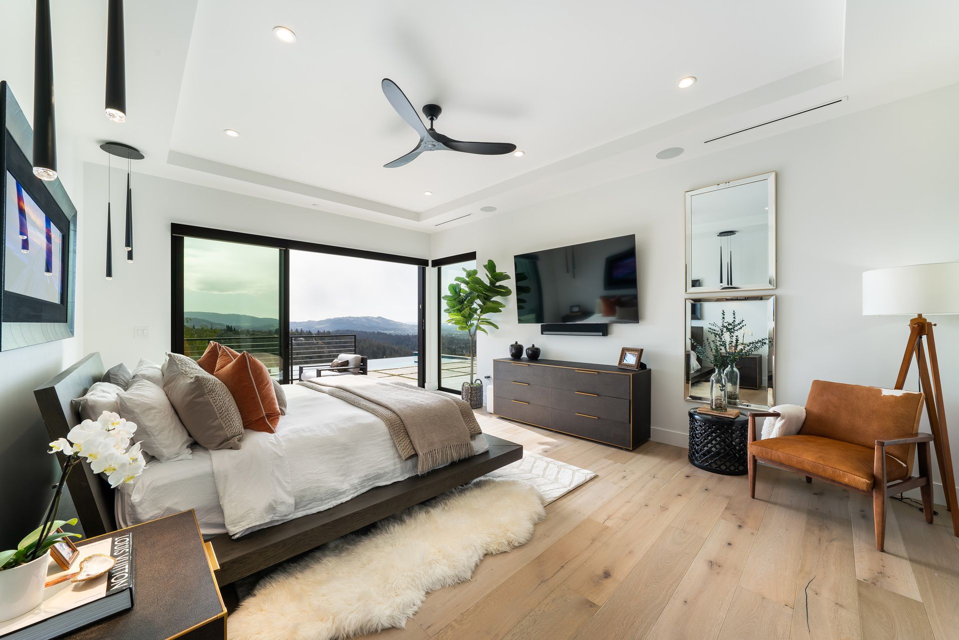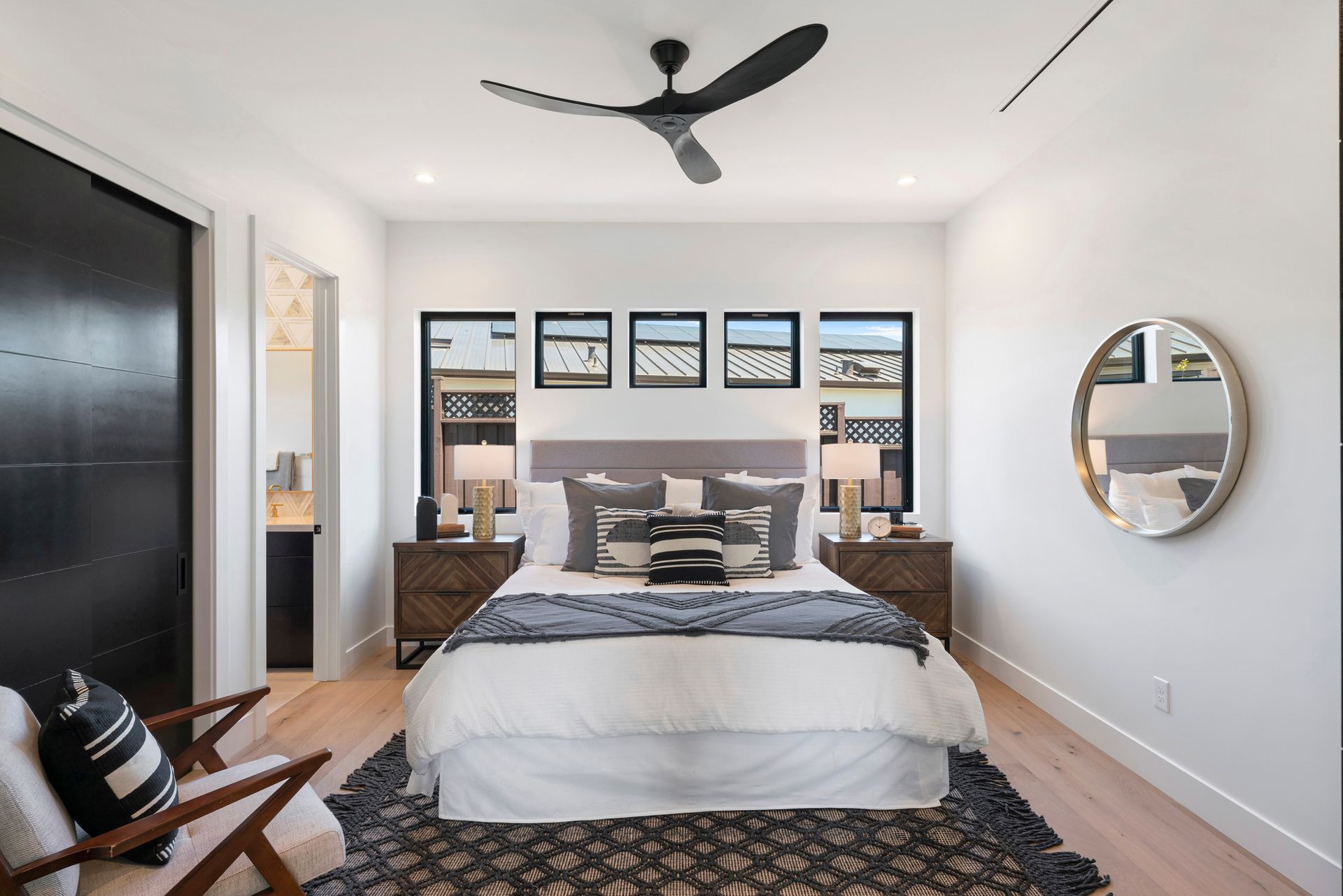 Primary bedroom on main level features ceiling fan, built-in audio speakers, direct access to view terrace