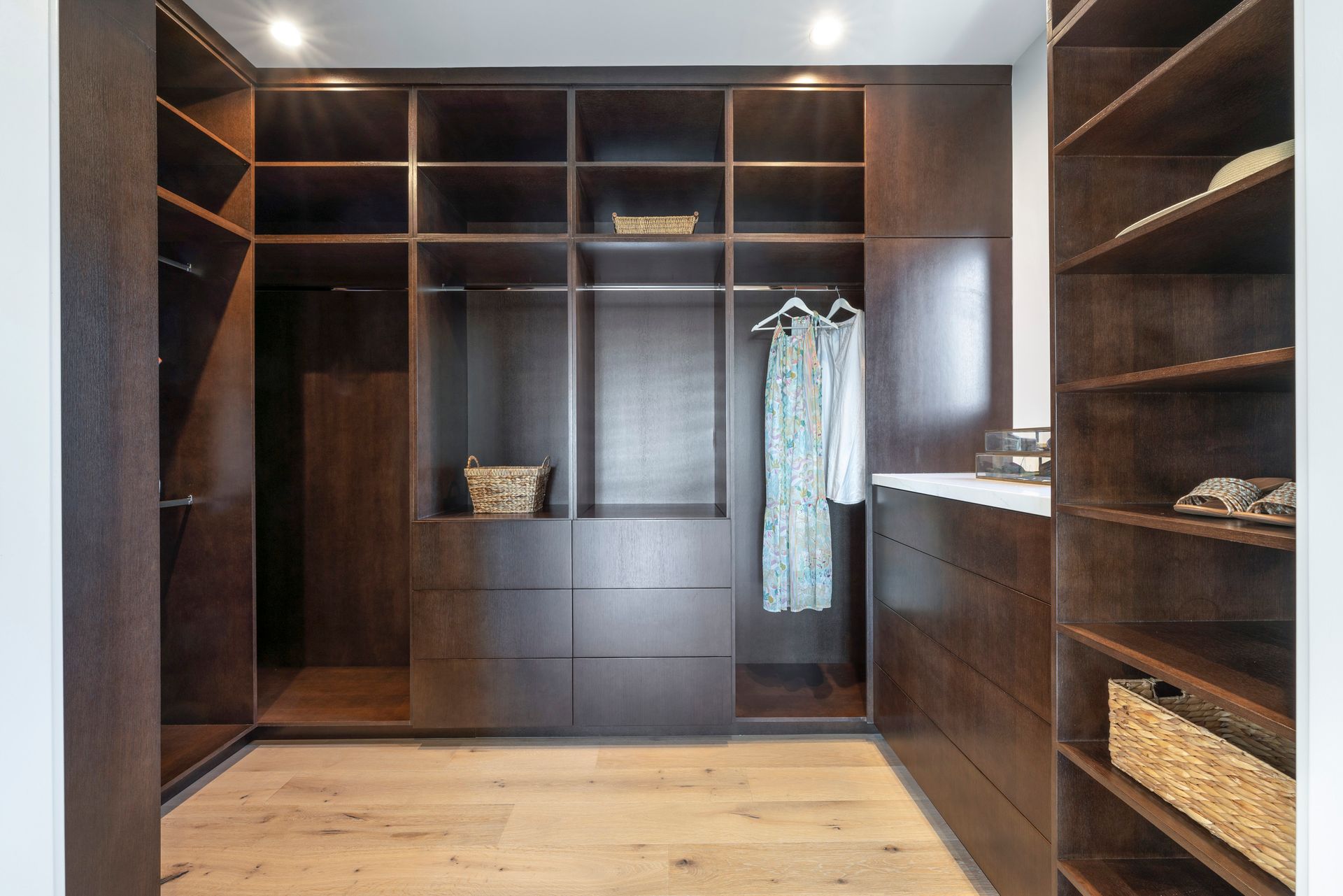 Primary bath has dual sinks, soaking tub, large stall shower with rain shower head and handheld wand, Porcelain floor and walls, walk-in closet with organizer and dresser
