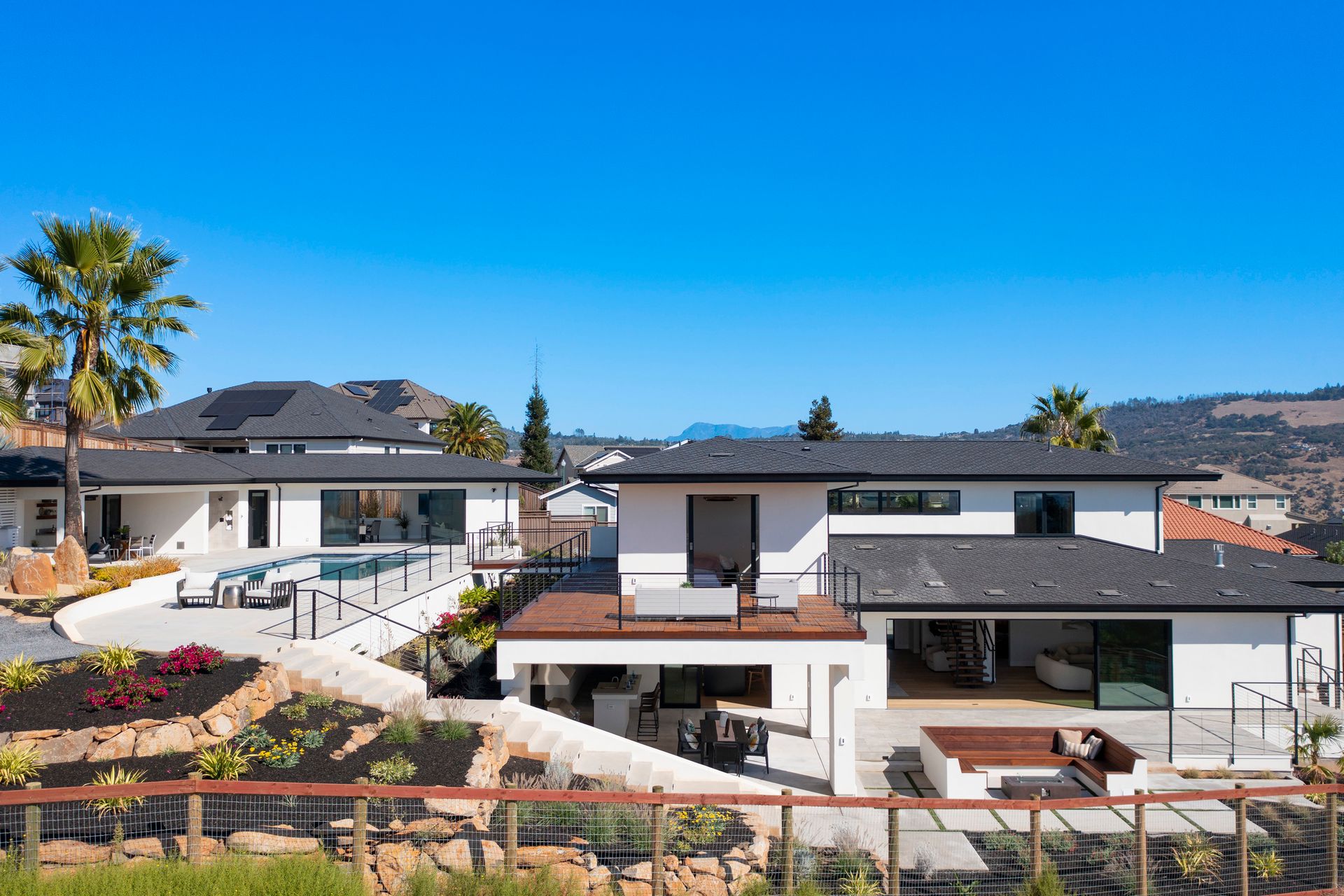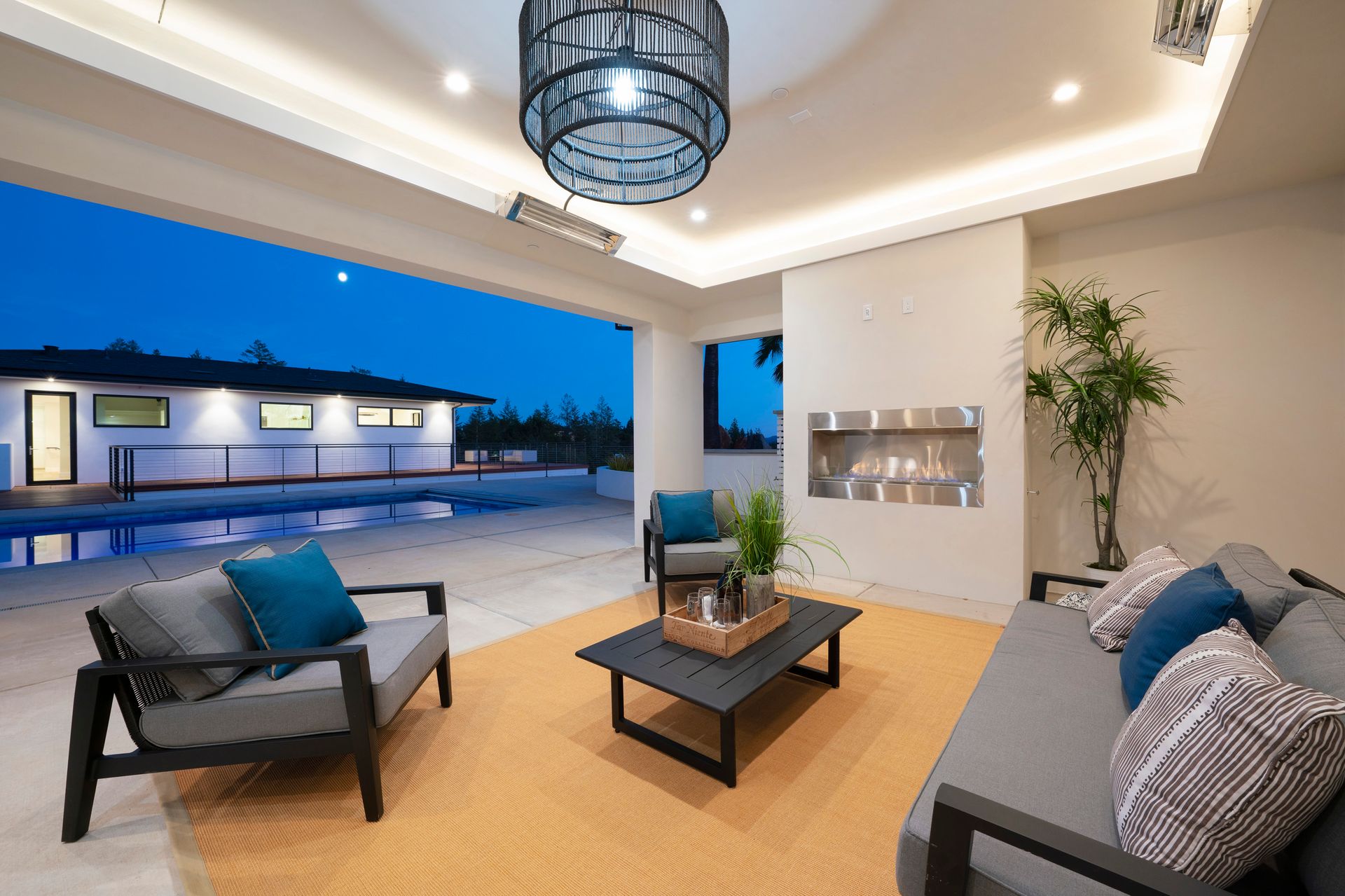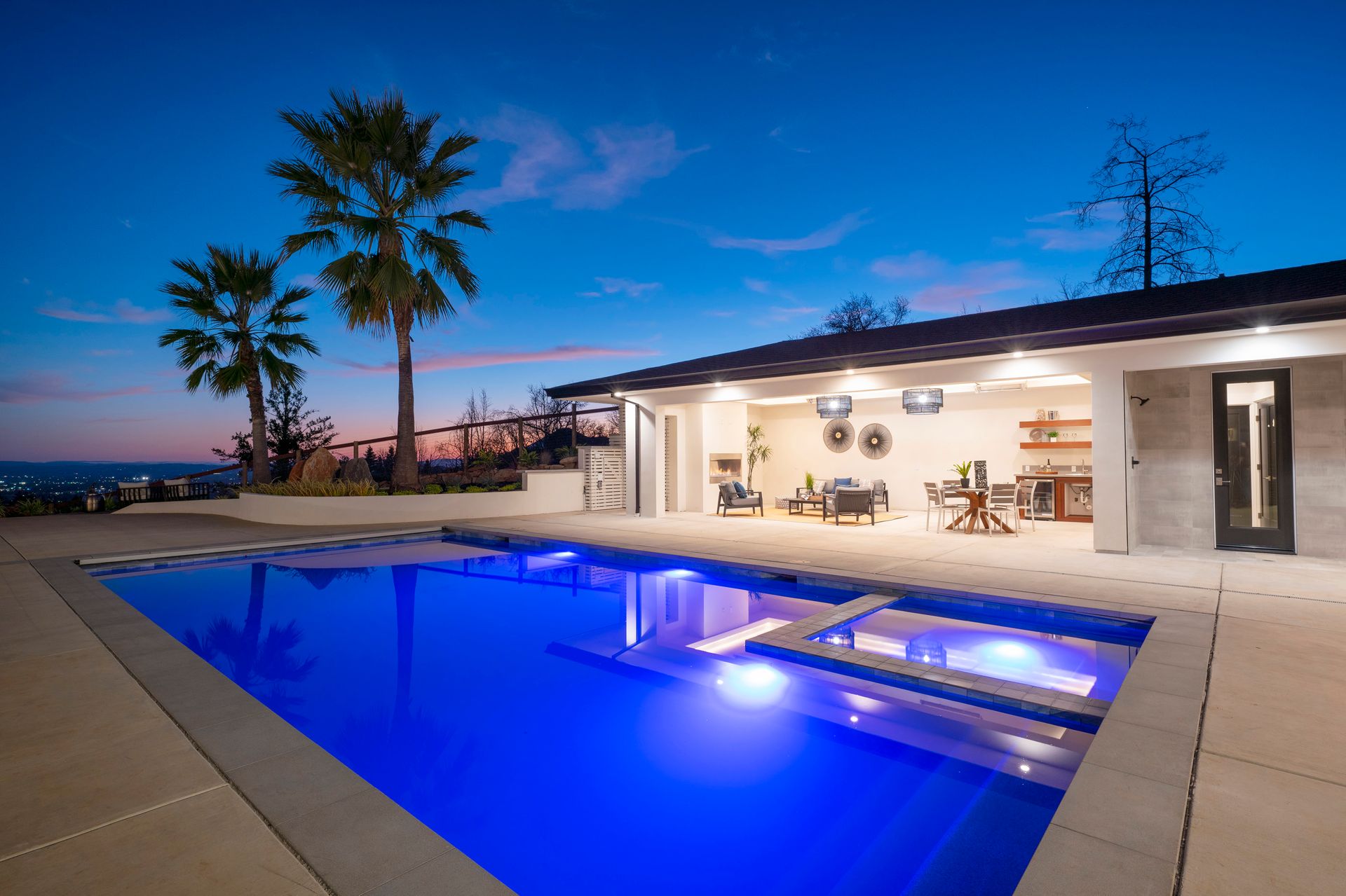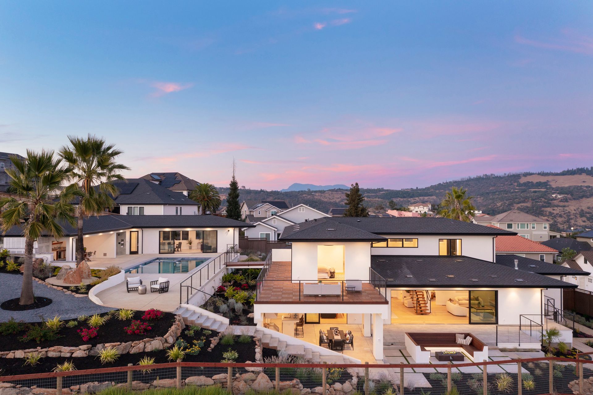 This newly constructed home in Fountaingrove sits on a generous .60 acre lot with views. The main house features 4 bedrooms and 4 full baths. The covered entry leads to a modern glass door taking you to the dramatic great room with vaulted ceiling and a wall of sliders to the rear patio and outdoor kitchen. The open concept floor plan features the great room with a gas fireplace and stone surround, wood flooring, and is open to the dining and kitchen. There is a separate sitting room/den. The chef’s kitchen is accented by a center island, Dacor appliances, wine refrigerator and 2 walk-in pantries. A covered outdoor kitchen includes a built-in Aspire by Hestan grill, bar stool seating, 2 ceiling fans and a fire pit surrounded by bench seating. A primary suite has direct access to a view terrace and the primary bath is highlighted by heated floors and an oversized steam shower. Cross a bridge to the additional dwelling unit with a great room, 1 bedroom, kitchen, and full bath. A pool cabana displays a linear gas fireplace, outdoor shower, bath, beverage refrigerator and 4 outdoor heaters making year-round entertaining a joy. Enjoy resort style living in this tropical setting with an amazing indoor/outdoor lifestyle.