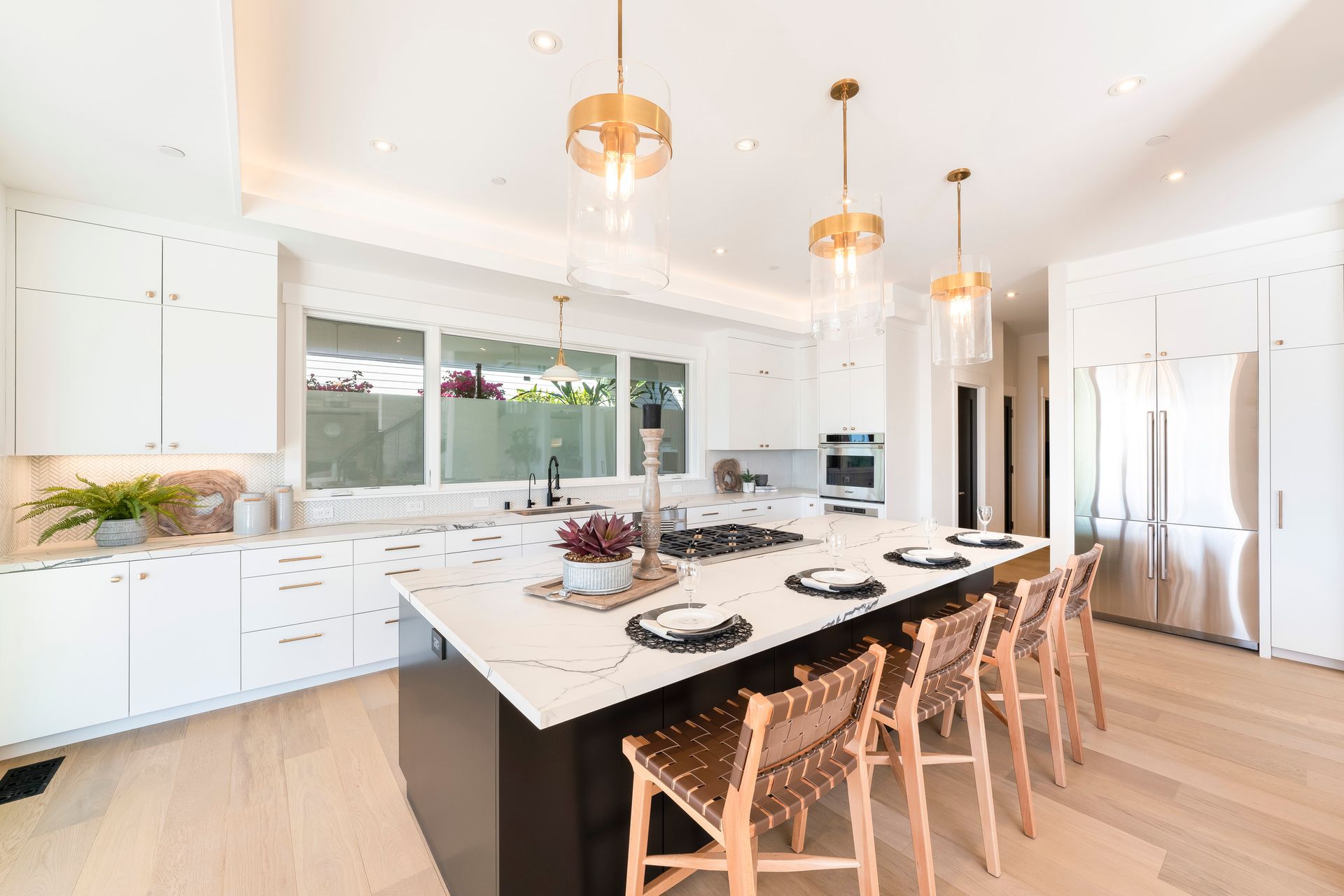 Kitchen features large center island with pendant lighting, bar stool seating, Dacor appliances include 6 burner gas range and oven, 2nd built-in oven, built-in microwave, built-in refrigerator/freezer, dishwasher, soft close drawers 2 walk-in pantry, and wine refrigerator and slider to outdoor kitchen