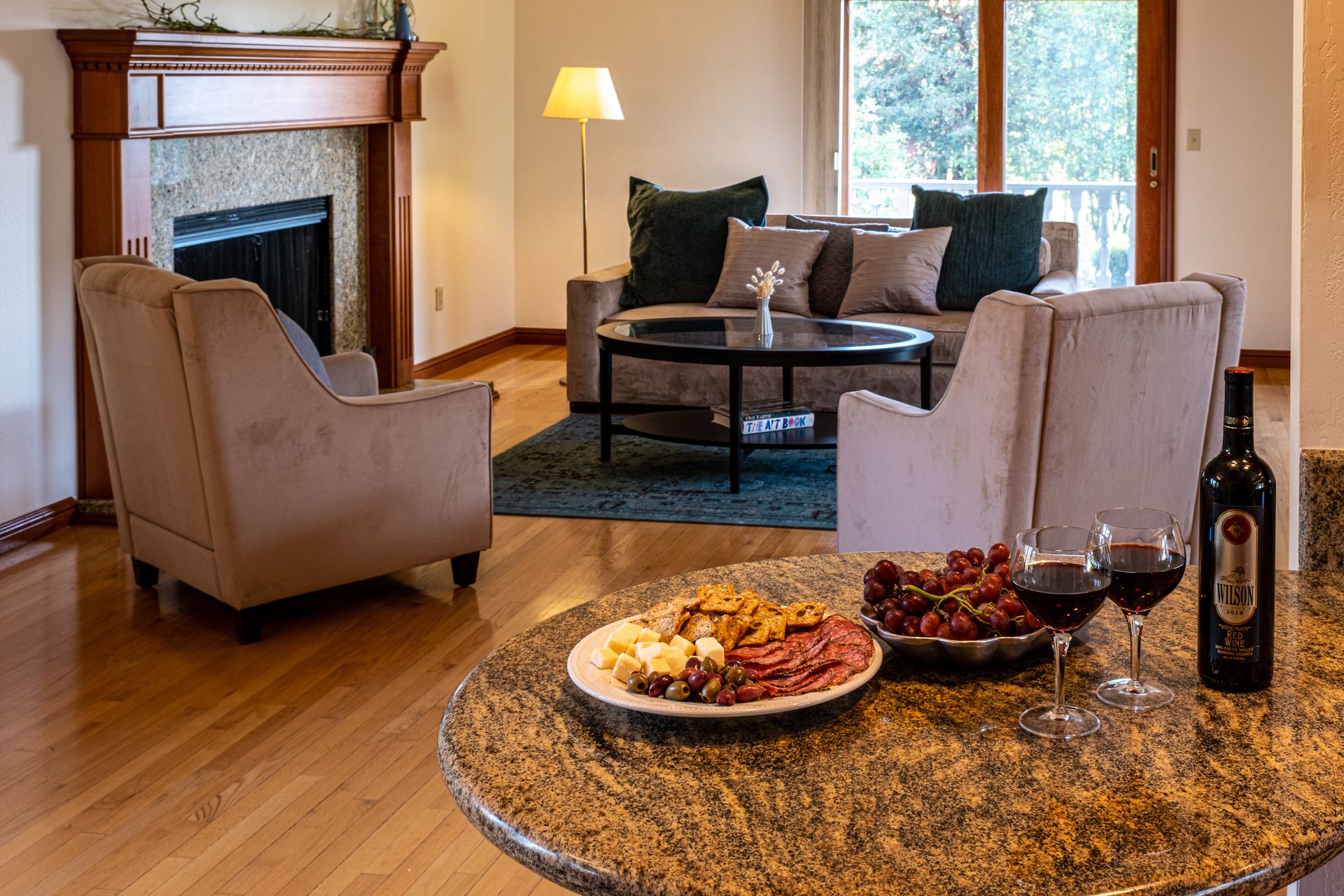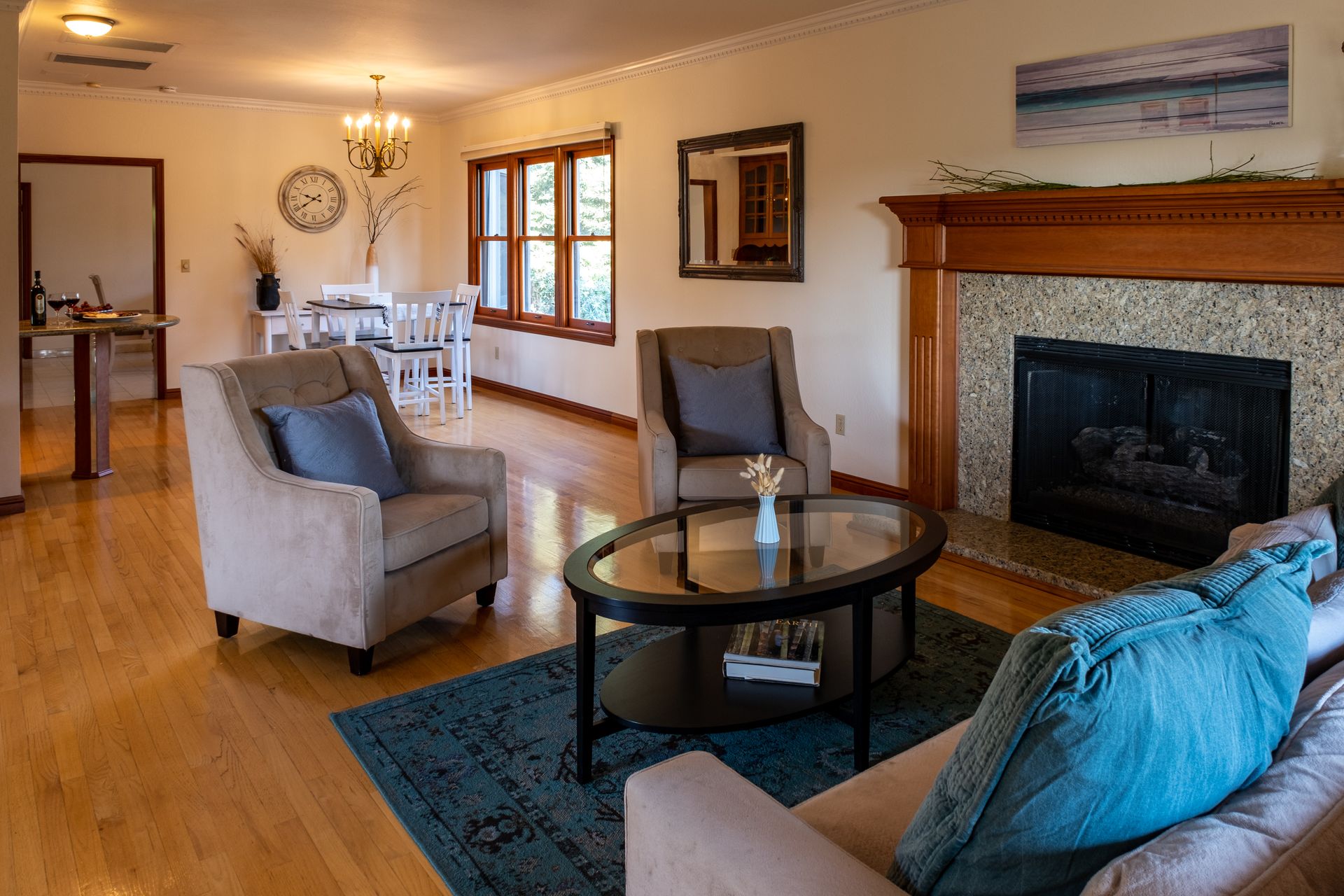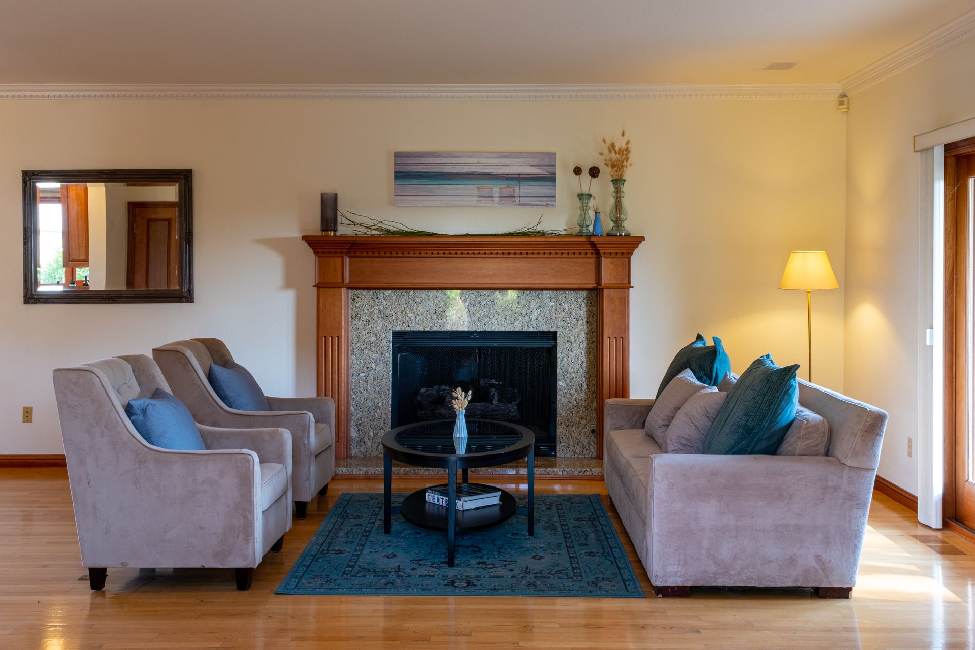 - Living room with hardwood flooring and fireplace