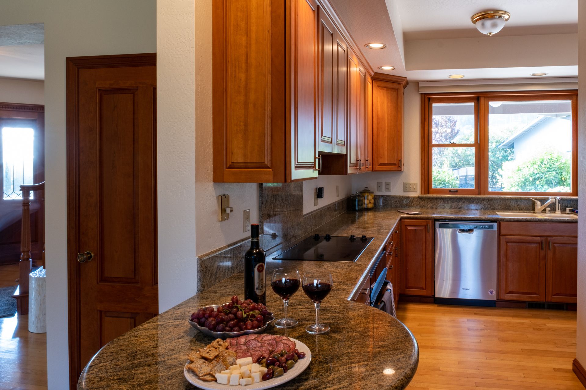 - Kitchen includes stone counters, built-in oven, cooktop with hood, dishwasher, pantry cabinet with pull out shelving, direct access to covered porch and patio