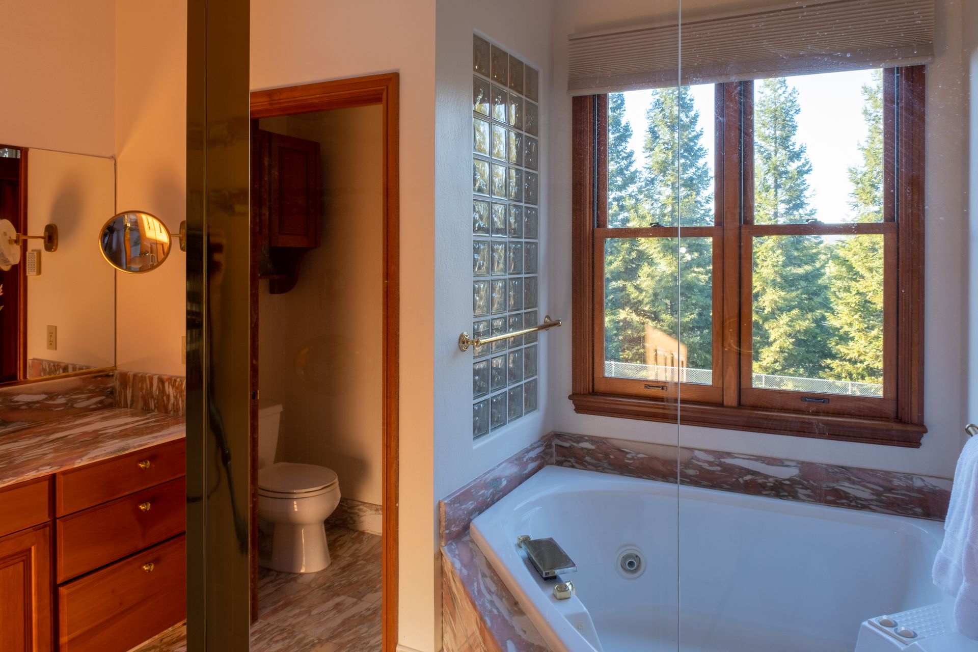 - Master bathroom features large jetted soaking tub with glass block accent wall, shower stall with shower head and 2 hand-held wands