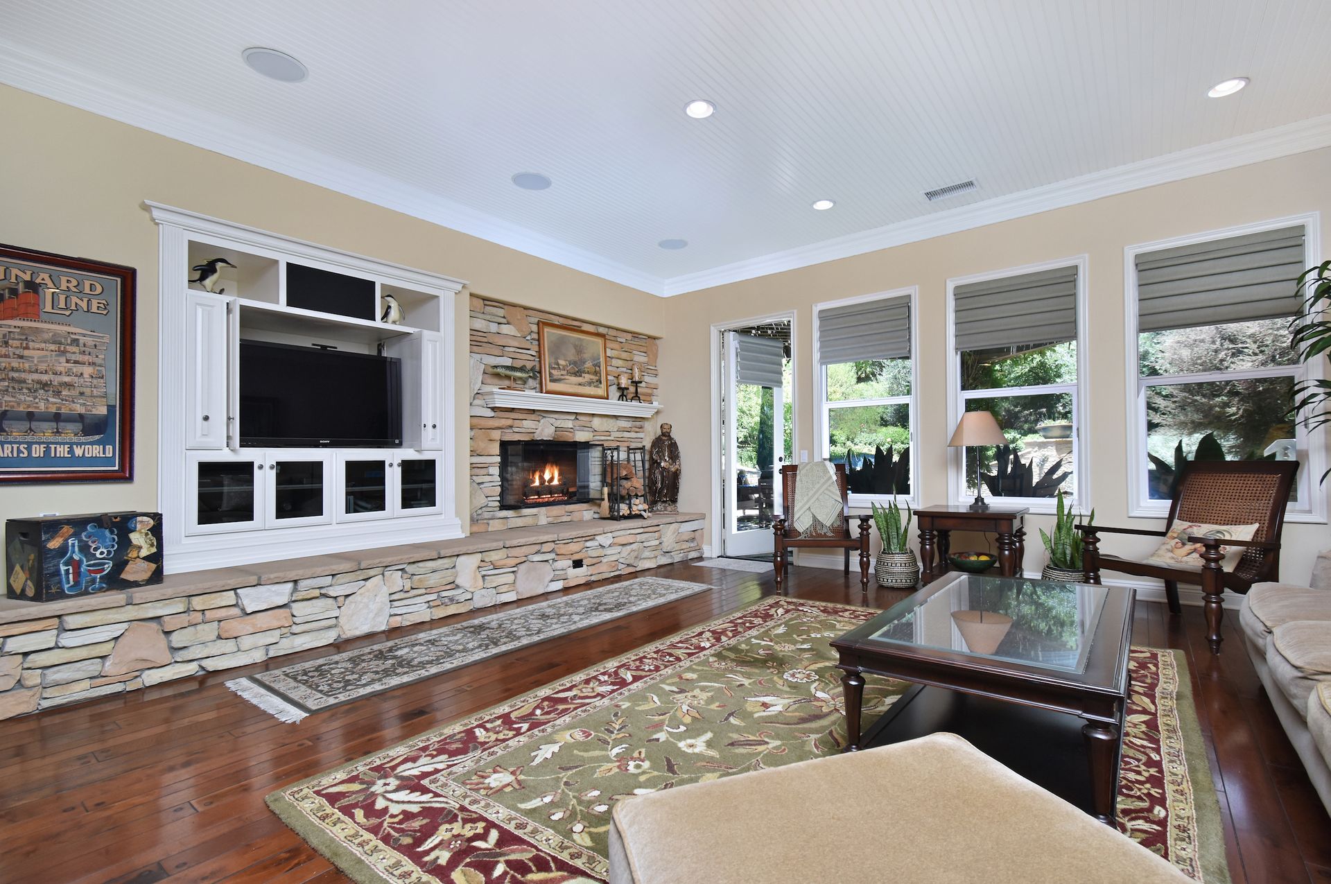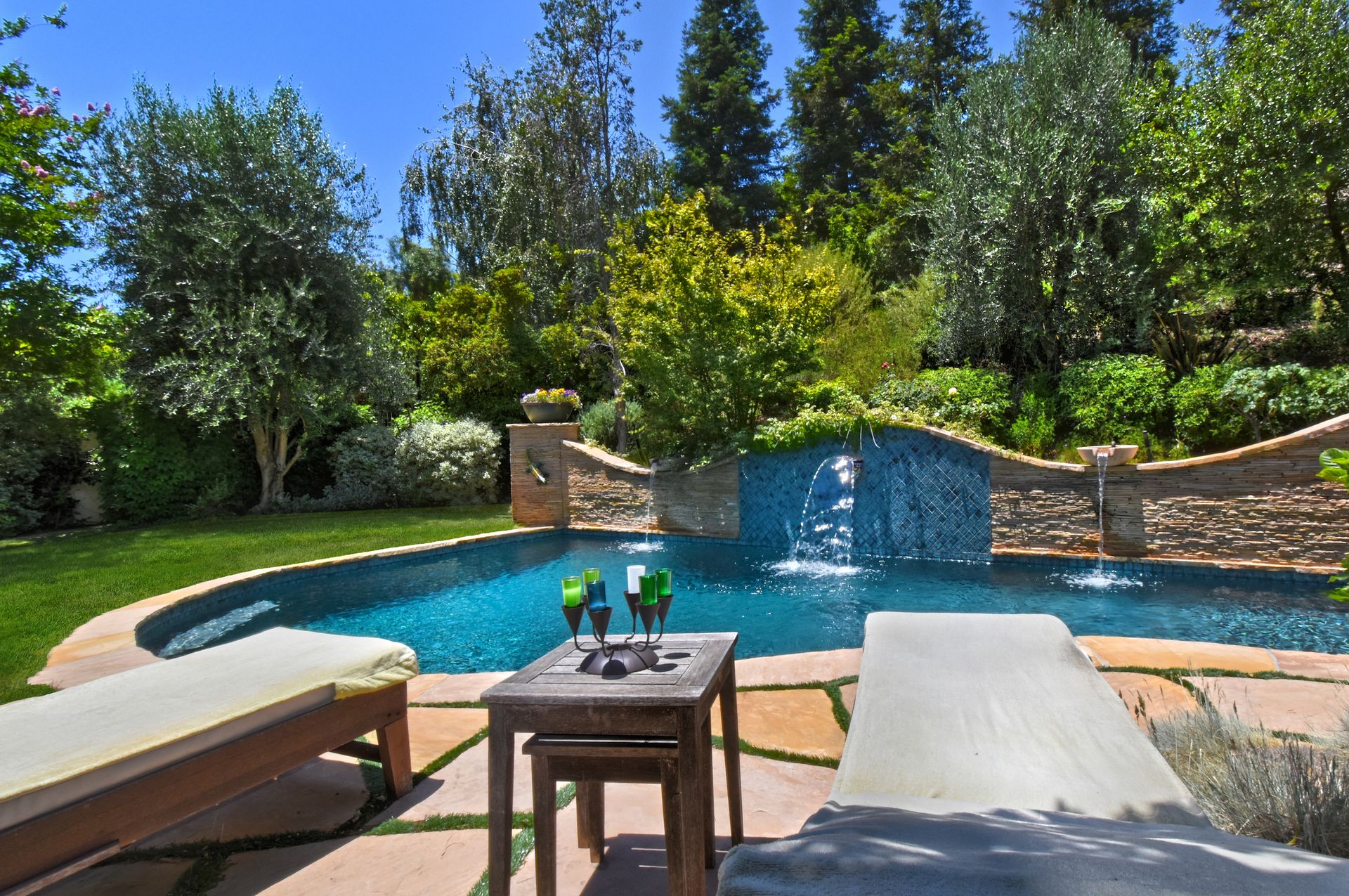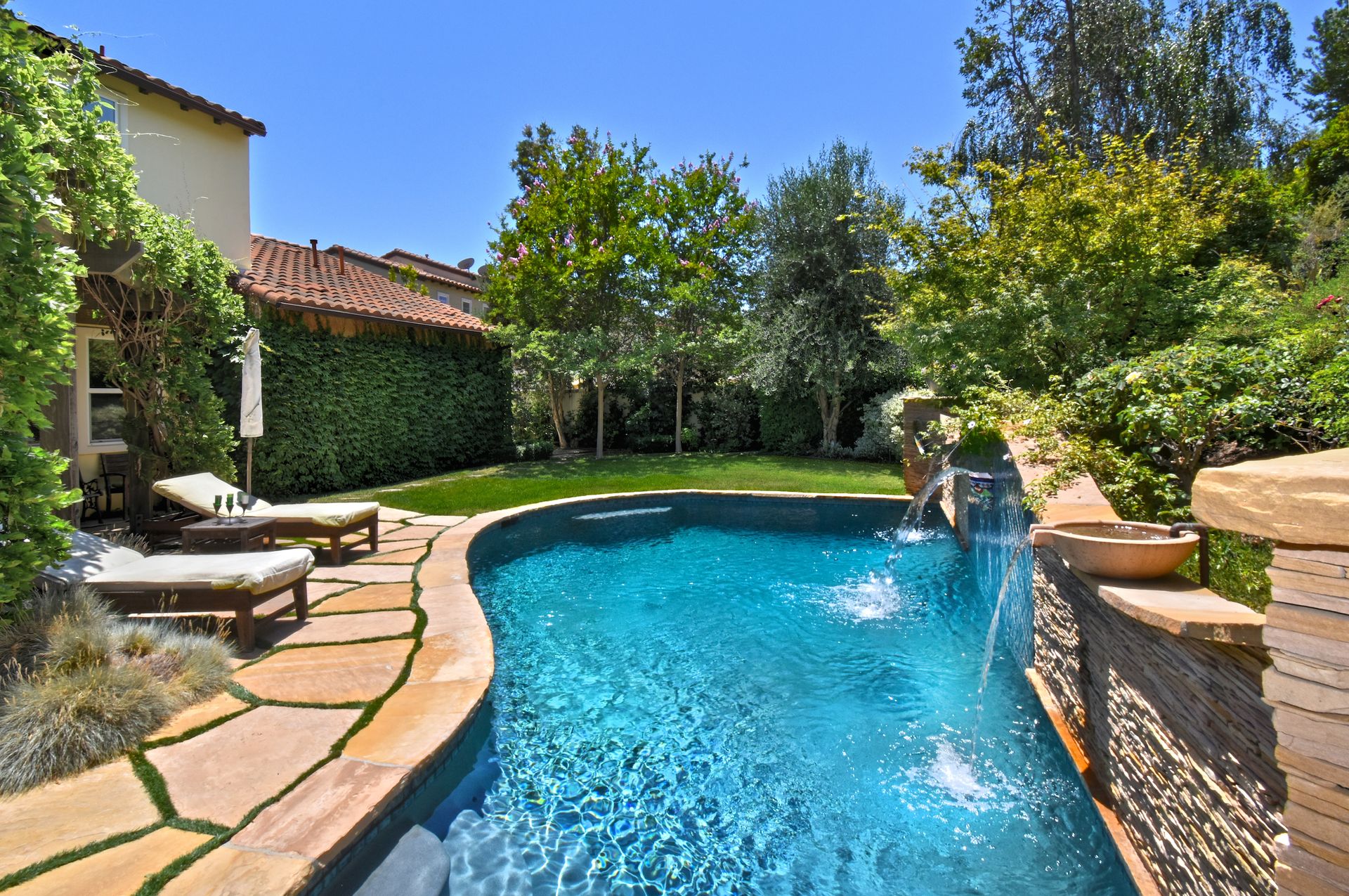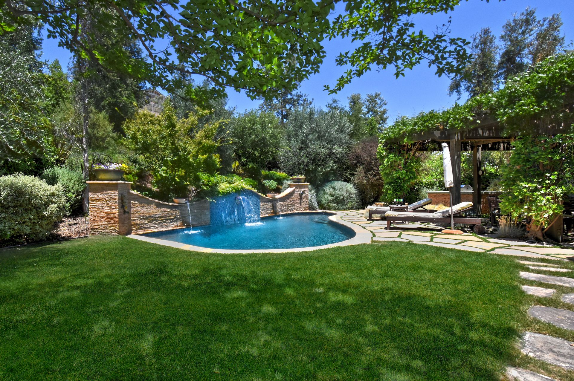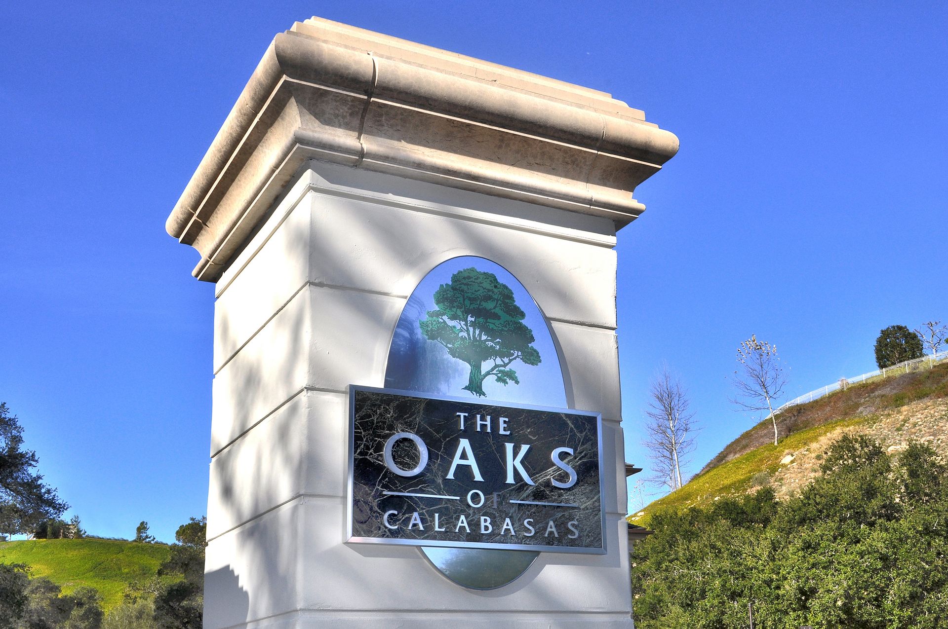 Refined living and elegance in the Oaks of Calabasas. The exceptional design of this Vintage at The Oaks Plan-Four Residence boasts more than 4,700-square feet of open floorplan with a multitude of upgrades and custom finishes, from the fabulous French walnut peg and groove hardwood floors on the lower level, main staircase and in the master suite and bath, to the crown moldings, beadboard and vaulted ceilings and custom drapes and window coverings throughout. The lower level includes a formal dining room with French doors leading onto a stone patio that is ideal for entertaining, a sprawling family room with a built-in surround sound system, a living room, a library/office all with wood-burning fireplaces, a bedroom with full en suite bath and both a powder room and laundry room. An expansive gourmet kitchen offers granite counters, stainless steel Viking Professional appliances, custom pull-out cabinets, a butler’s pantry and a sunlit breakfast nook. The upstairs includes a spacious master suite with a granite fireplace and sitting area, a fabulous master bath with hot tub, granite counters and a shower and a huge closet with custom cabinets. The upstairs also includes three bedrooms with full en suite baths and a library/office. The forest-like backyard provides an abundance of privacy and seclusion amid its many fruit, olive, birch, pear, crape myrtle, sequoia and other trees and includes landscape lighting, a second stone patio, a custom pool with a waterfall, a built-in BBQ with ample counter space and refrigerator, a fire pit and a wisteria-covered trellis for shade and privacy. Additional features include an expansive four-car garage with custom built-in cabinets and storage racks, a porte-cochère and a fountain. All this within the beautifully maintained and guard-gated Oaks community, with an outstanding recreation center in the Las Virgenes School District.