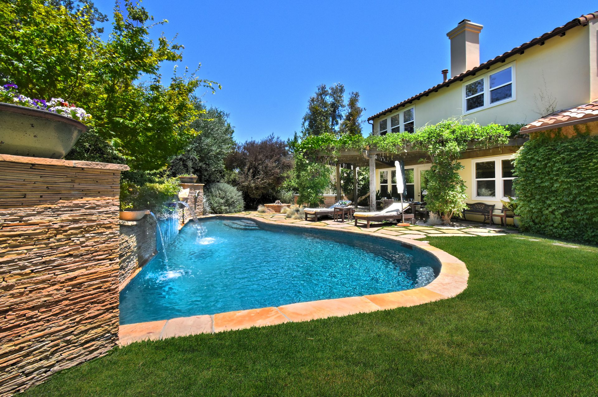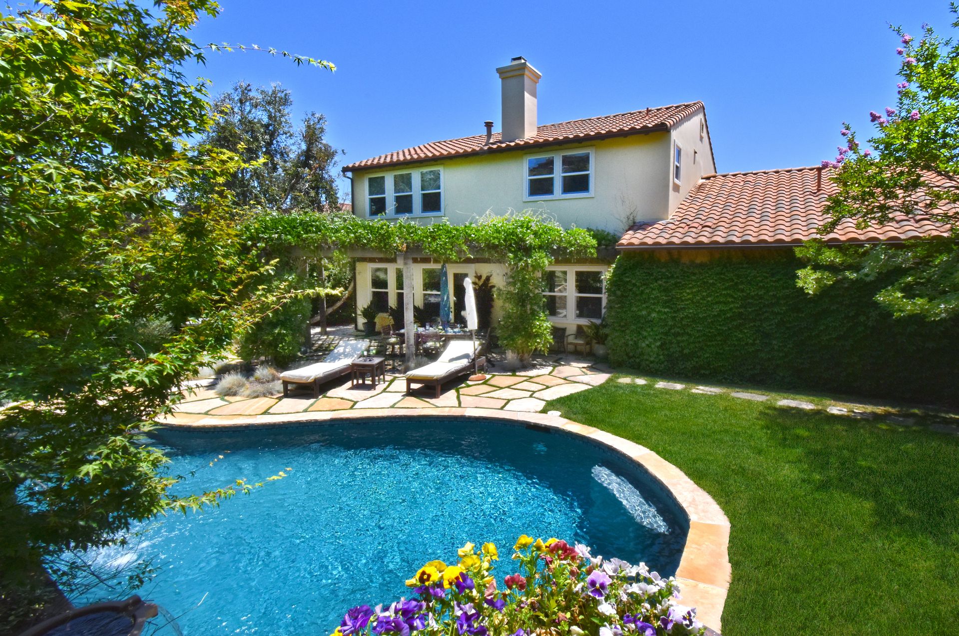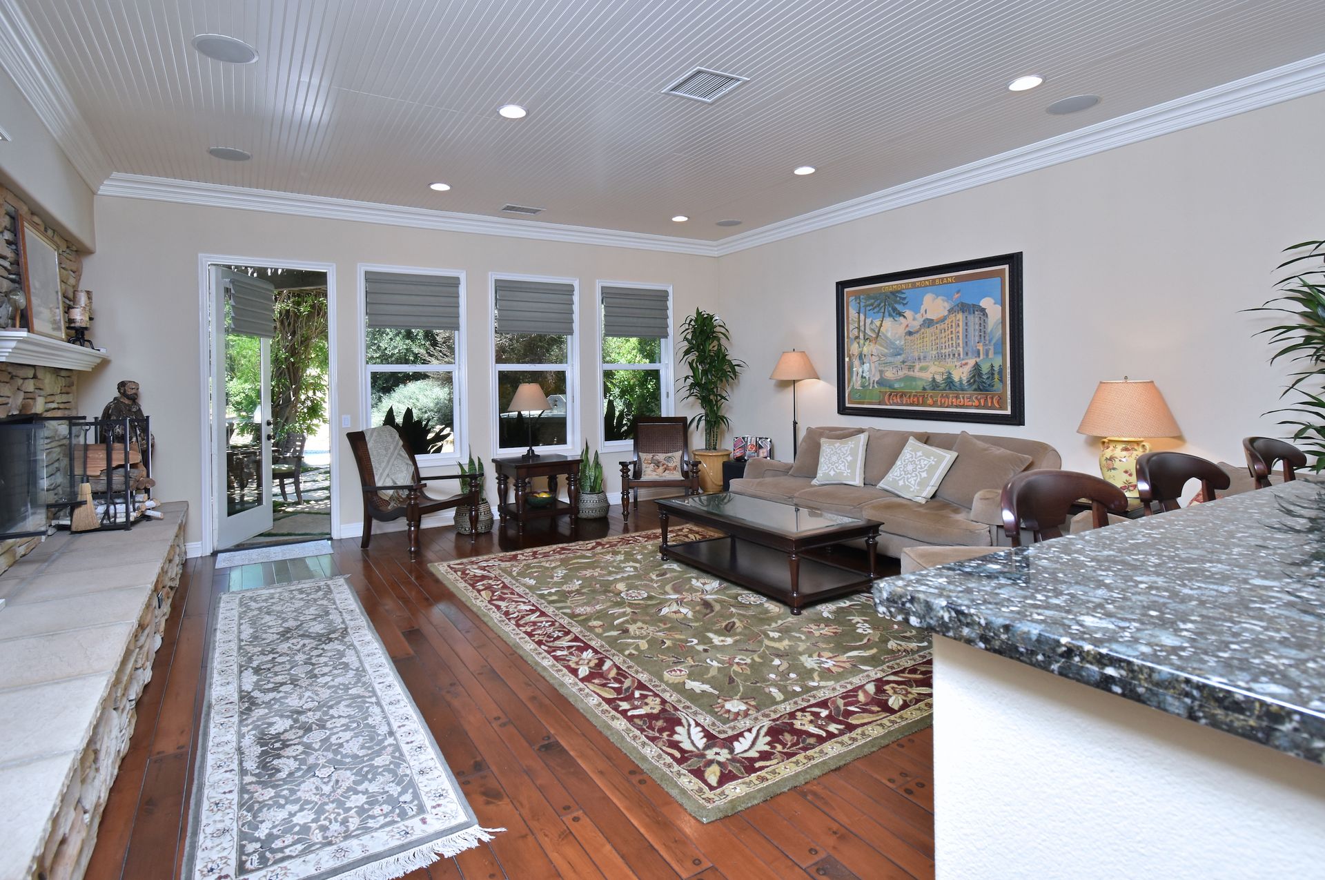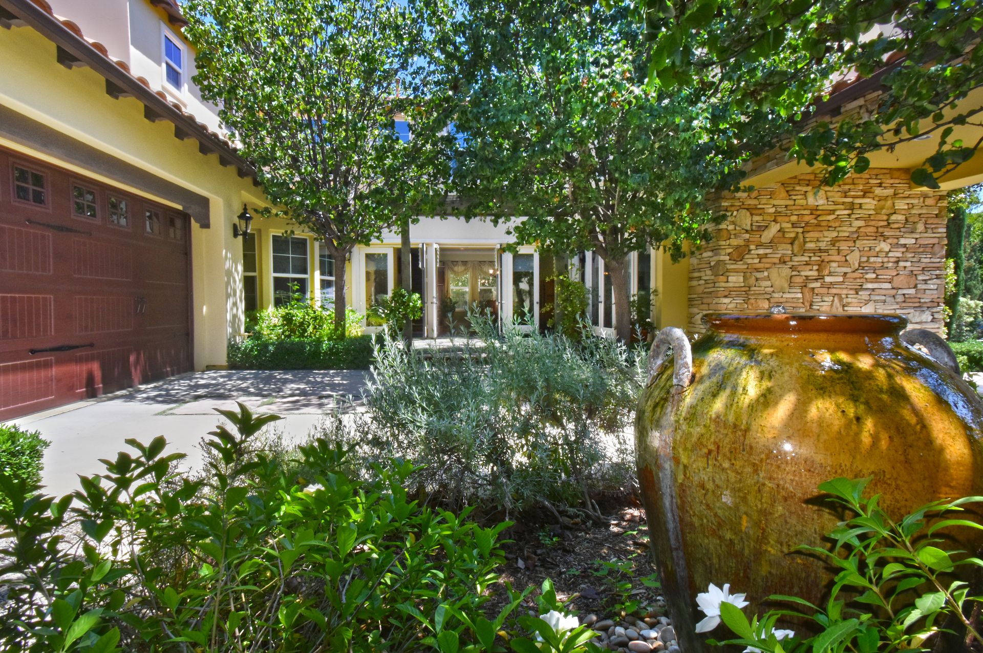 Refined living and elegance in the Oaks of Calabasas. The exceptional design of this Vintage at The Oaks Plan-Four Residence boasts more than 4,700-square feet of open floorplan with a multitude of upgrades and custom finishes, from the fabulous French walnut peg and groove hardwood floors on the lower level, main staircase and in the master suite and bath, to the crown moldings, beadboard and vaulted ceilings and custom drapes and window coverings throughout. The lower level includes a formal dining room with French doors leading onto a stone patio that is ideal for entertaining, a sprawling family room with a built-in surround sound system, a living room, a library/office all with wood-burning fireplaces, a bedroom with full en suite bath and both a powder room and laundry room. An expansive gourmet kitchen offers granite counters, stainless steel Viking Professional appliances, custom pull-out cabinets, a butler’s pantry and a sunlit breakfast nook. The upstairs includes a spacious master suite with a granite fireplace and sitting area, a fabulous master bath with hot tub, granite counters and a shower and a huge closet with custom cabinets. The upstairs also includes three bedrooms with full en suite baths and a library/office. The forest-like backyard provides an abundance of privacy and seclusion amid its many fruit, olive, birch, pear, crape myrtle, sequoia and other trees and includes landscape lighting, a second stone patio, a custom pool with a waterfall, a built-in BBQ with ample counter space and refrigerator, a fire pit and a wisteria-covered trellis for shade and privacy. Additional features include an expansive four-car garage with custom built-in cabinets and storage racks, a porte-cochère and a fountain. All this within the beautifully maintained and guard-gated Oaks community, with an outstanding recreation center in the Las Virgenes School District.