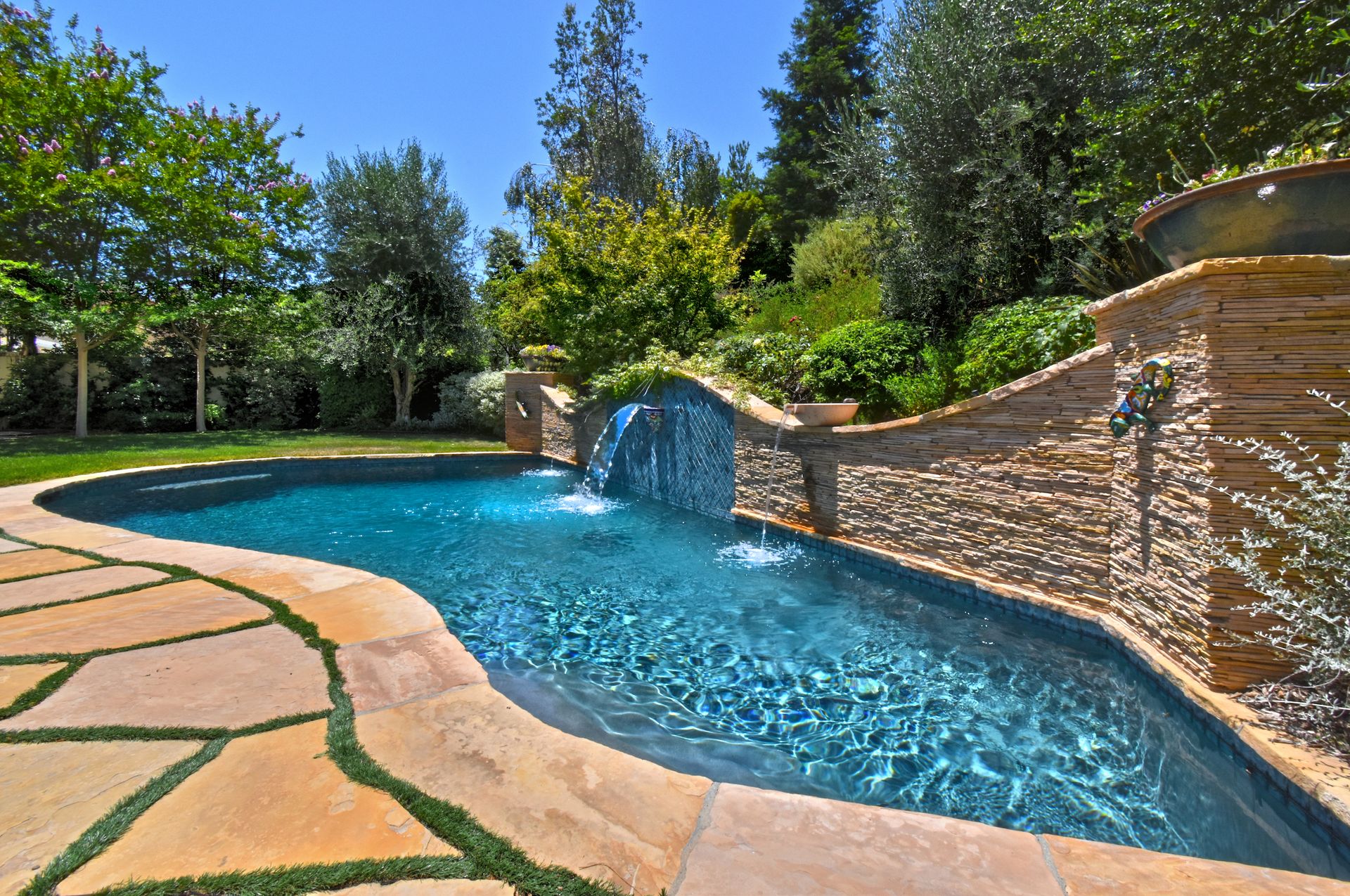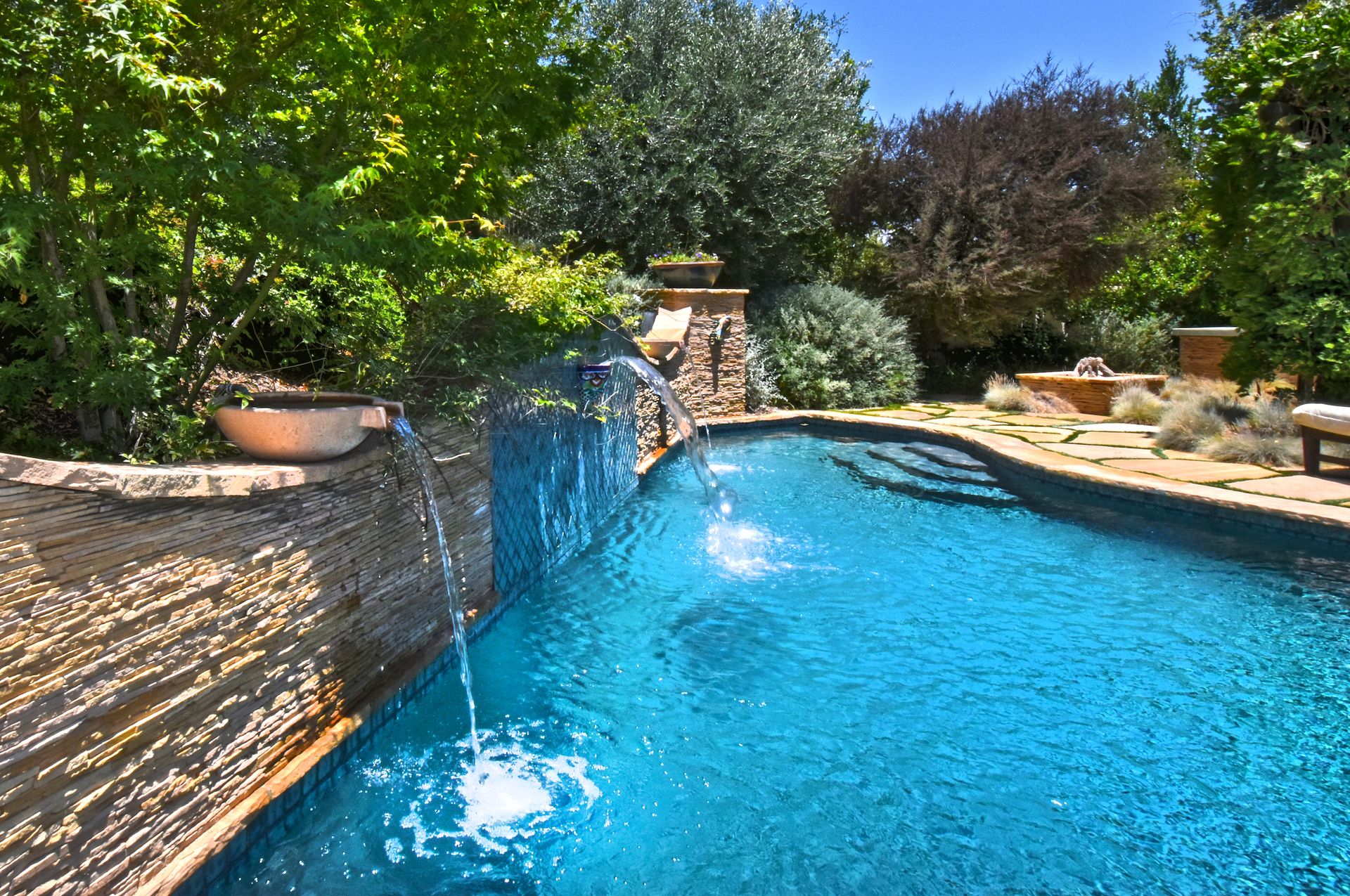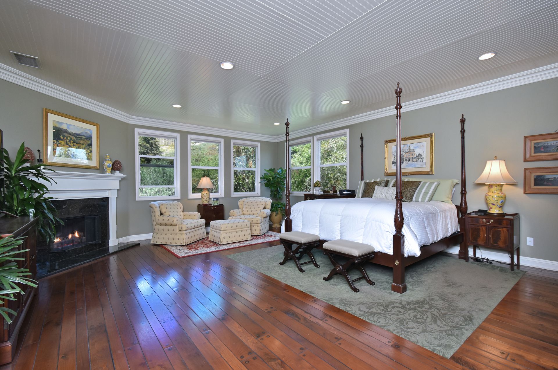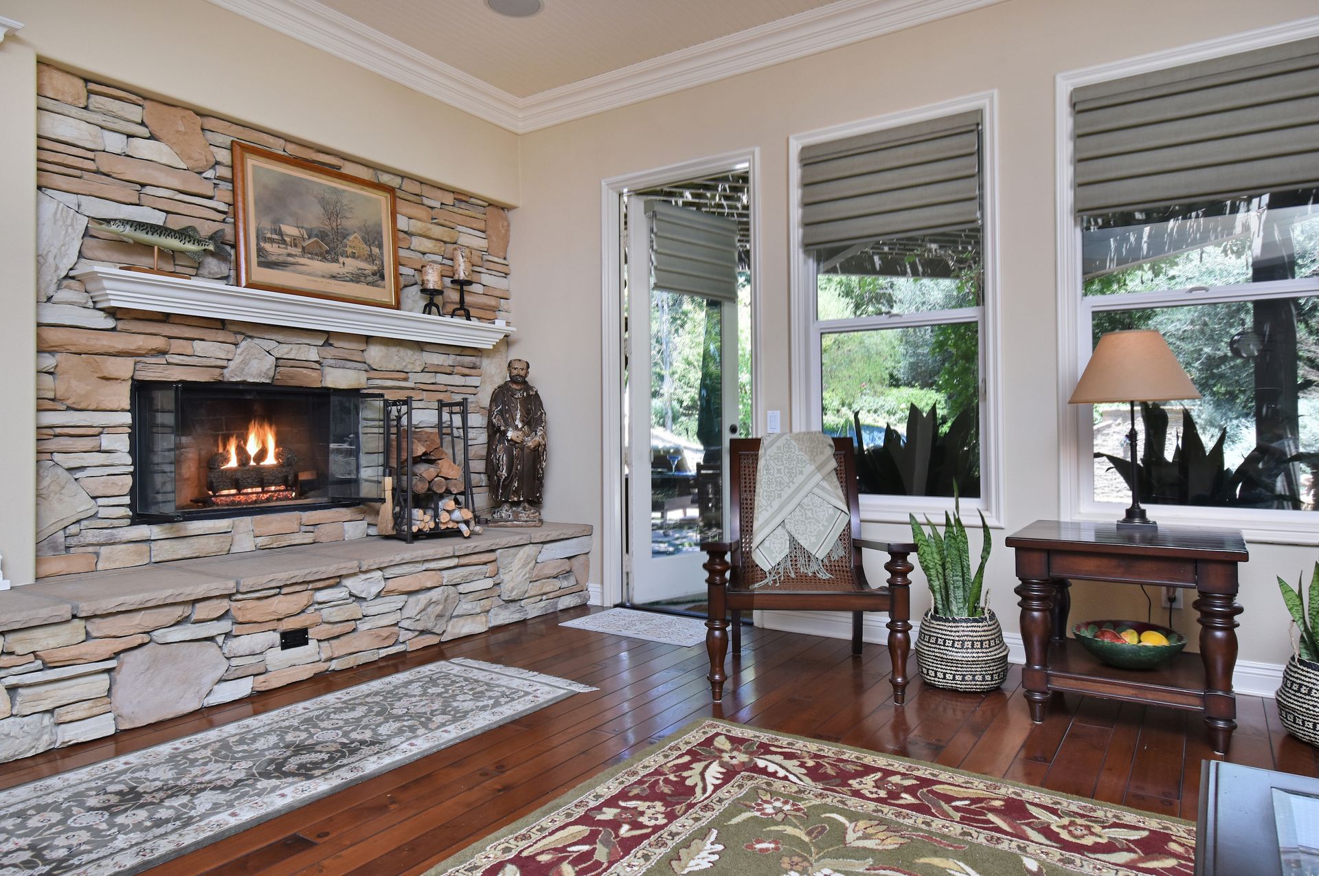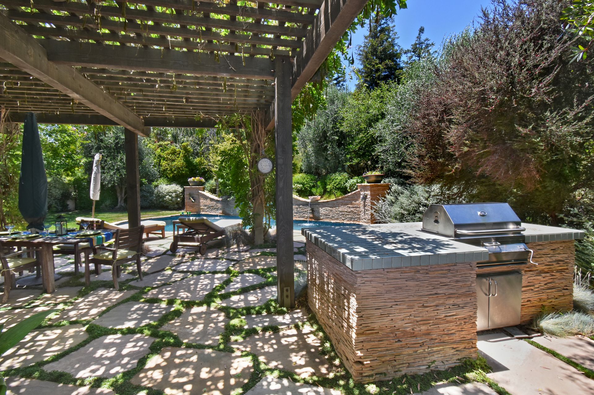 Refined living and elegance in the Oaks of Calabasas. The exceptional design of this Vintage at The Oaks Plan-Four Residence boasts more than 4,700-square feet of open floorplan with a multitude of upgrades and custom finishes, from the fabulous French walnut peg and groove hardwood floors on the lower level, main staircase and in the master suite and bath, to the crown moldings, beadboard and vaulted ceilings and custom drapes and window coverings throughout. The lower level includes a formal dining room with French doors leading onto a stone patio that is ideal for entertaining, a sprawling family room with a built-in surround sound system, a living room, a library/office all with wood-burning fireplaces, a bedroom with full en suite bath and both a powder room and laundry room. An expansive gourmet kitchen offers granite counters, stainless steel Viking Professional appliances, custom pull-out cabinets, a butler’s pantry and a sunlit breakfast nook. The upstairs includes a spacious master suite with a granite fireplace and sitting area, a fabulous master bath with hot tub, granite counters and a shower and a huge closet with custom cabinets. The upstairs also includes three bedrooms with full en suite baths and a library/office. The forest-like backyard provides an abundance of privacy and seclusion amid its many fruit, olive, birch, pear, crape myrtle, sequoia and other trees and includes landscape lighting, a second stone patio, a custom pool with a waterfall, a built-in BBQ with ample counter space and refrigerator, a fire pit and a wisteria-covered trellis for shade and privacy. Additional features include an expansive four-car garage with custom built-in cabinets and storage racks, a porte-cochère and a fountain. All this within the beautifully maintained and guard-gated Oaks community, with an outstanding recreation center in the Las Virgenes School District.
