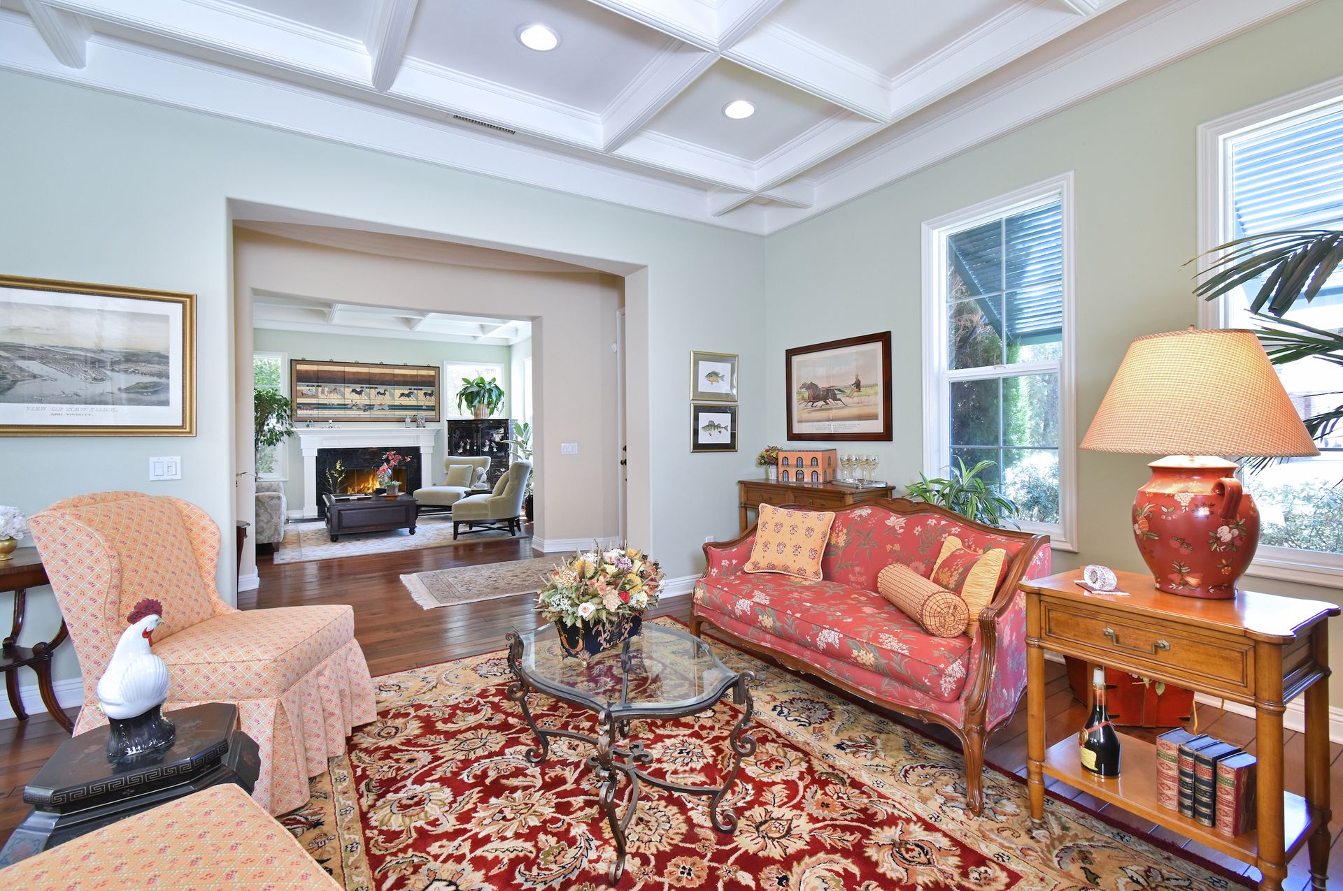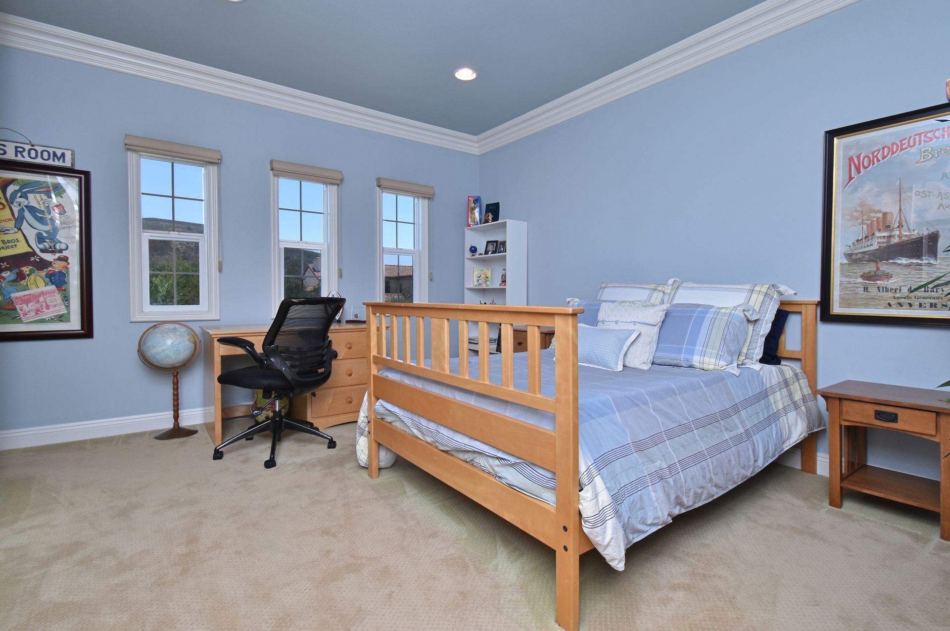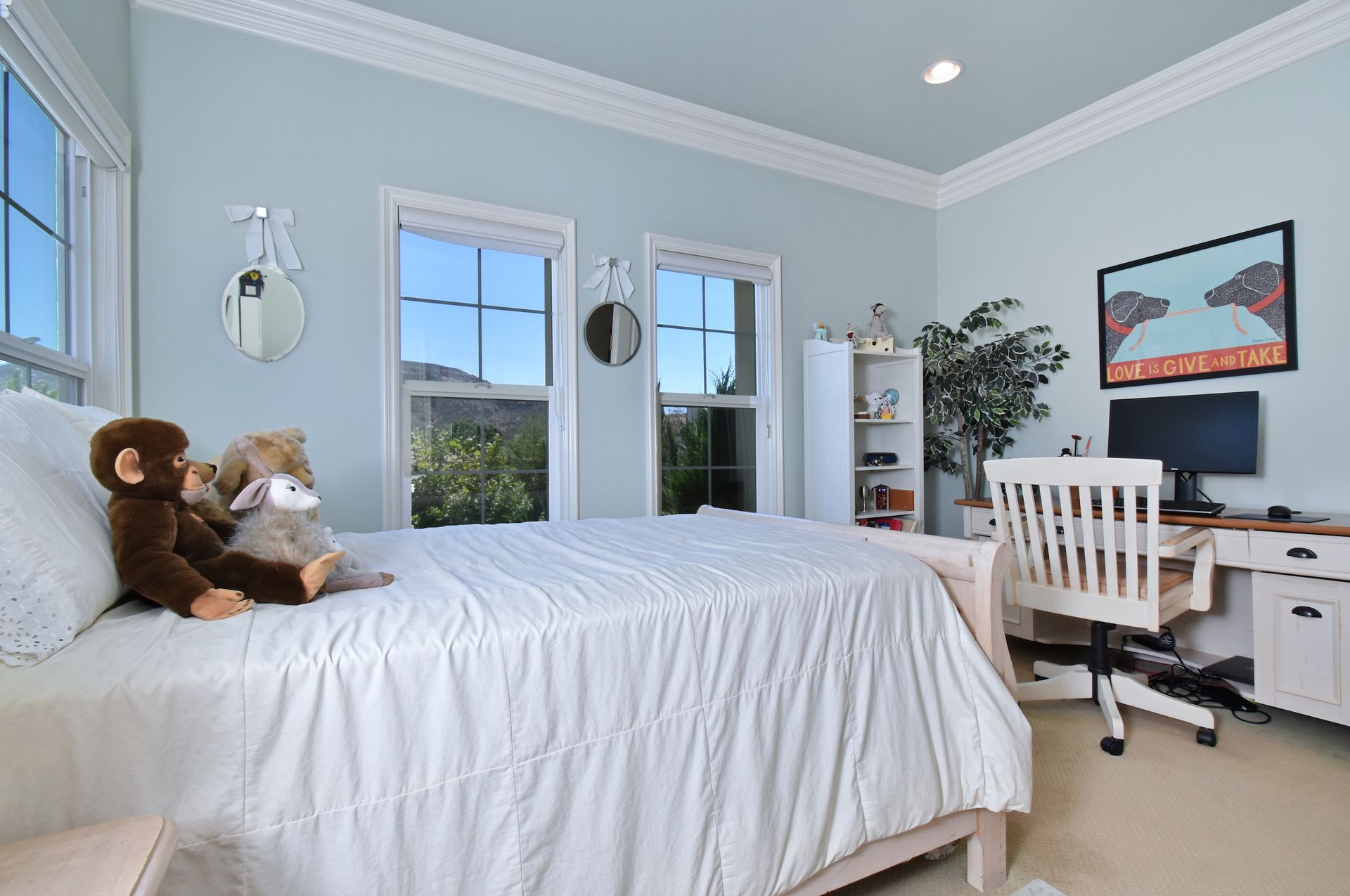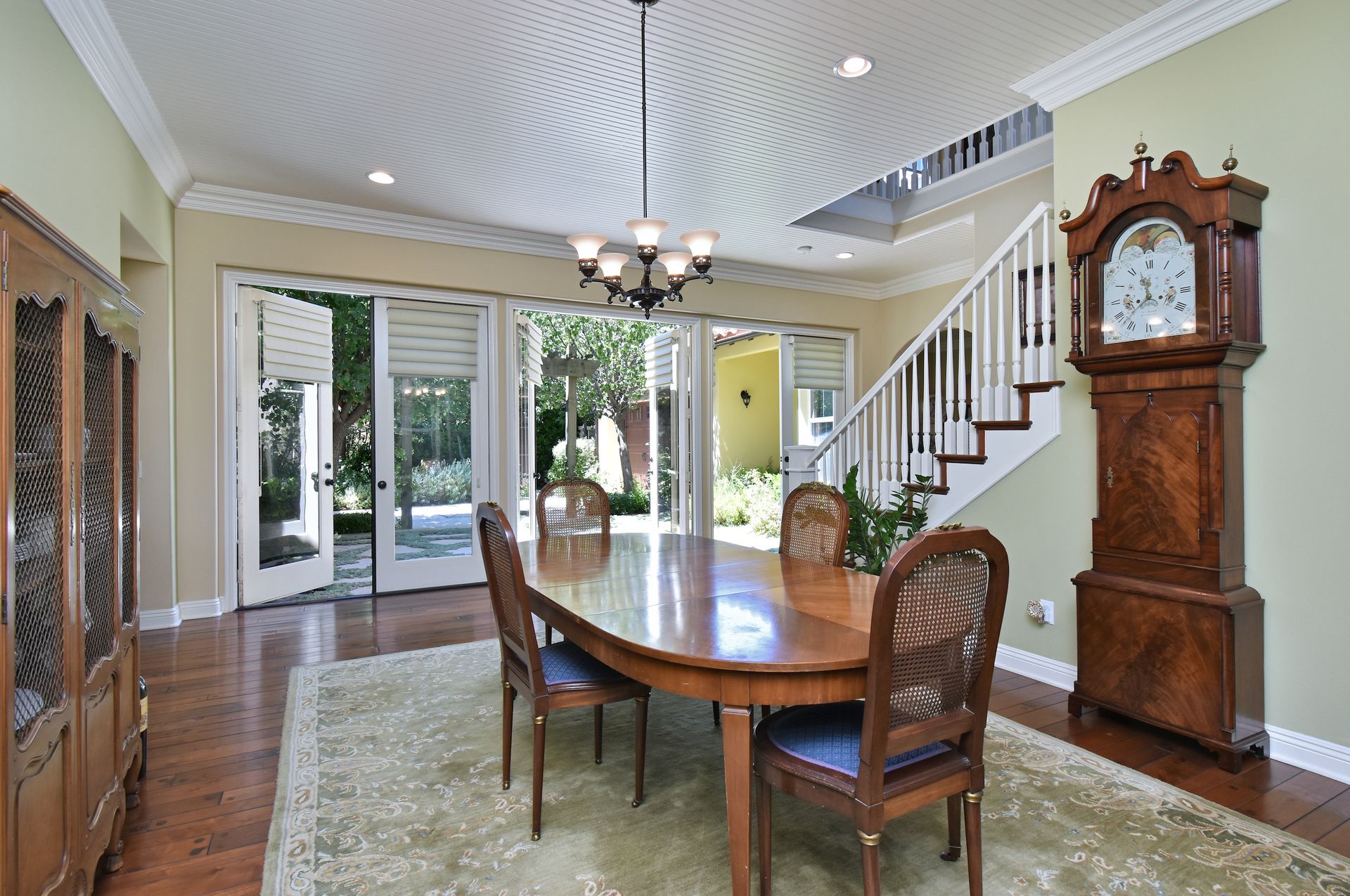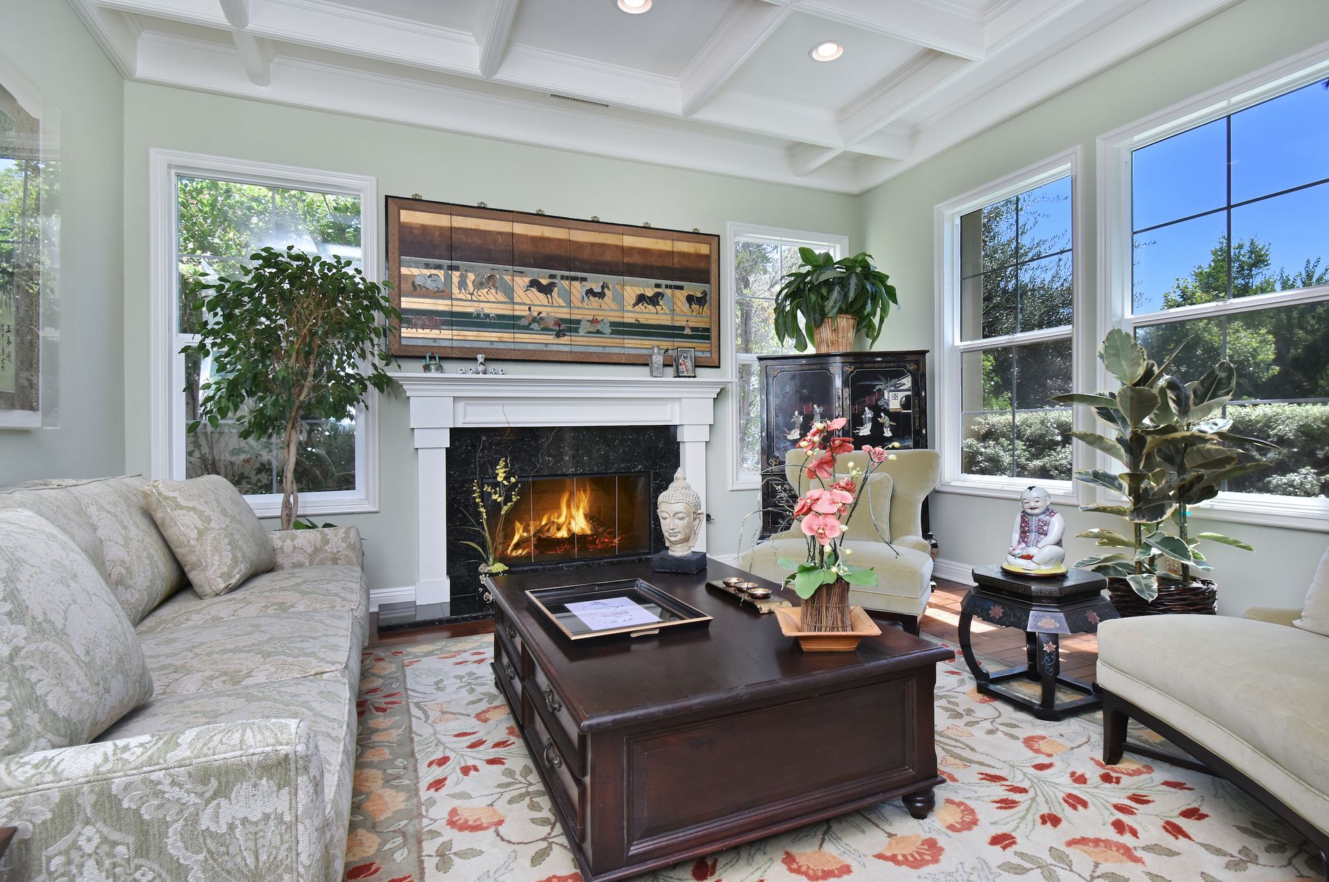 Refined living and elegance in the Oaks of Calabasas. The exceptional design of this Vintage at The Oaks Plan-Four Residence boasts more than 4,700-square feet of open floorplan with a multitude of upgrades and custom finishes, from the fabulous French walnut peg and groove hardwood floors on the lower level, main staircase and in the master suite and bath, to the crown moldings, beadboard and vaulted ceilings and custom drapes and window coverings throughout. The lower level includes a formal dining room with French doors leading onto a stone patio that is ideal for entertaining, a sprawling family room with a built-in surround sound system, a living room, a library/office all with wood-burning fireplaces, a bedroom with full en suite bath and both a powder room and laundry room. An expansive gourmet kitchen offers granite counters, stainless steel Viking Professional appliances, custom pull-out cabinets, a butler’s pantry and a sunlit breakfast nook. The upstairs includes a spacious master suite with a granite fireplace and sitting area, a fabulous master bath with hot tub, granite counters and a shower and a huge closet with custom cabinets. The upstairs also includes three bedrooms with full en suite baths and a library/office. The forest-like backyard provides an abundance of privacy and seclusion amid its many fruit, olive, birch, pear, crape myrtle, sequoia and other trees and includes landscape lighting, a second stone patio, a custom pool with a waterfall, a built-in BBQ with ample counter space and refrigerator, a fire pit and a wisteria-covered trellis for shade and privacy. Additional features include an expansive four-car garage with custom built-in cabinets and storage racks, a porte-cochère and a fountain. All this within the beautifully maintained and guard-gated Oaks community, with an outstanding recreation center in the Las Virgenes School District.