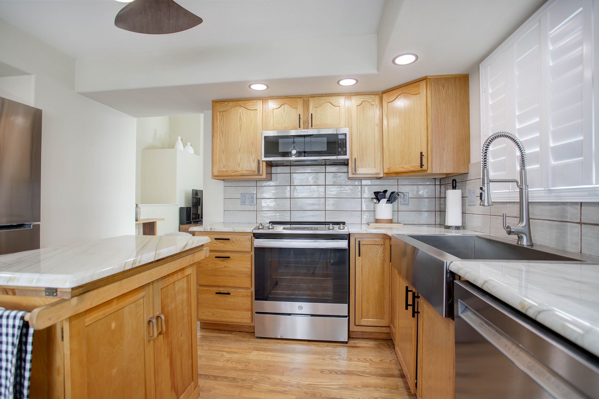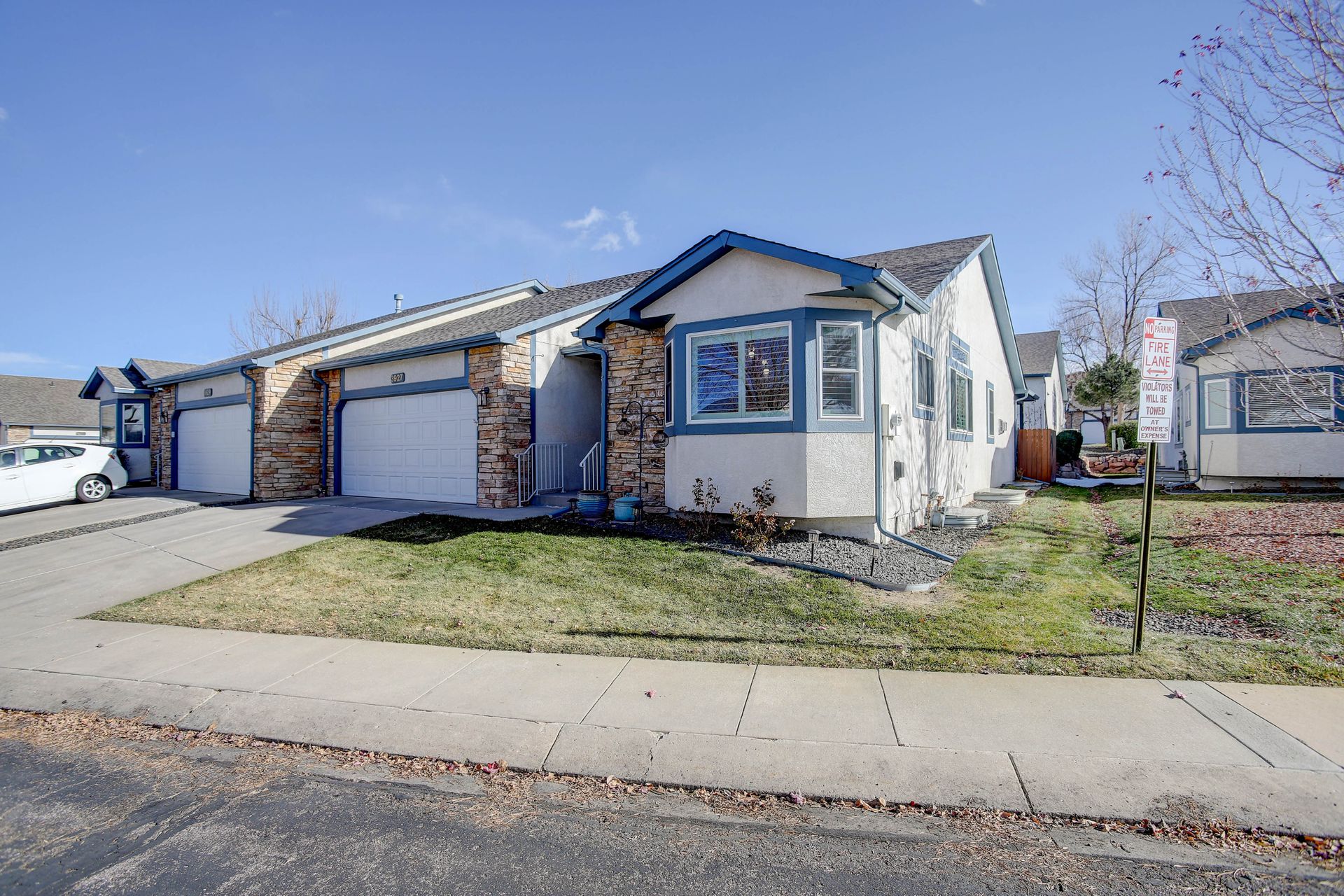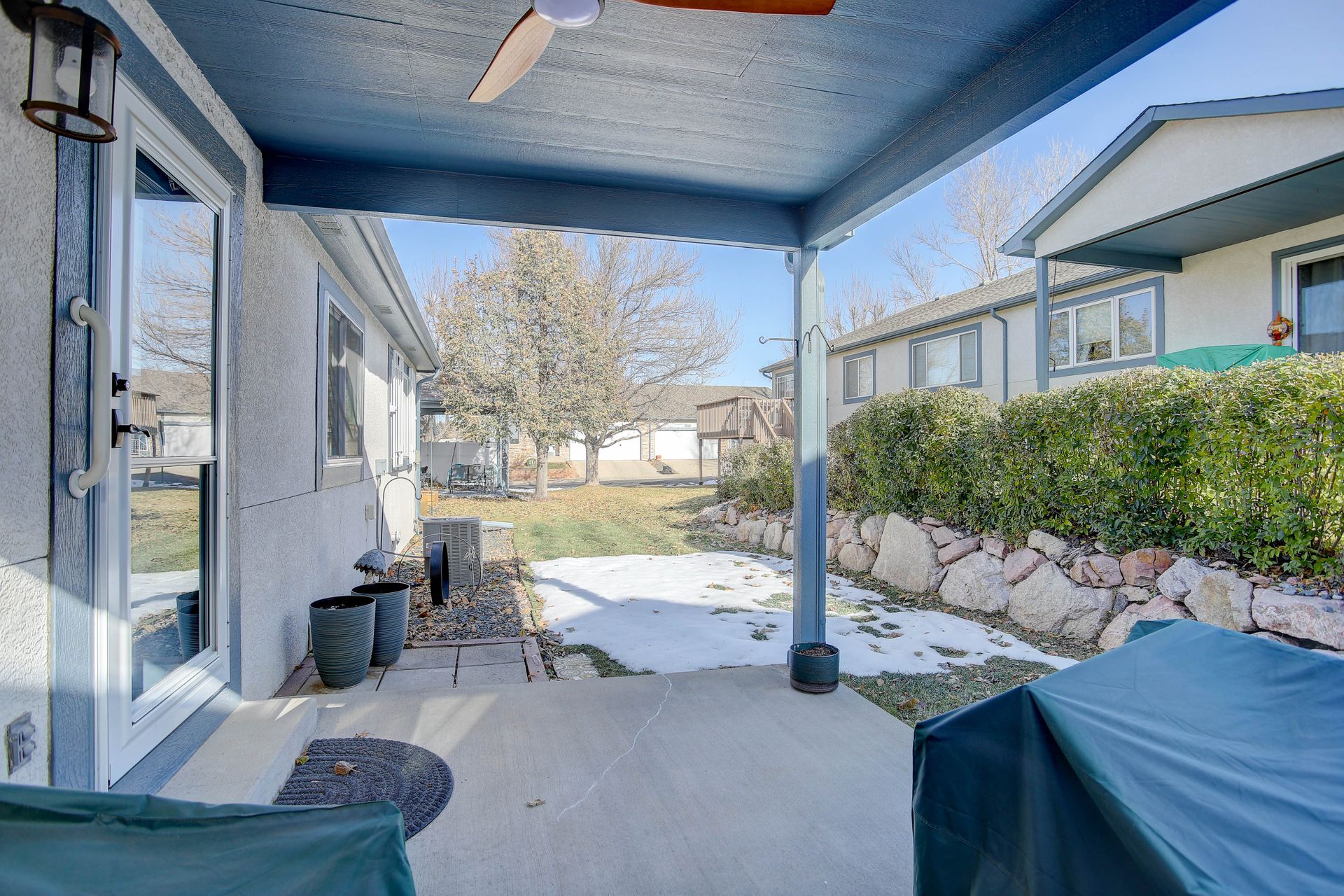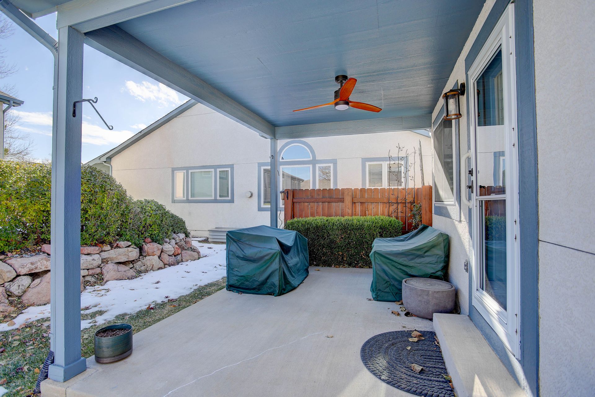 Beautifully updated, lovingly cared for townhome. This home has been excellently maintained, has plantation shutters, custom closet doors, designer lighting and plumbing fixtures throughout and features...spacious living/dining room with vaulted ceilings, and fire glass gas FP with pre-wired TV mounting area above...sunny southwest facing kitchen with ample quality oak cabinetry (some with reeded glass doors), pantry cabinet with roll-out shelving, quartzite countertops, 4"x12" subway backsplash, newer SS appliances including smooth top range and Bosch refrigerator, SS single bowl apron sink and pull-down faucet, island, custom corner wine storage shelf, wood floors and breakfast nook with bay window overlooking the front yard...tucked away office with vaulted ceiling, wood floors, storage closet and door out to the back patio...13'x15' primary bedroom with coffered ceilings, overlook to the backyard area and ensuite 5-pc bath with freestanding soaking tub, separate vanities with granite counters, newer shower surround and double walk-in closets...and 2nd bedroom across from the updated 3/4 hall bath with integrated-sink countertop, custom shower door, 12"x12" tile floors and connecting laundry room with storage cabinets. Downstairs, you'll enjoy the...bright, south-facing family room with wet bar...spacious 3rd bedroom with desk/reading area and oversized full wall closet...completely updated full hall bath...and 532sqft of unfinished storage/workshop! Outside, you'll enjoy the...mature landscaping of the well-maintained grounds...and morning sun and afternoon shade on the serene, partially-screened covered back patio. Easy access to Austin Bluffs and Academy...central AC...and stair chair lift included if you want it, too!