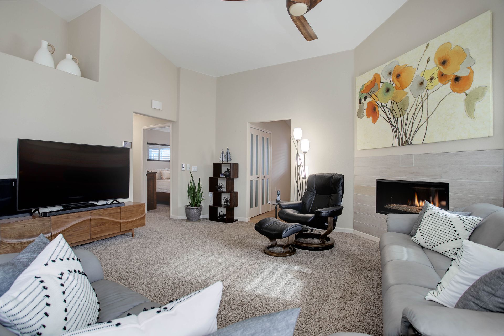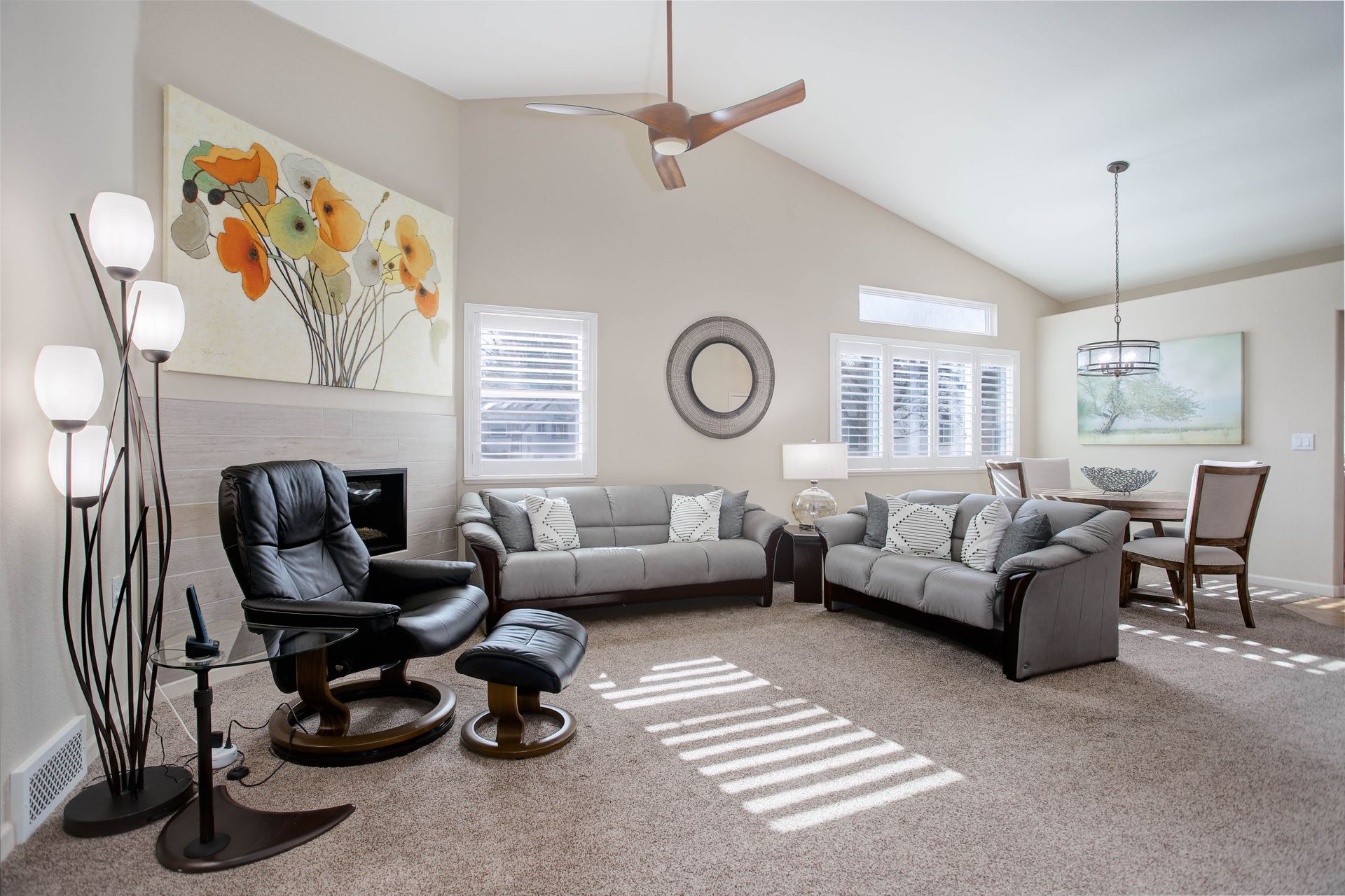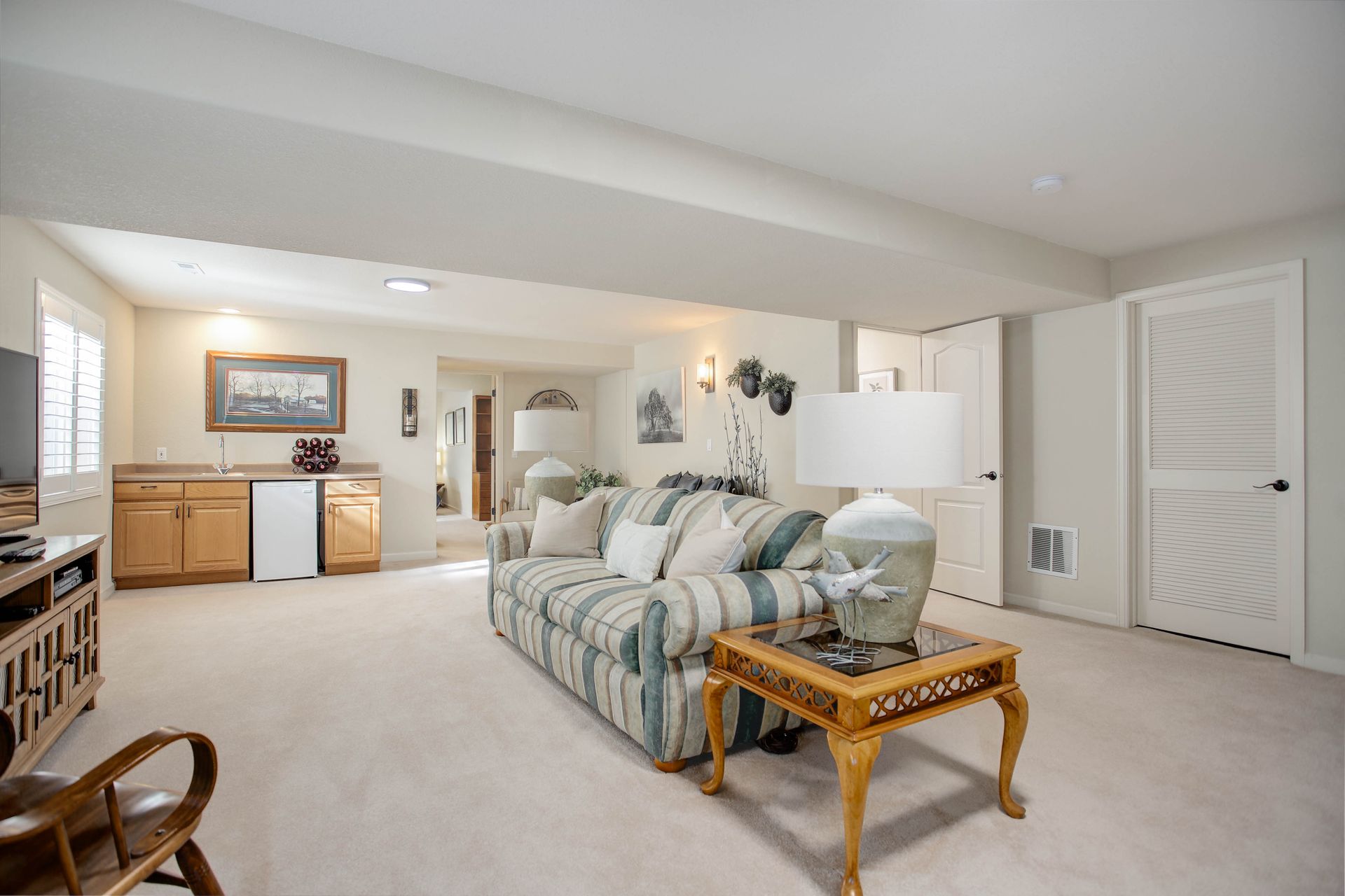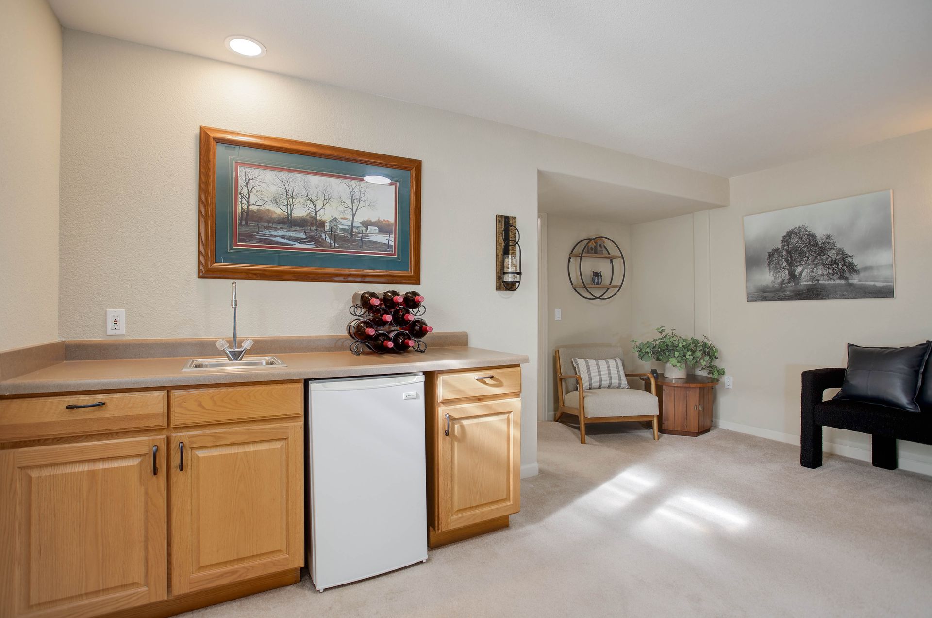 Beautifully updated, lovingly cared for townhome. This home has been excellently maintained, has plantation shutters, custom closet doors, designer lighting and plumbing fixtures throughout and features...spacious living/dining room with vaulted ceilings, and fire glass gas FP with pre-wired TV mounting area above...sunny southwest facing kitchen with ample quality oak cabinetry (some with reeded glass doors), pantry cabinet with roll-out shelving, quartzite countertops, 4"x12" subway backsplash, newer SS appliances including smooth top range and Bosch refrigerator, SS single bowl apron sink and pull-down faucet, island, custom corner wine storage shelf, wood floors and breakfast nook with bay window overlooking the front yard...tucked away office with vaulted ceiling, wood floors, storage closet and door out to the back patio...13'x15' primary bedroom with coffered ceilings, overlook to the backyard area and ensuite 5-pc bath with freestanding soaking tub, separate vanities with granite counters, newer shower surround and double walk-in closets...and 2nd bedroom across from the updated 3/4 hall bath with integrated-sink countertop, custom shower door, 12"x12" tile floors and connecting laundry room with storage cabinets. Downstairs, you'll enjoy the...bright, south-facing family room with wet bar...spacious 3rd bedroom with desk/reading area and oversized full wall closet...completely updated full hall bath...and 532sqft of unfinished storage/workshop! Outside, you'll enjoy the...mature landscaping of the well-maintained grounds...and morning sun and afternoon shade on the serene, partially-screened covered back patio. Easy access to Austin Bluffs and Academy...central AC...and stair chair lift included if you want it, too!