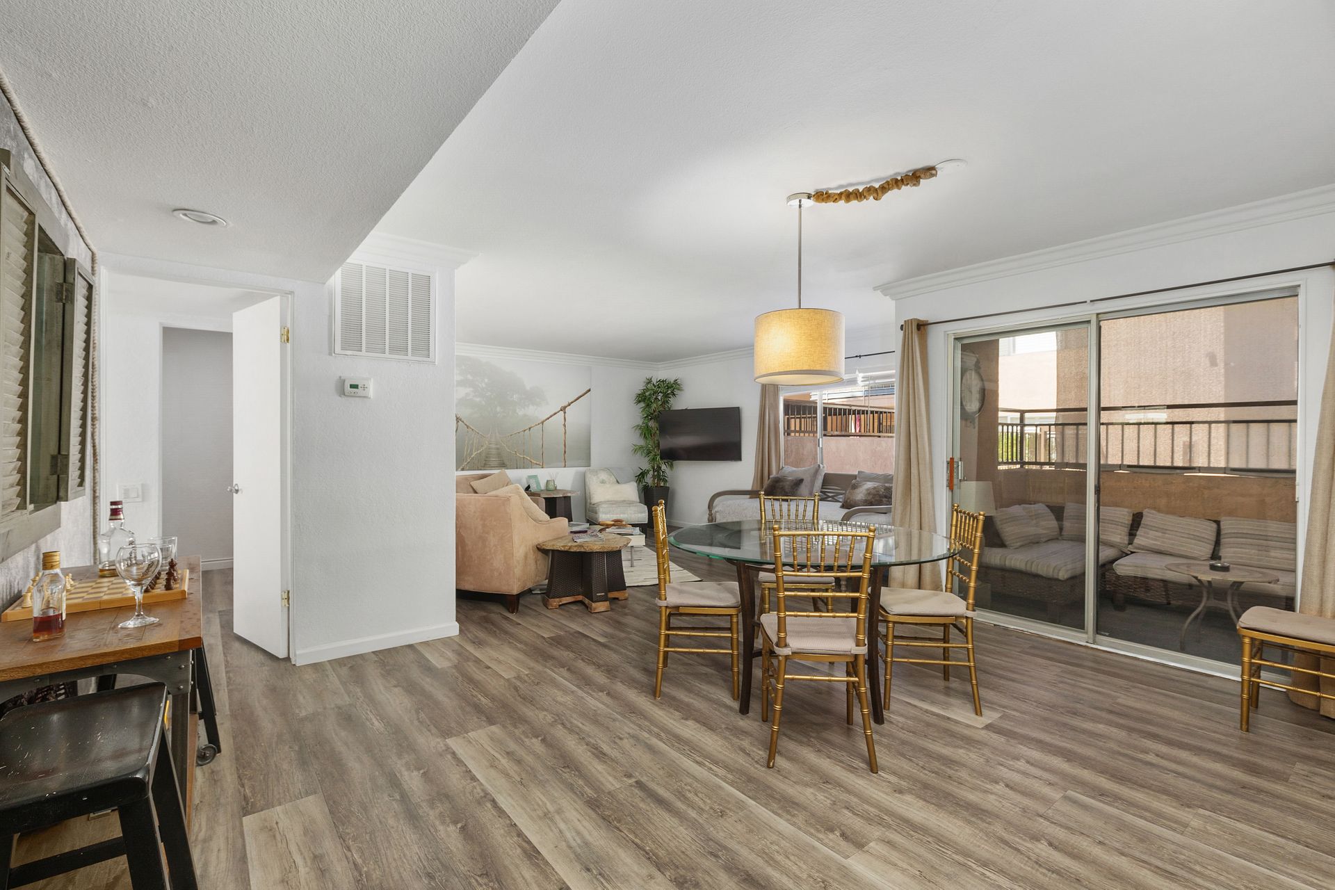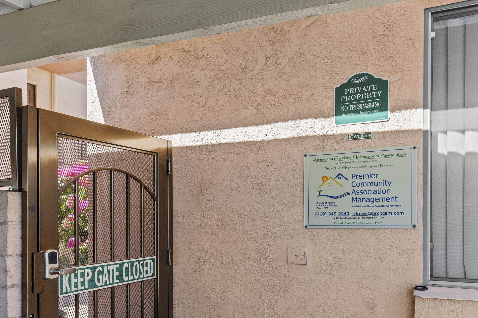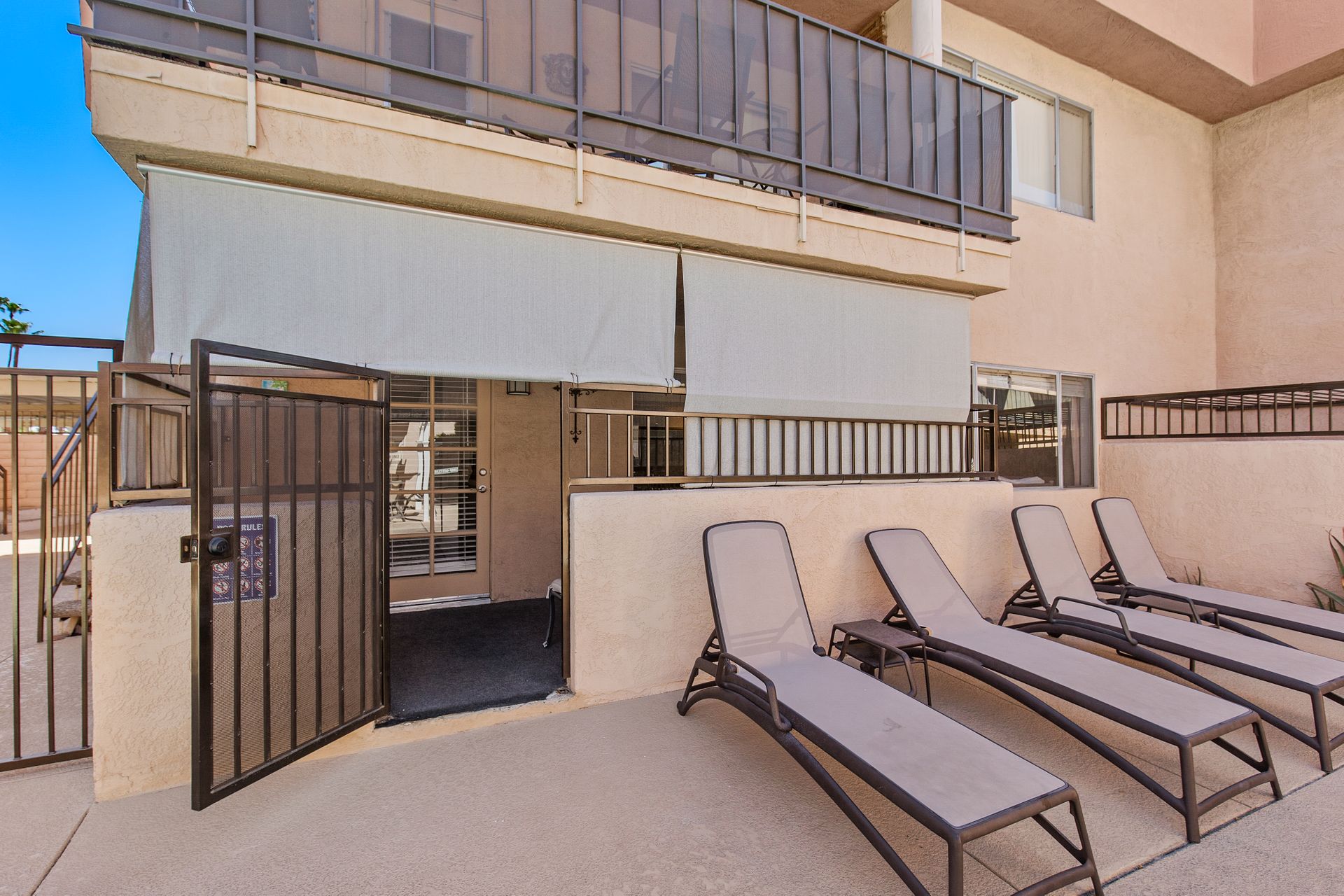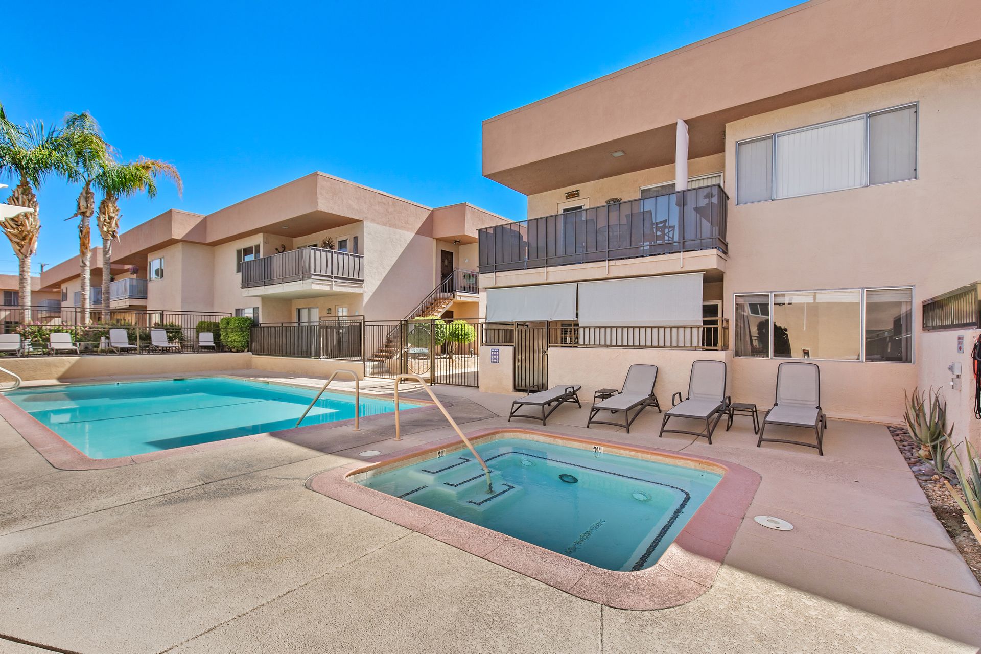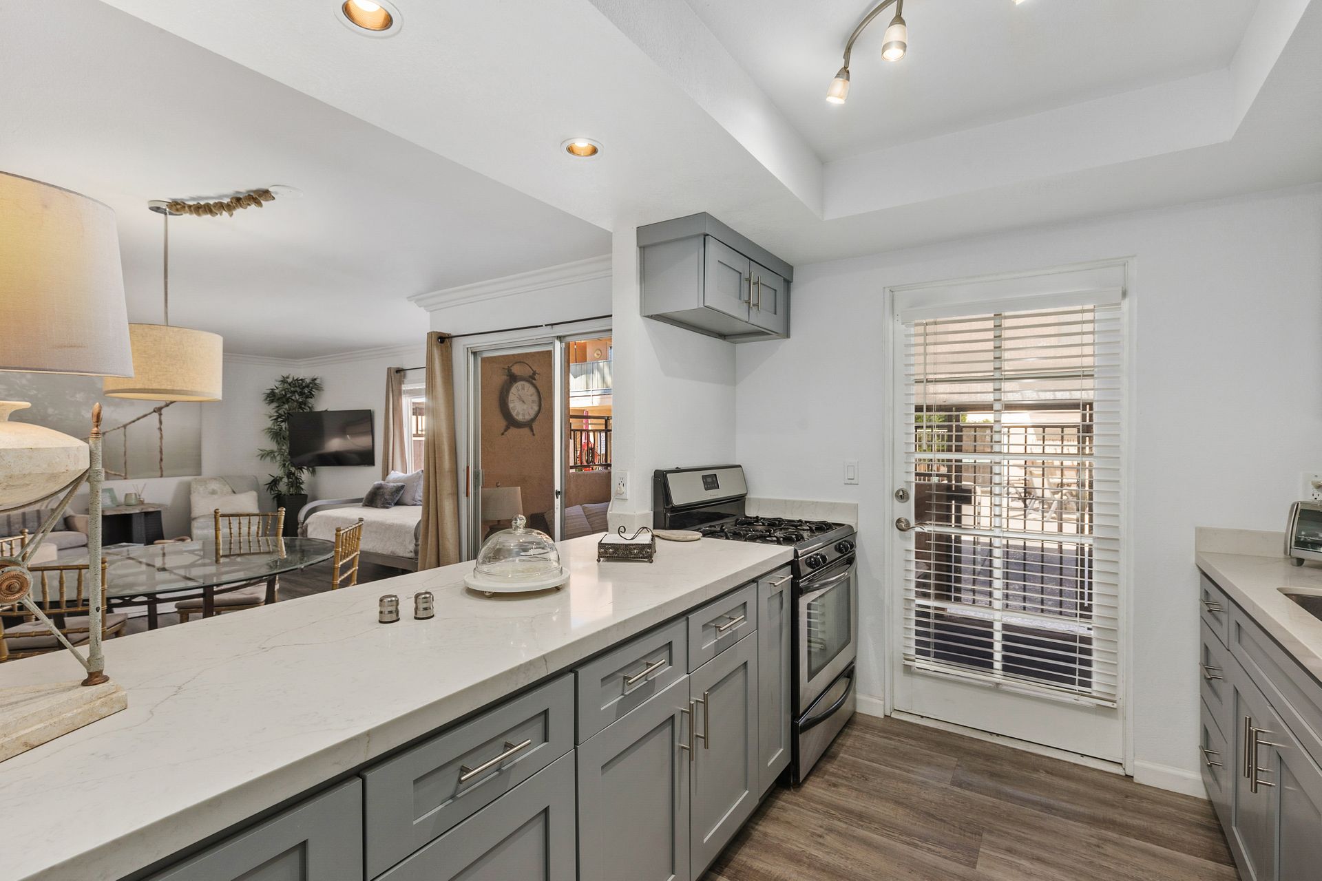 Welcome to Americana Gardens Delight, the property features direct access to the community pool from the private patio, this is the only unit with direct access in the complex, providing a convenient and refreshing outdoor oasis. This charming downstairs end unit has two-bedroom, two-bathroom home offers approximately 1,150 square feet of living space. The low homeowners association (HOA) fees cover essential services such as roof maintenance, building upkeep, gas, water, and trash removal, making this home a low-maintenance option. The kitchen is designed for the discerning chef, boasting quartz countertops, a gas stove, and stainless steel appliances. The open floor plan seamlessly integrates the kitchen with a dining area and a spacious living room views of the patio and pool for a relaxing atmosphere. Residents can enjoy the convenience of in-unit side-by-side washer and dryer hookups. This makes for a wonderful owners unit and or part, full time renters, 30 day minimum rental per HOA. Americana Gardens is centrally located, this is a must see!