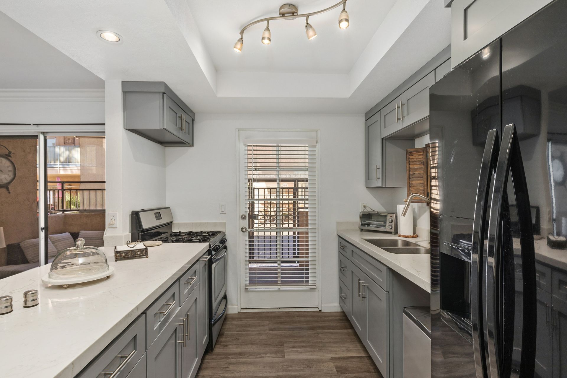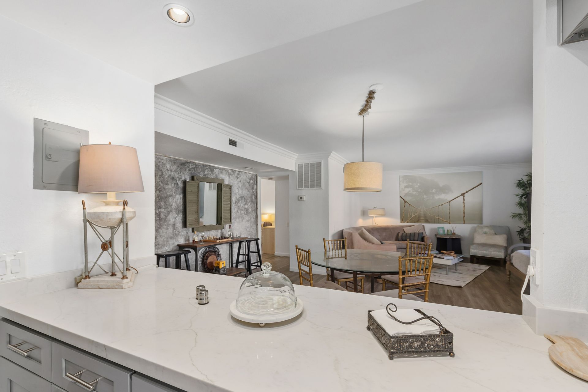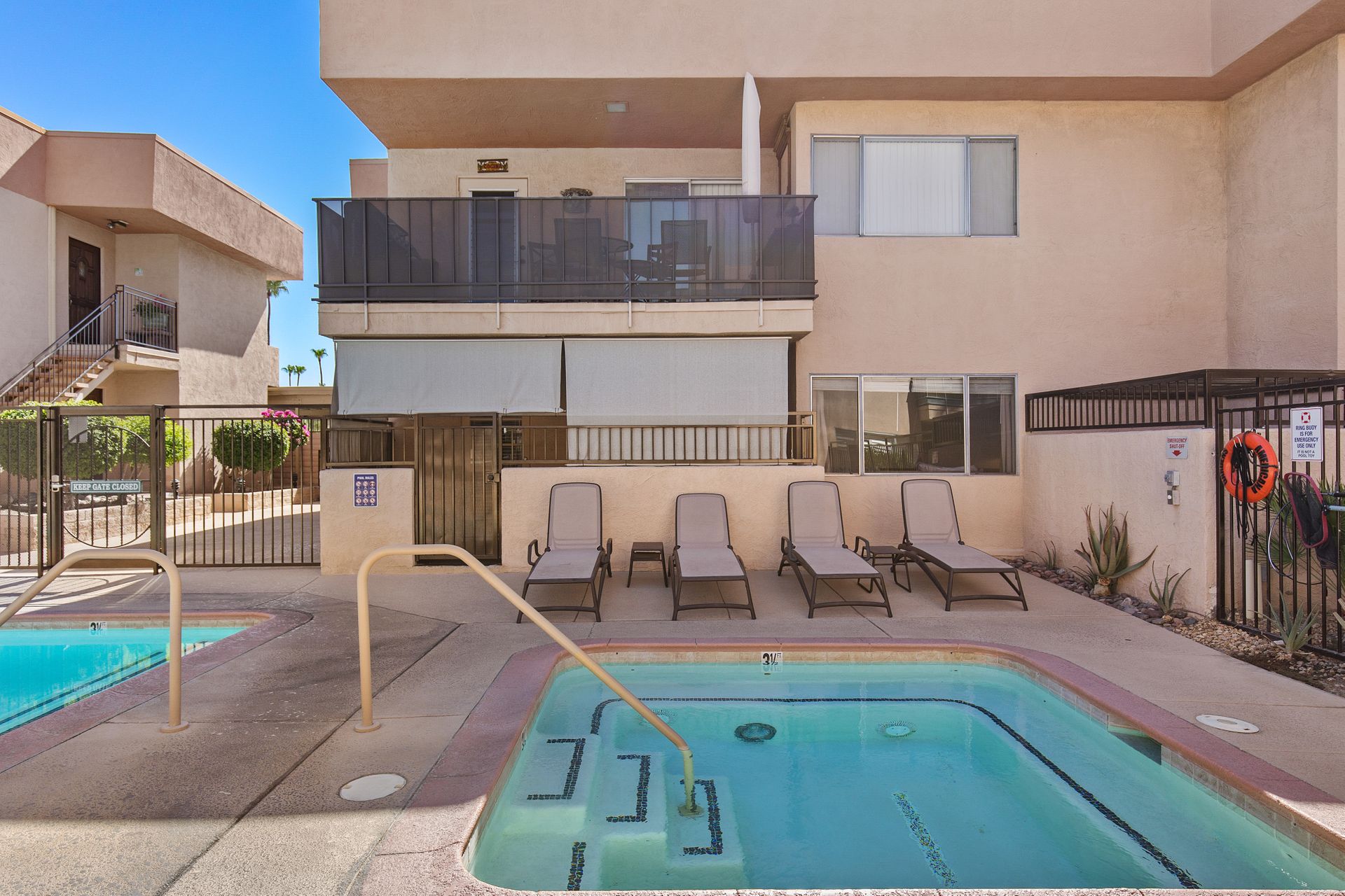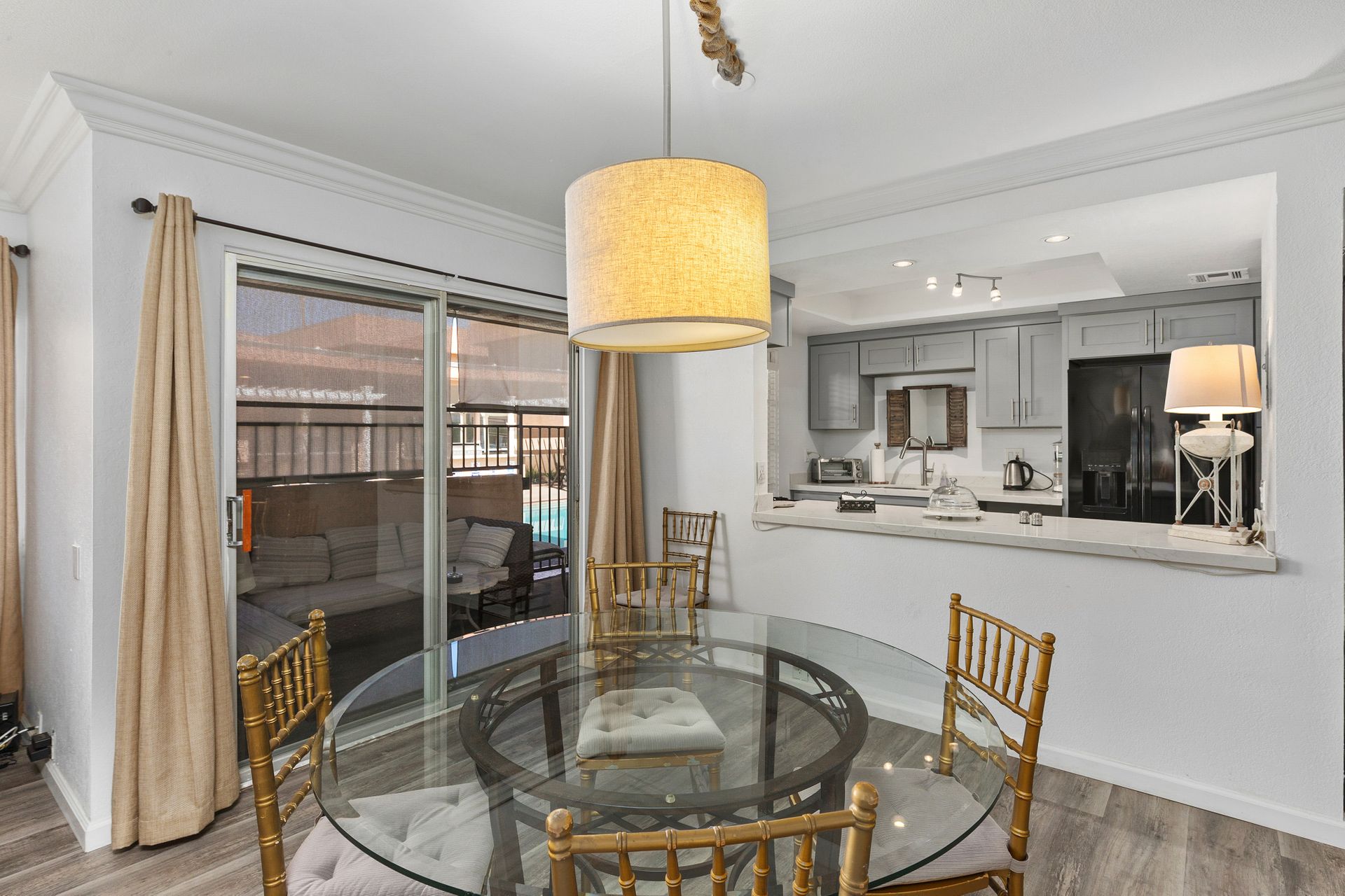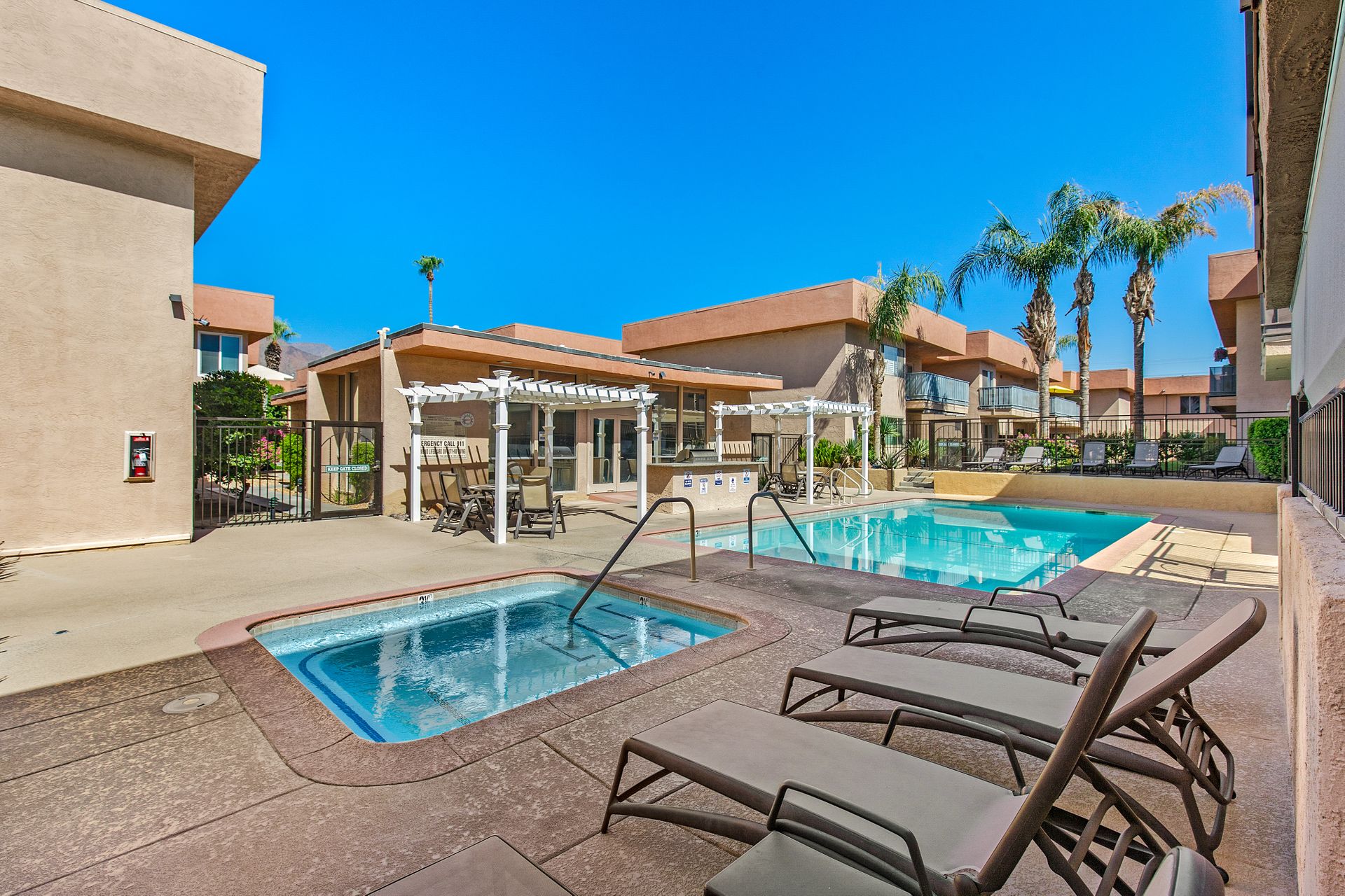 Welcome to Americana Gardens Delight, the property features direct access to the community pool from the private patio, this is the only unit with direct access in the complex, providing a convenient and refreshing outdoor oasis. This charming downstairs end unit has two-bedroom, two-bathroom home offers approximately 1,150 square feet of living space. The low homeowners association (HOA) fees cover essential services such as roof maintenance, building upkeep, gas, water, and trash removal, making this home a low-maintenance option. The kitchen is designed for the discerning chef, boasting quartz countertops, a gas stove, and stainless steel appliances. The open floor plan seamlessly integrates the kitchen with a dining area and a spacious living room views of the patio and pool for a relaxing atmosphere. Residents can enjoy the convenience of in-unit side-by-side washer and dryer hookups. This makes for a wonderful owners unit and or part, full time renters, 30 day minimum rental per HOA. Americana Gardens is centrally located, this is a must see!