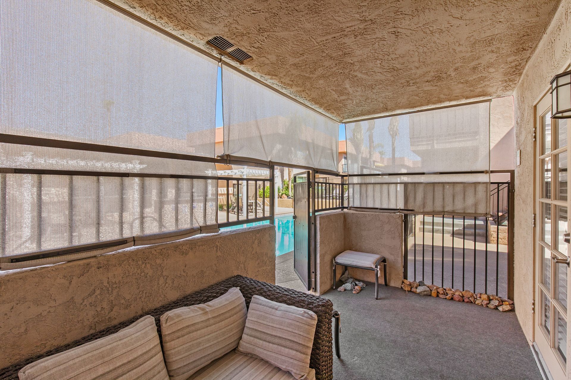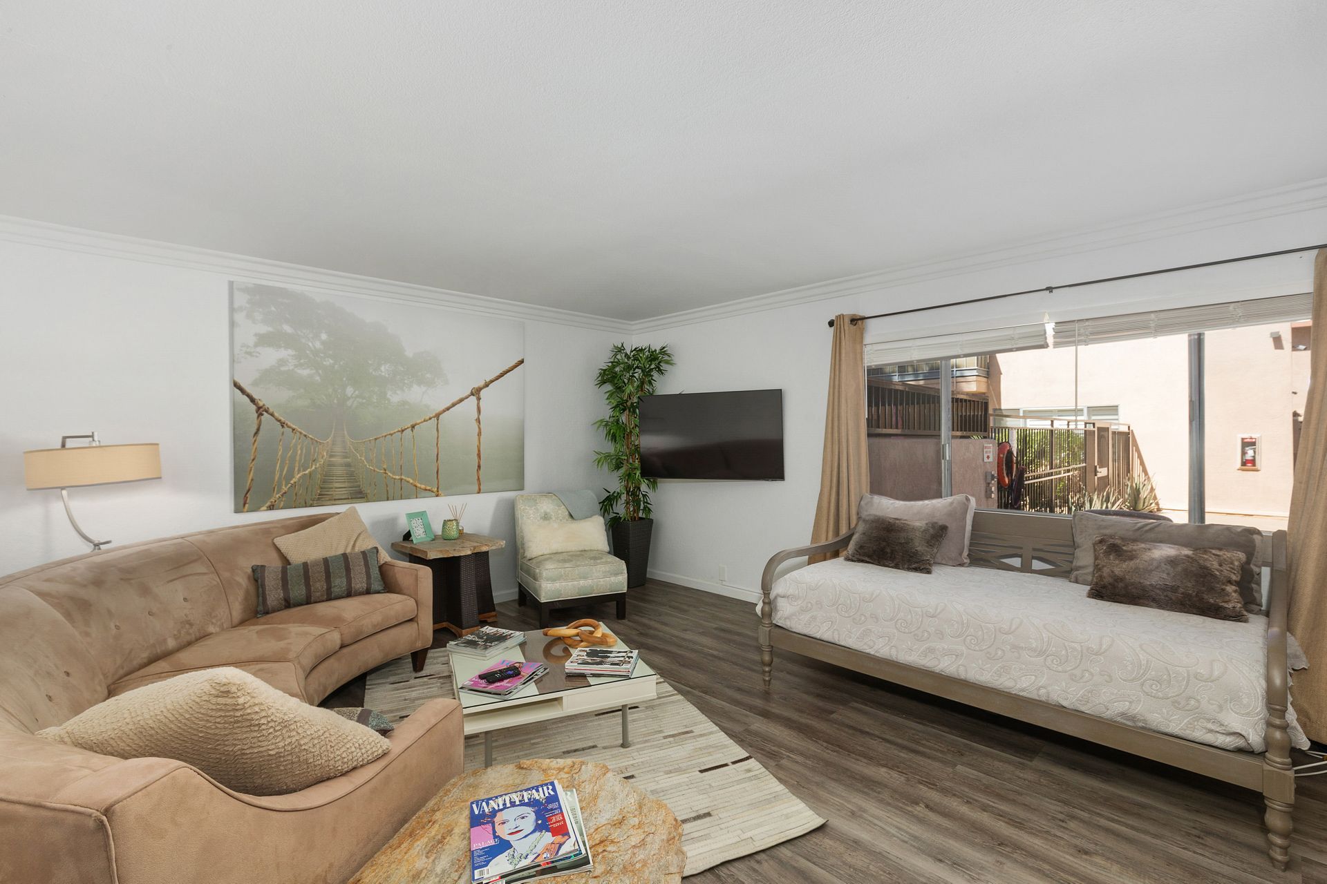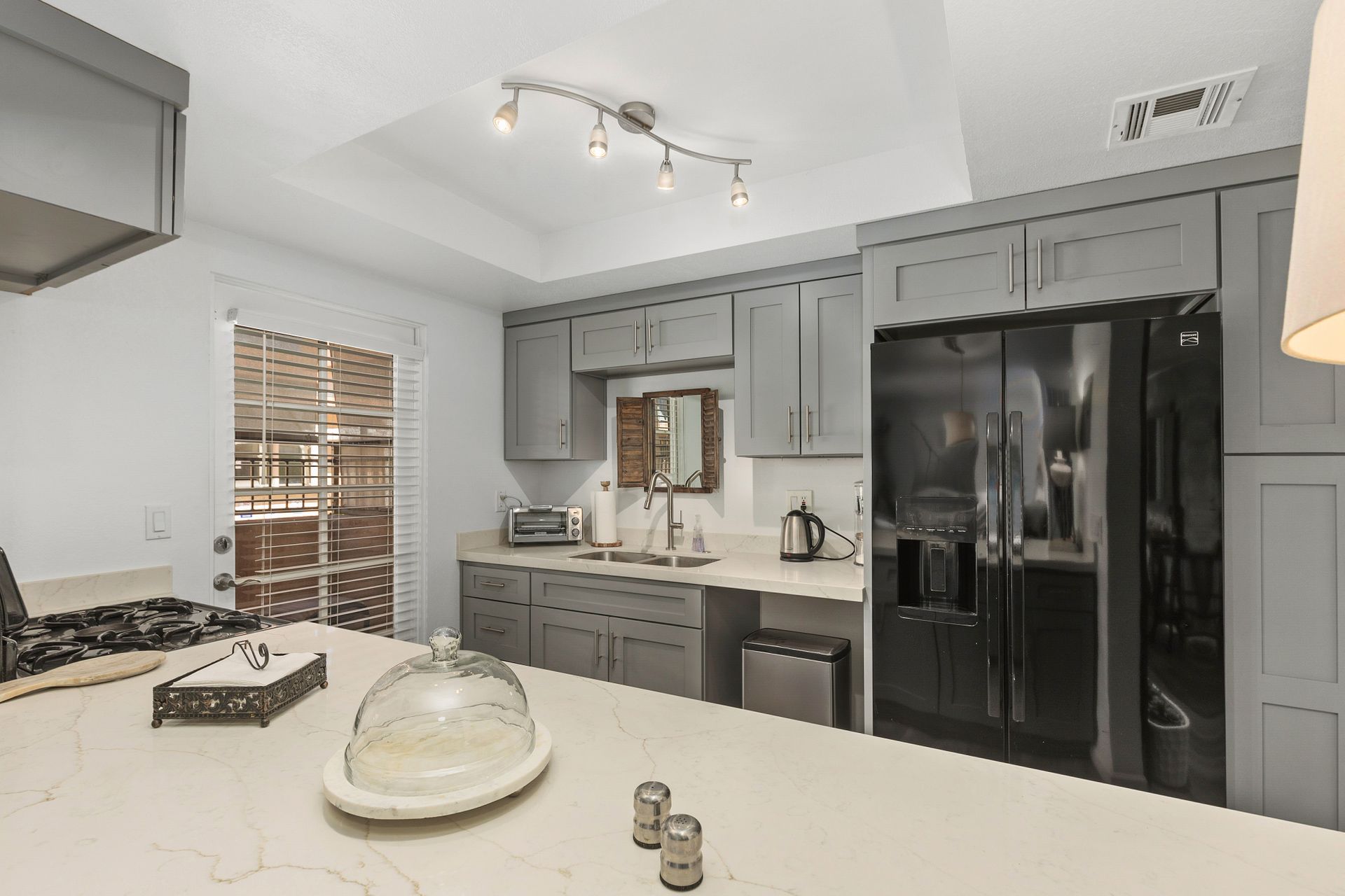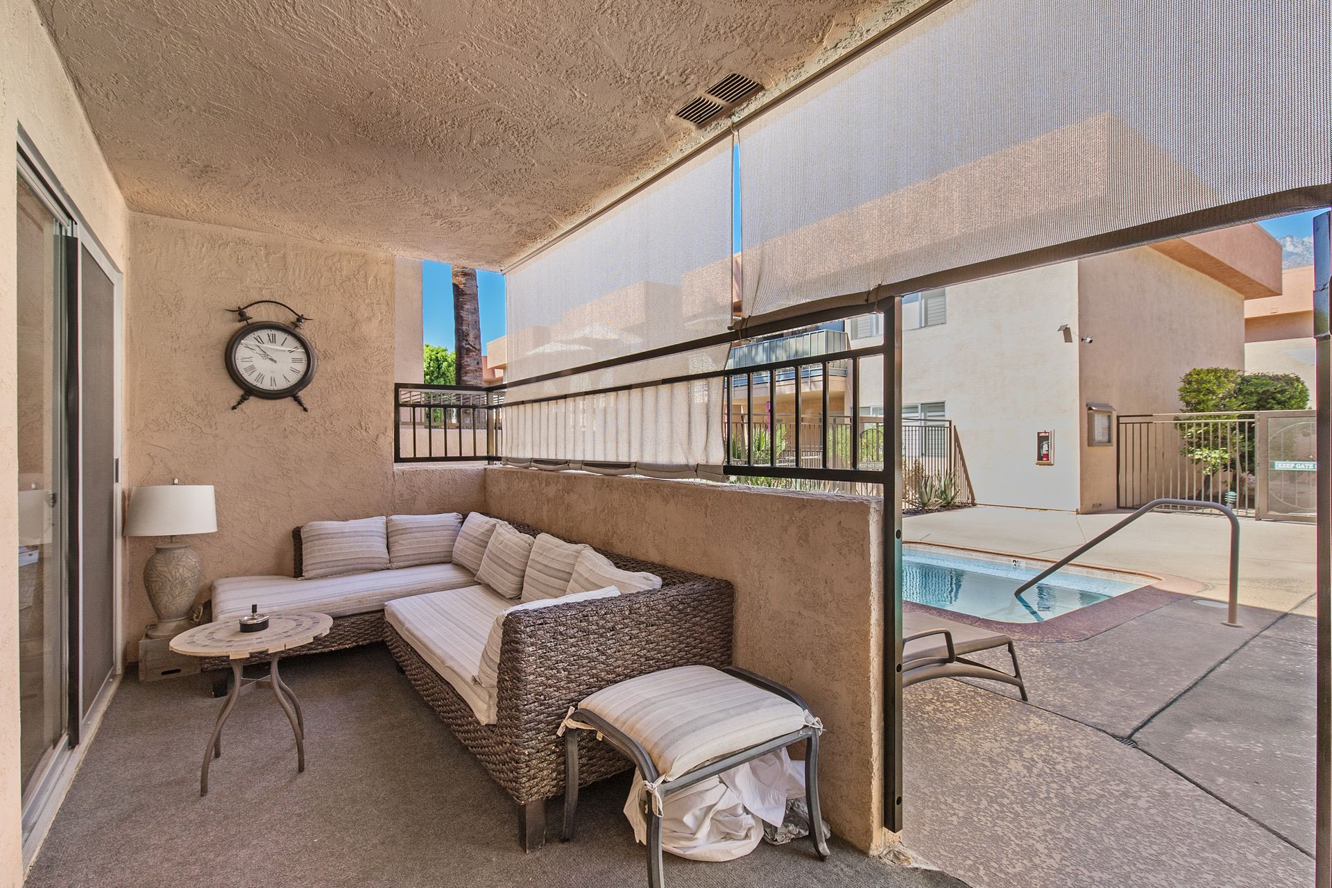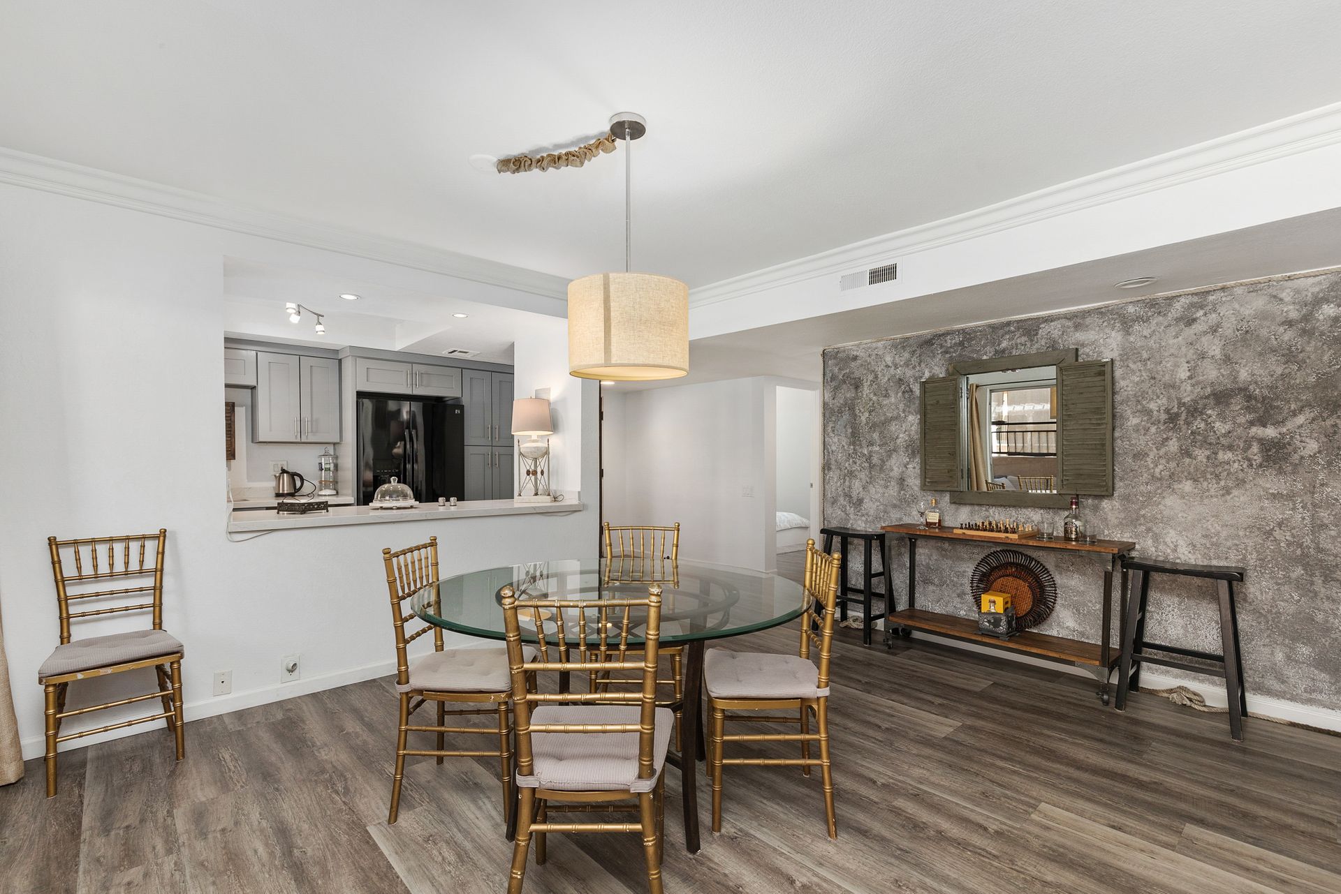 Welcome to Americana Gardens Delight, the property features direct access to the community pool from the private patio, this is the only unit with direct access in the complex, providing a convenient and refreshing outdoor oasis. This charming downstairs end unit has two-bedroom, two-bathroom home offers approximately 1,150 square feet of living space. The low homeowners association (HOA) fees cover essential services such as roof maintenance, building upkeep, gas, water, and trash removal, making this home a low-maintenance option. The kitchen is designed for the discerning chef, boasting quartz countertops, a gas stove, and stainless steel appliances. The open floor plan seamlessly integrates the kitchen with a dining area and a spacious living room views of the patio and pool for a relaxing atmosphere. Residents can enjoy the convenience of in-unit side-by-side washer and dryer hookups. This makes for a wonderful owners unit and or part, full time renters, 30 day minimum rental per HOA. Americana Gardens is centrally located, this is a must see!