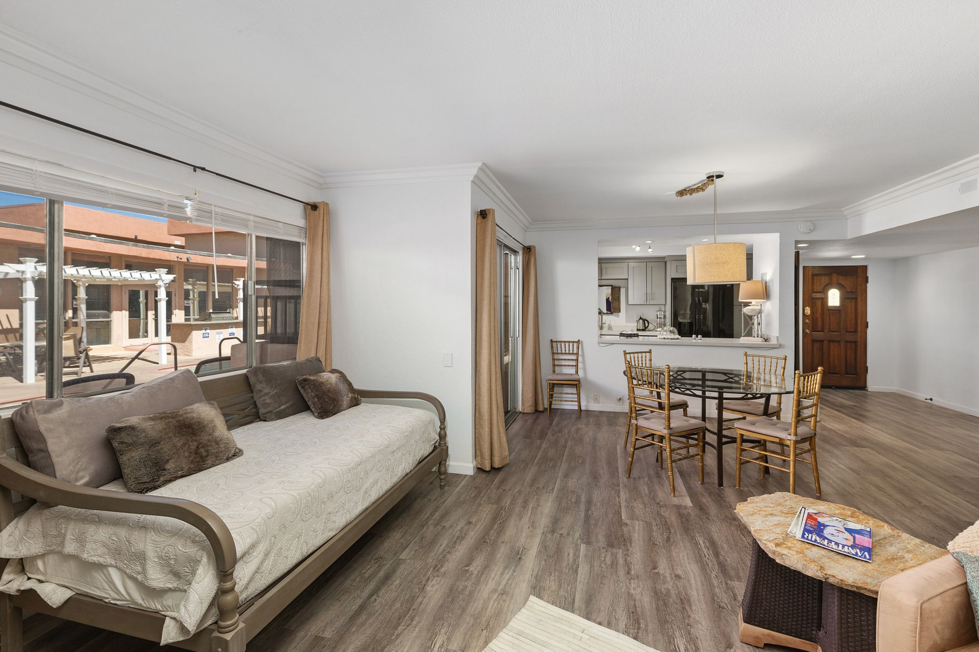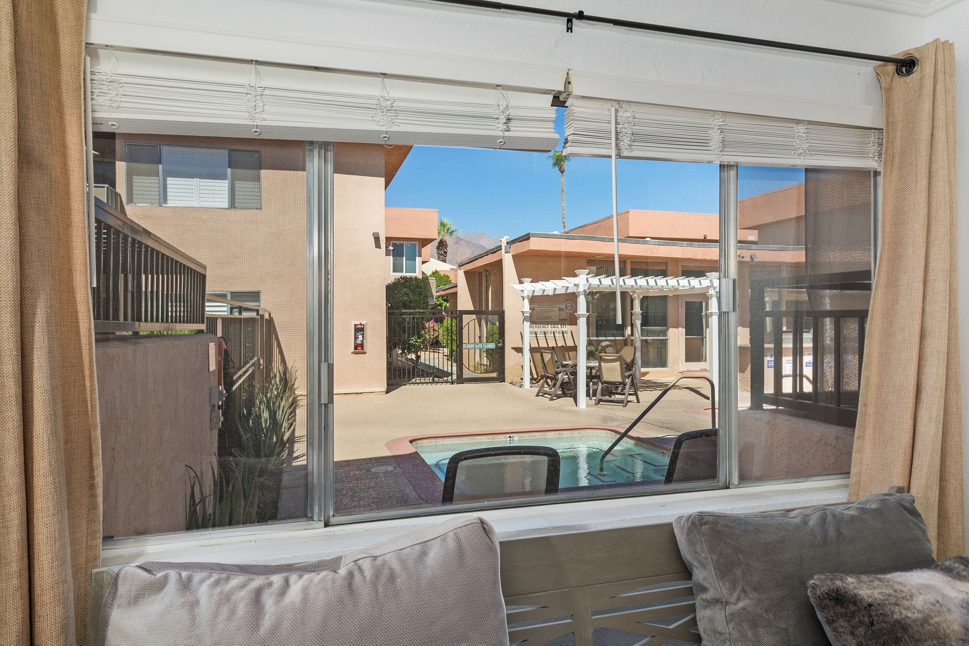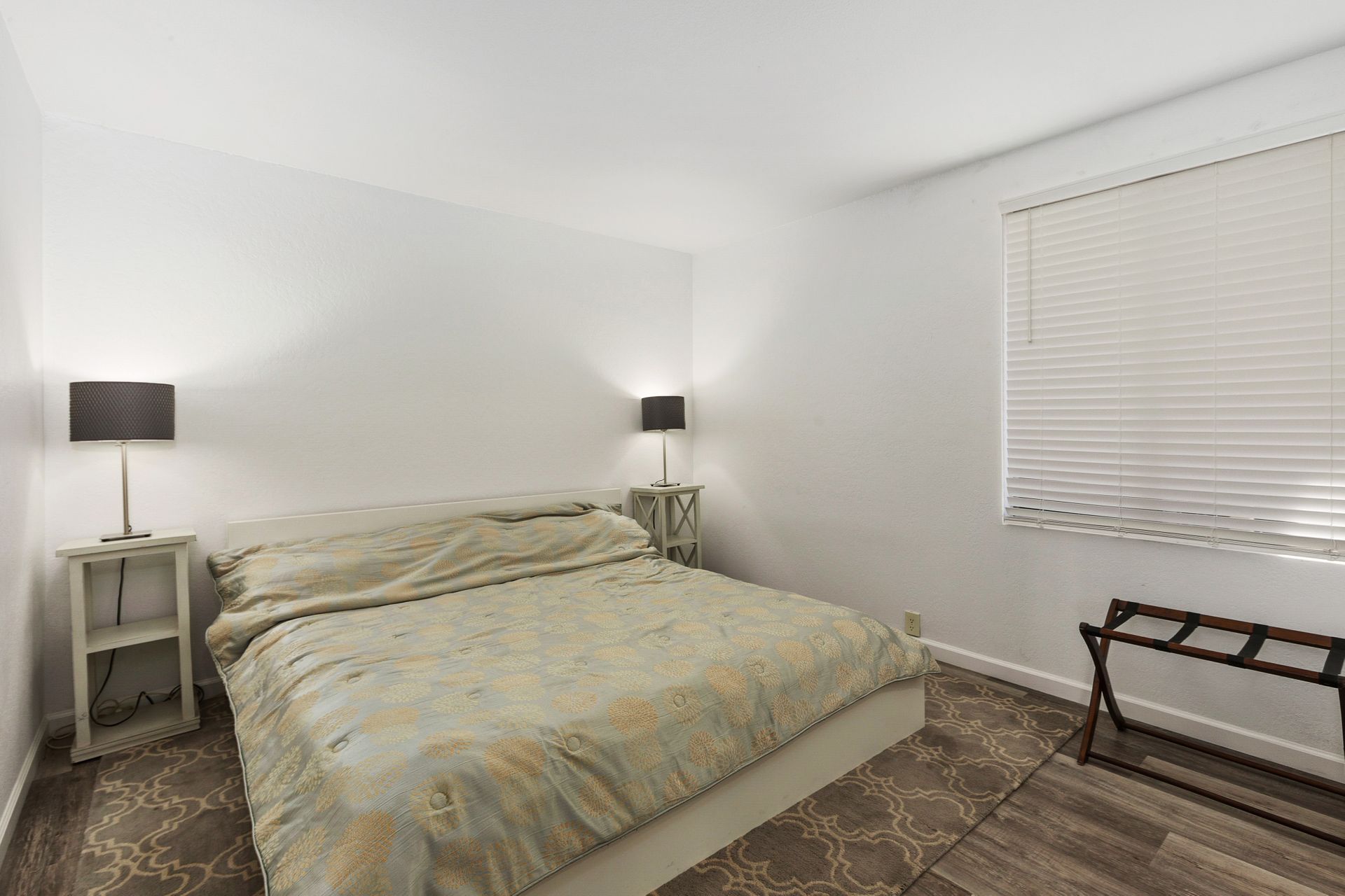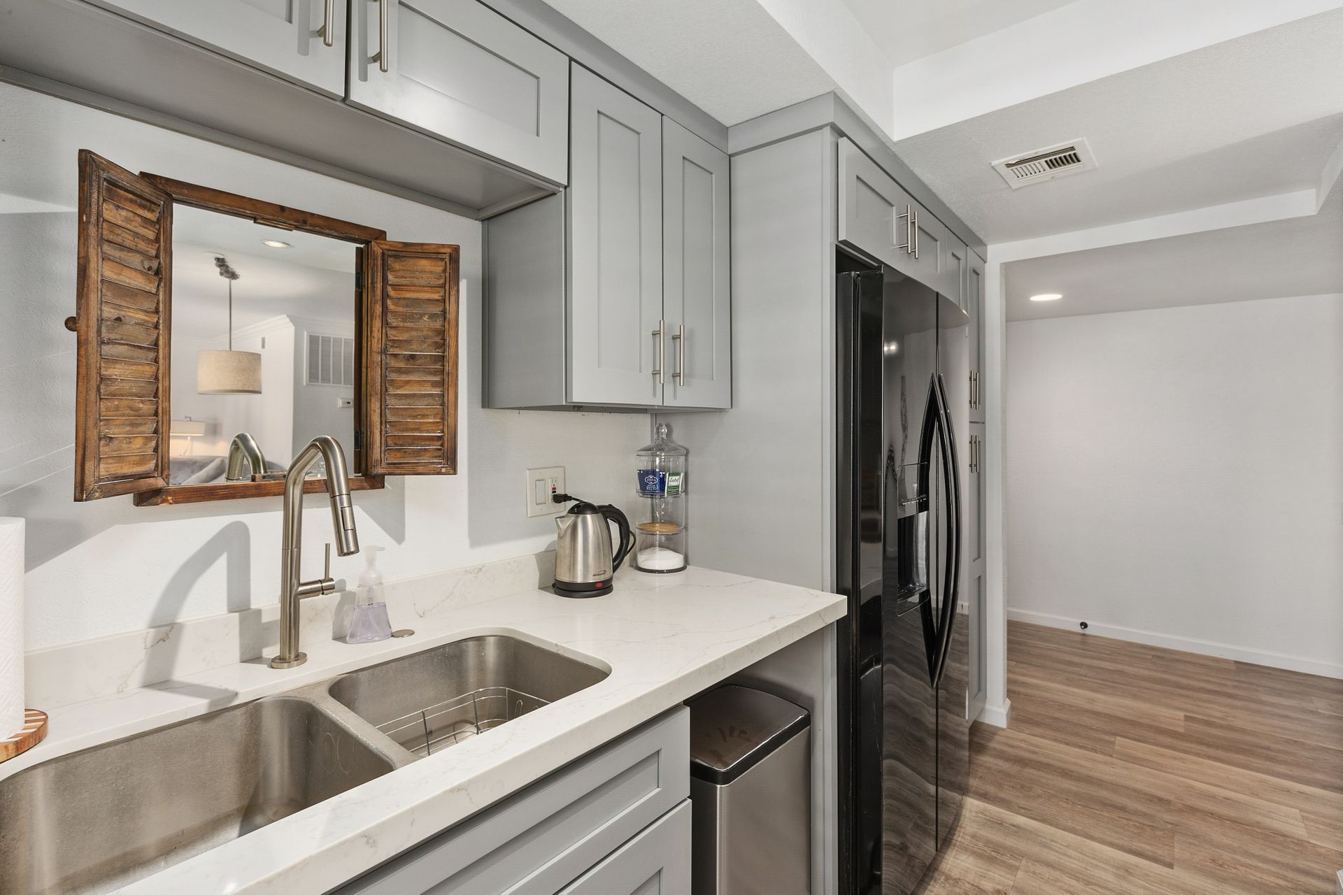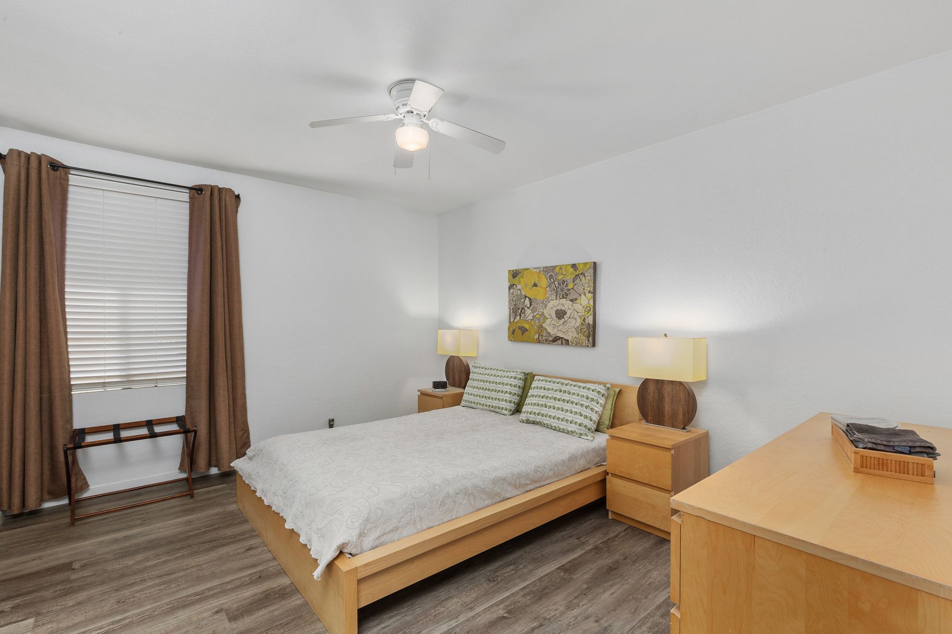 Welcome to Americana Gardens Delight, the property features direct access to the community pool from the private patio, this is the only unit with direct access in the complex, providing a convenient and refreshing outdoor oasis. This charming downstairs end unit has two-bedroom, two-bathroom home offers approximately 1,150 square feet of living space. The low homeowners association (HOA) fees cover essential services such as roof maintenance, building upkeep, gas, water, and trash removal, making this home a low-maintenance option. The kitchen is designed for the discerning chef, boasting quartz countertops, a gas stove, and stainless steel appliances. The open floor plan seamlessly integrates the kitchen with a dining area and a spacious living room views of the patio and pool for a relaxing atmosphere. Residents can enjoy the convenience of in-unit side-by-side washer and dryer hookups. This makes for a wonderful owners unit and or part, full time renters, 30 day minimum rental per HOA. Americana Gardens is centrally located, this is a must see!